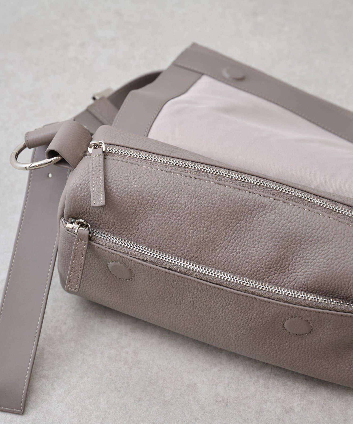 側面やショルダー裏をあえて合皮にすることで、色移りや汚れに強い仕様にしています。