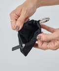 カードケースサイズのポーチにはリング状のカラビナが付いているので、お手持ちのバッグやスマートフォンのストラップにサッと取り付け可能。