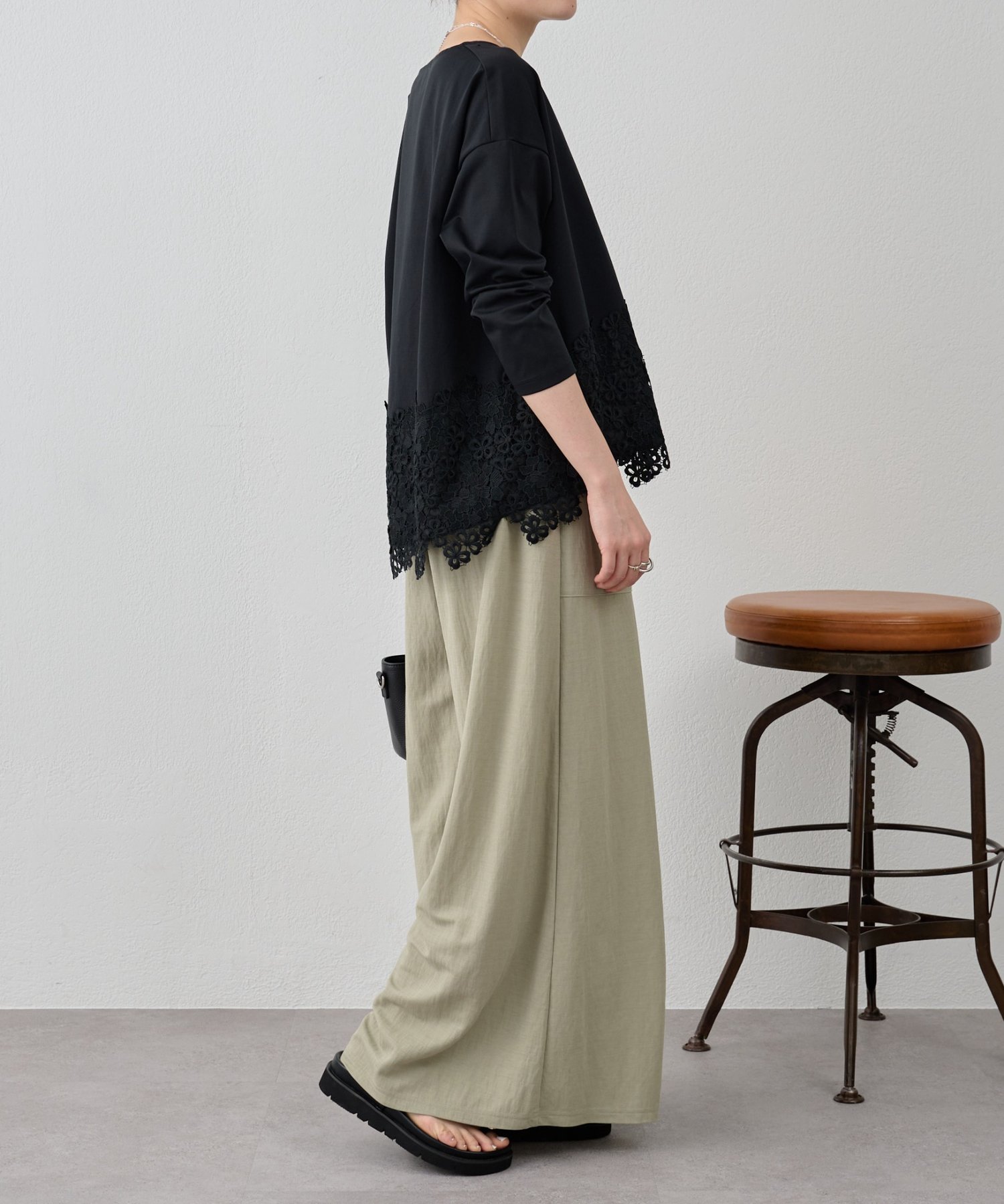 腰位置に配した大きめのパッチポケットと、脇線をやや内側に寄せた設計により、ワイドシルエットでも視覚的にスマートに見えるのがポイント。