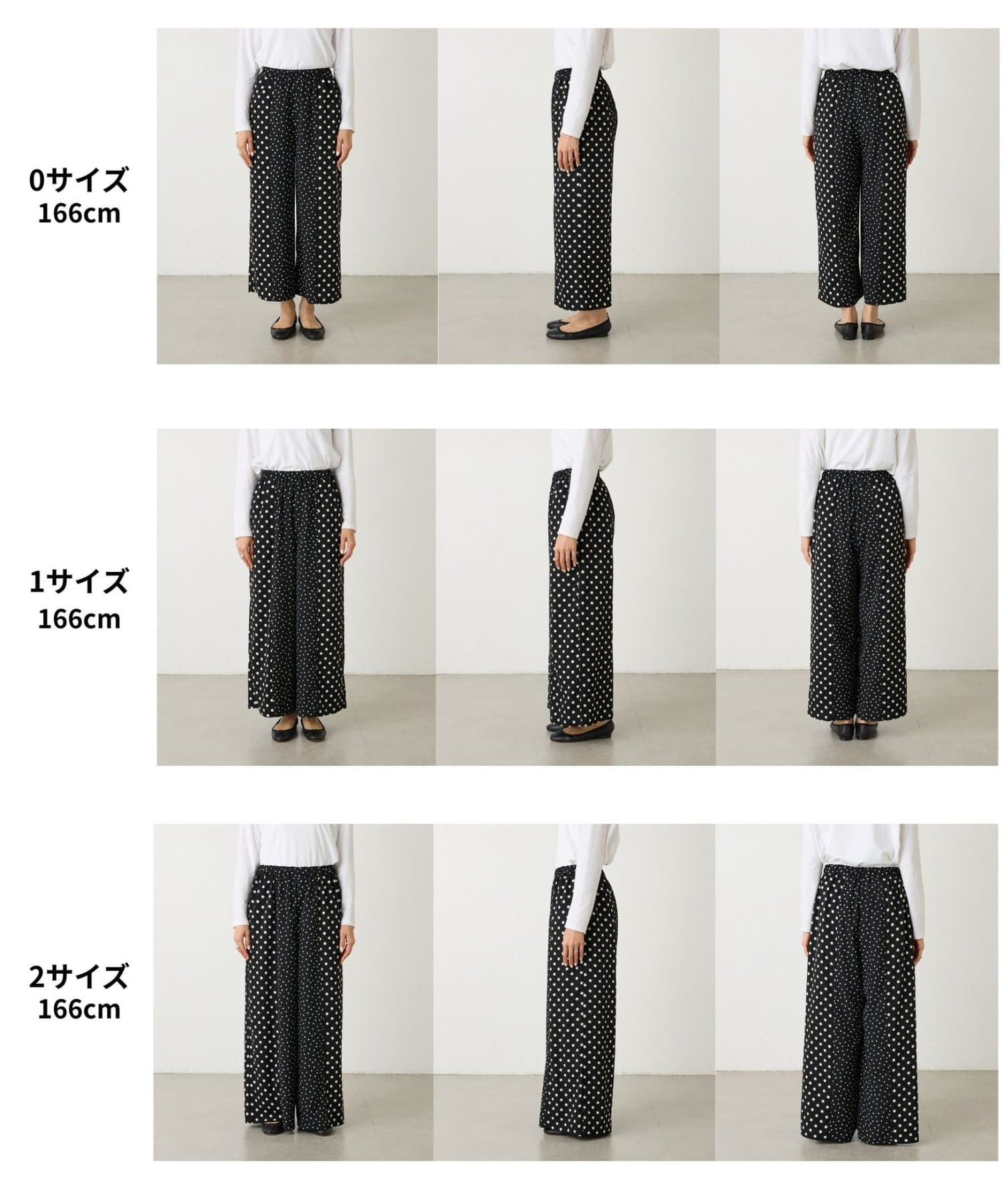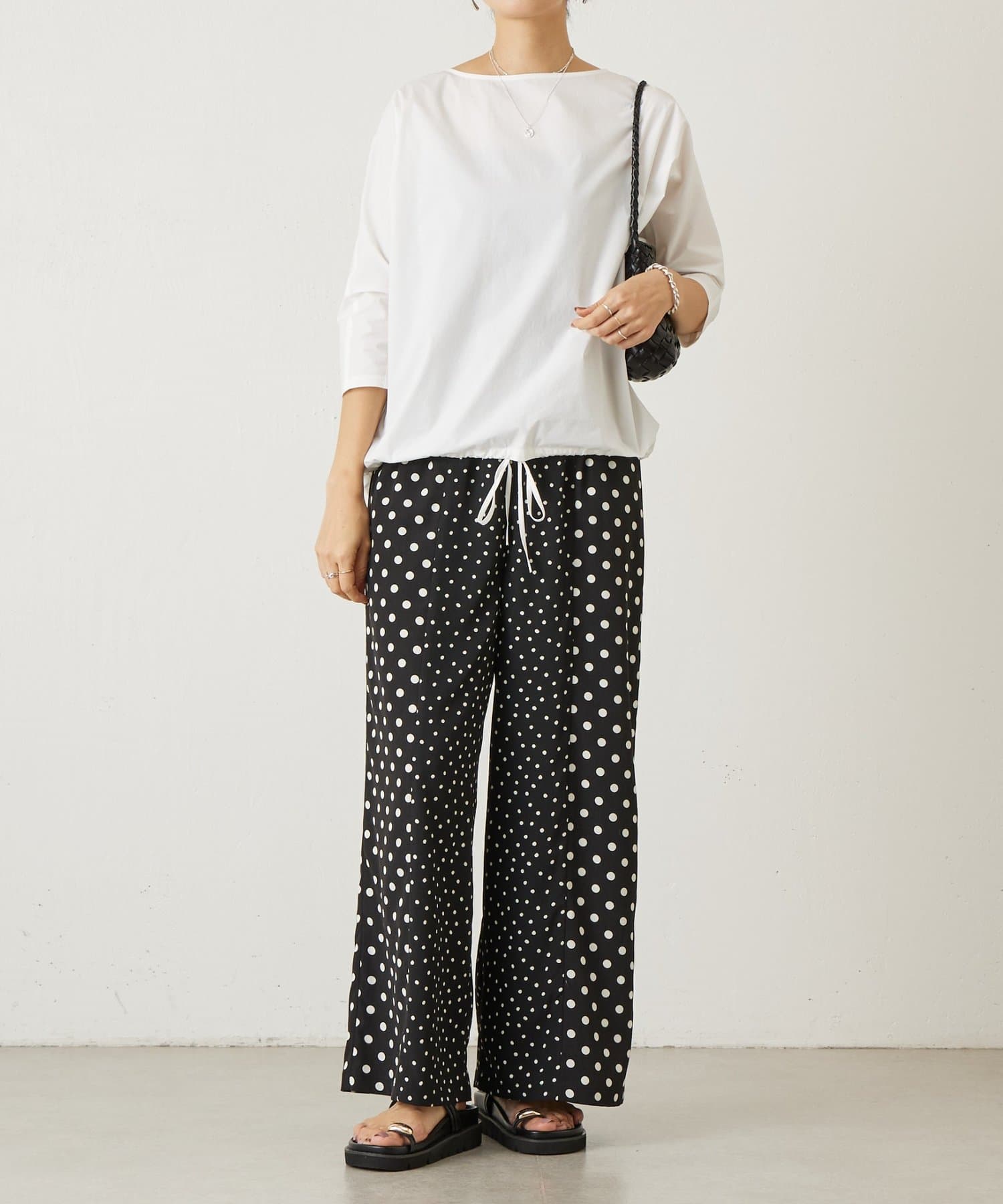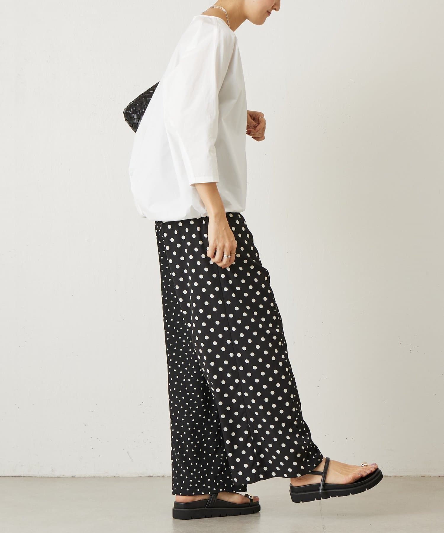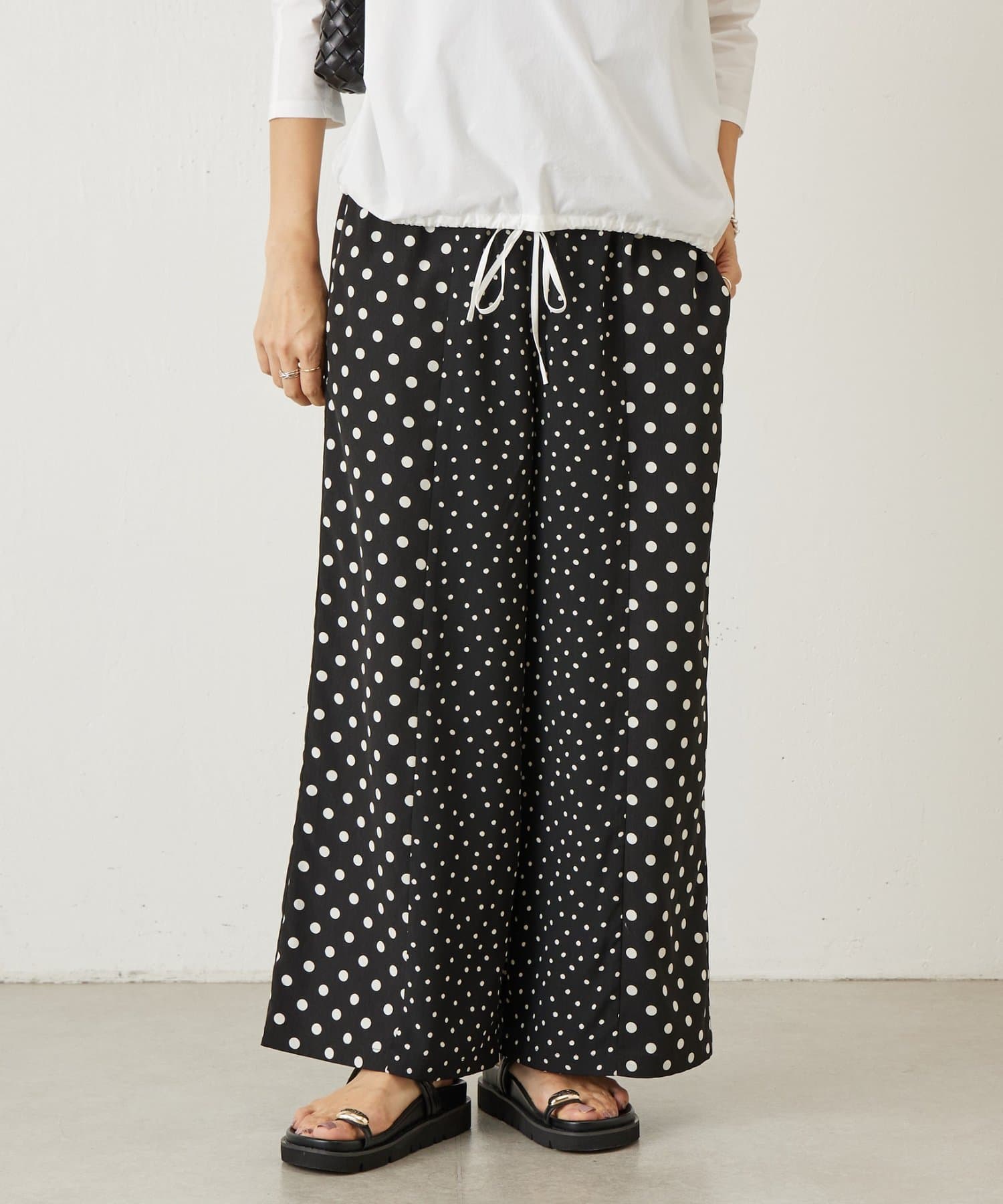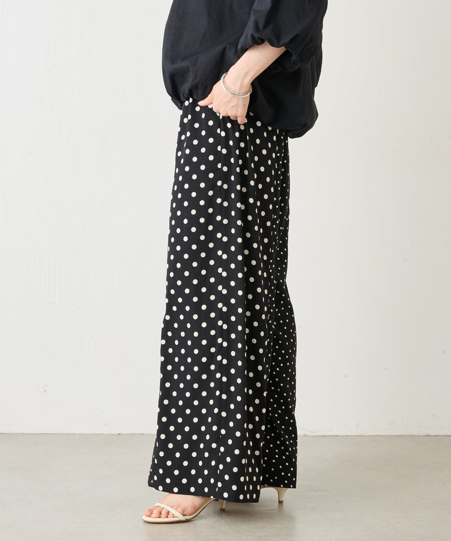 大小のドット柄を組み合わせたワイドパンツ。