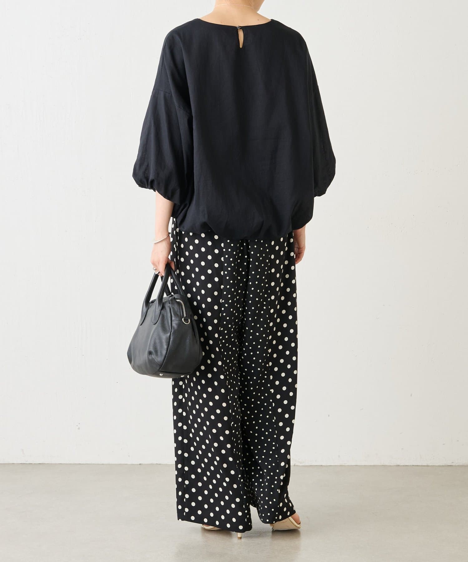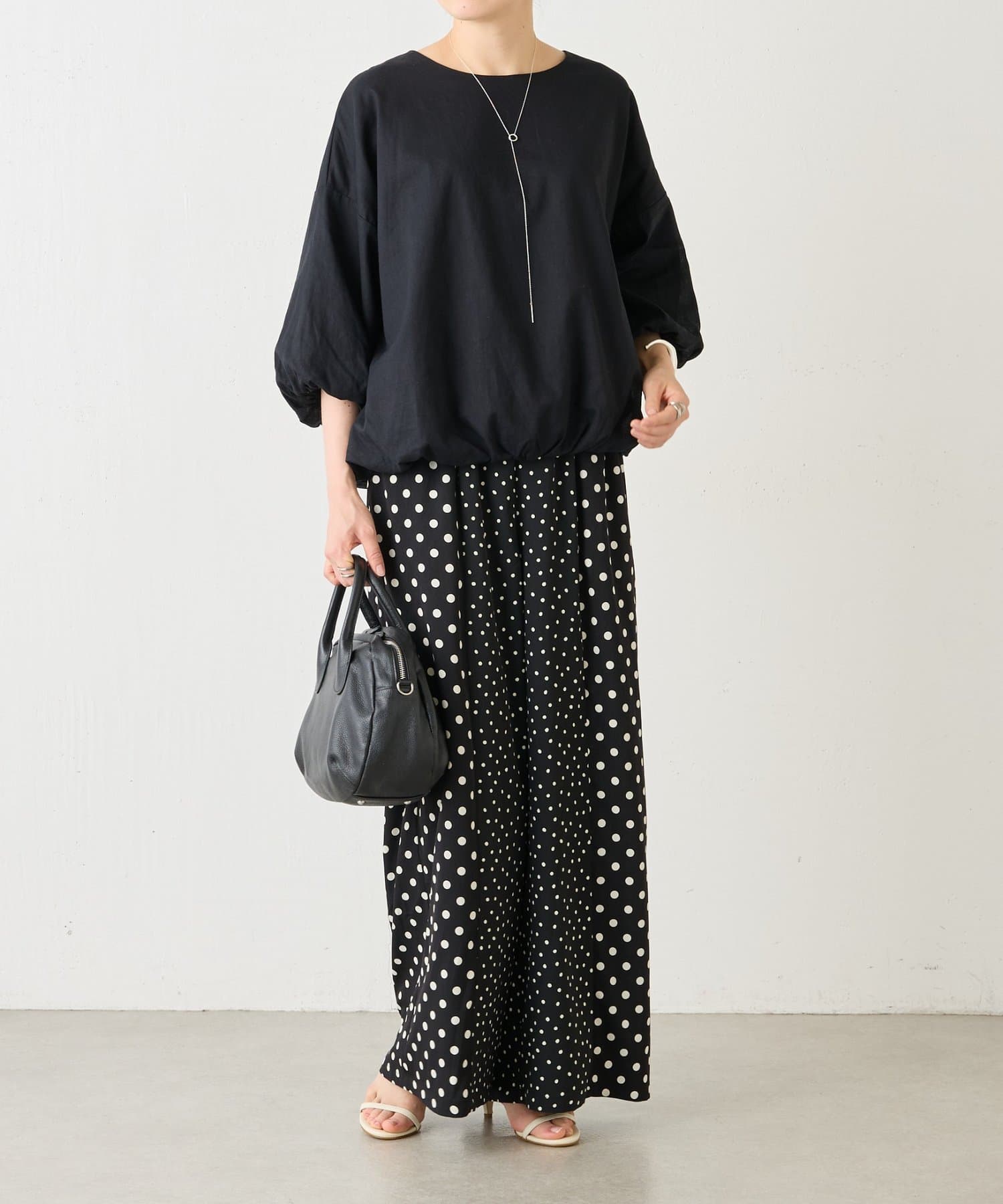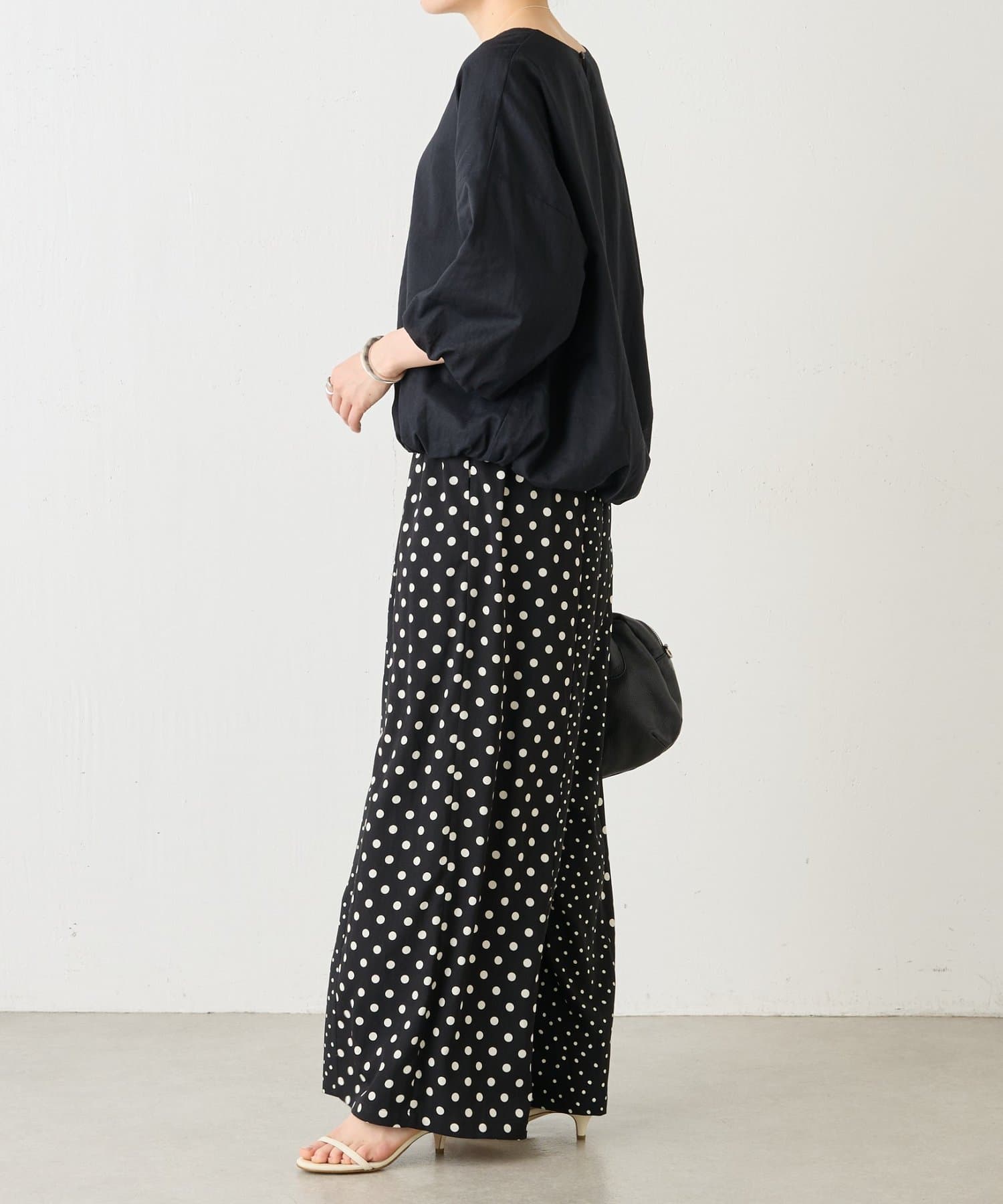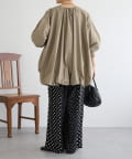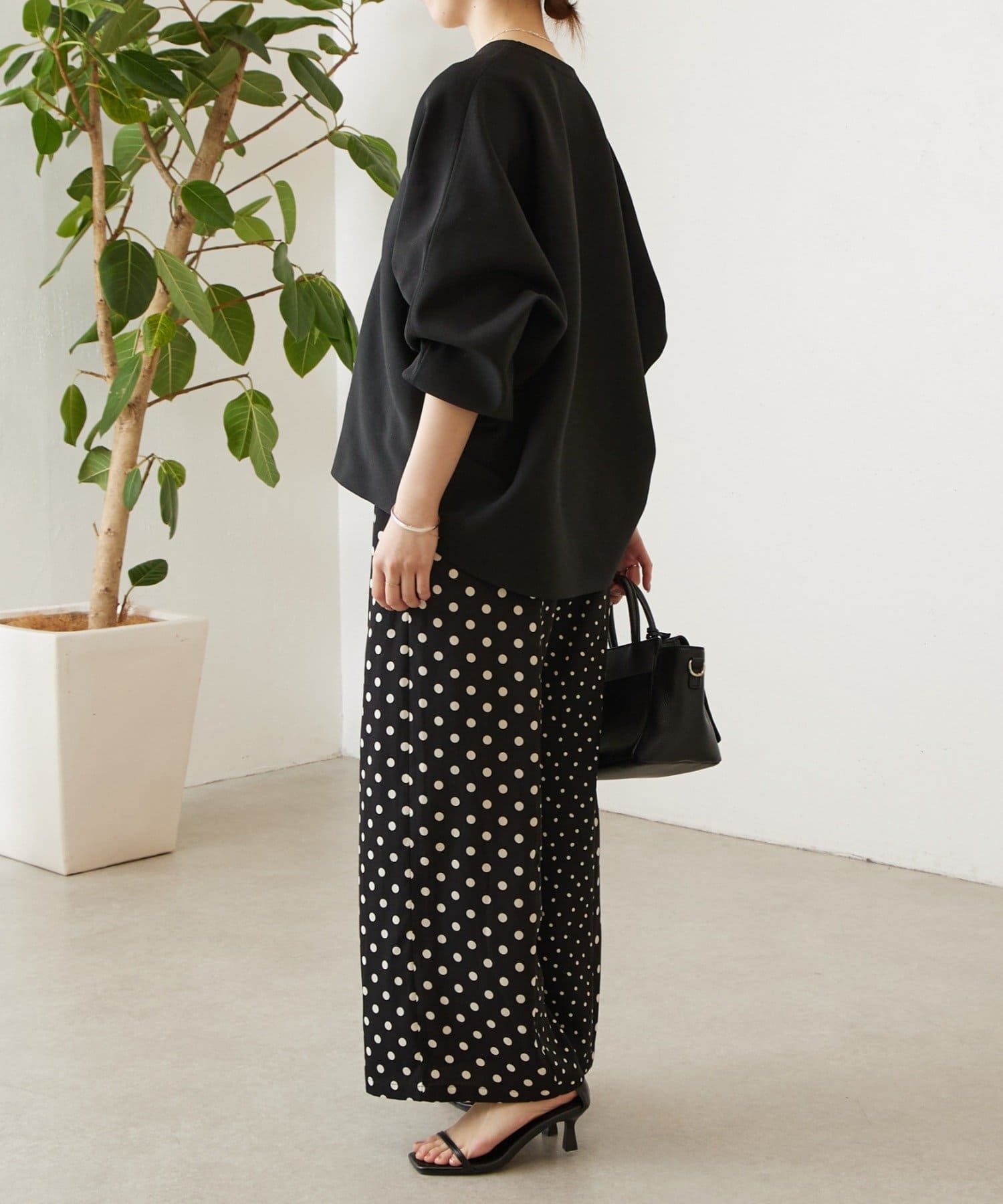 大小のドット柄を組み合わせたワイドパンツ。