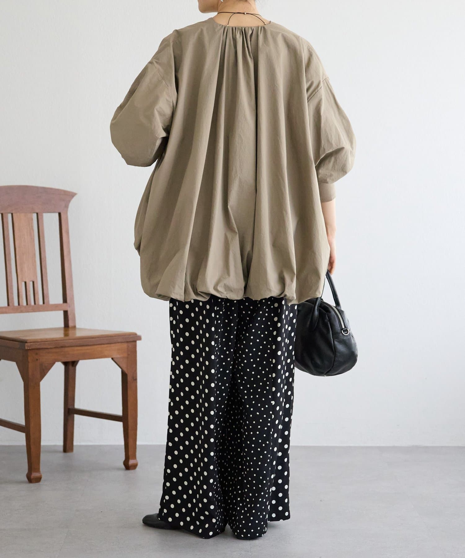 腰周りは緩やかに体に沿うシルエットで、広がりすぎずすっきりと着ていただけます。