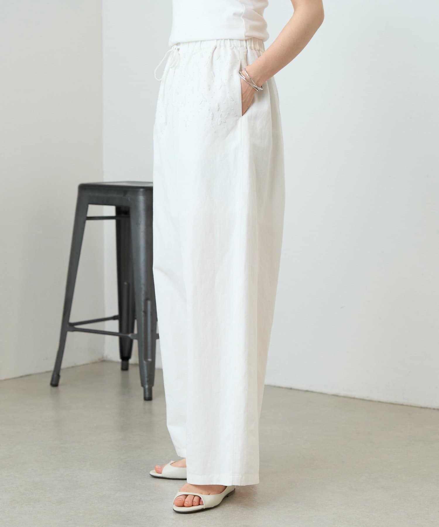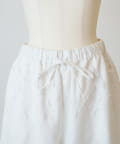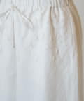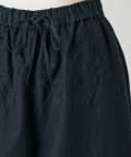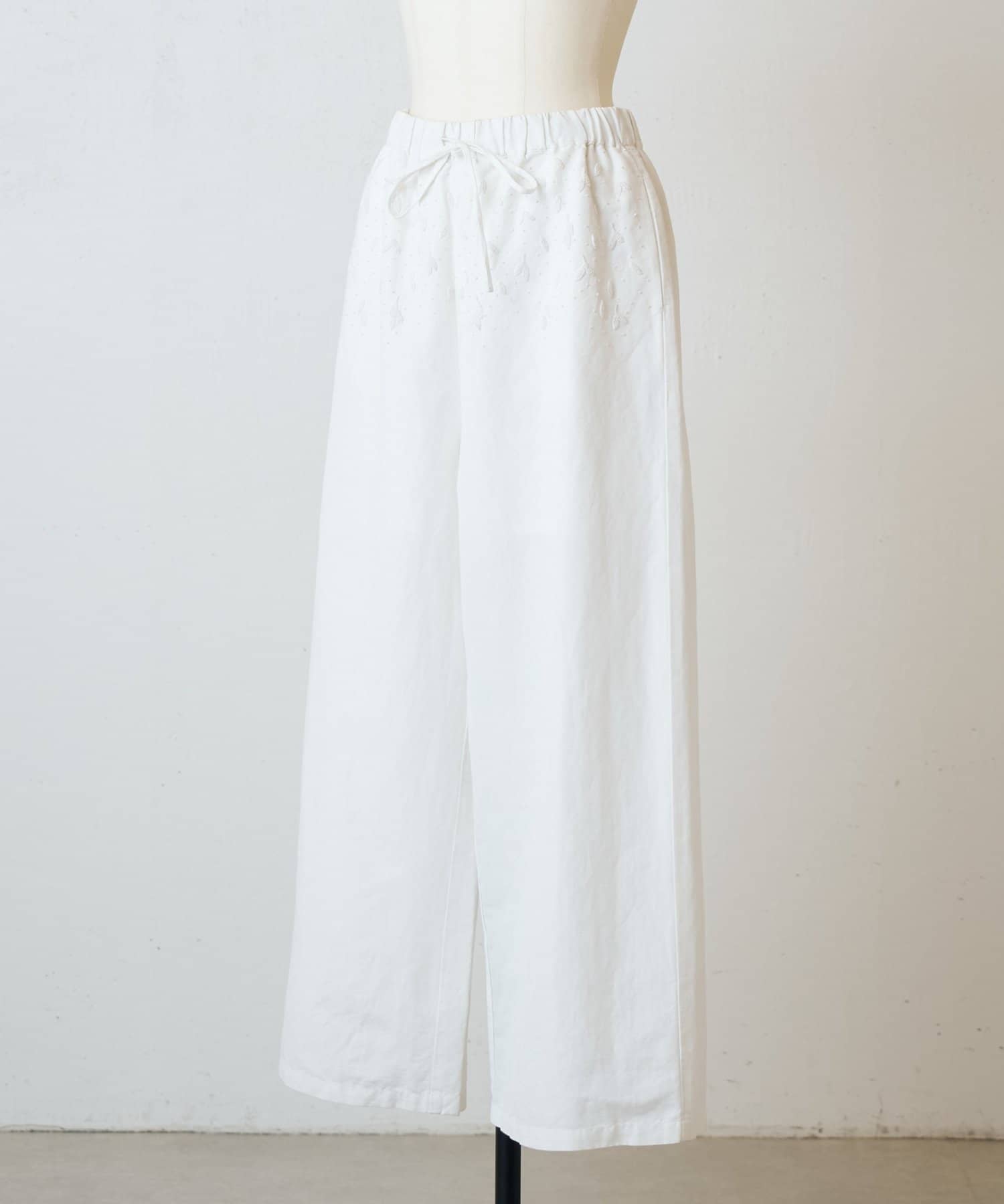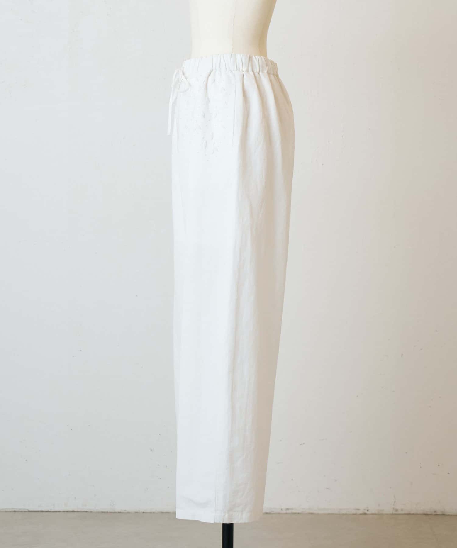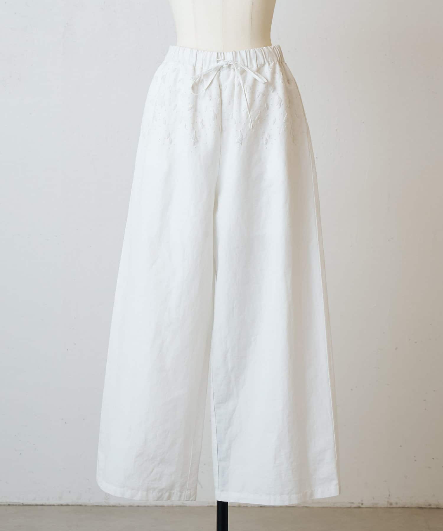 ウエスト周りに施した刺繍がアクセントになったイージーパンツ。