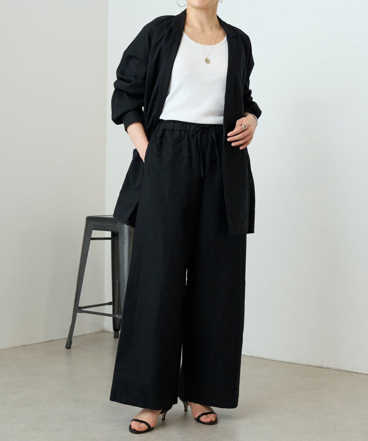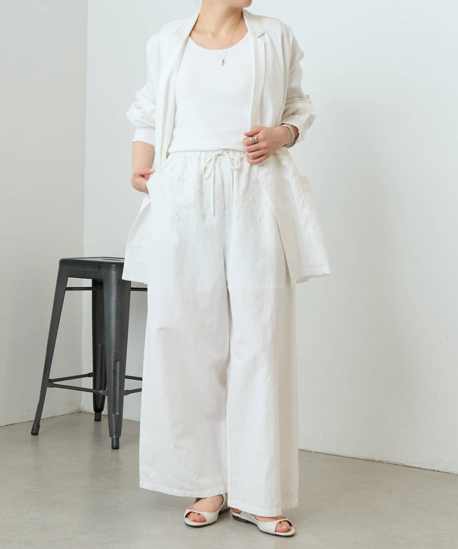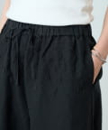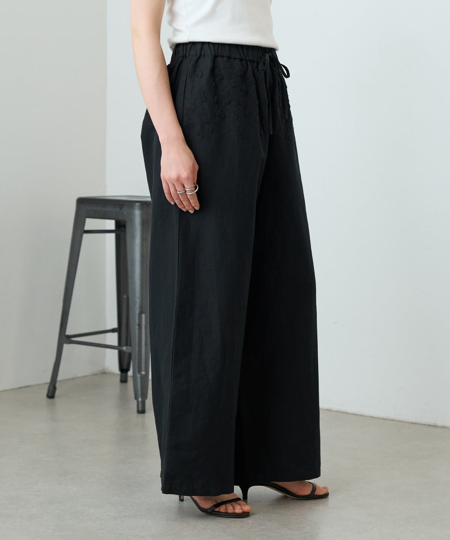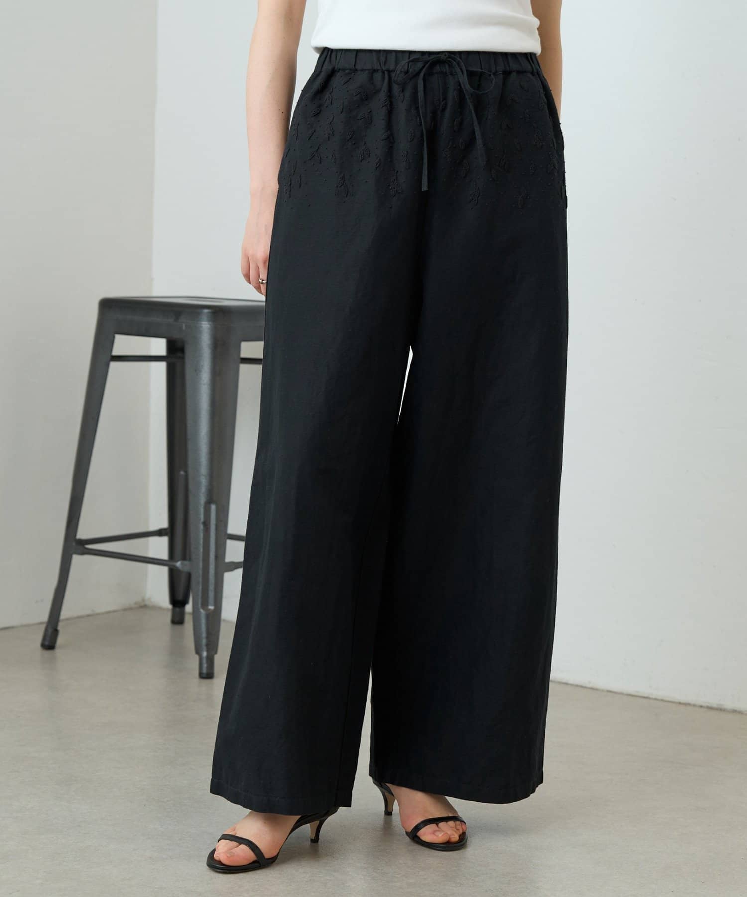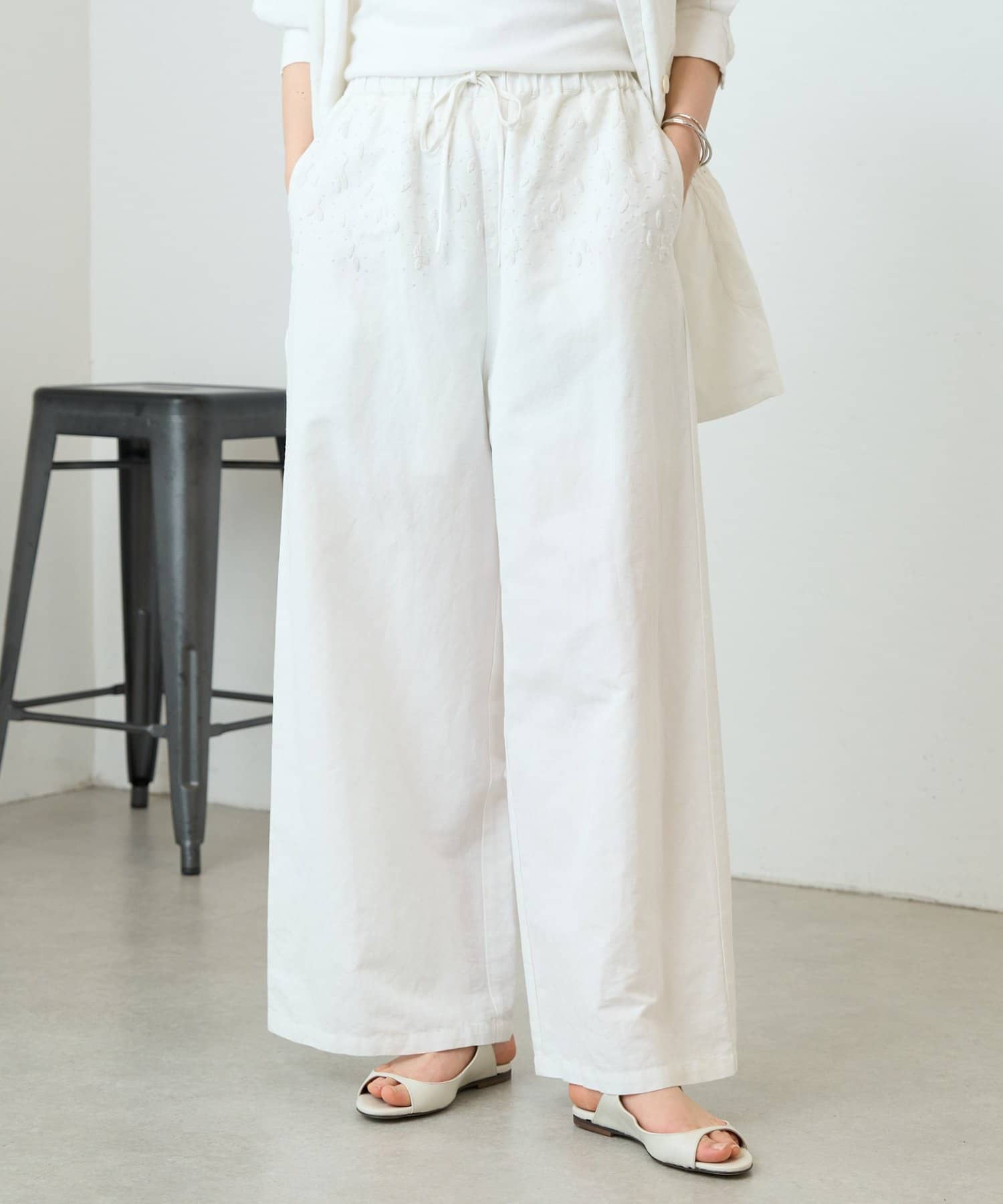 ウエスト周りに施した刺繍がアクセントになったイージーパンツ。