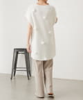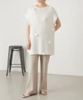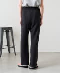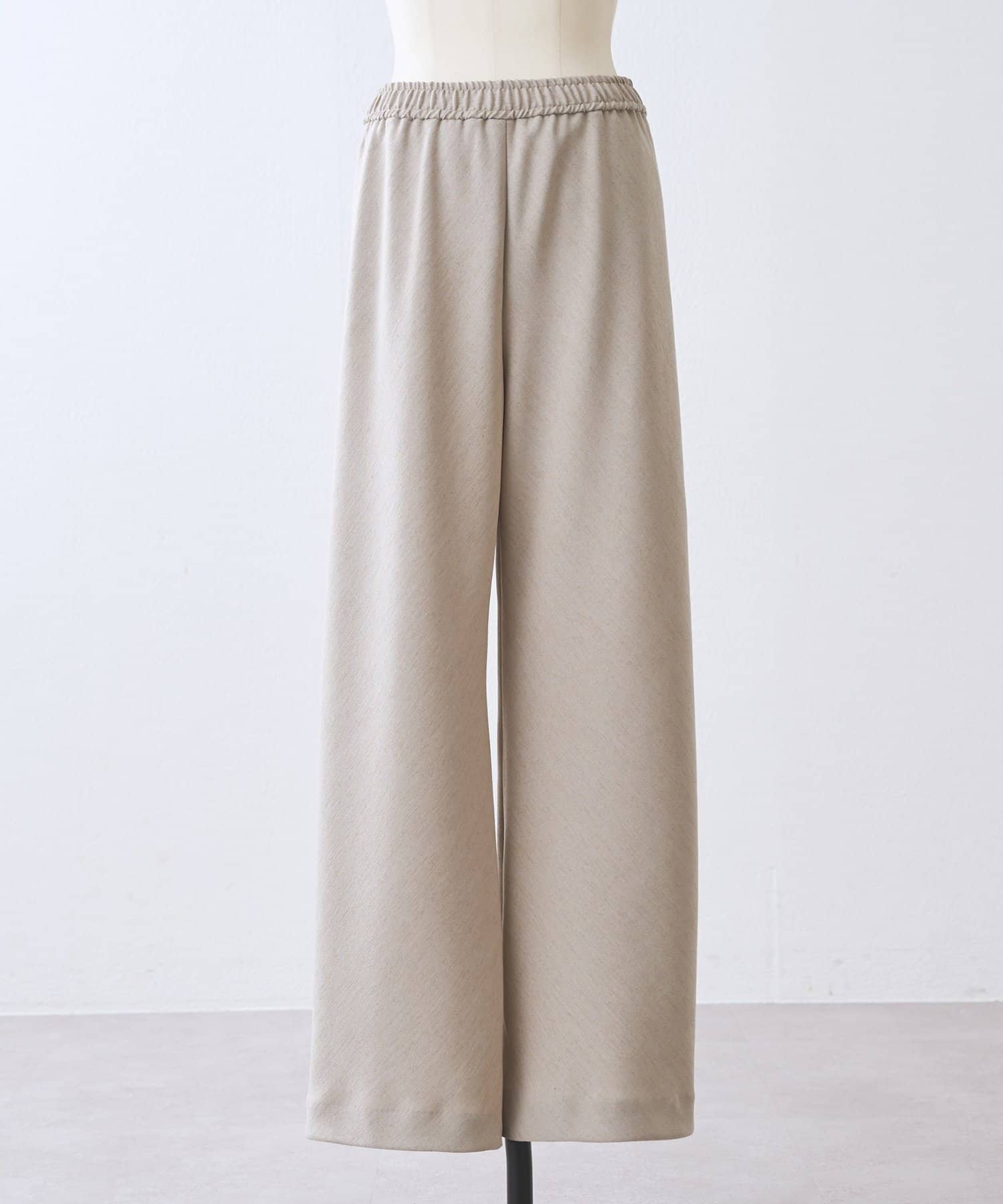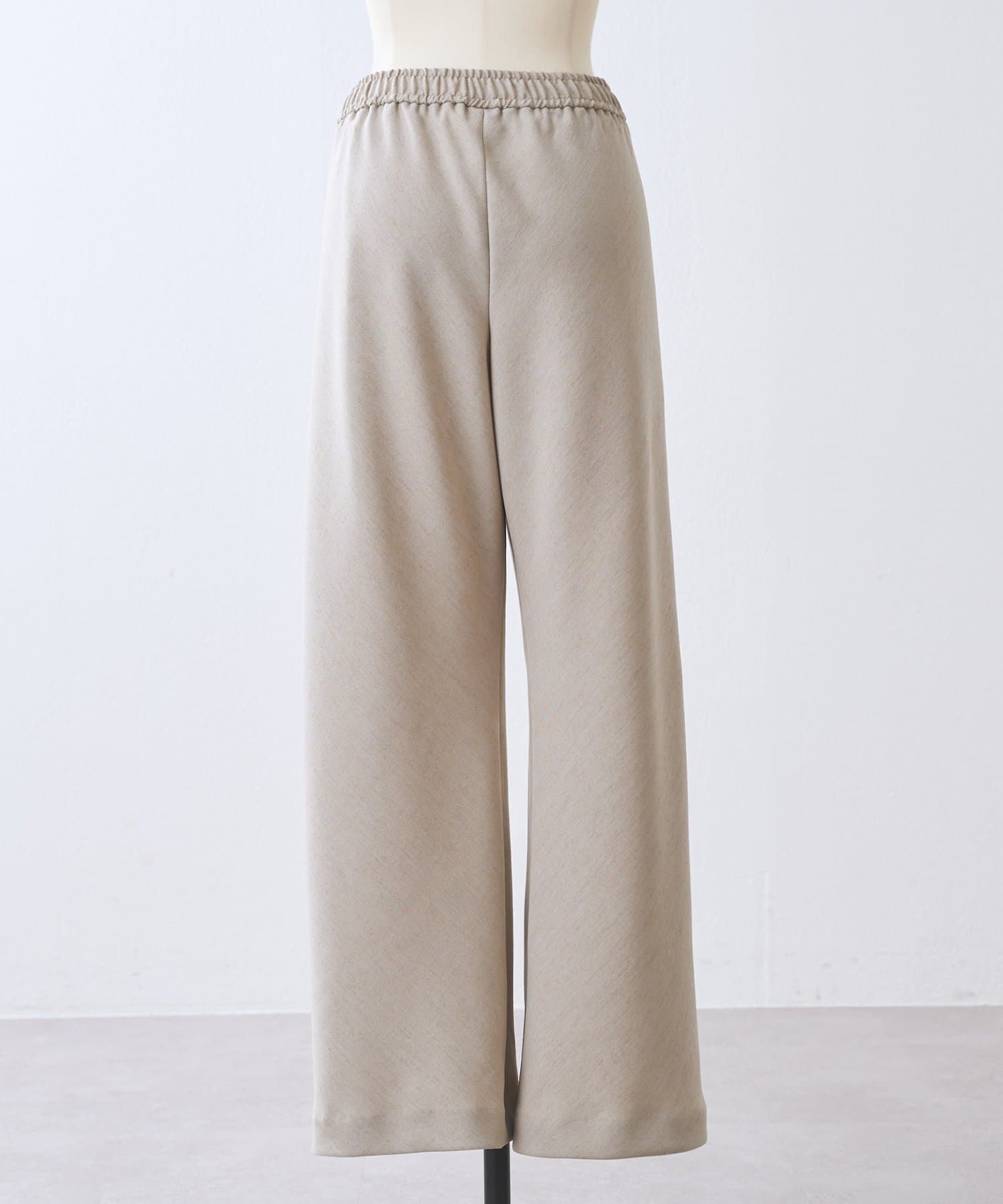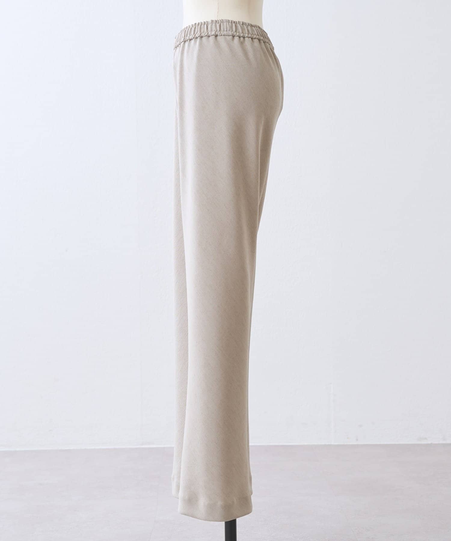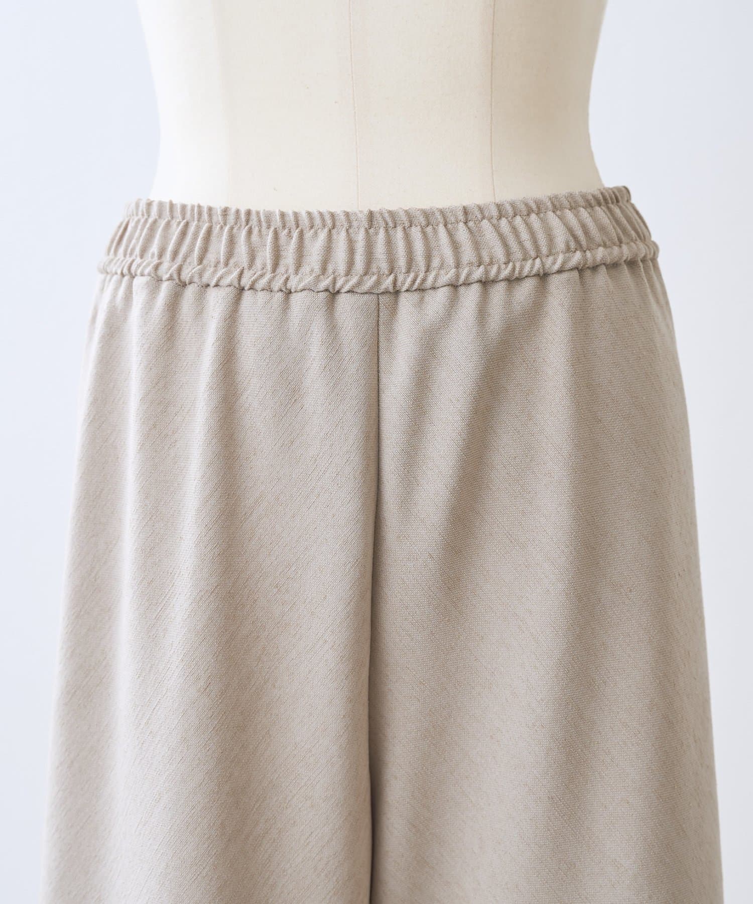 スラブ感のあるポリエステル素材を使用し、リネンのような表情を楽しめるバイヤスパンツ。