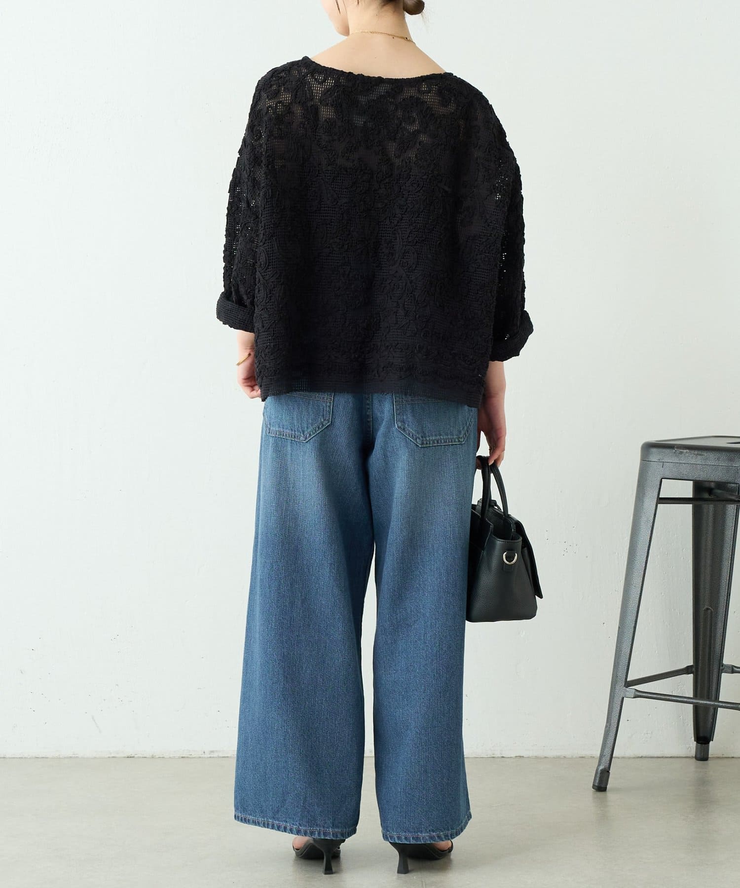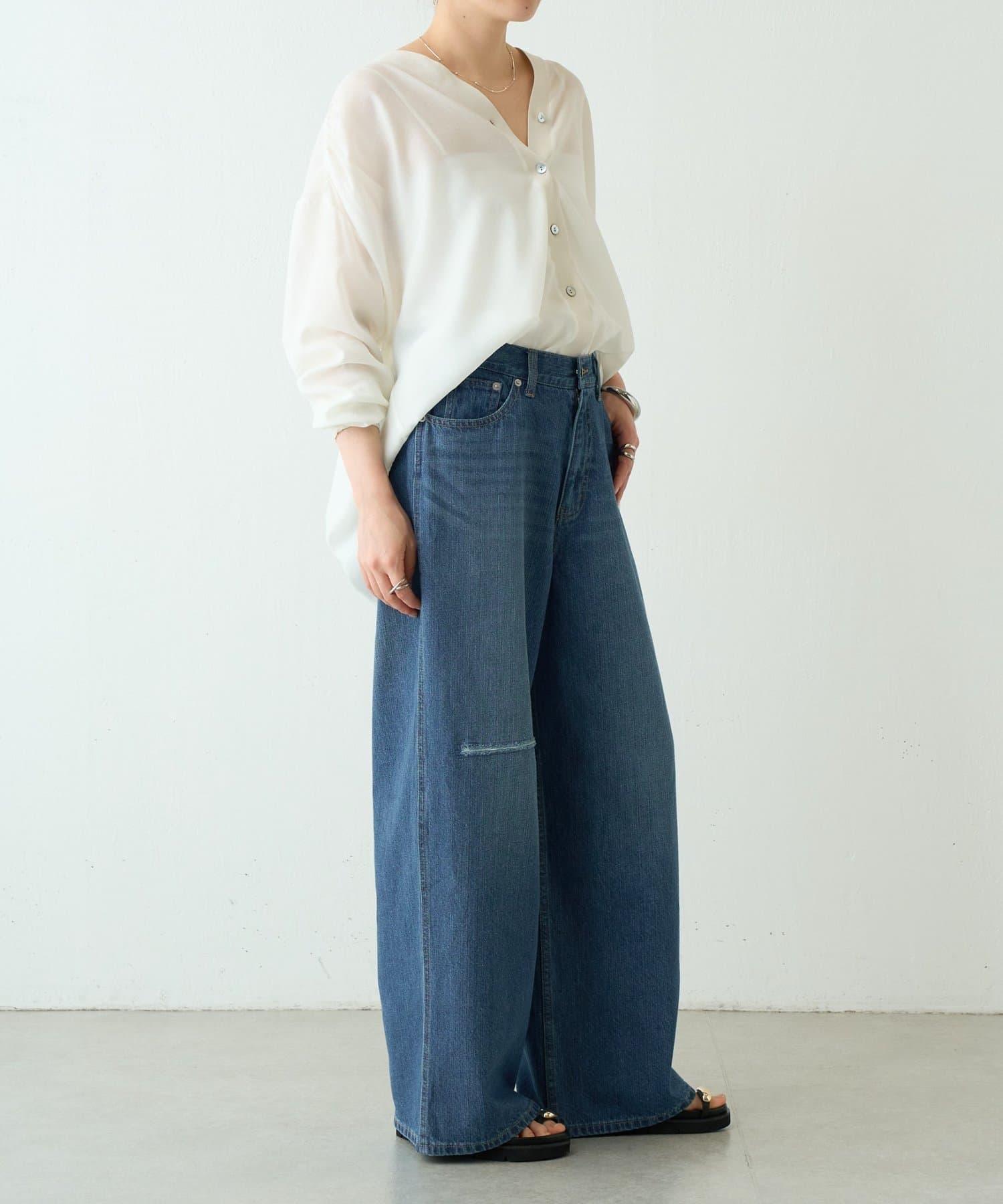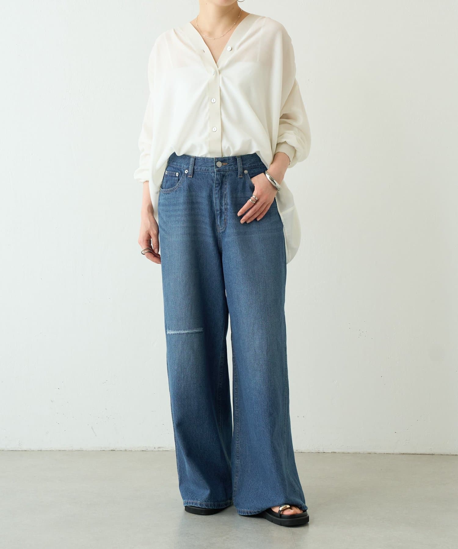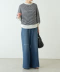 膝あたりに施したダメージが、シンプルながらも大人の抜け感をプラスしてくれます。