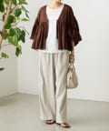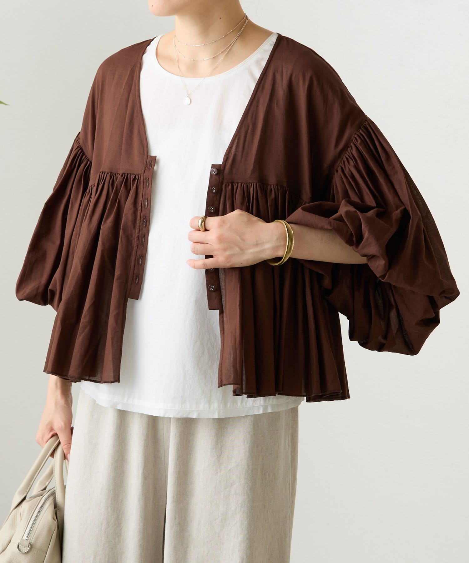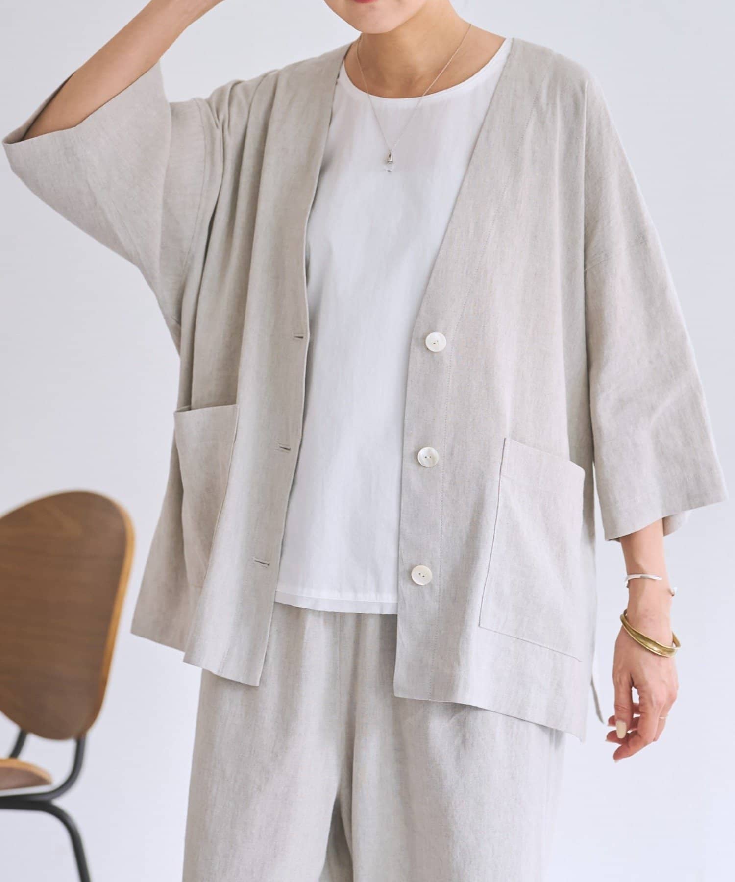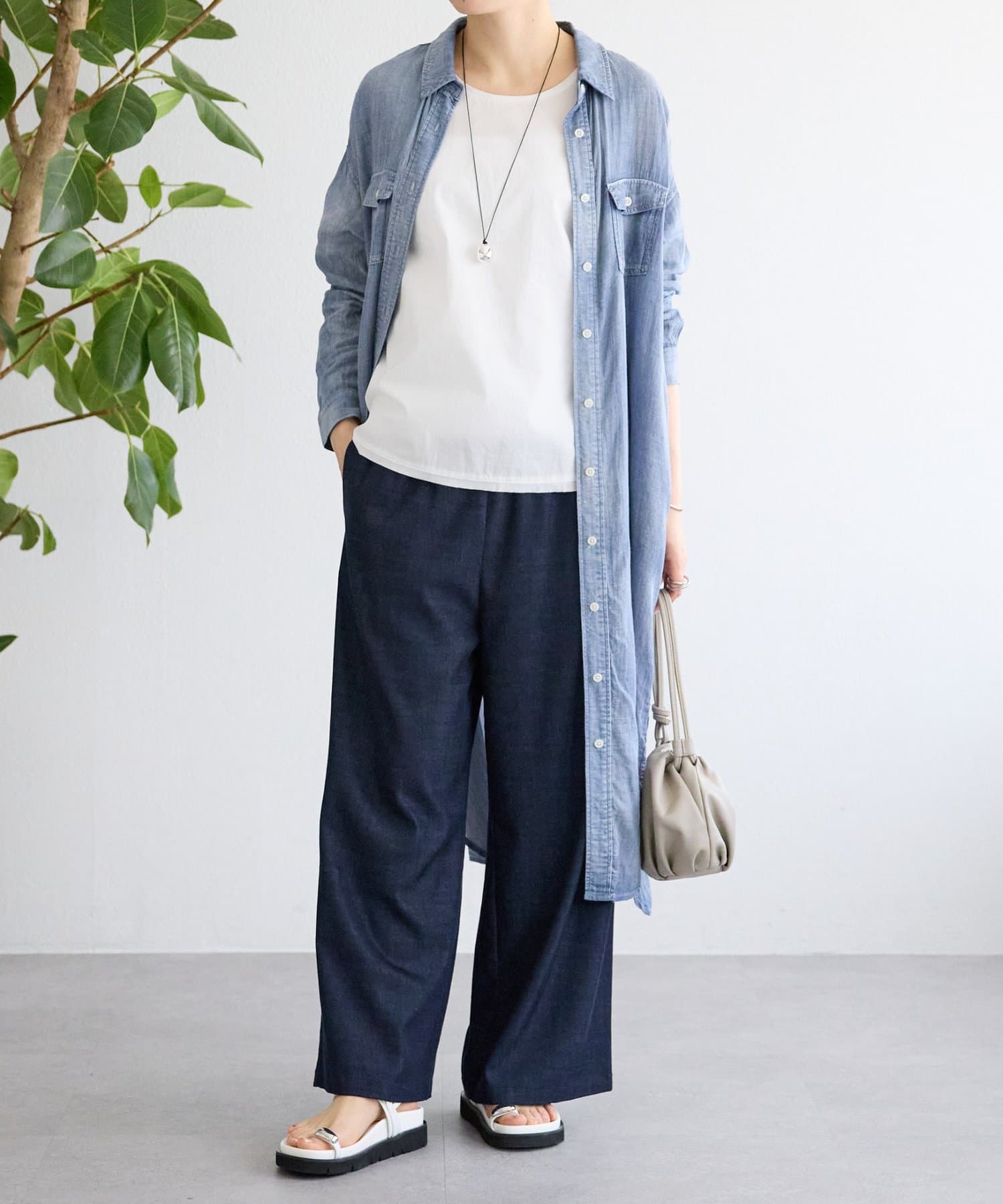 からだのラインを拾わないゆとりあるサイズ感は1枚でも着られるデザインです。