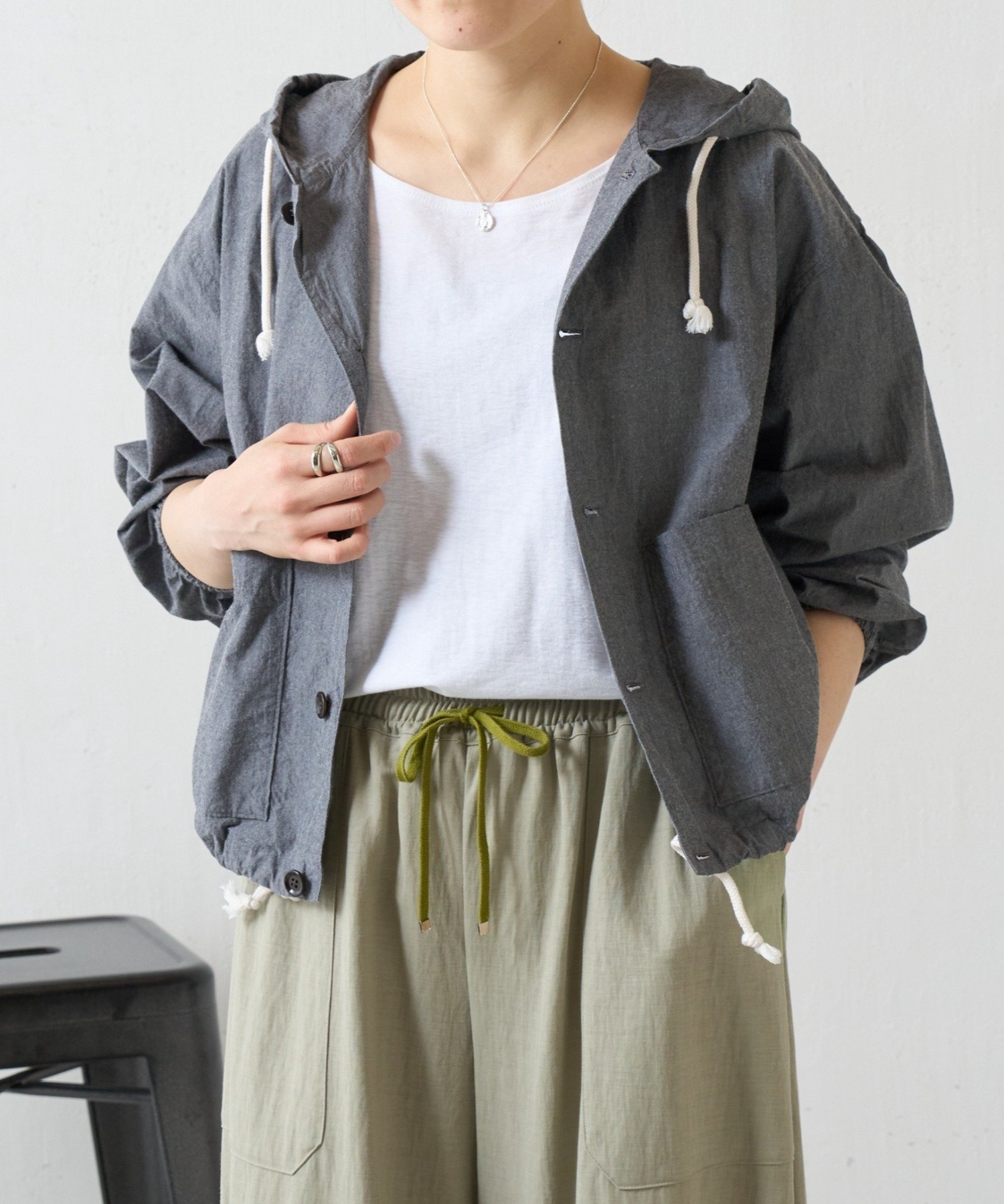 軽い羽織としてはもちろん、ボタンを留めて一枚着のトップスとしても着回しも楽しめる一枚です。