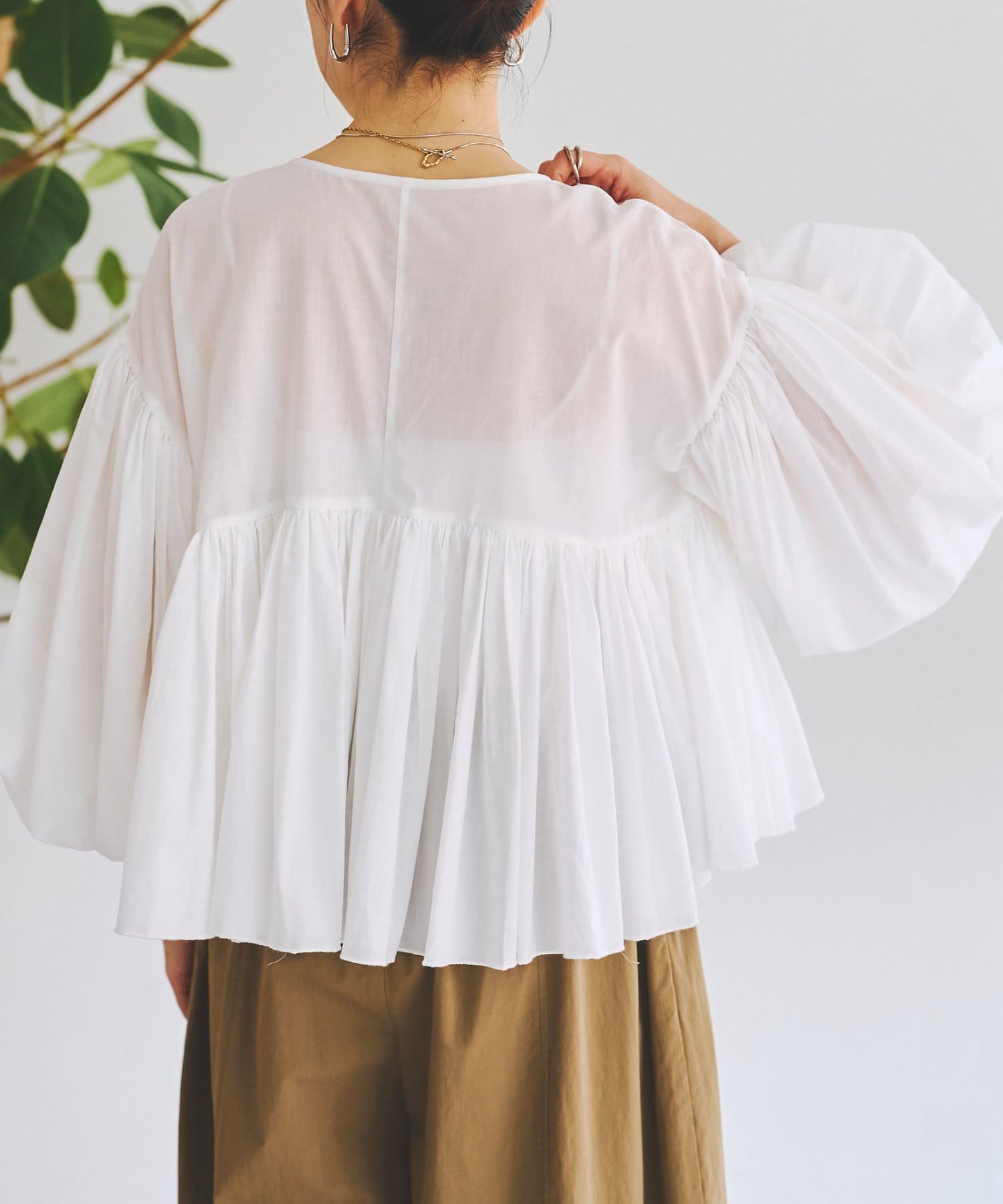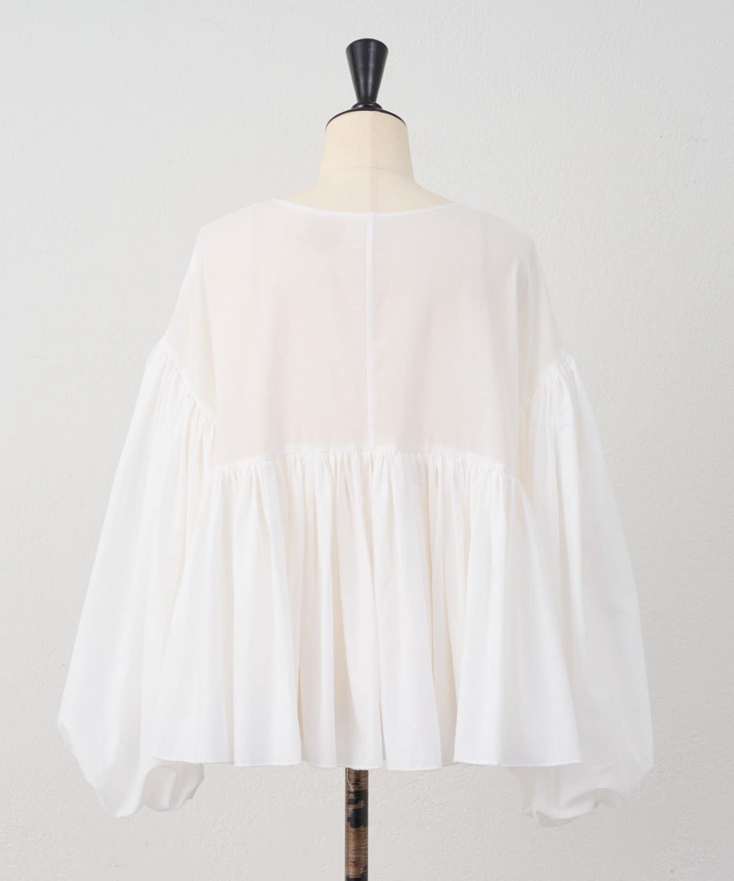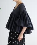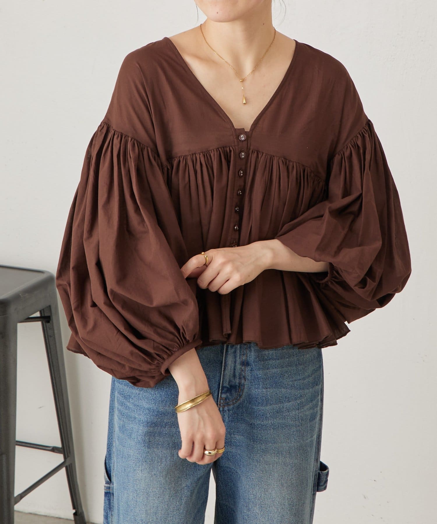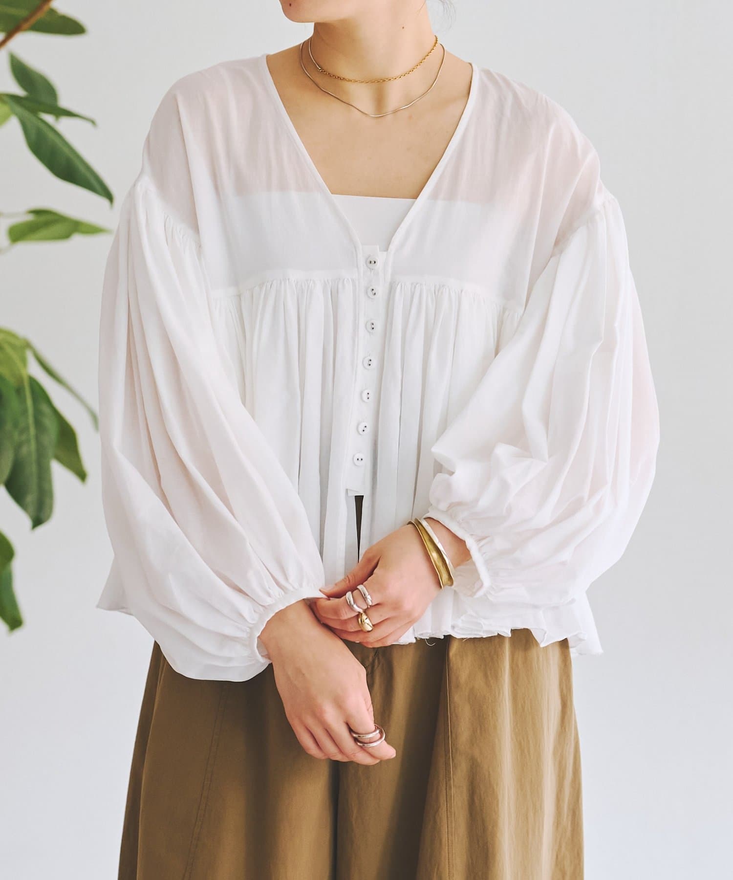 身幅にたっぷりとギャザーを施した、動きのあるシルエットが魅力のVネックブラウス。
