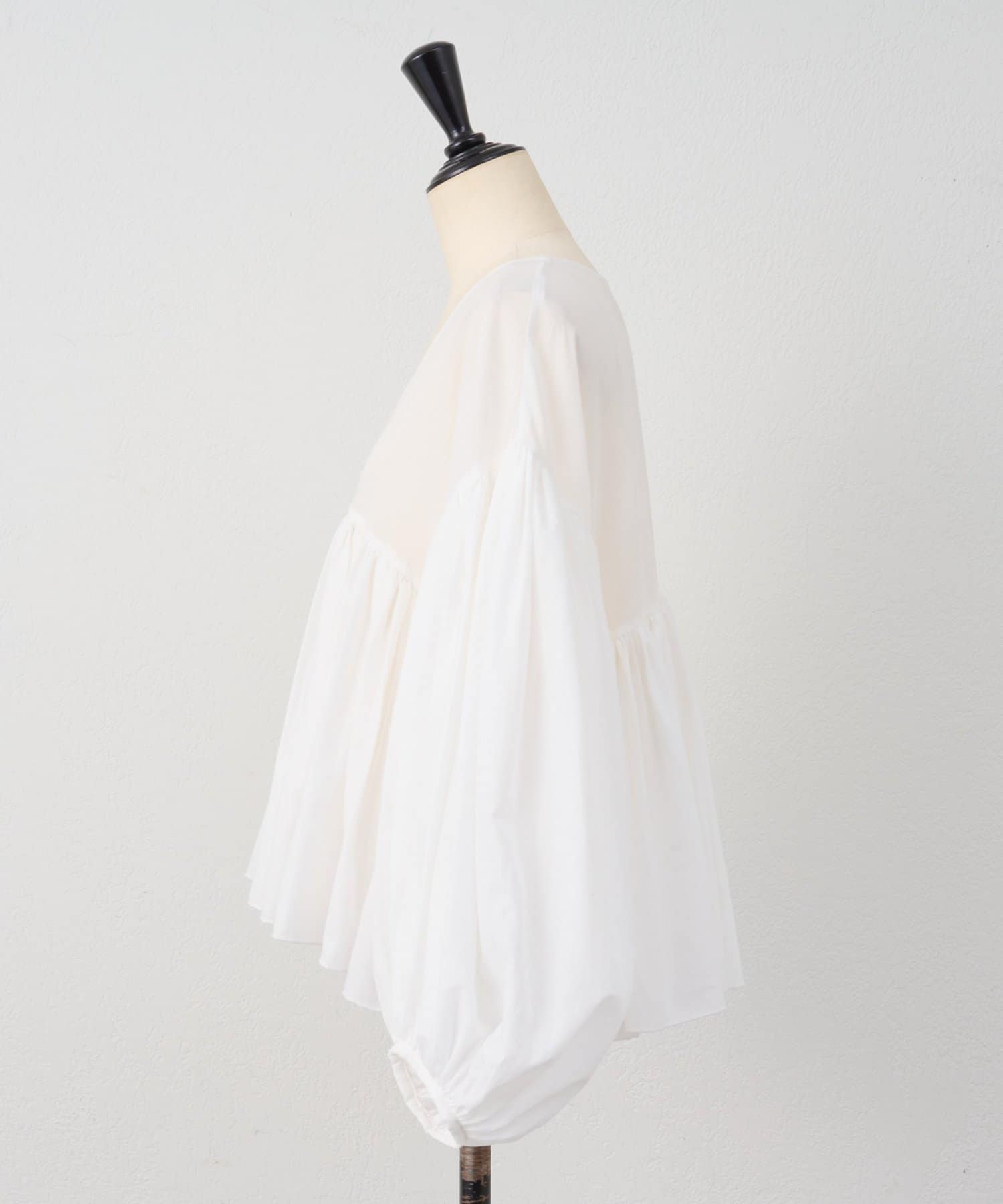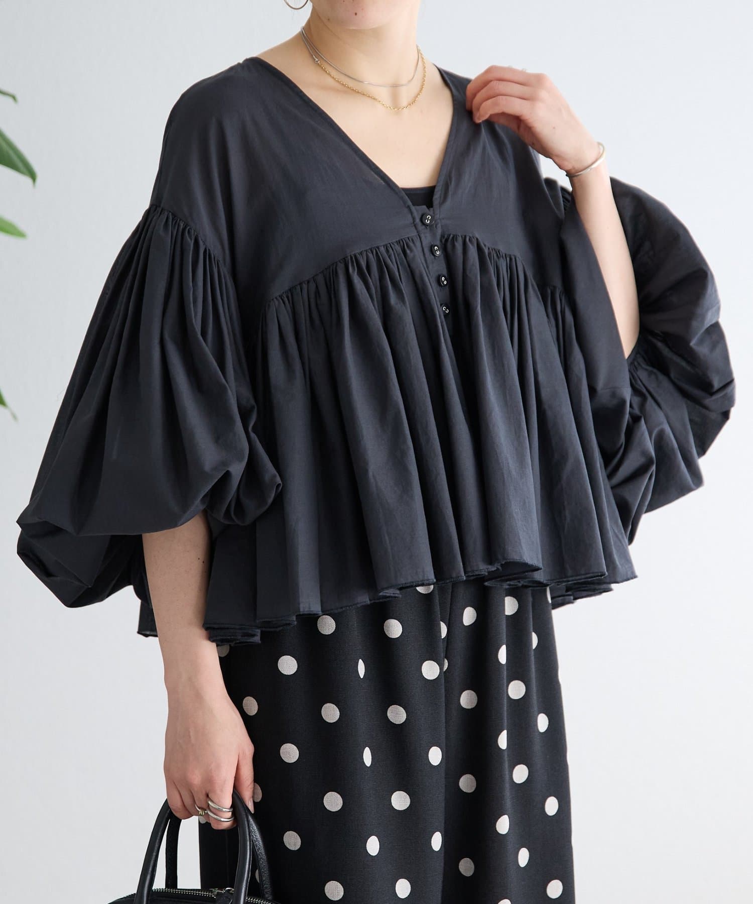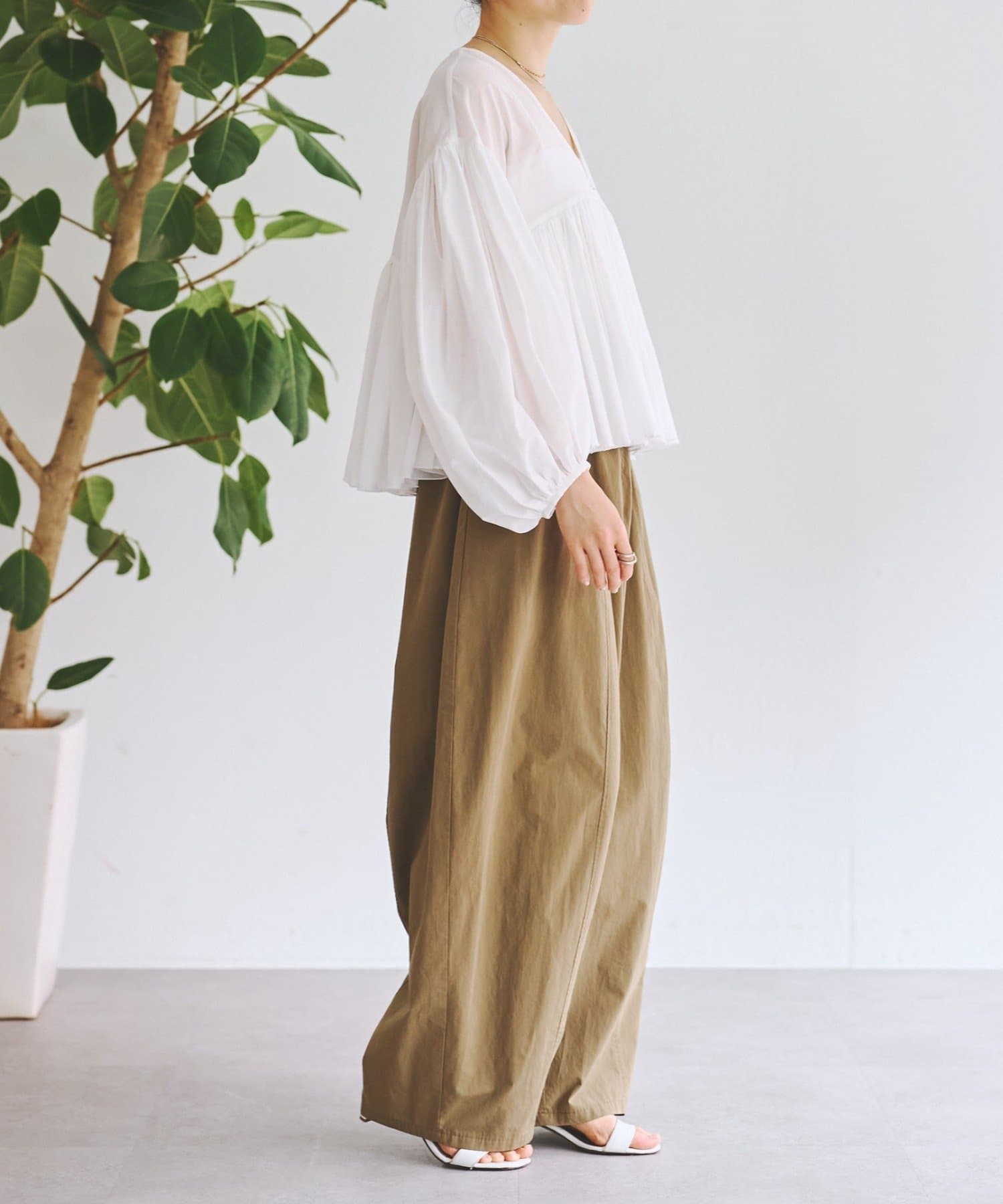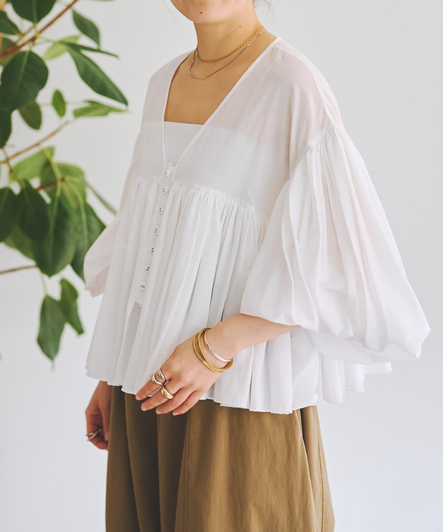 身幅にたっぷりとギャザーを施した、動きのあるシルエットが魅力のVネックブラウス。