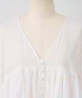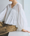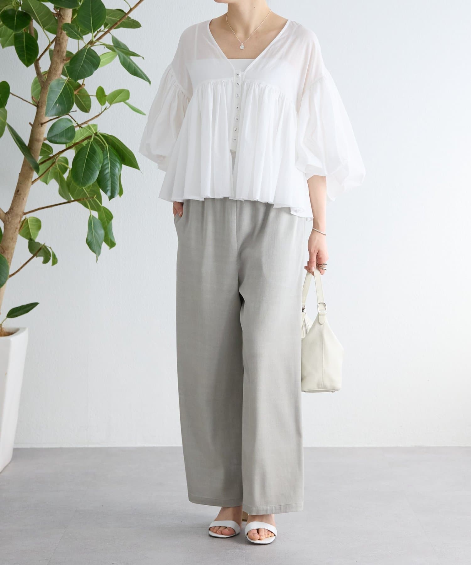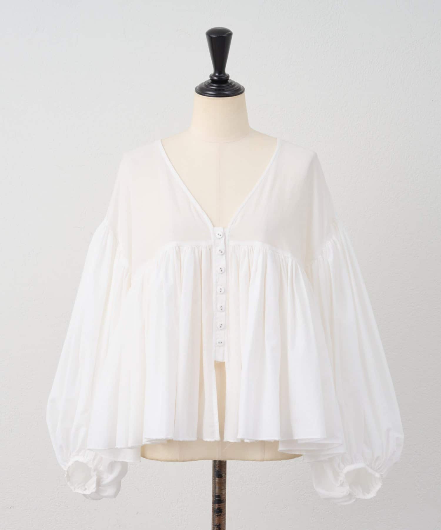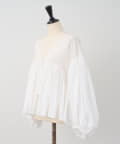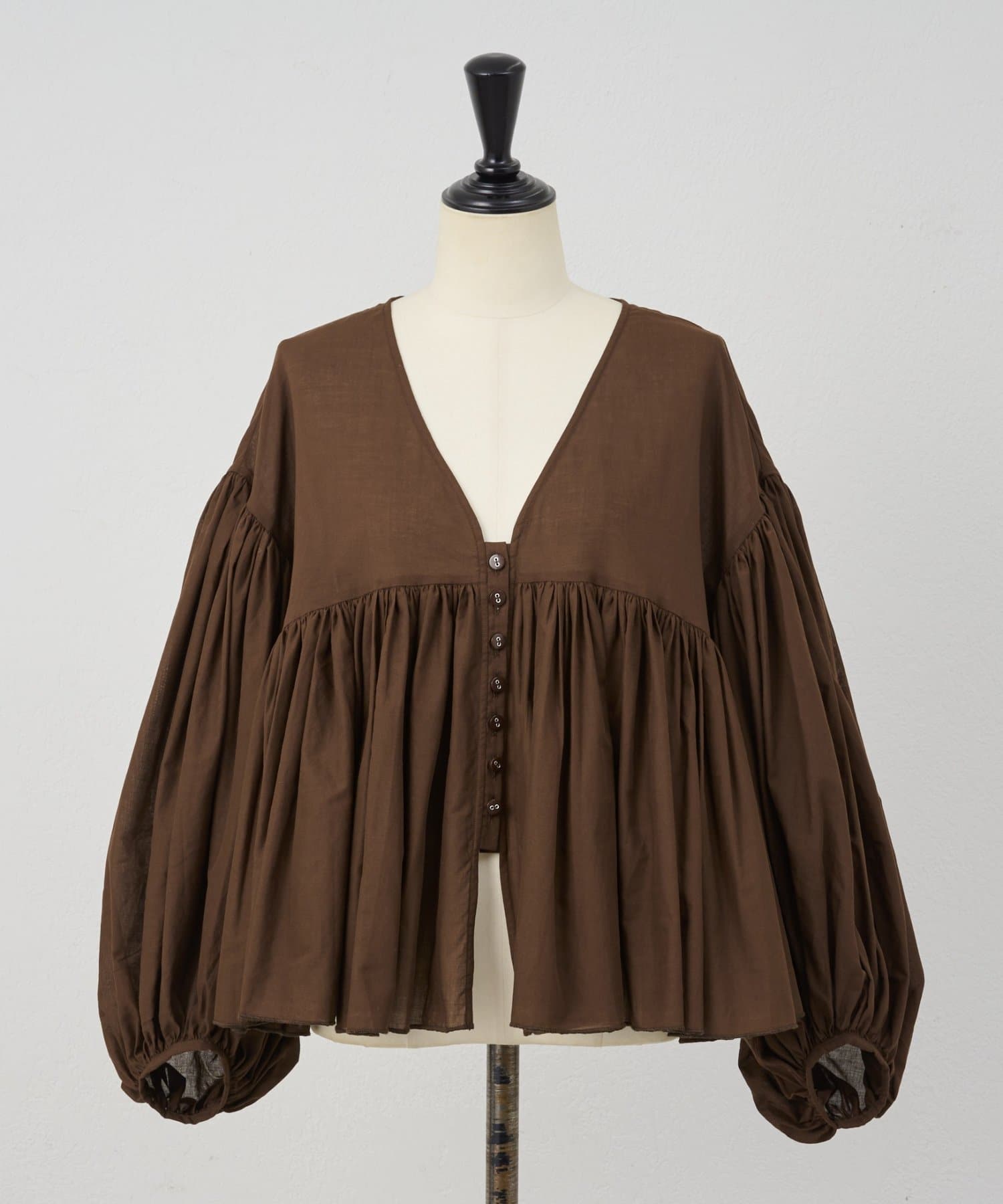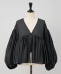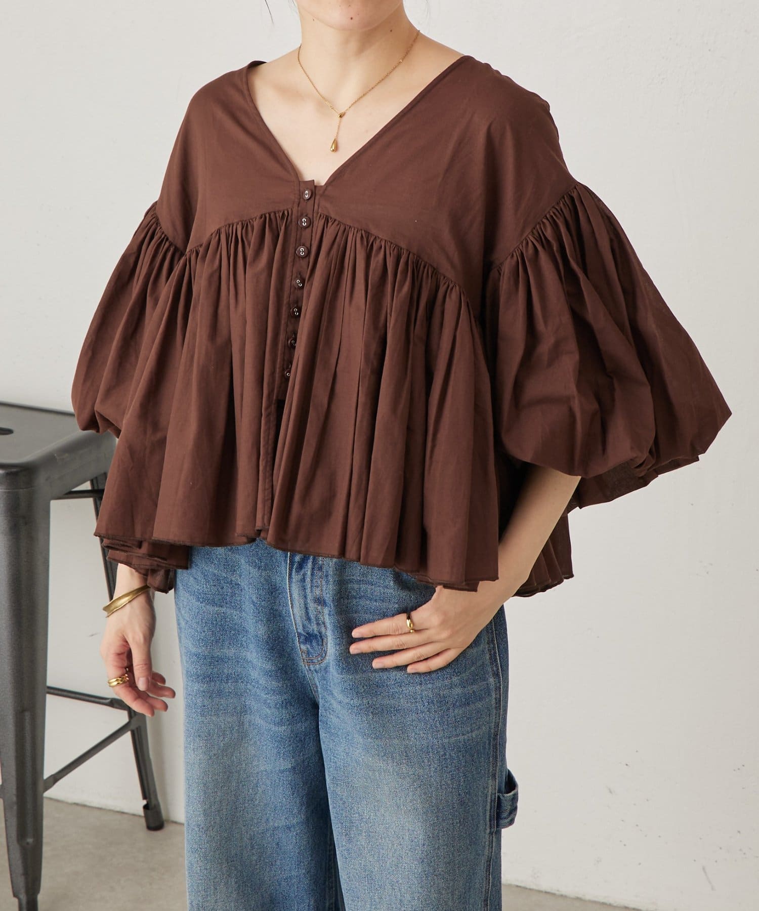 身幅にたっぷりとギャザーを施した、動きのあるシルエットが魅力のVネックブラウス。