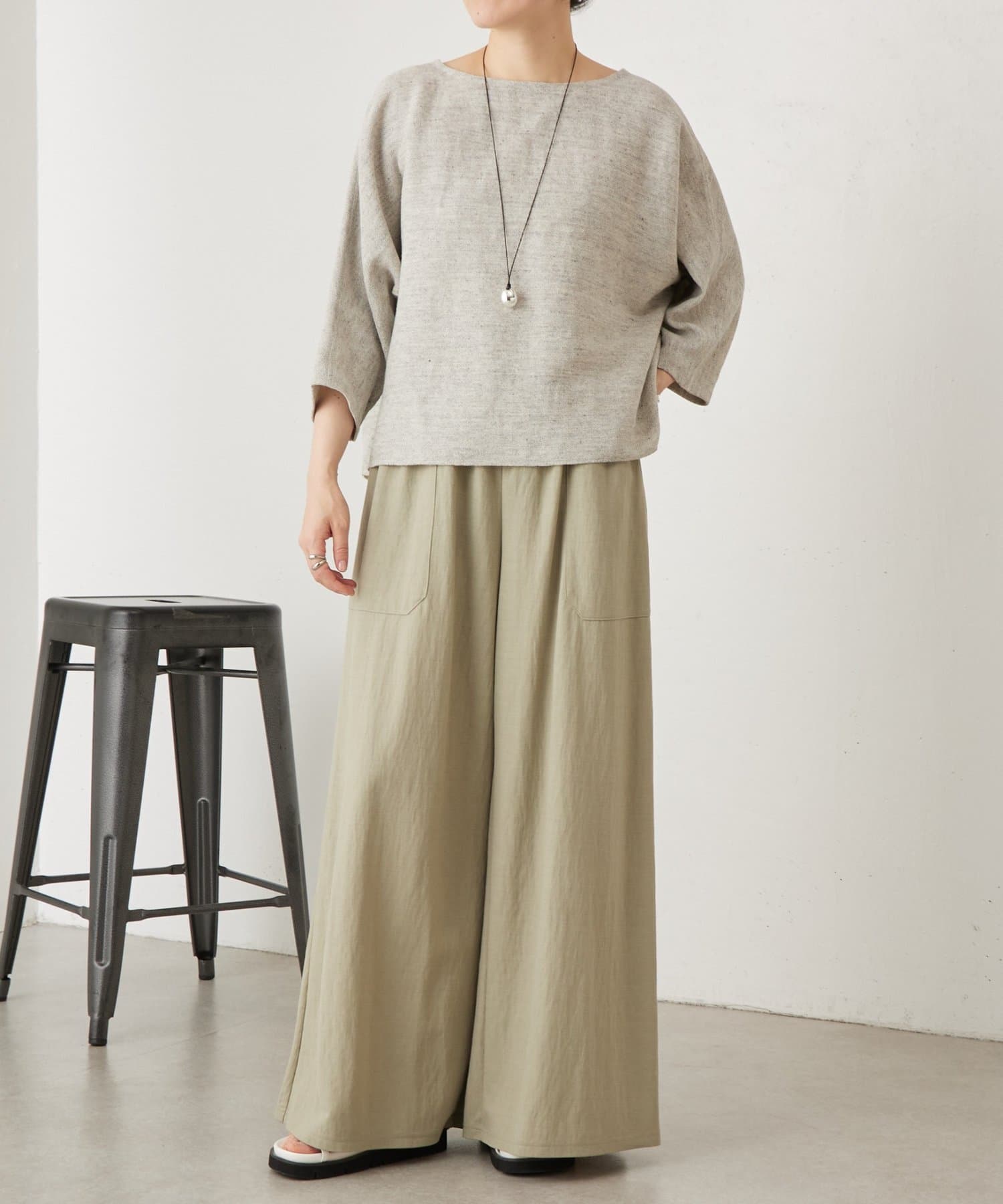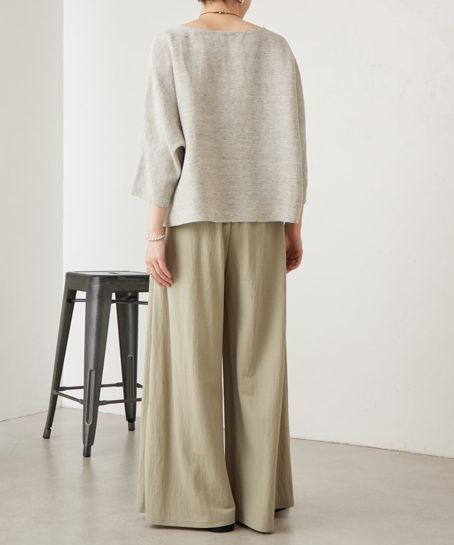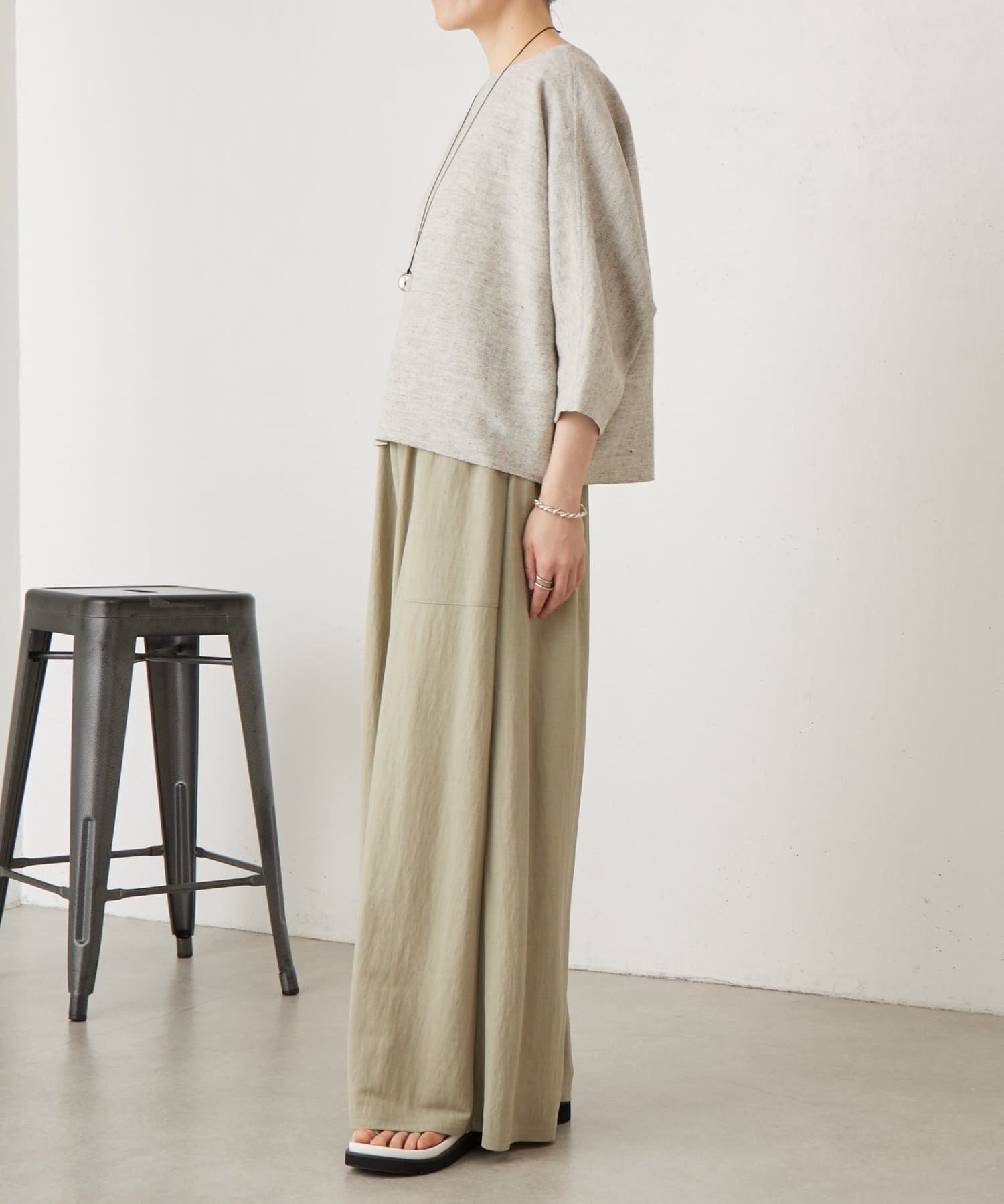 リネン100%ながら、インレイ編みならではのなめらかさと程よいハリ感があり、カジュアルすぎず上品な印象に。