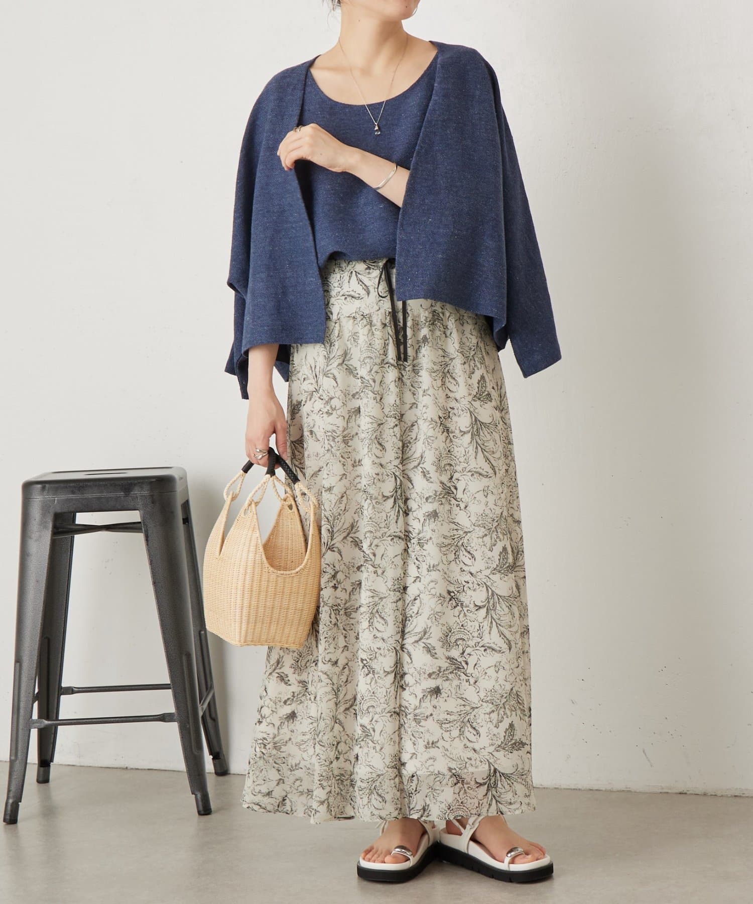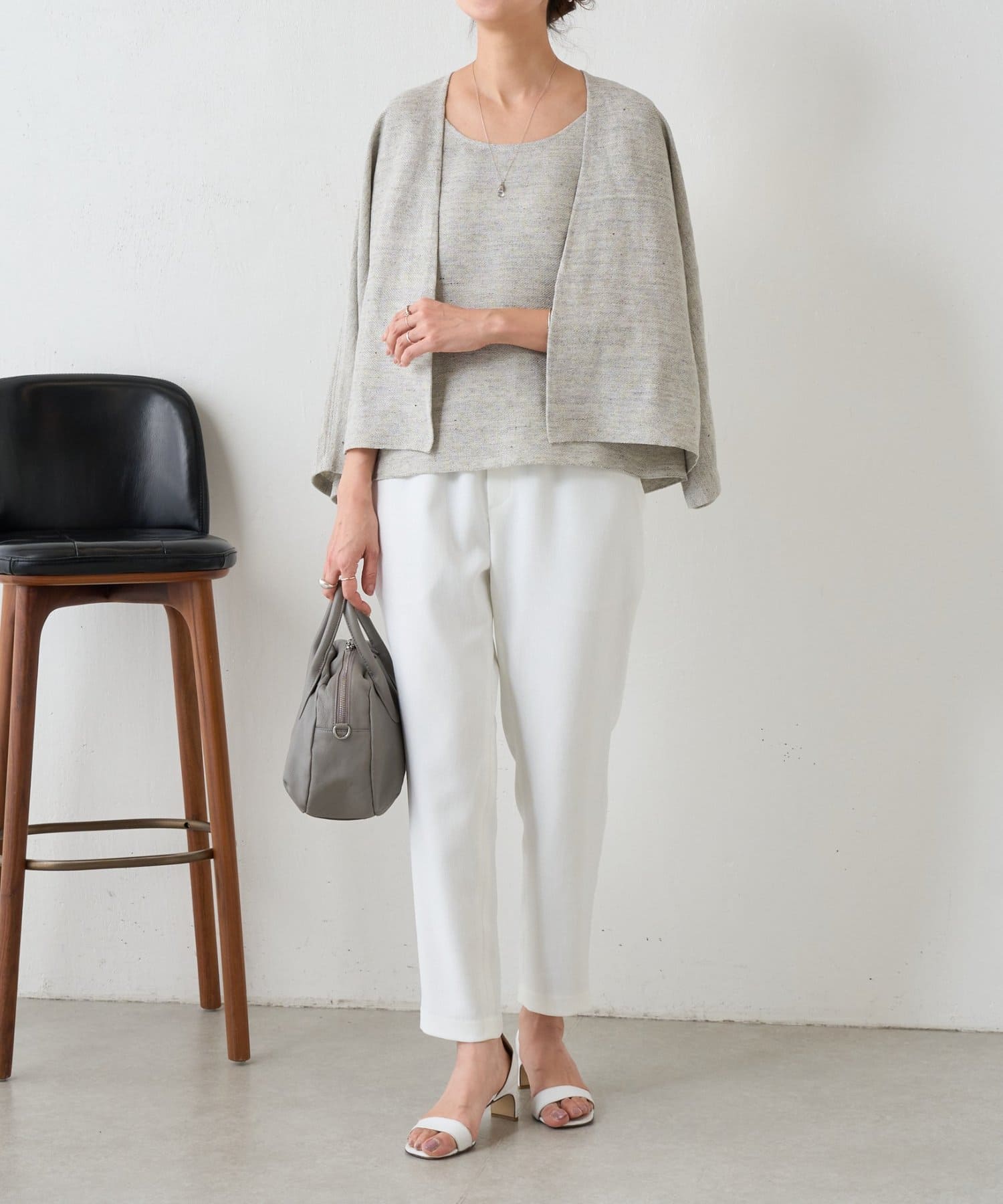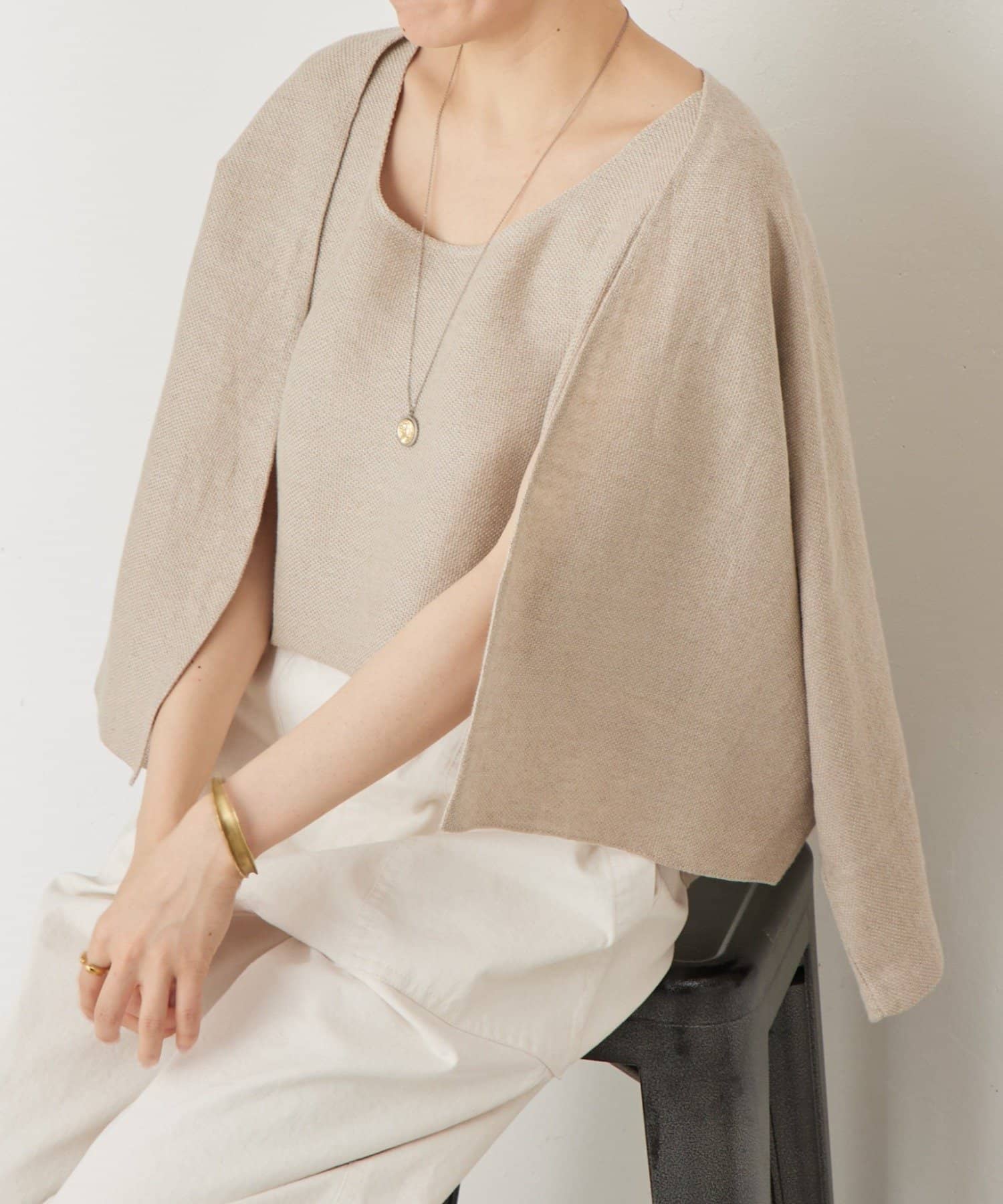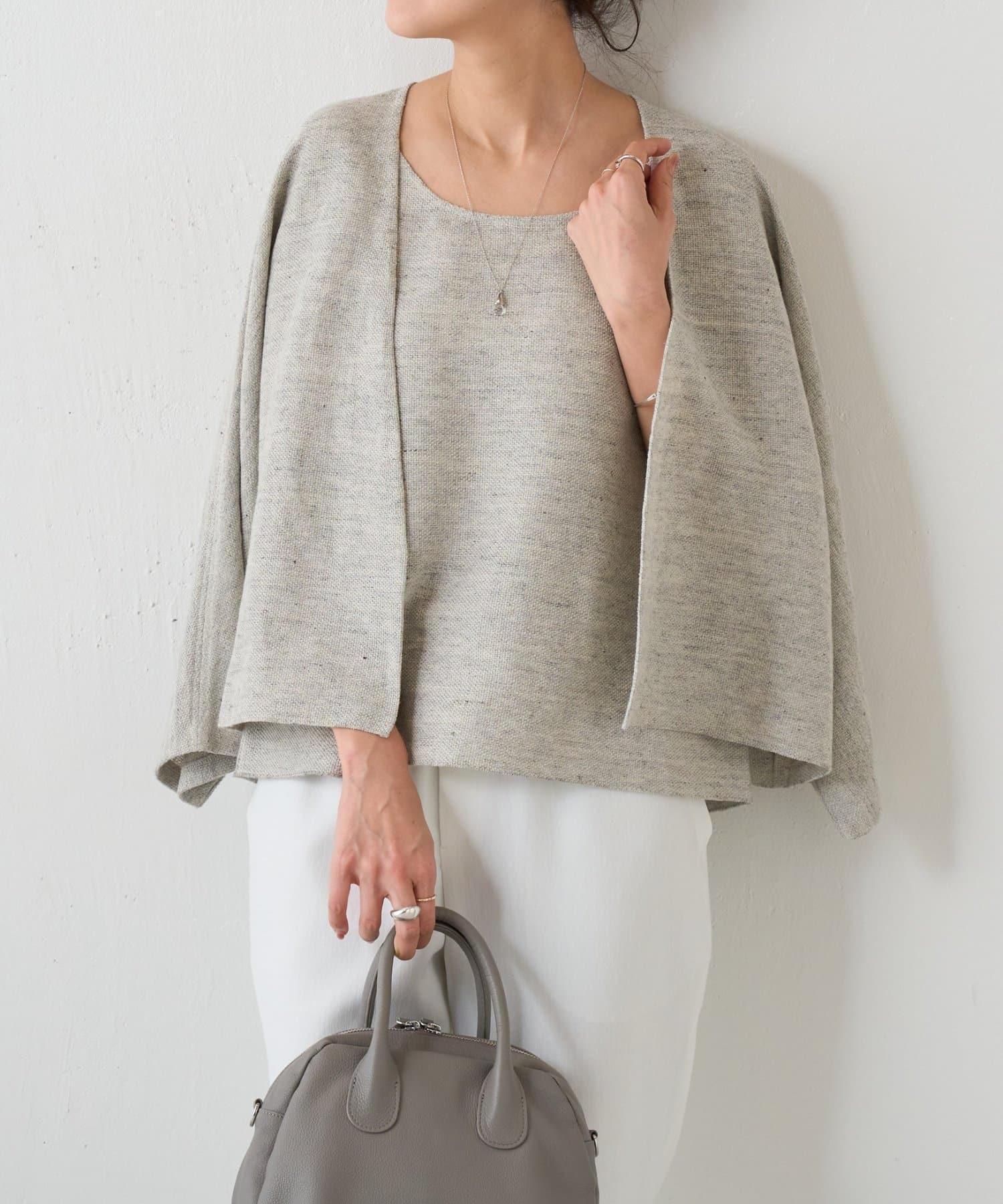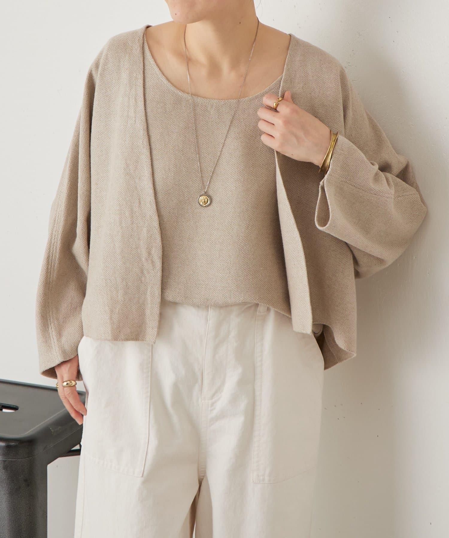 同素材のカーディガンと合わせれば、統一感のある大人のレイヤードスタイルが完成します。