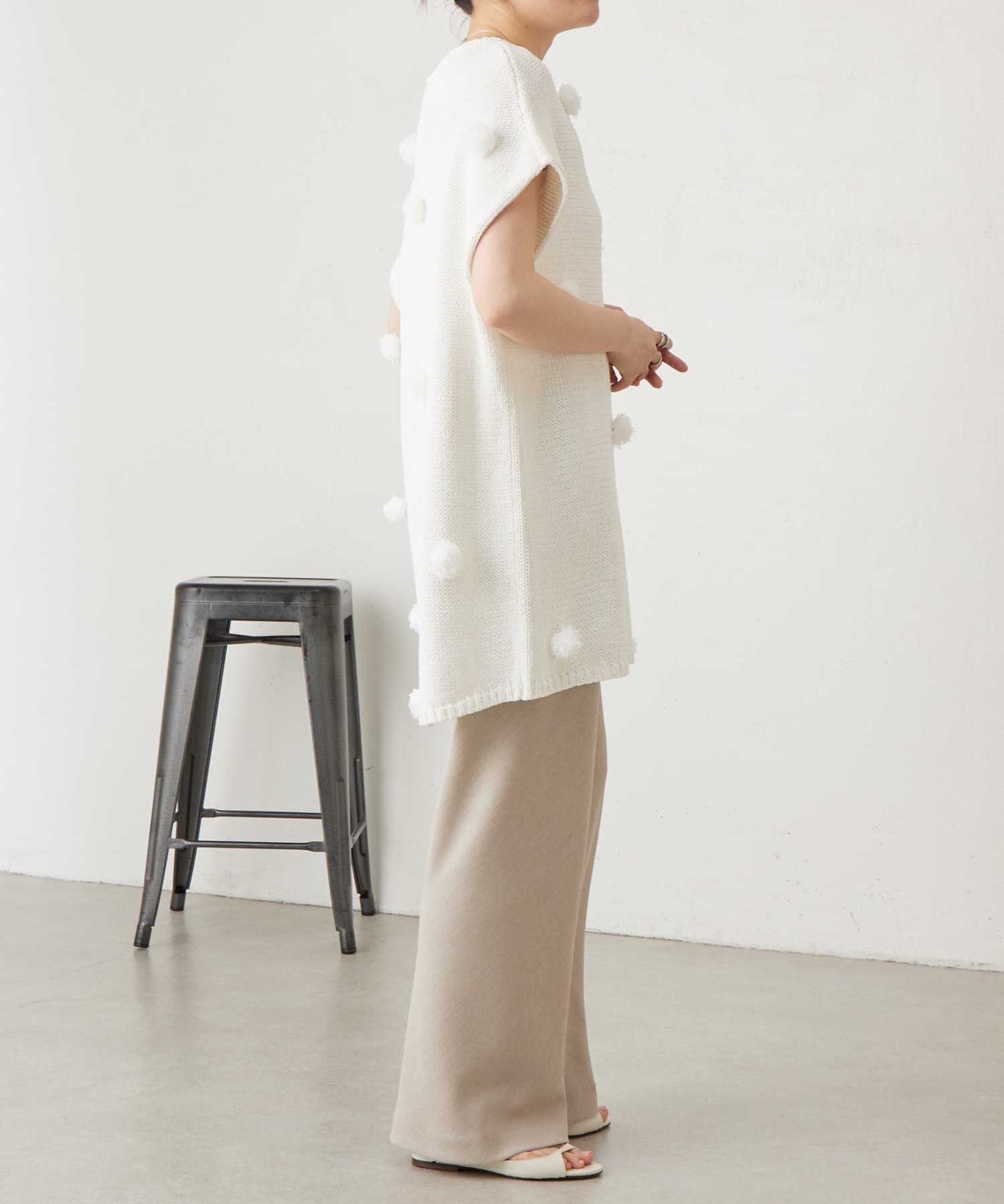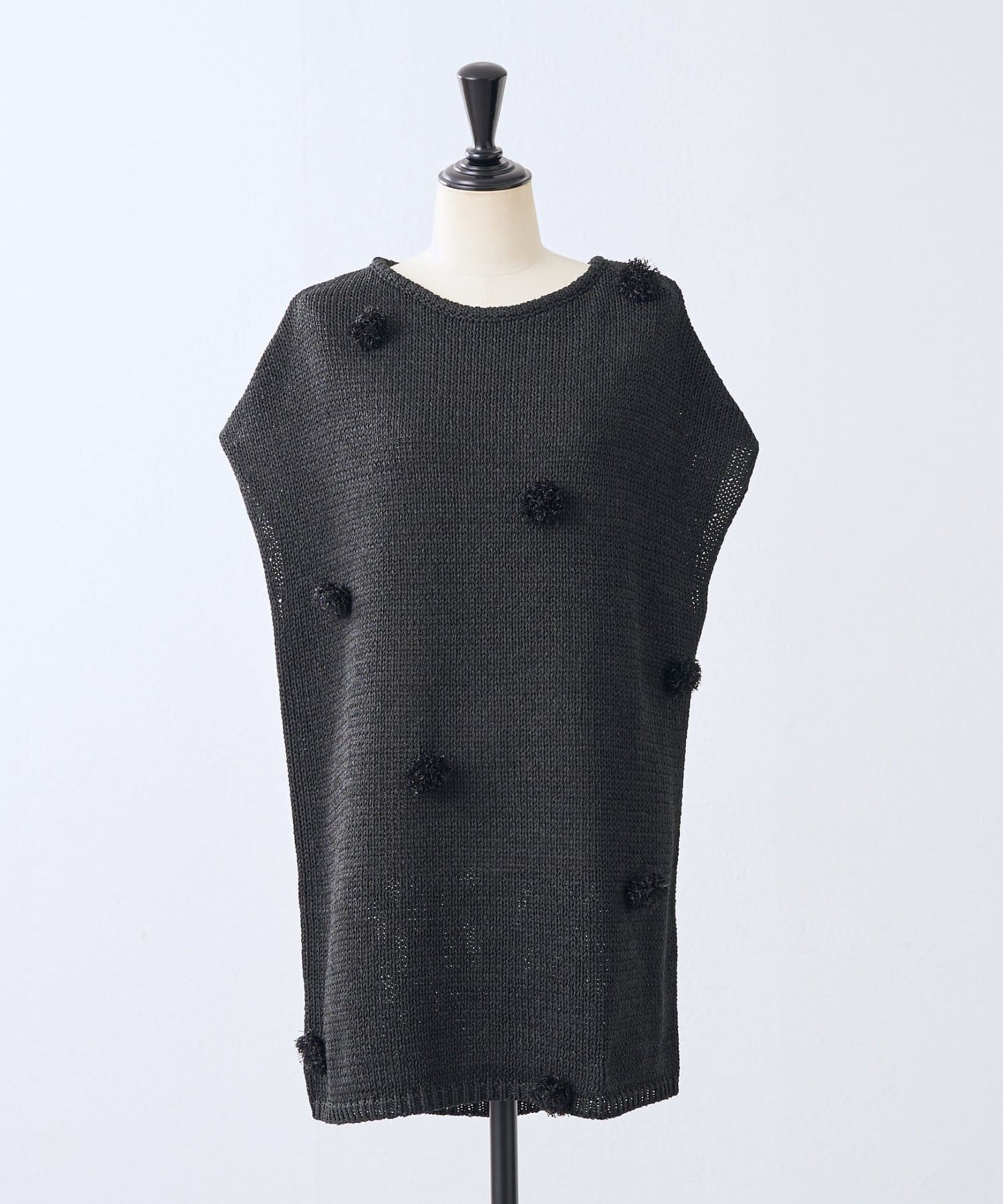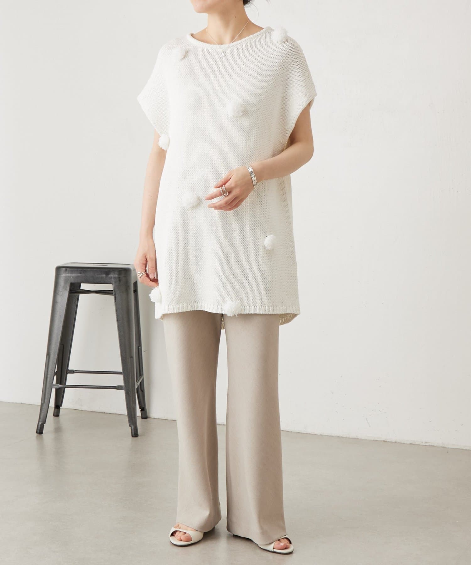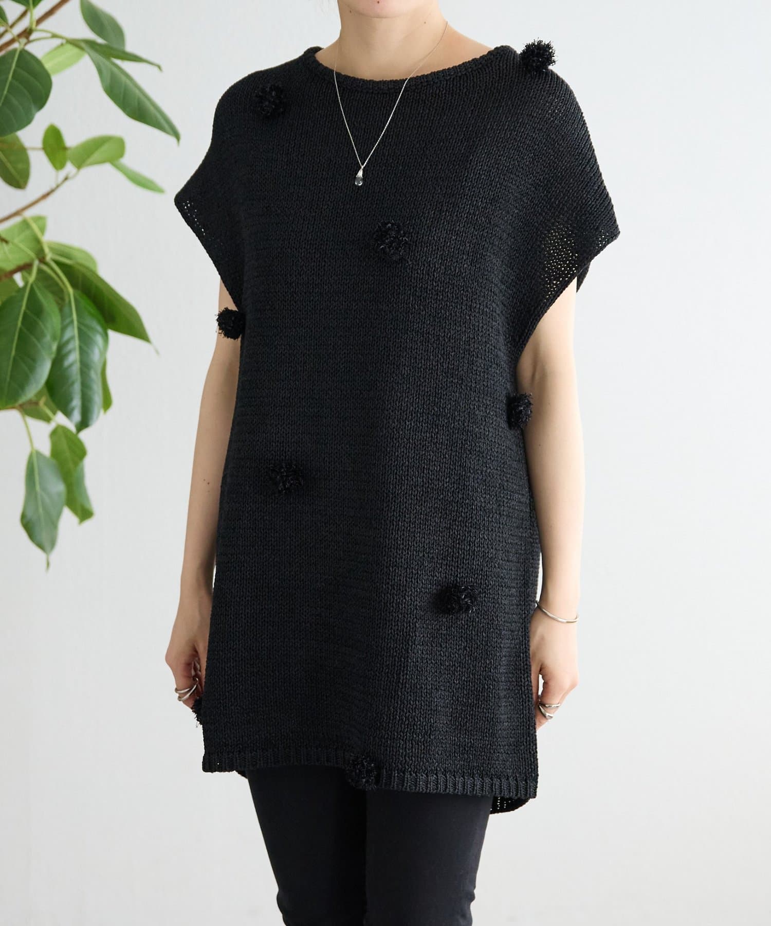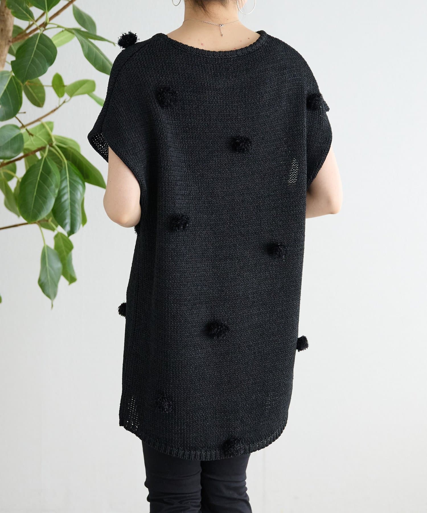 立体的なポンポンモチーフがついたフレンチスリーブニット。