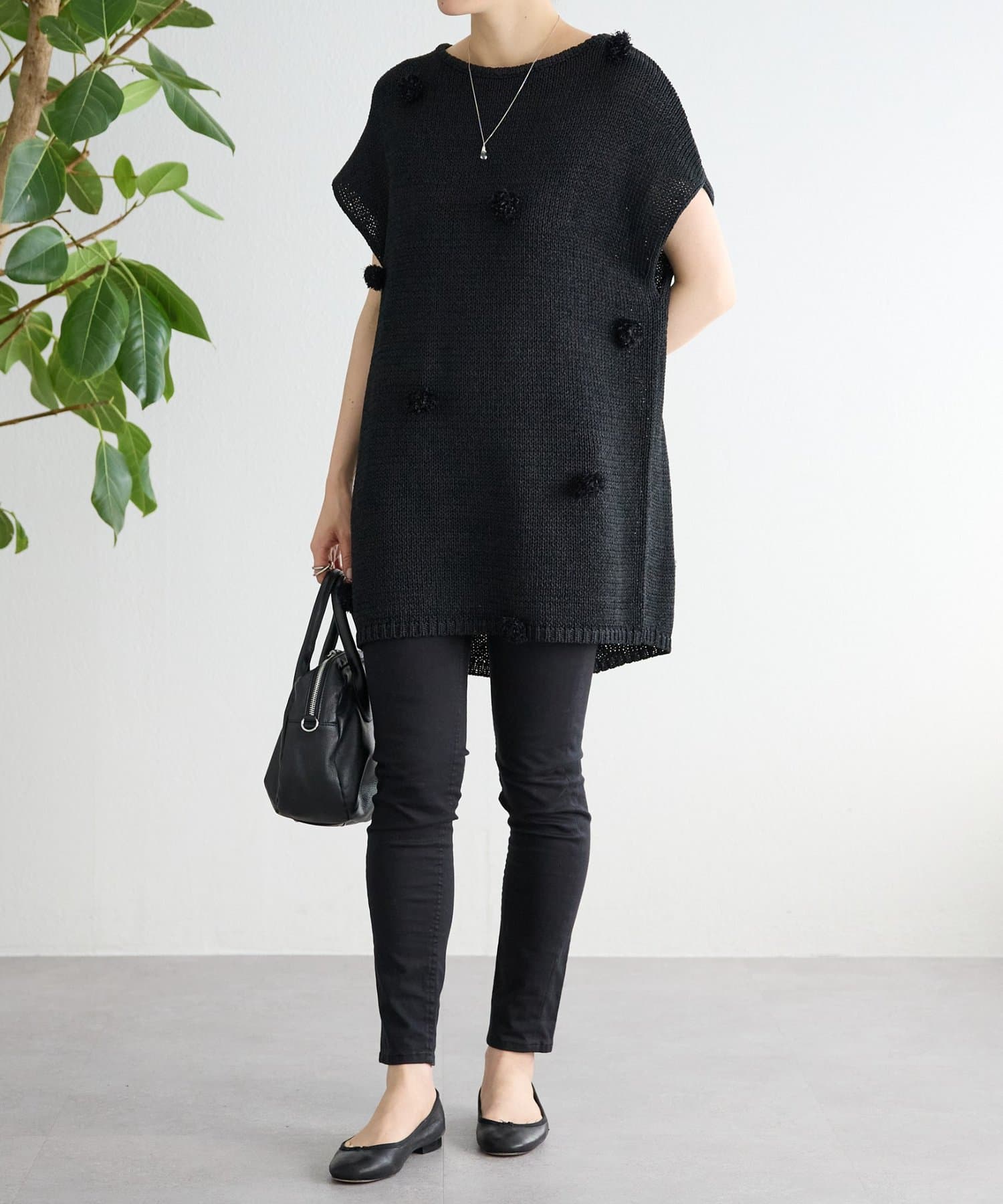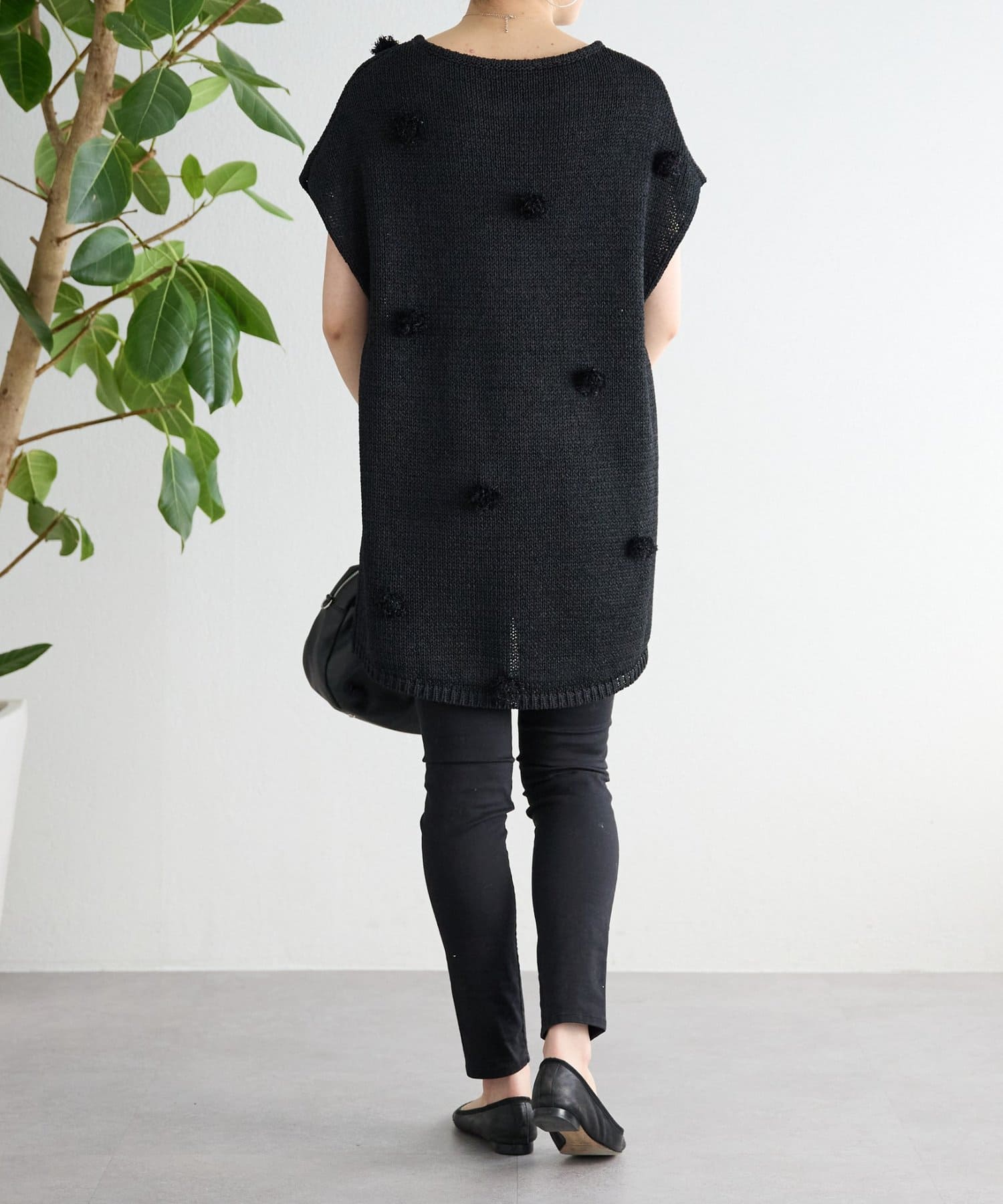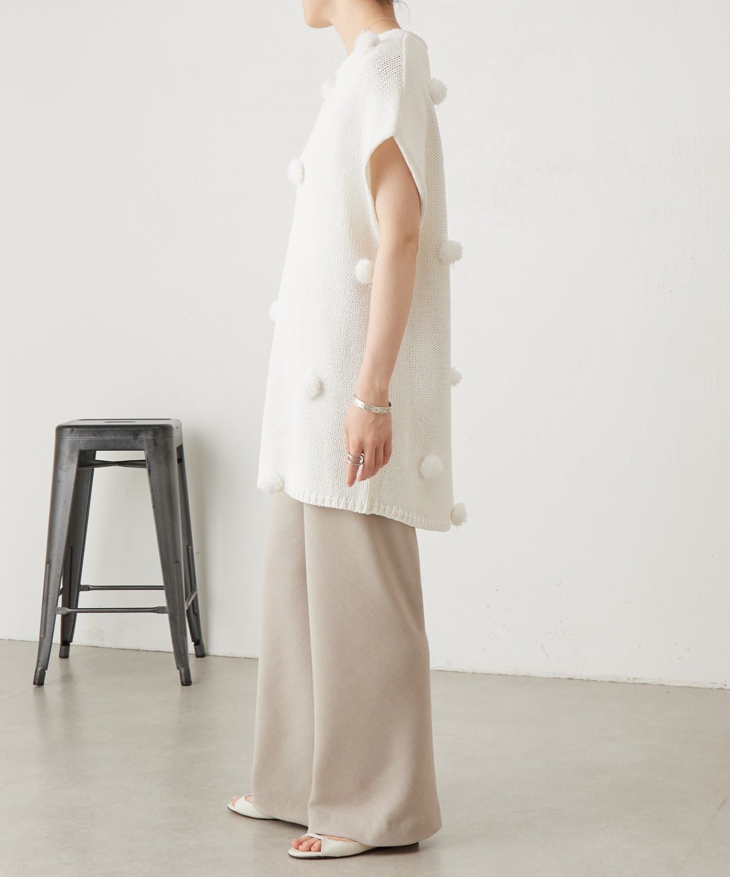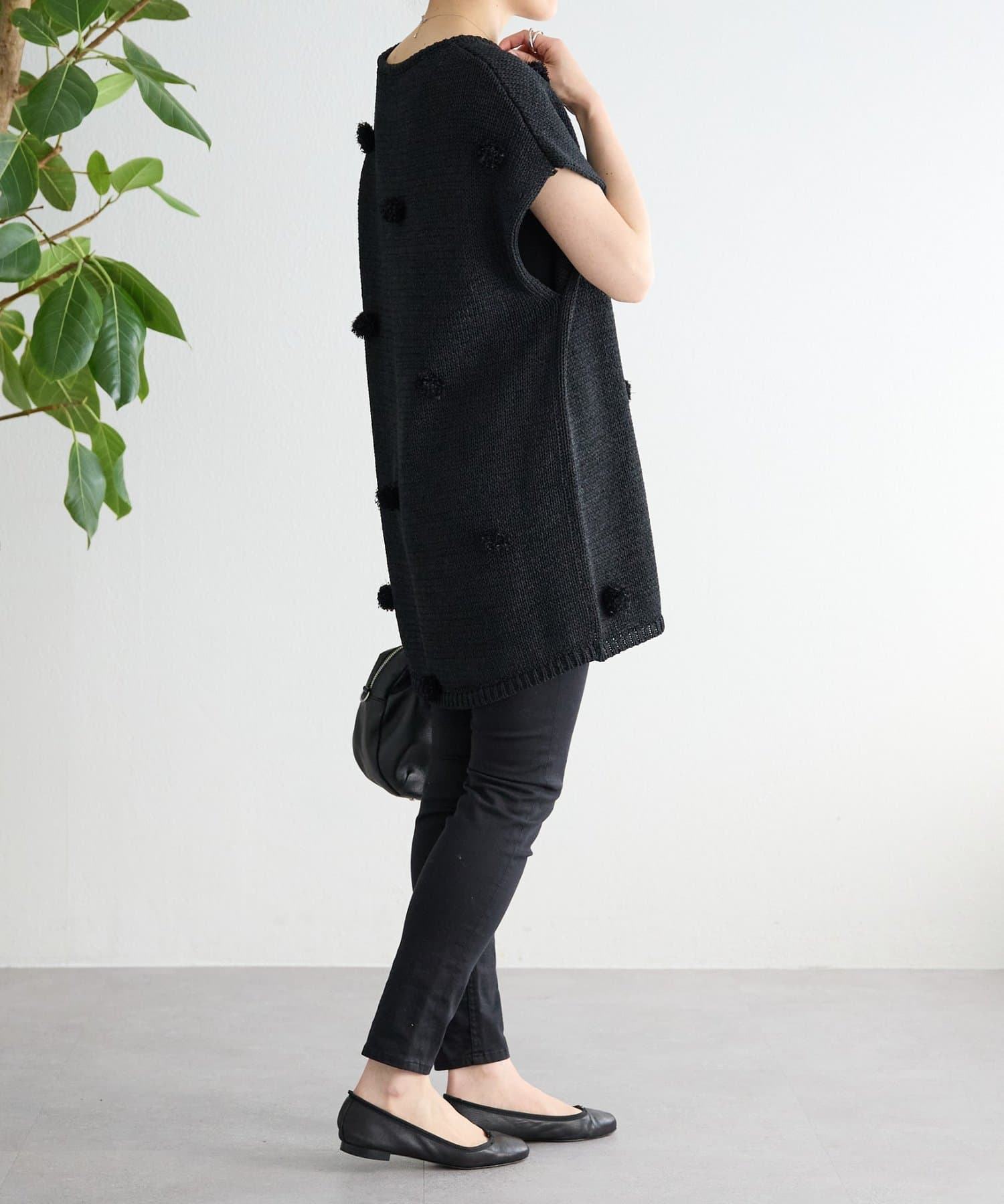 立体的なポンポンモチーフがついたフレンチスリーブニット。