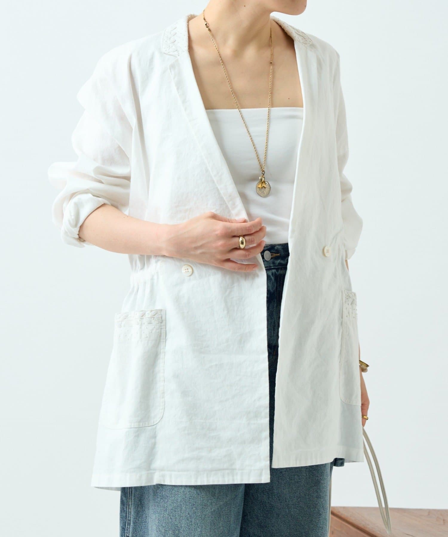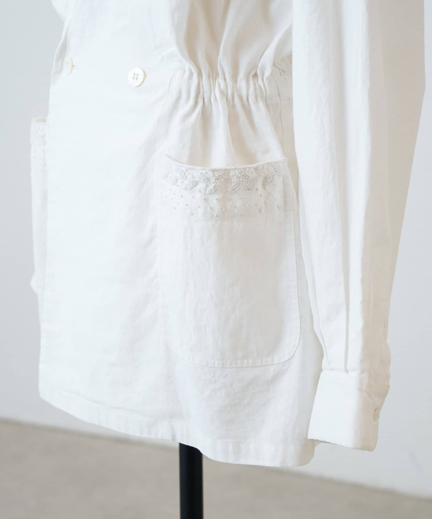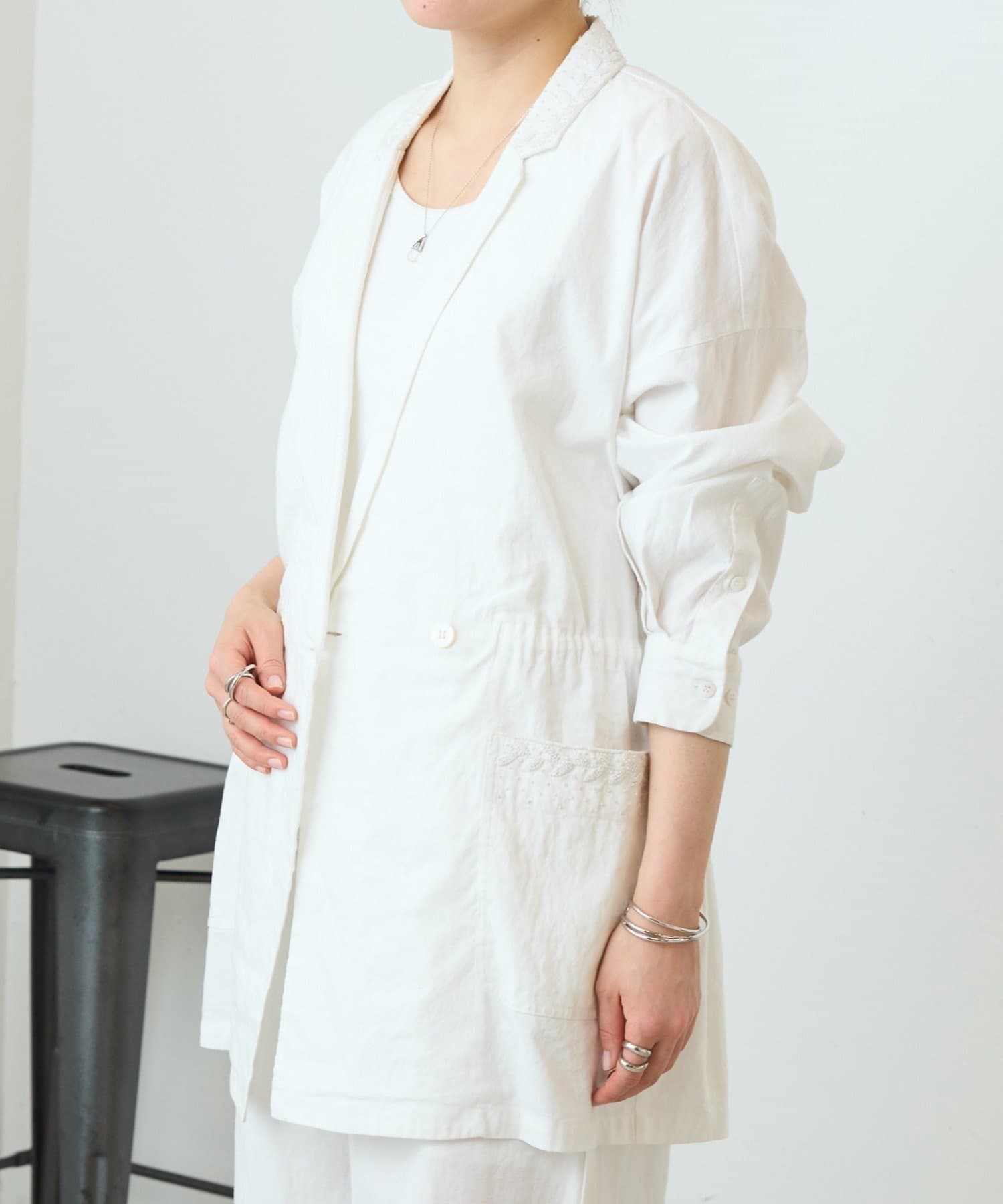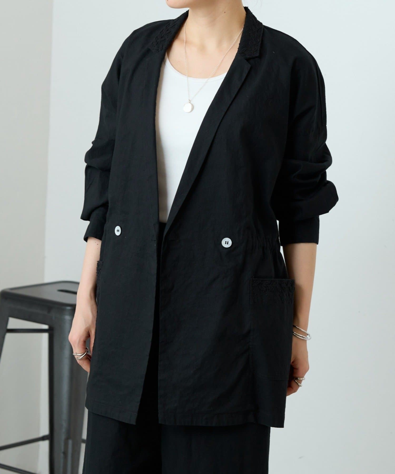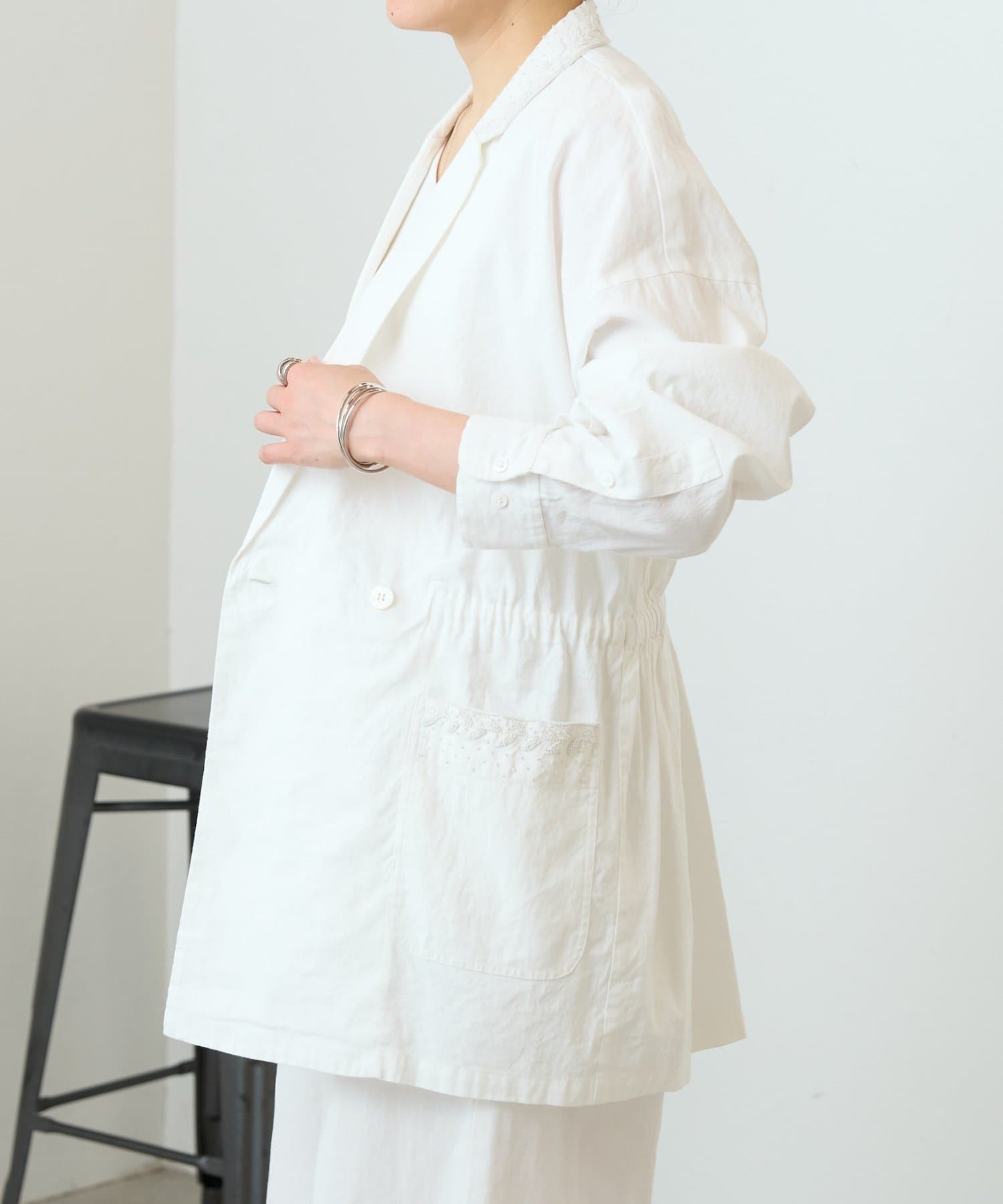 襟元とポケットに施したハンド刺繍がさりげないアクセントになったジャケット。