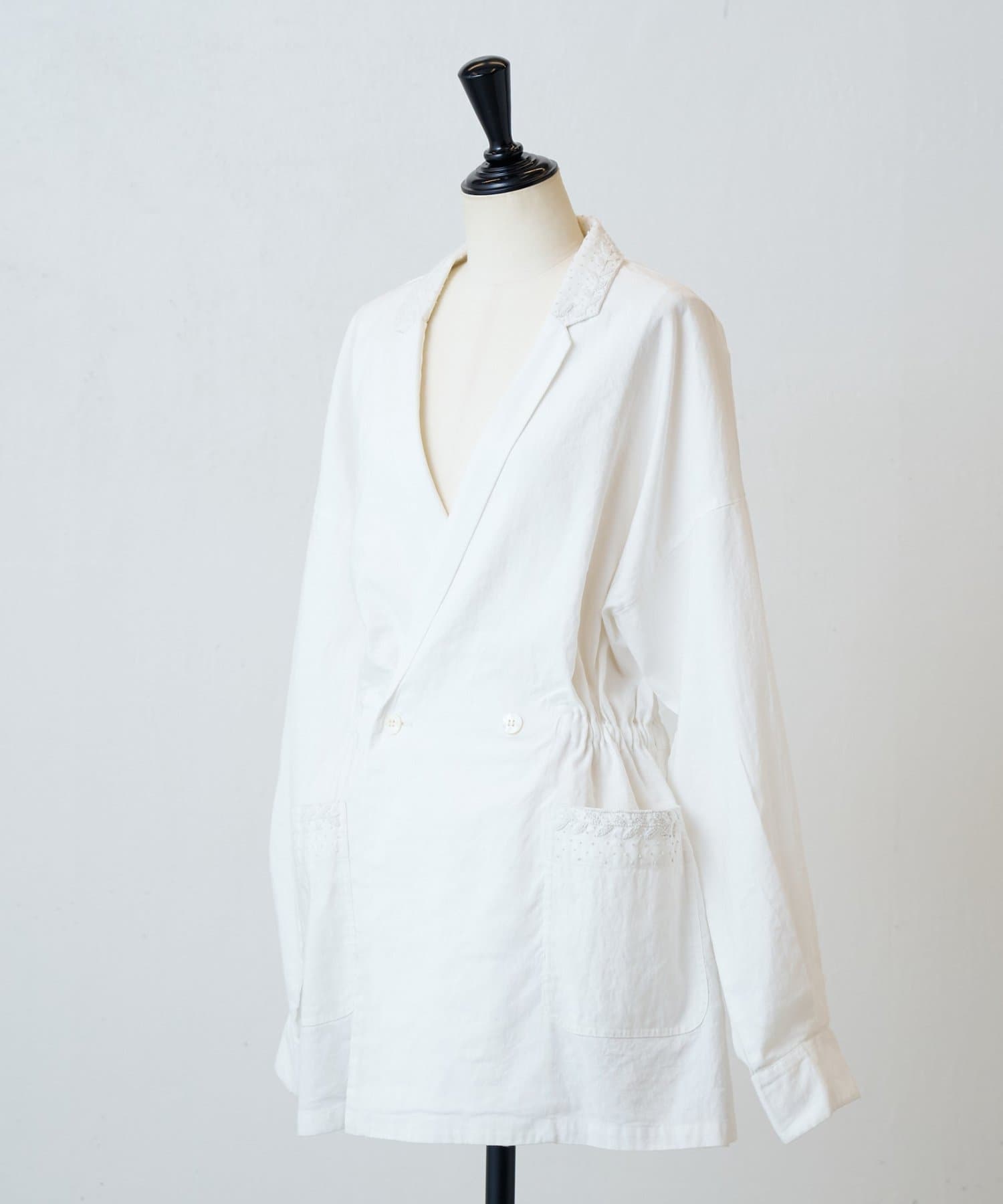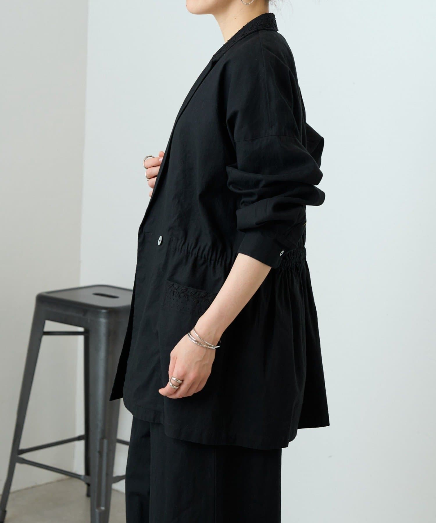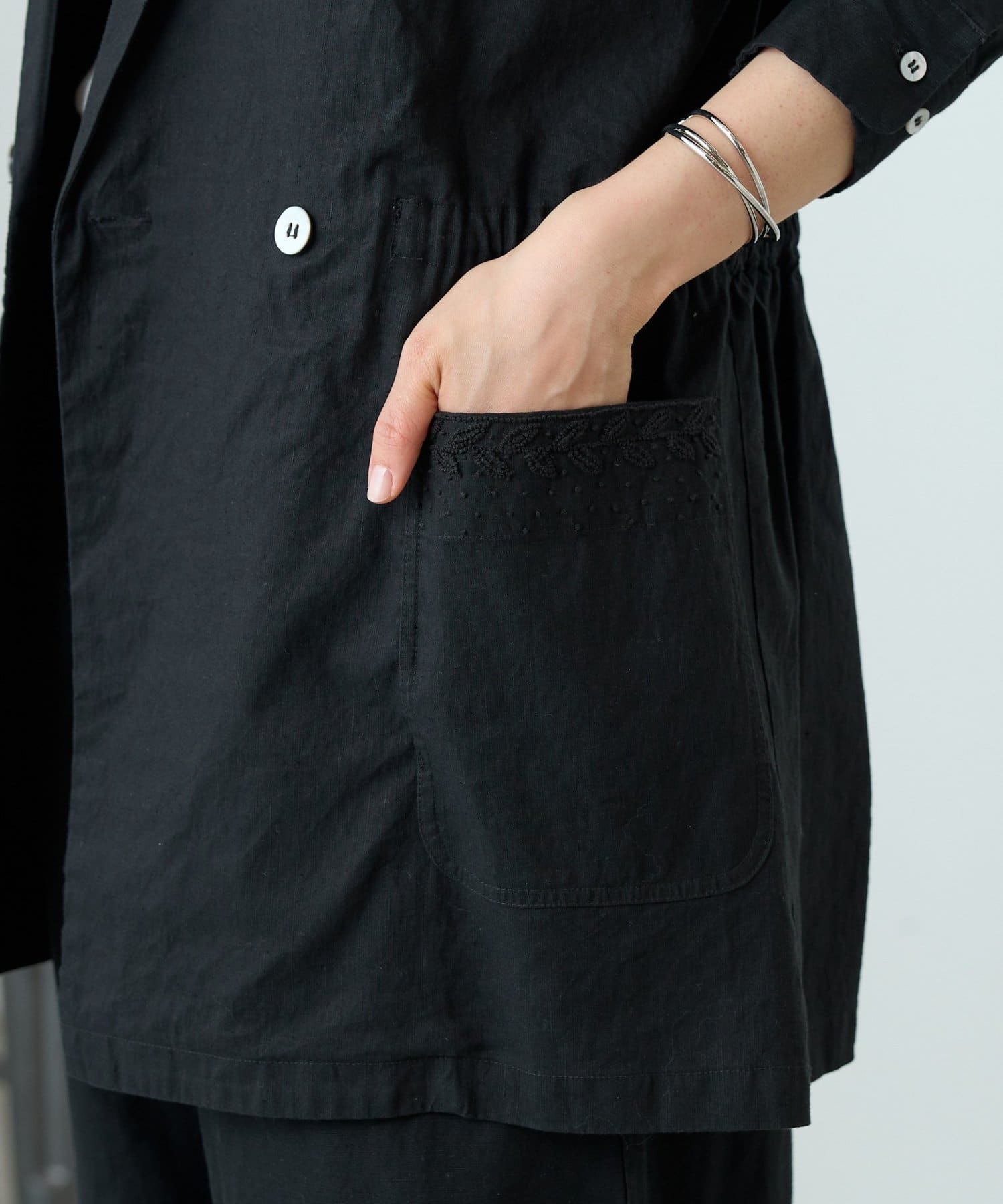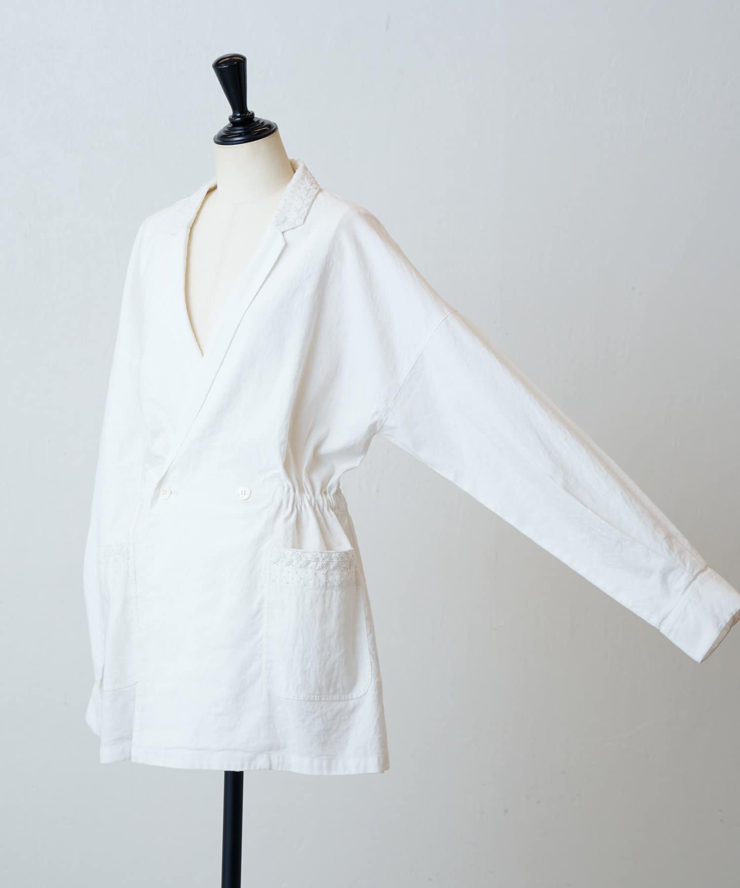 襟元とポケットに施したハンド刺繍がさりげないアクセントになったジャケット。