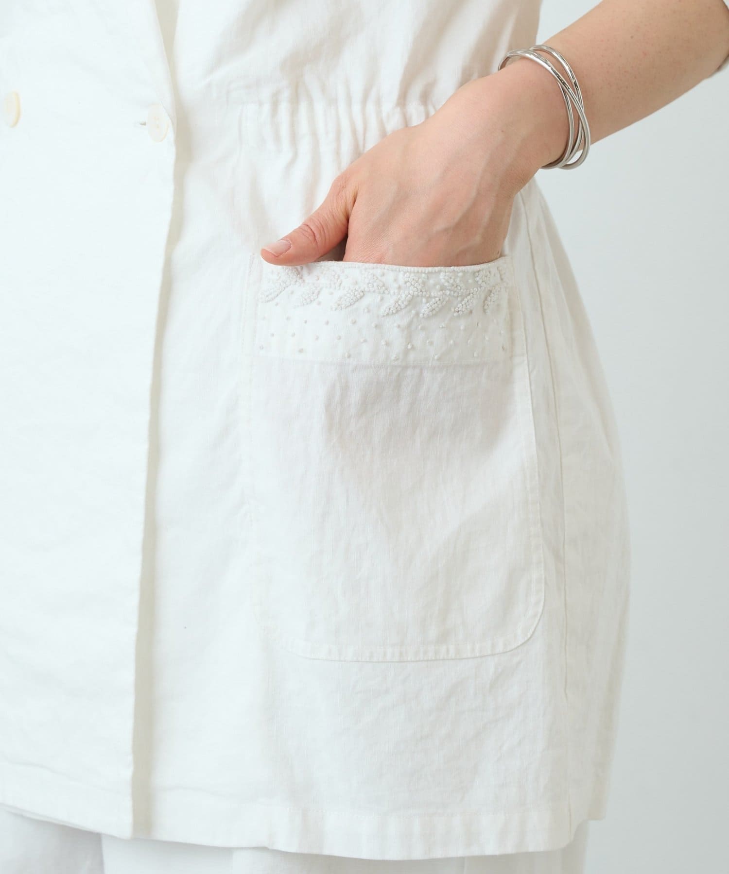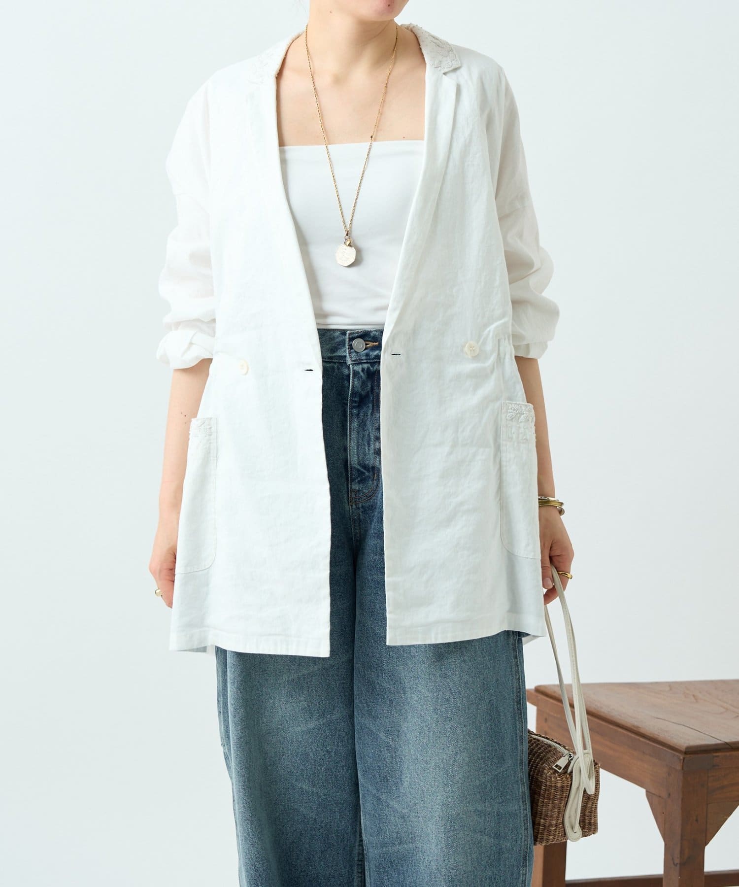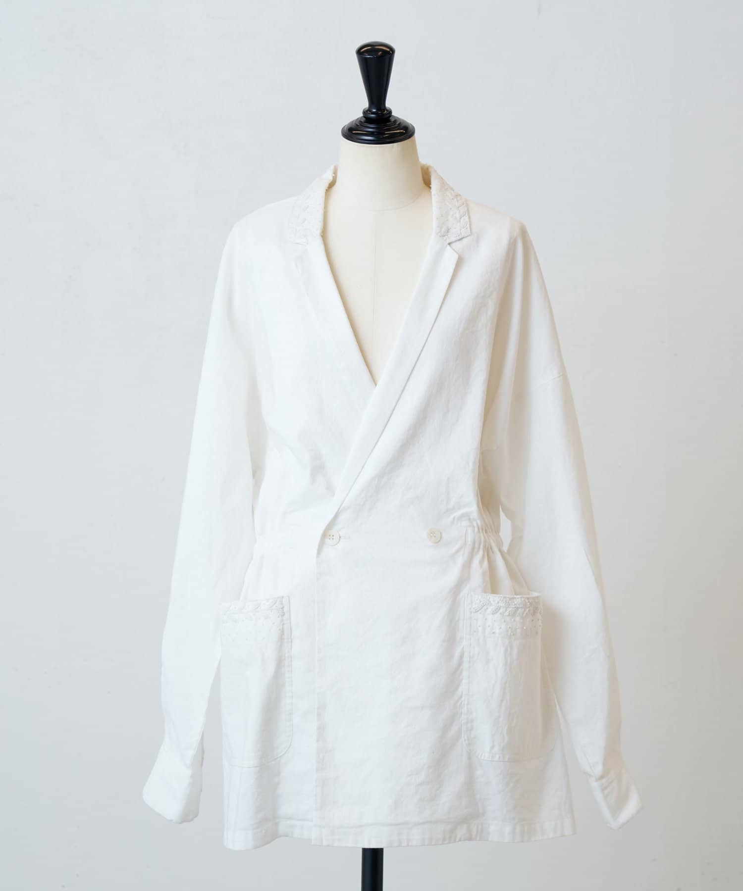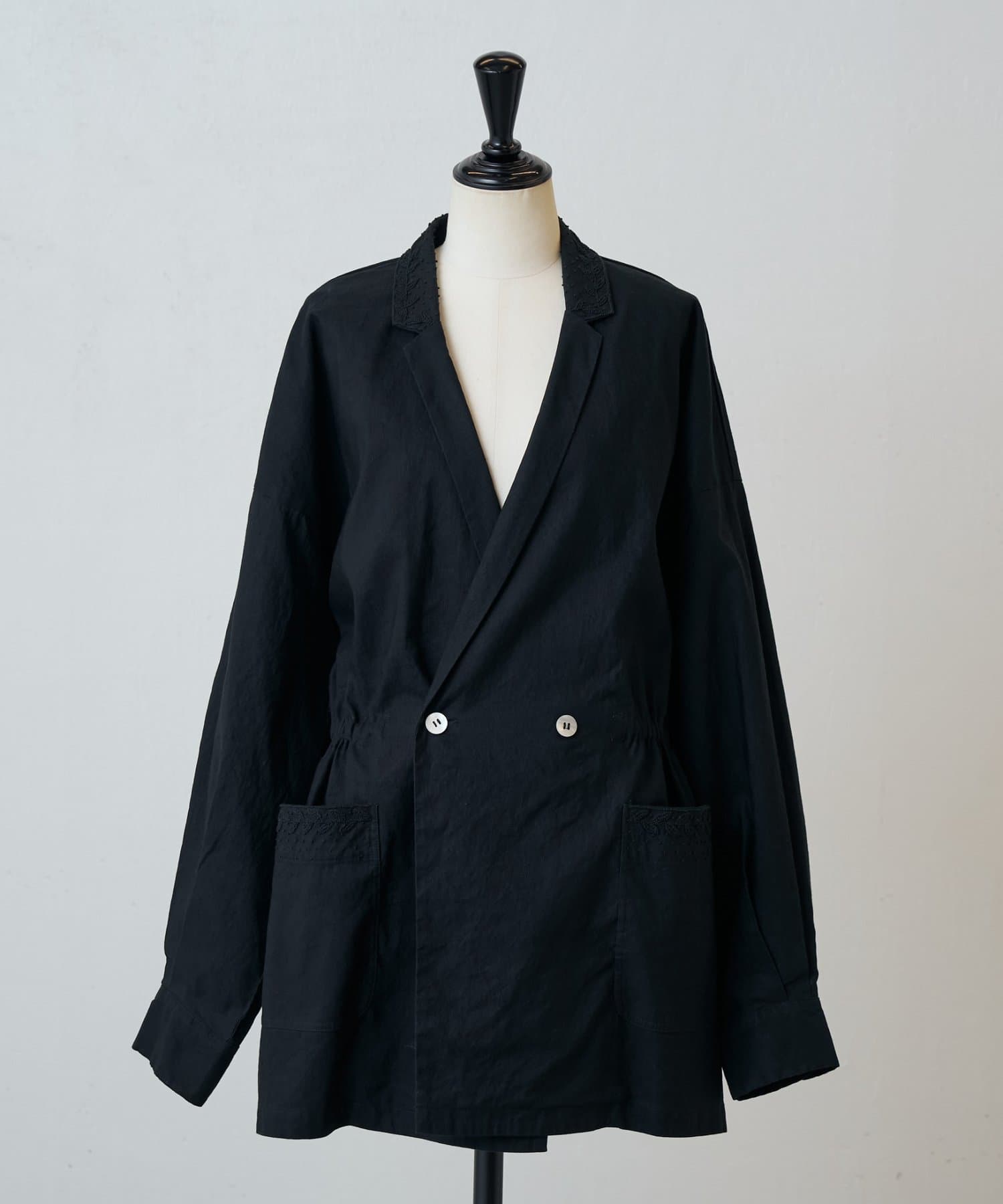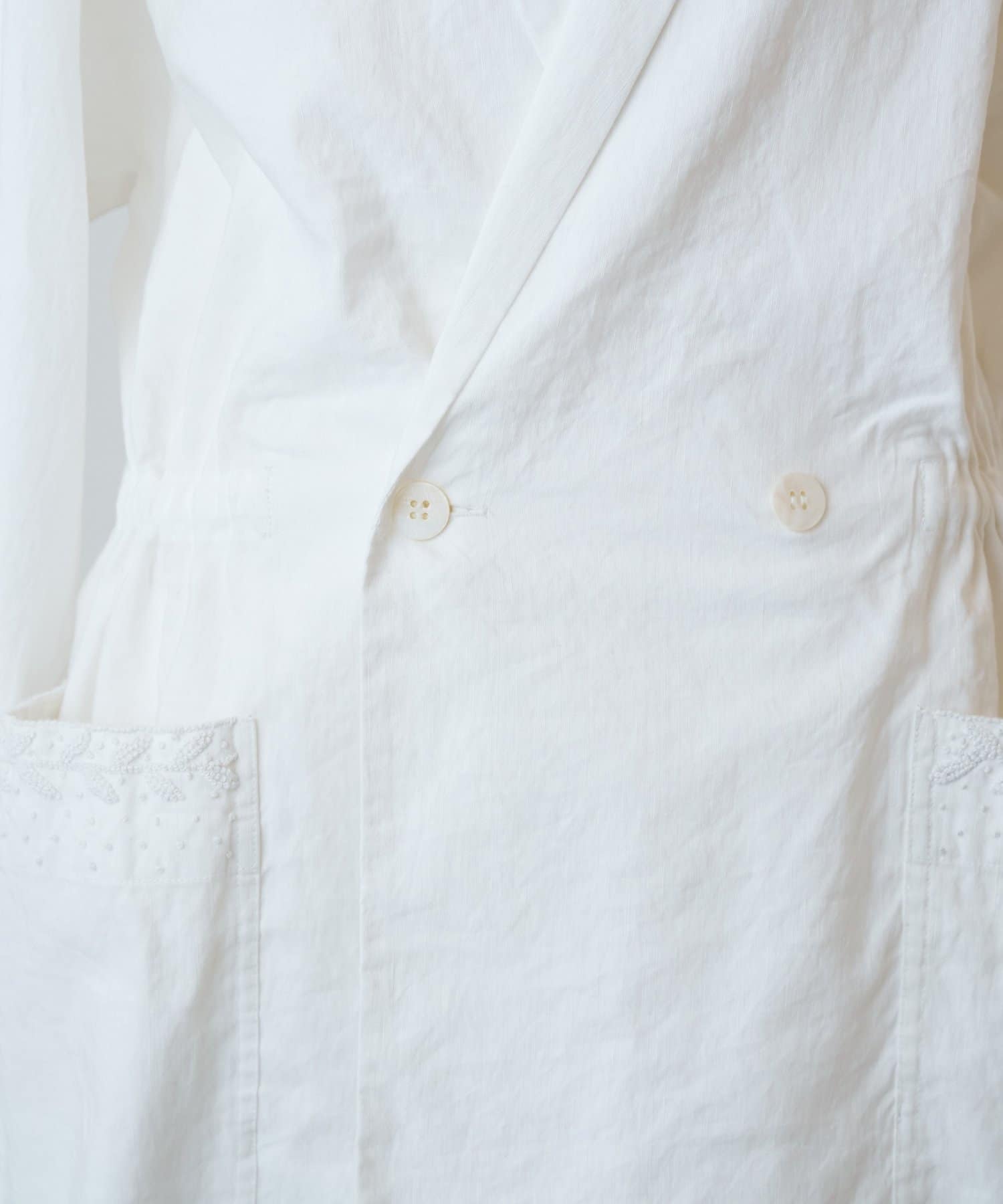 襟元とポケットに施したハンド刺繍がさりげないアクセントになったジャケット。