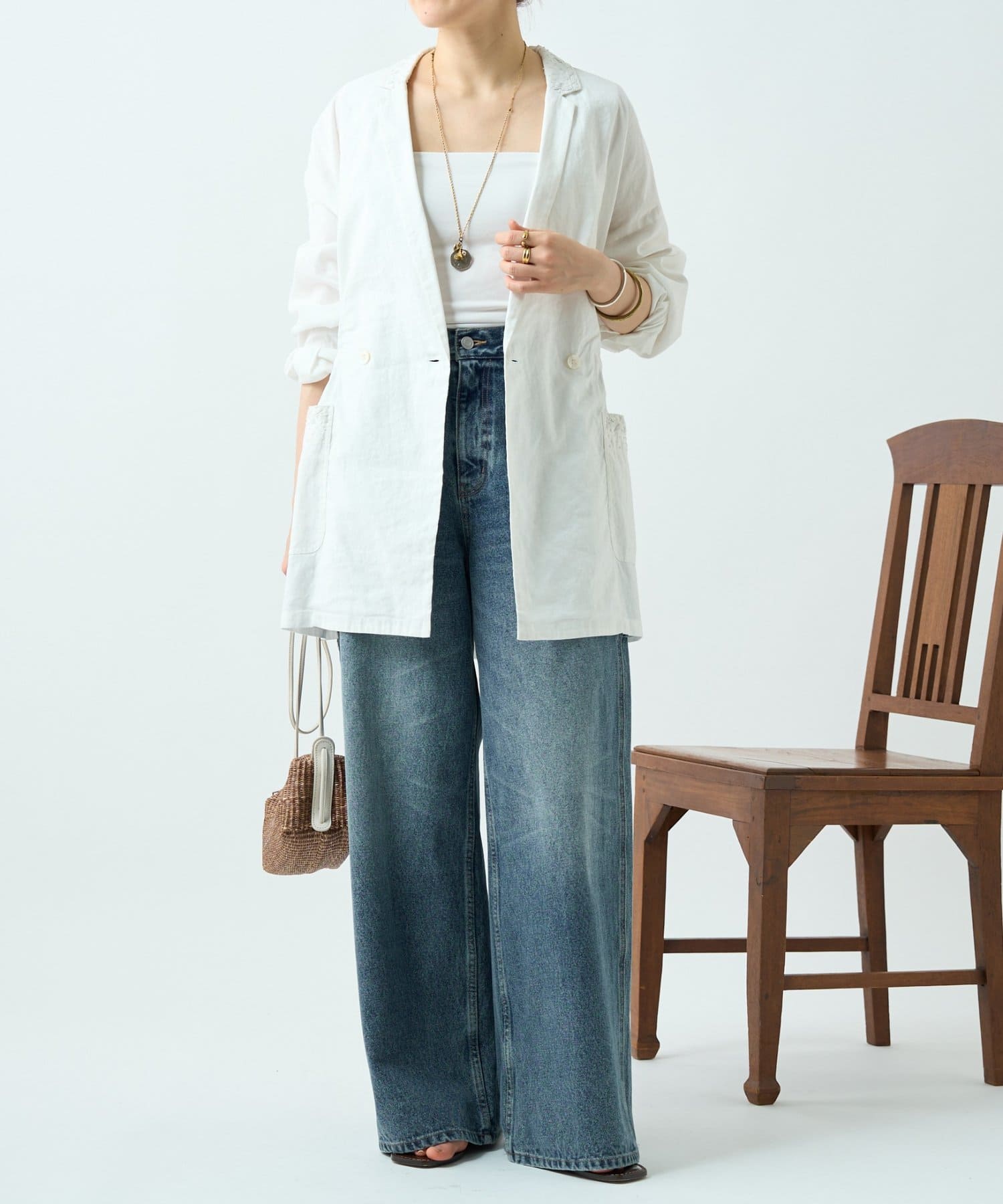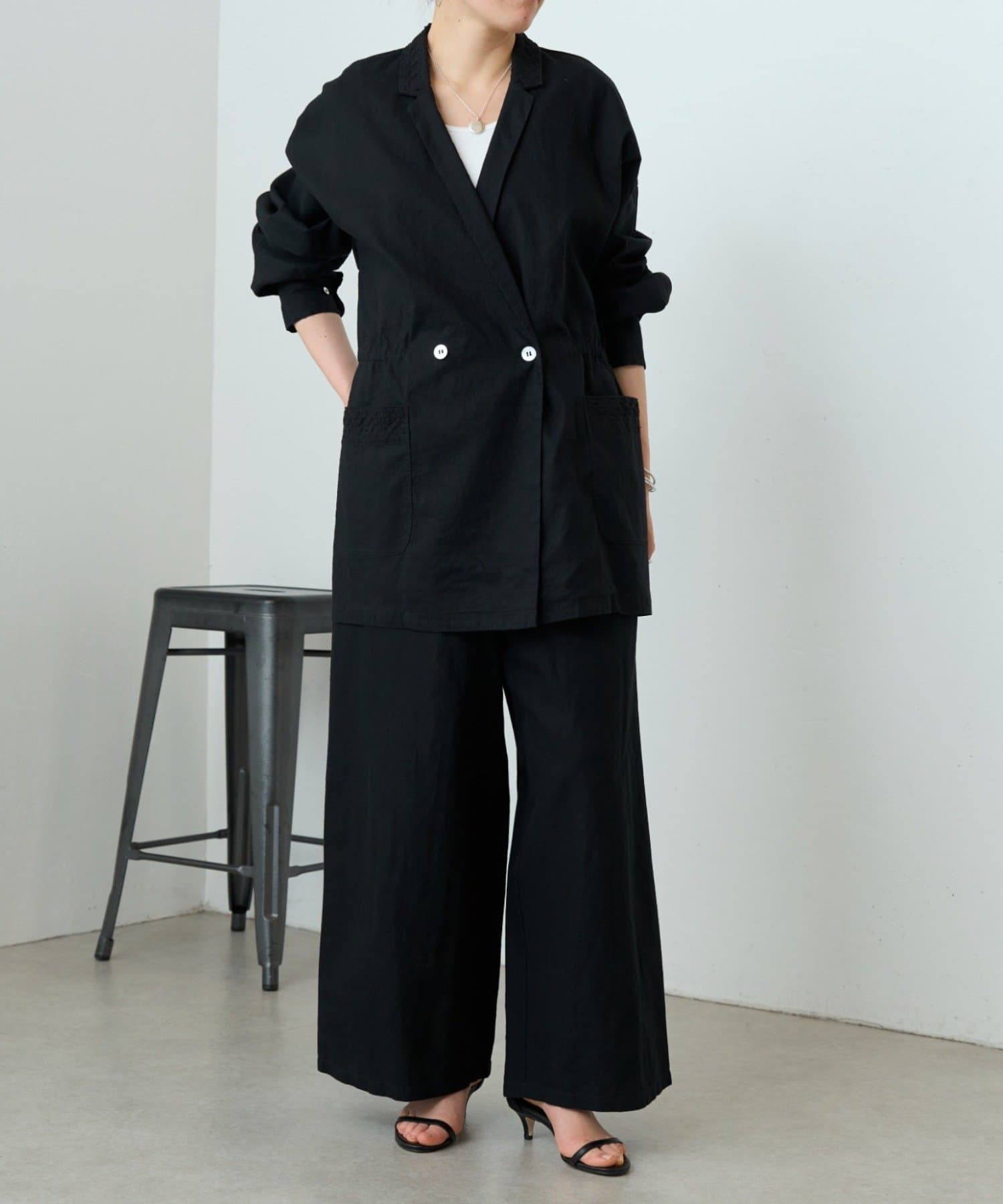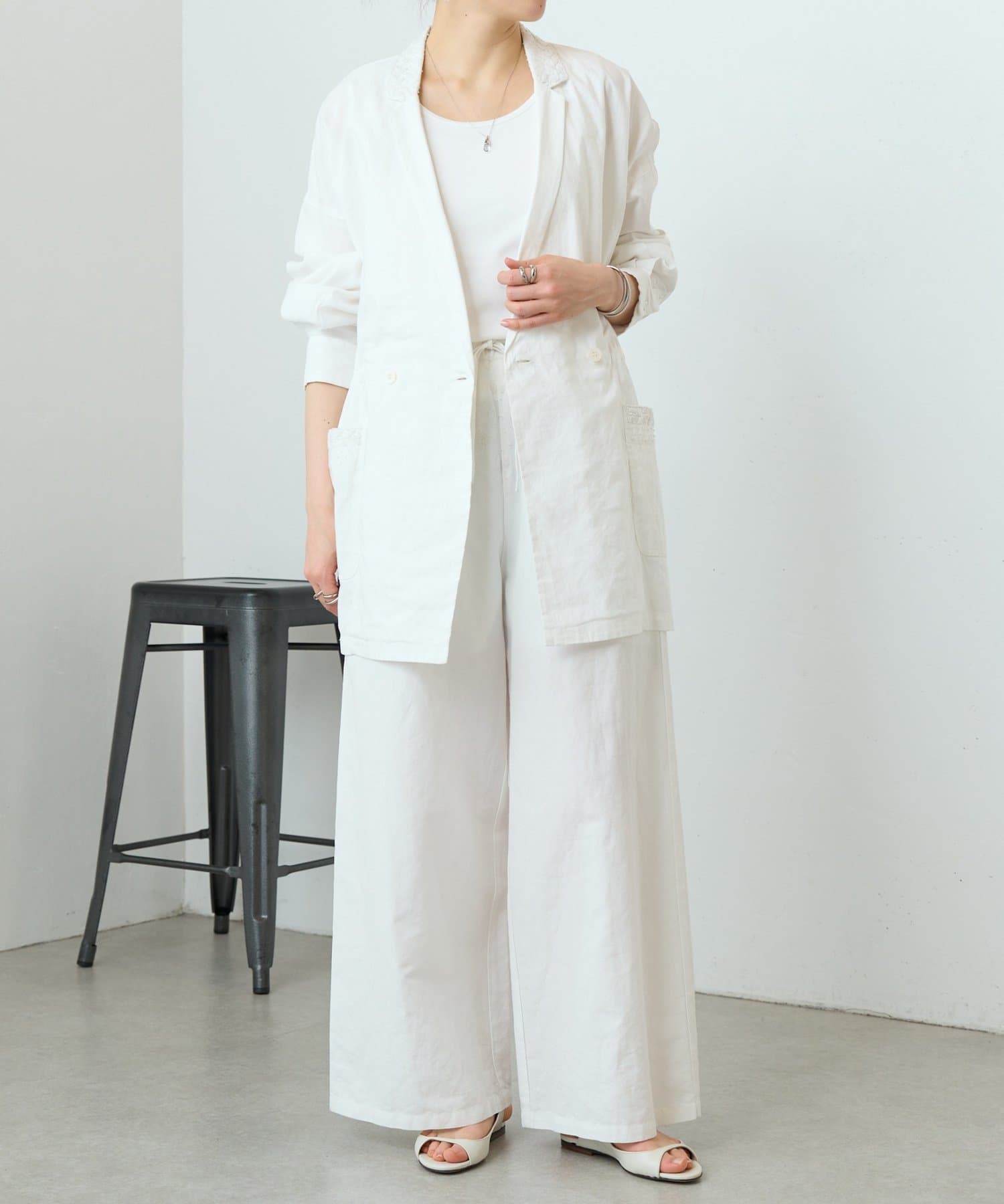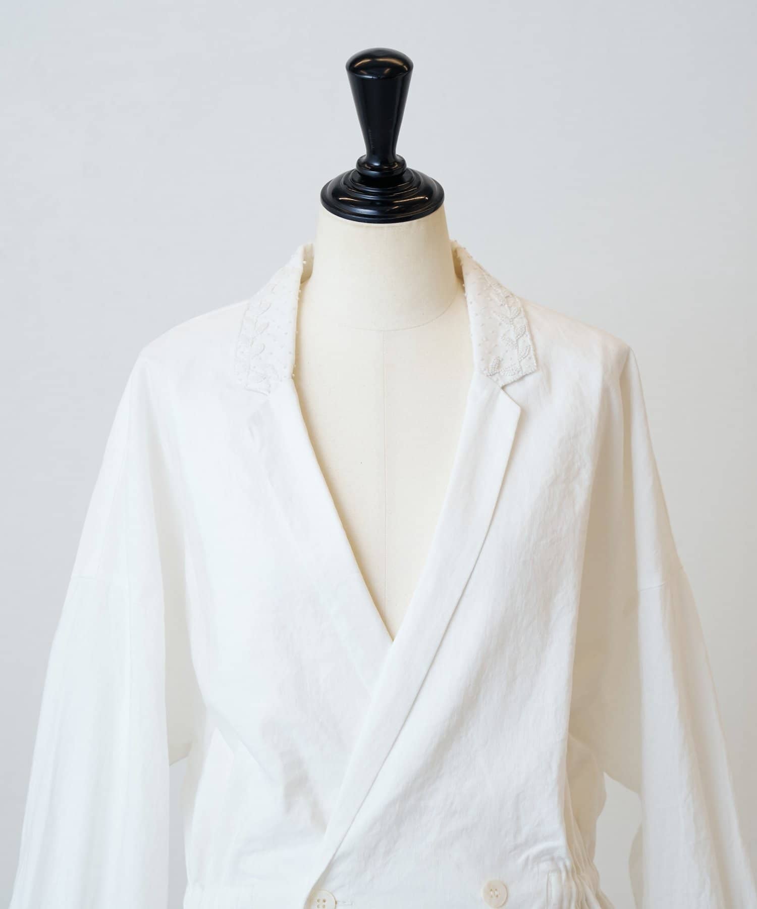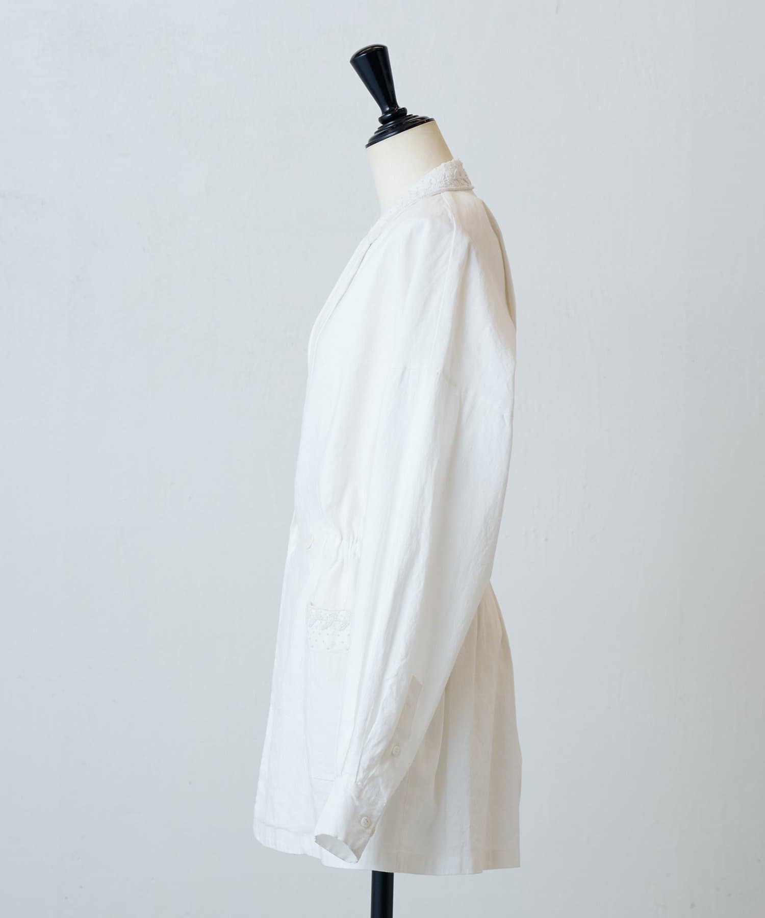 襟元とポケットに施したハンド刺繍がさりげないアクセントになったジャケット。