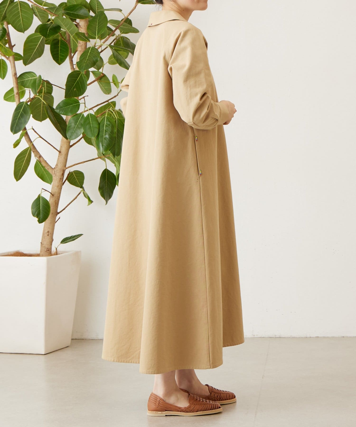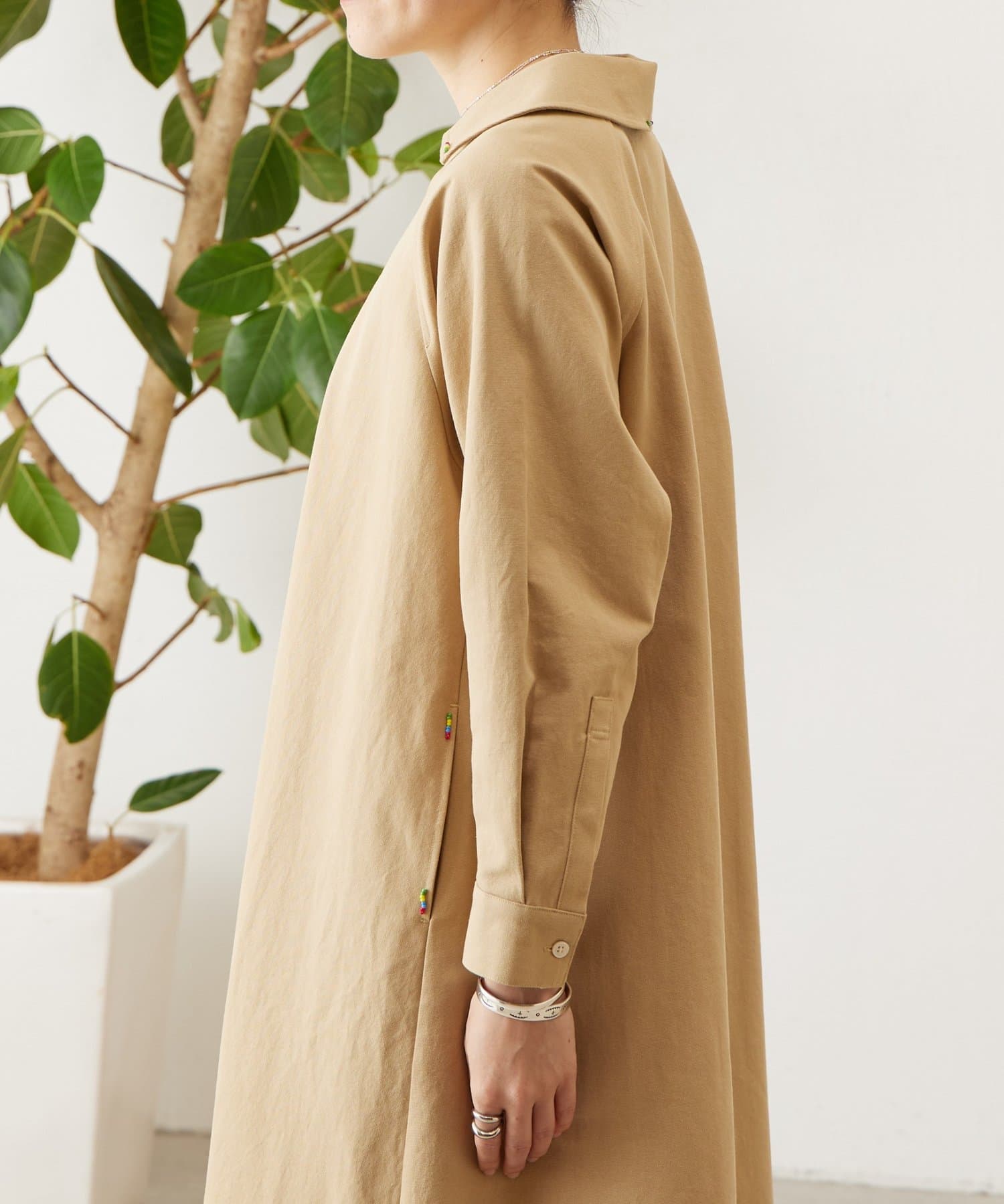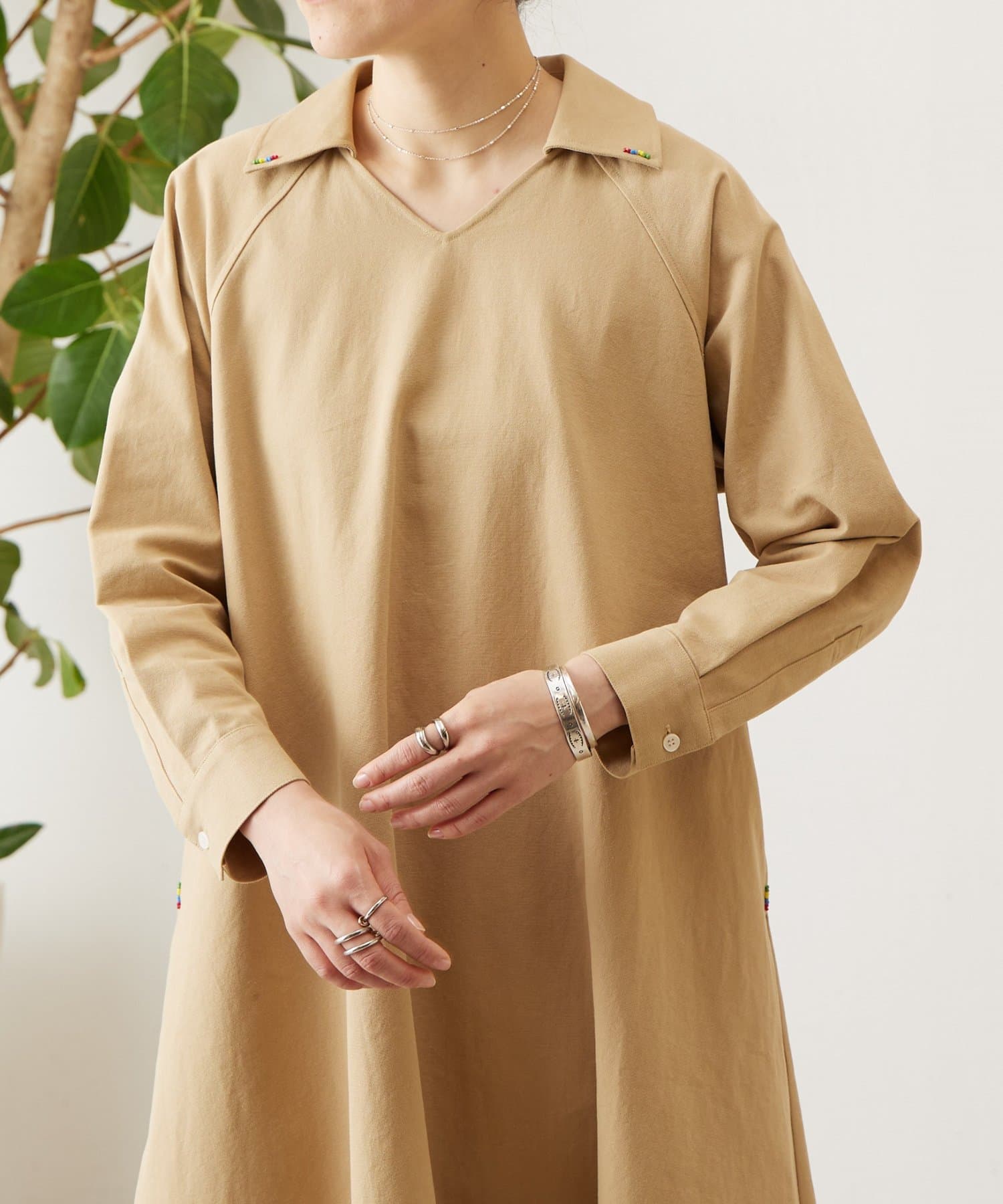 襟元やポケットに縫い付けたカラフルなビーズがアクセントになったロングフレアワンピース。