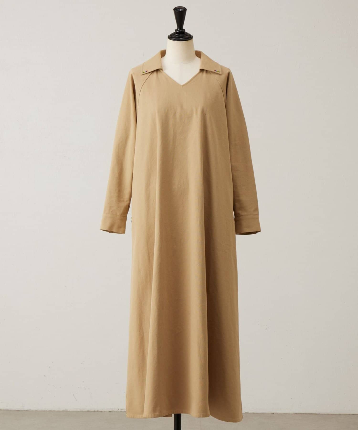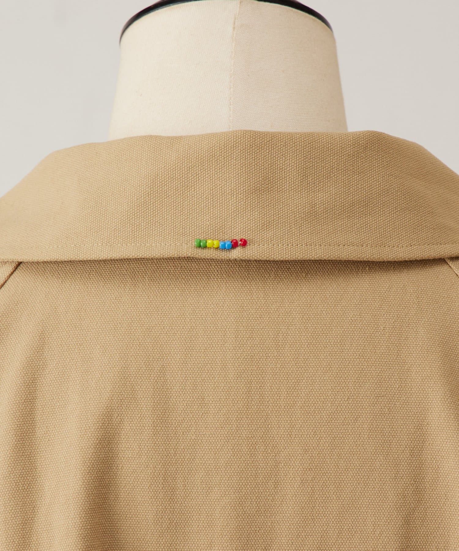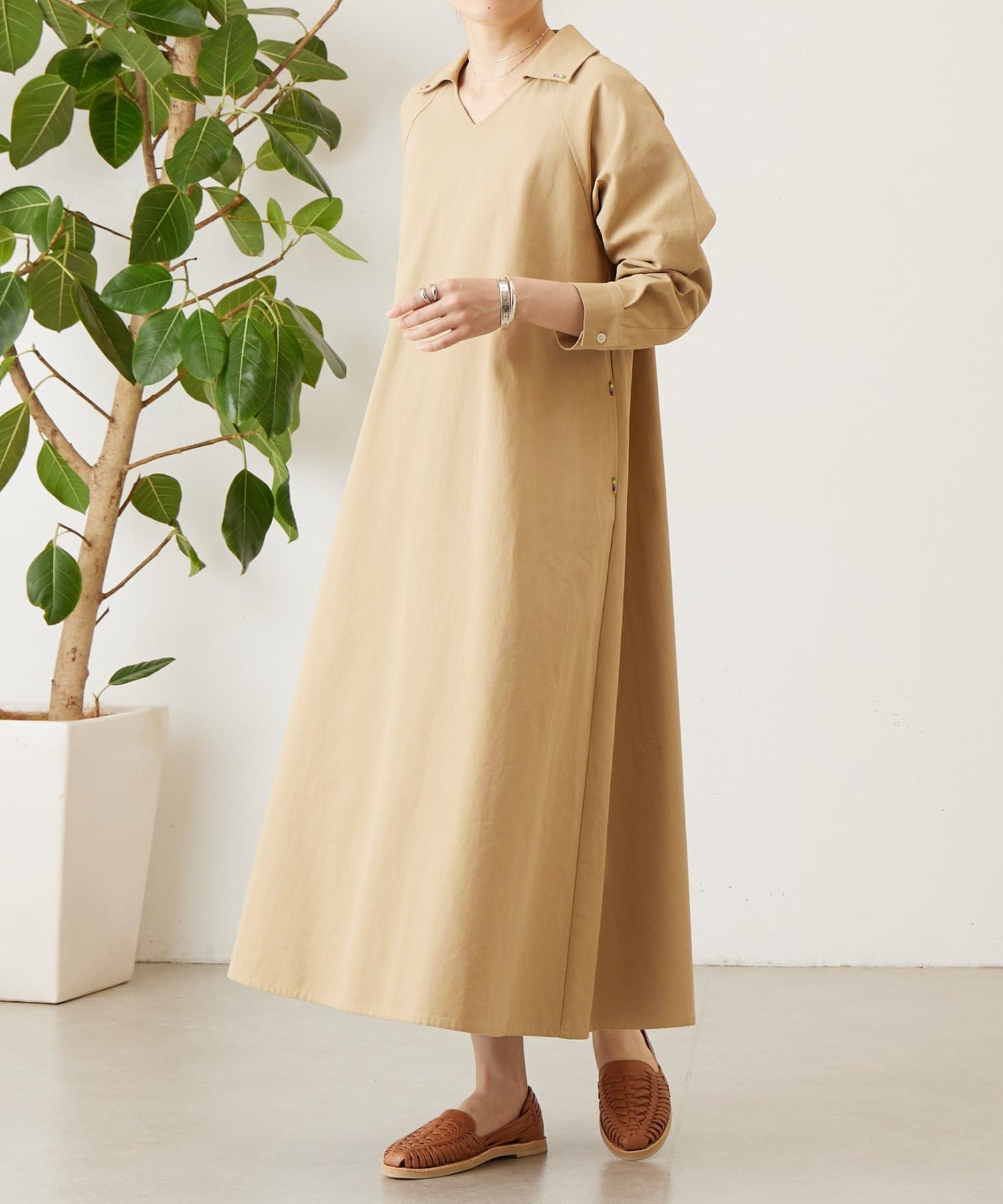 襟元やポケットに縫い付けたカラフルなビーズがアクセントになったロングフレアワンピース。