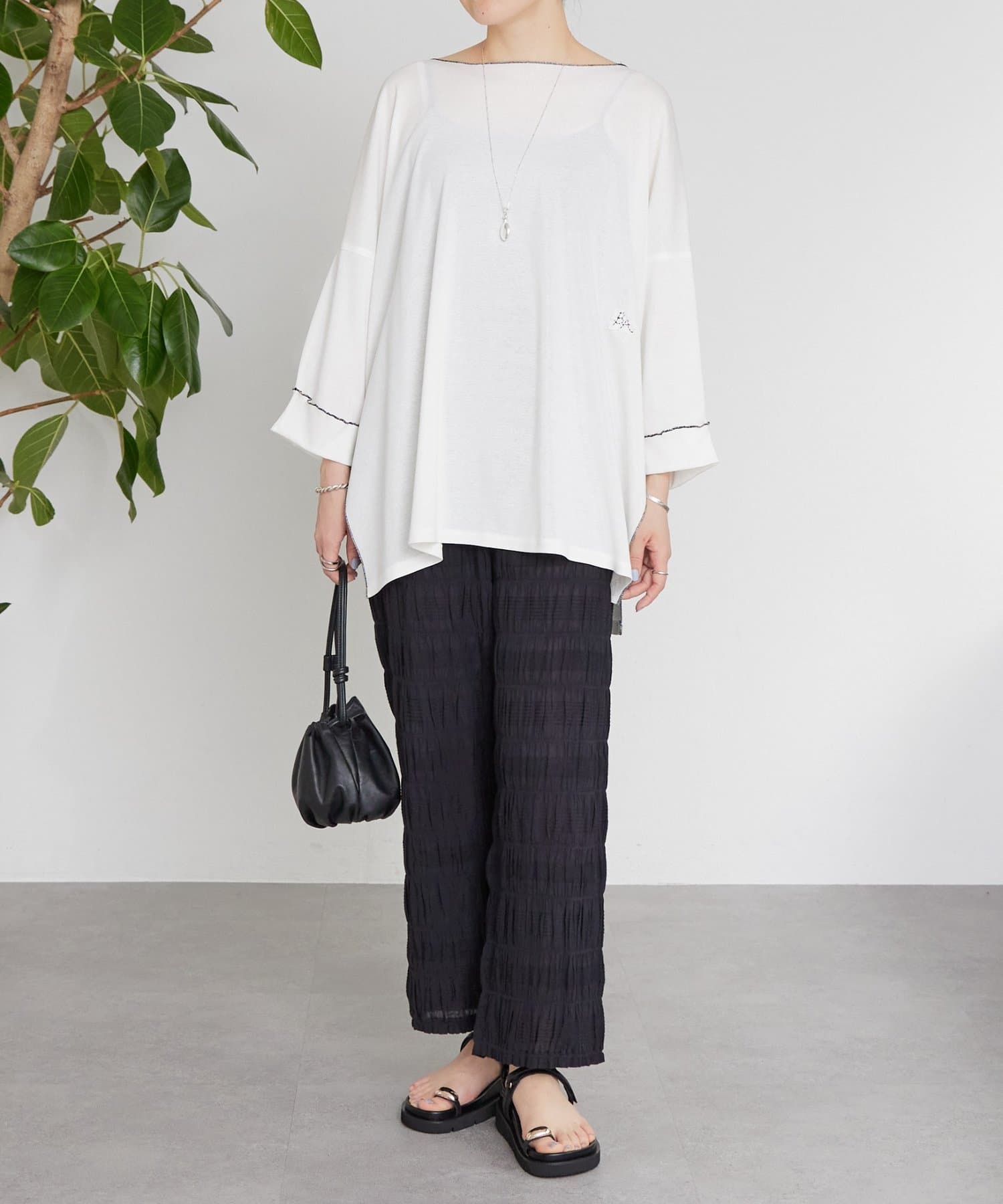 細身のストラップやトップに添えたアクセントが、カジュアルになりすぎず女性らしい雰囲気に。