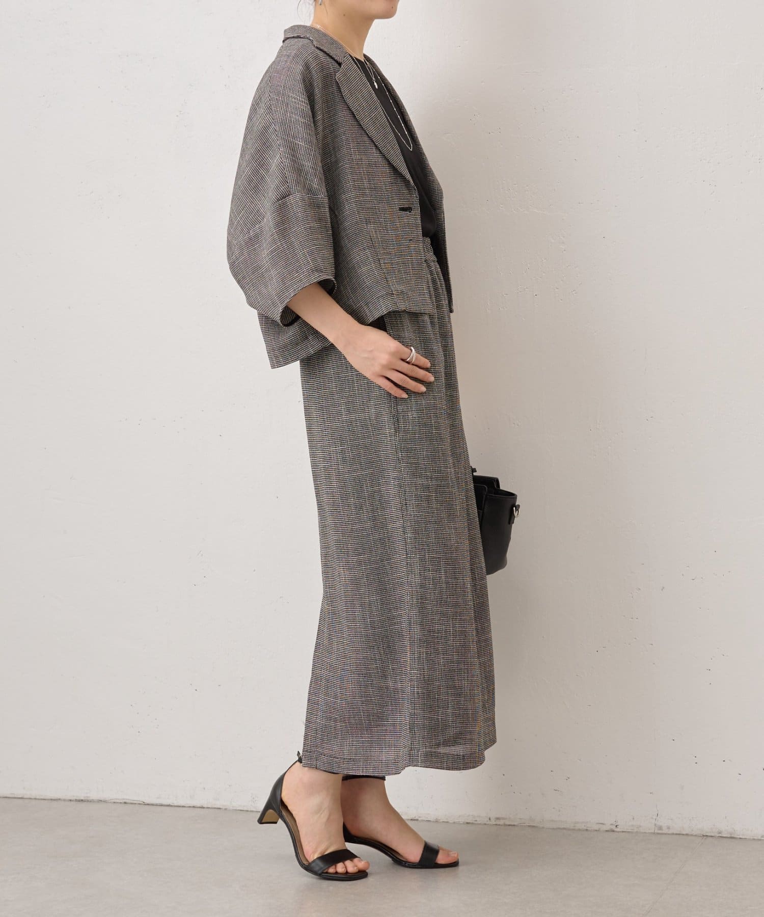 同素材のジャケットとのセットアップ着用もおすすめです。