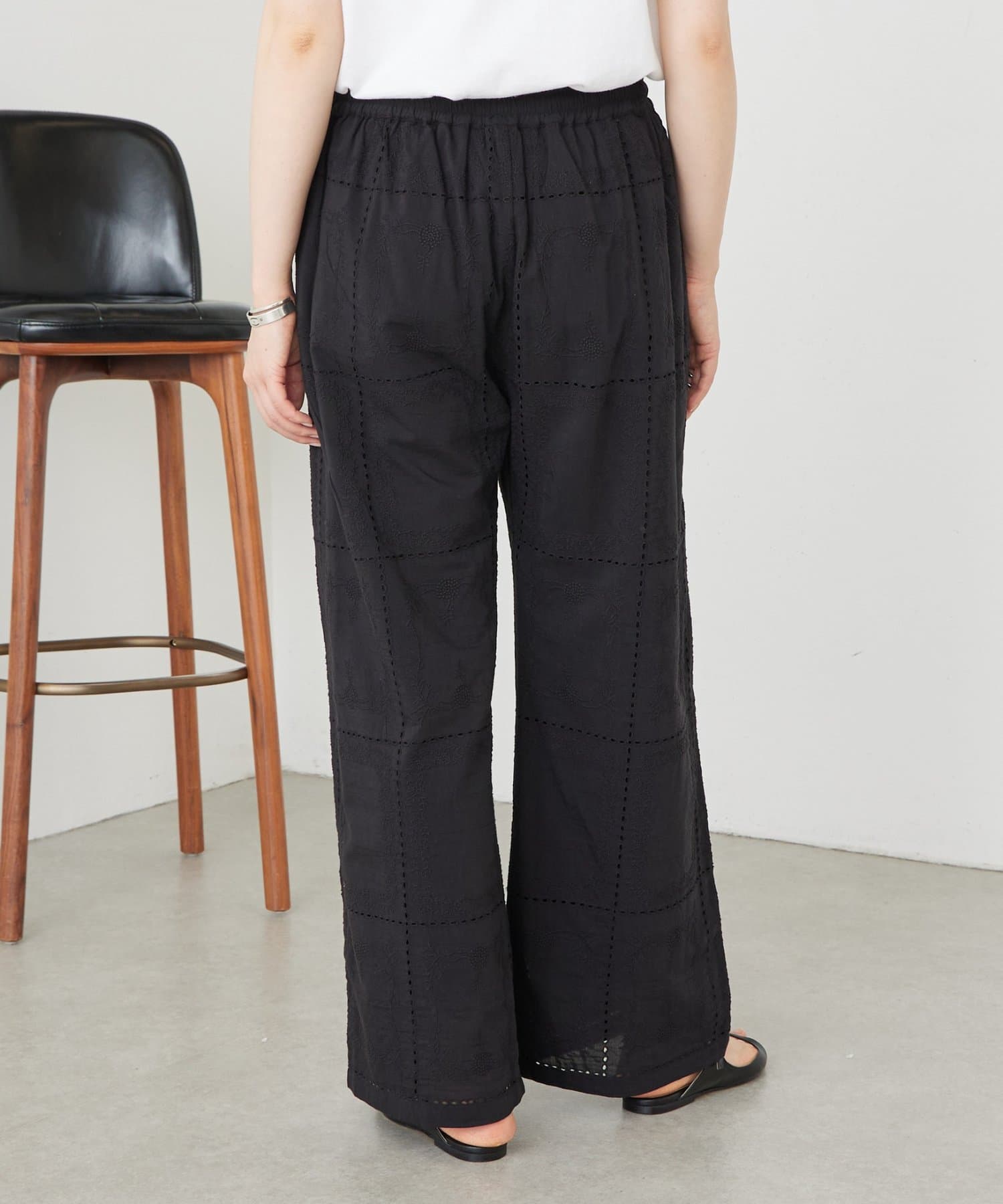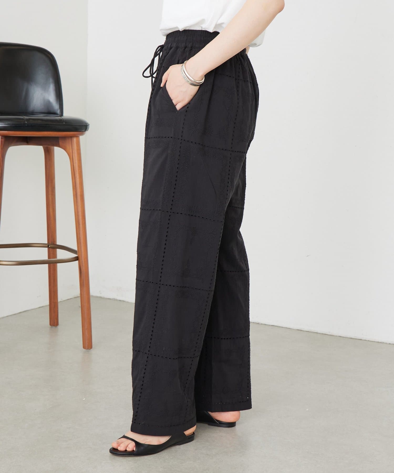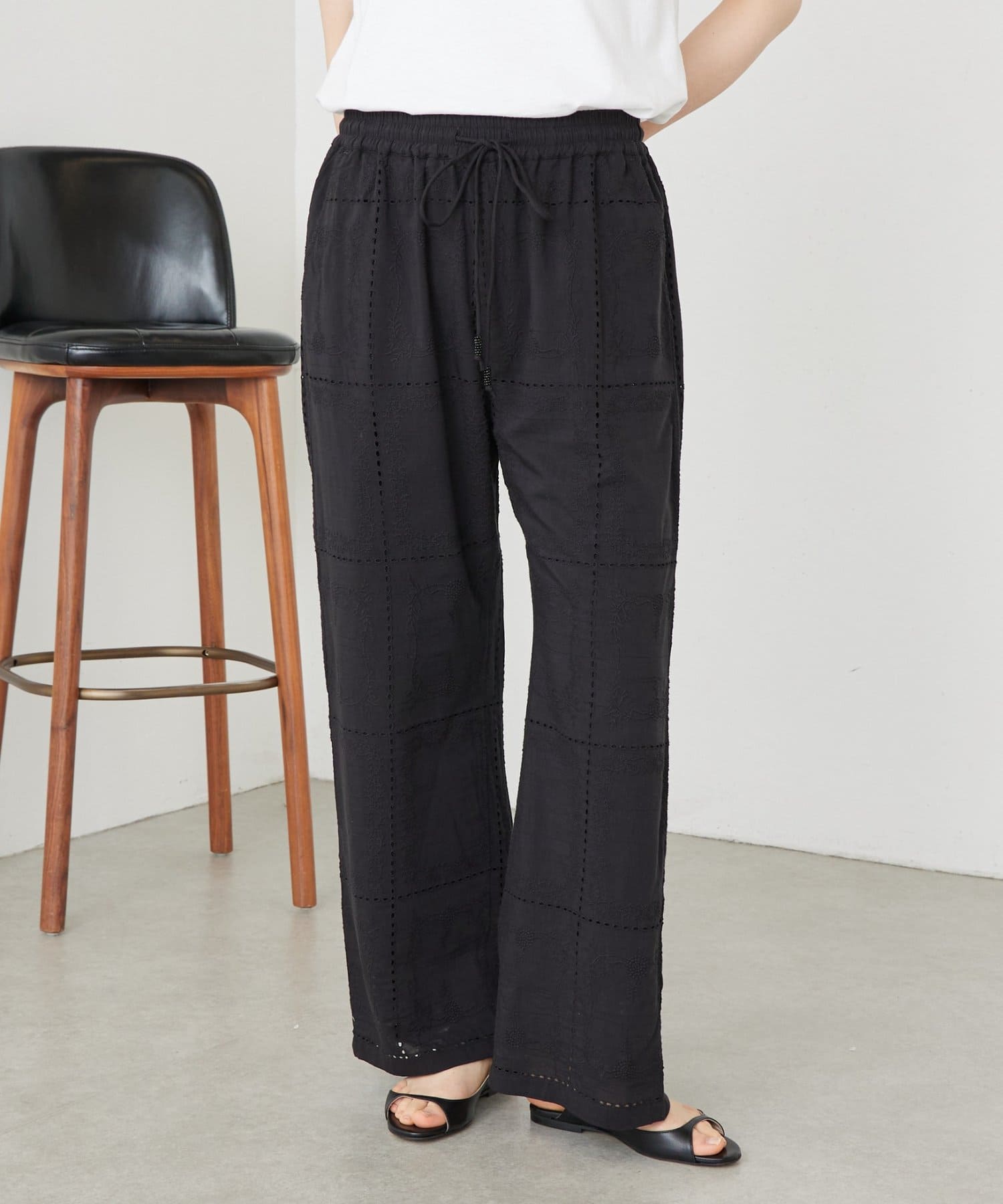 繊細なハンカチーフ刺繍が目を引く、上品なイージーパンツ。