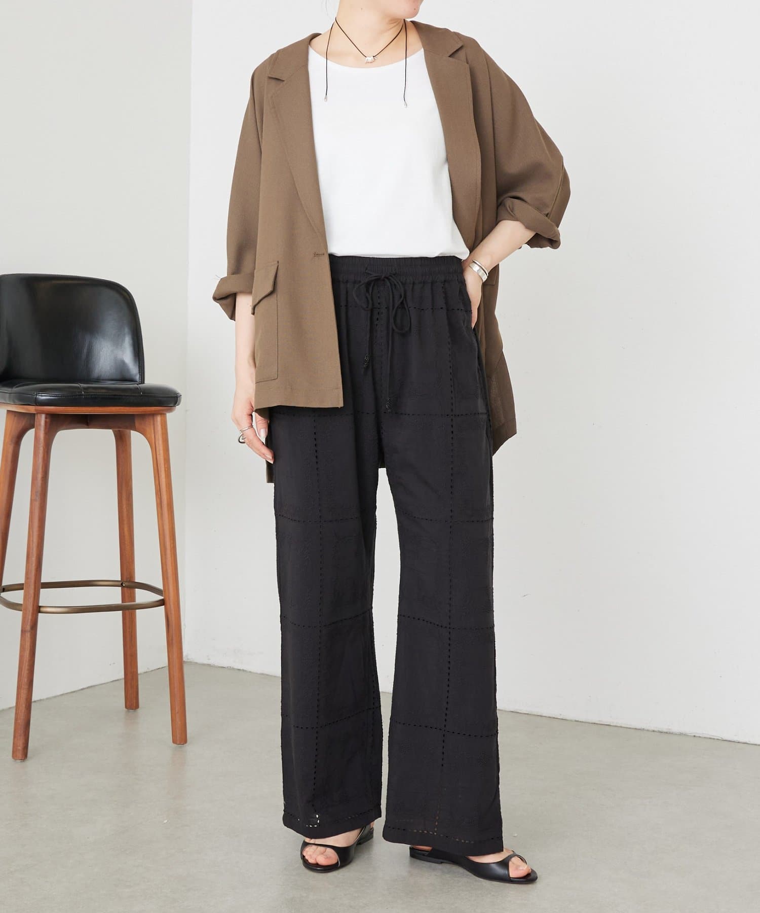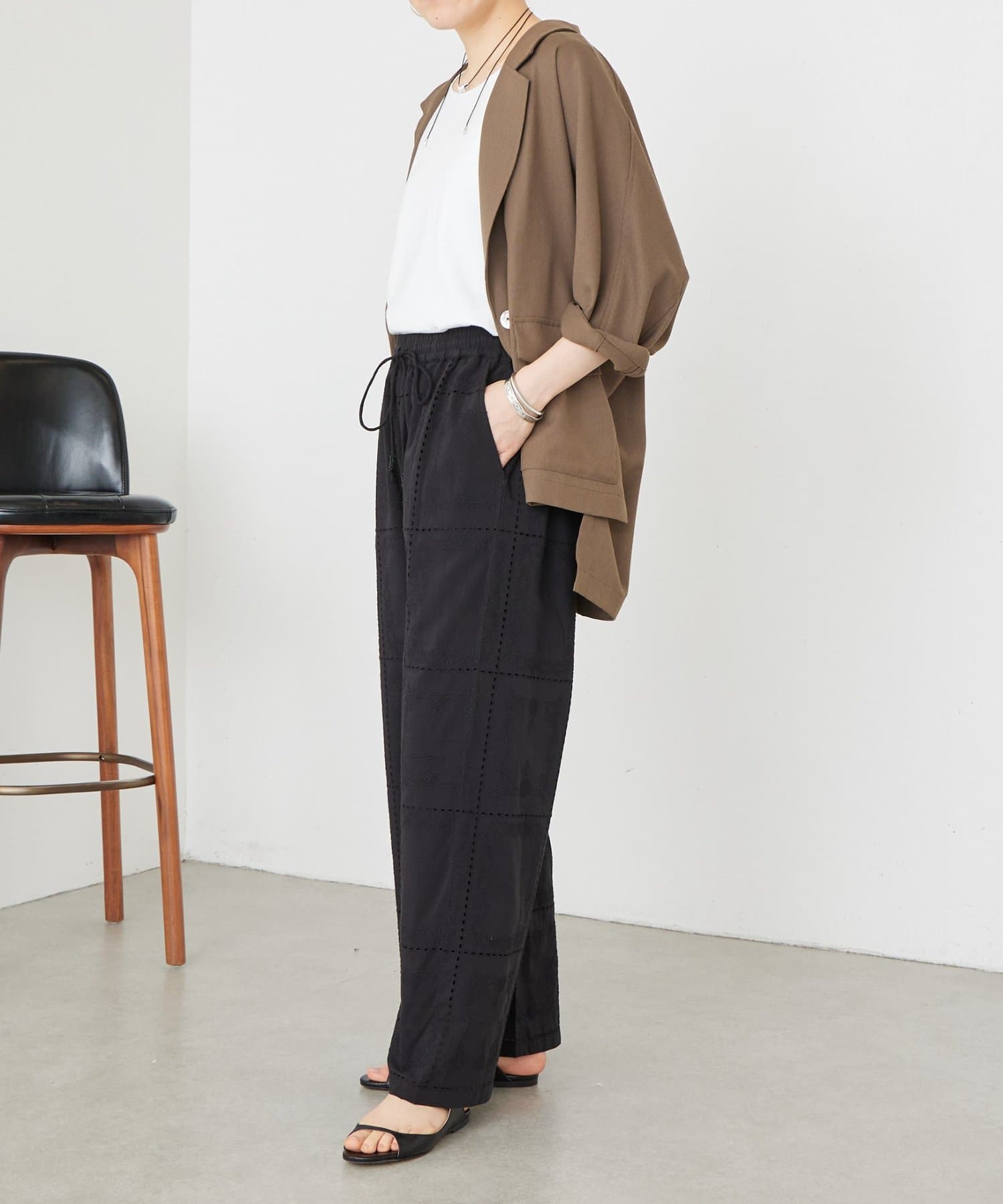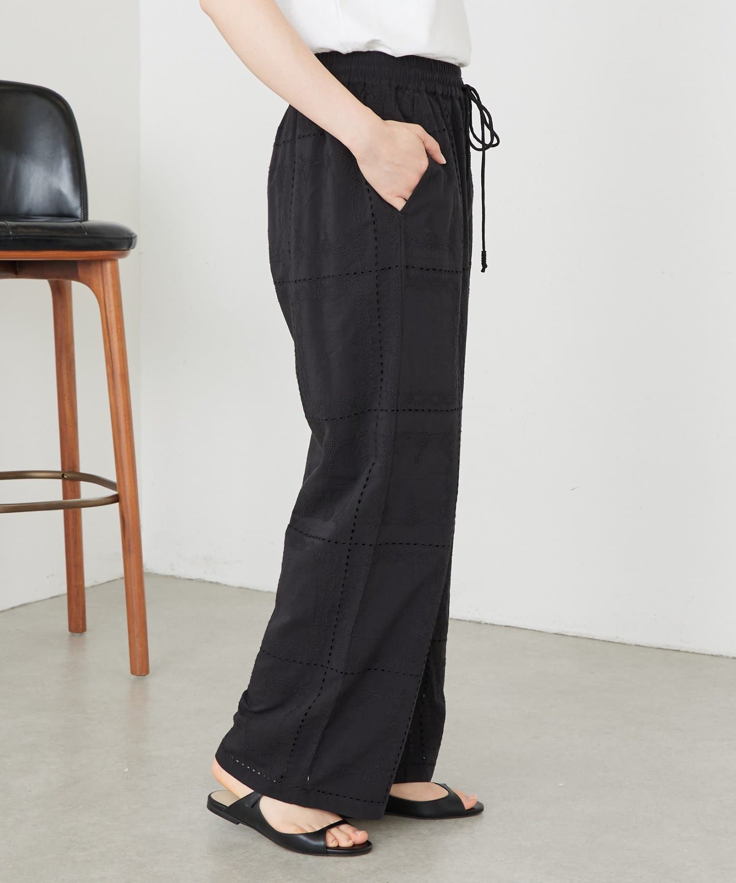 繊細なハンカチーフ刺繍が目を引く、上品なイージーパンツ。