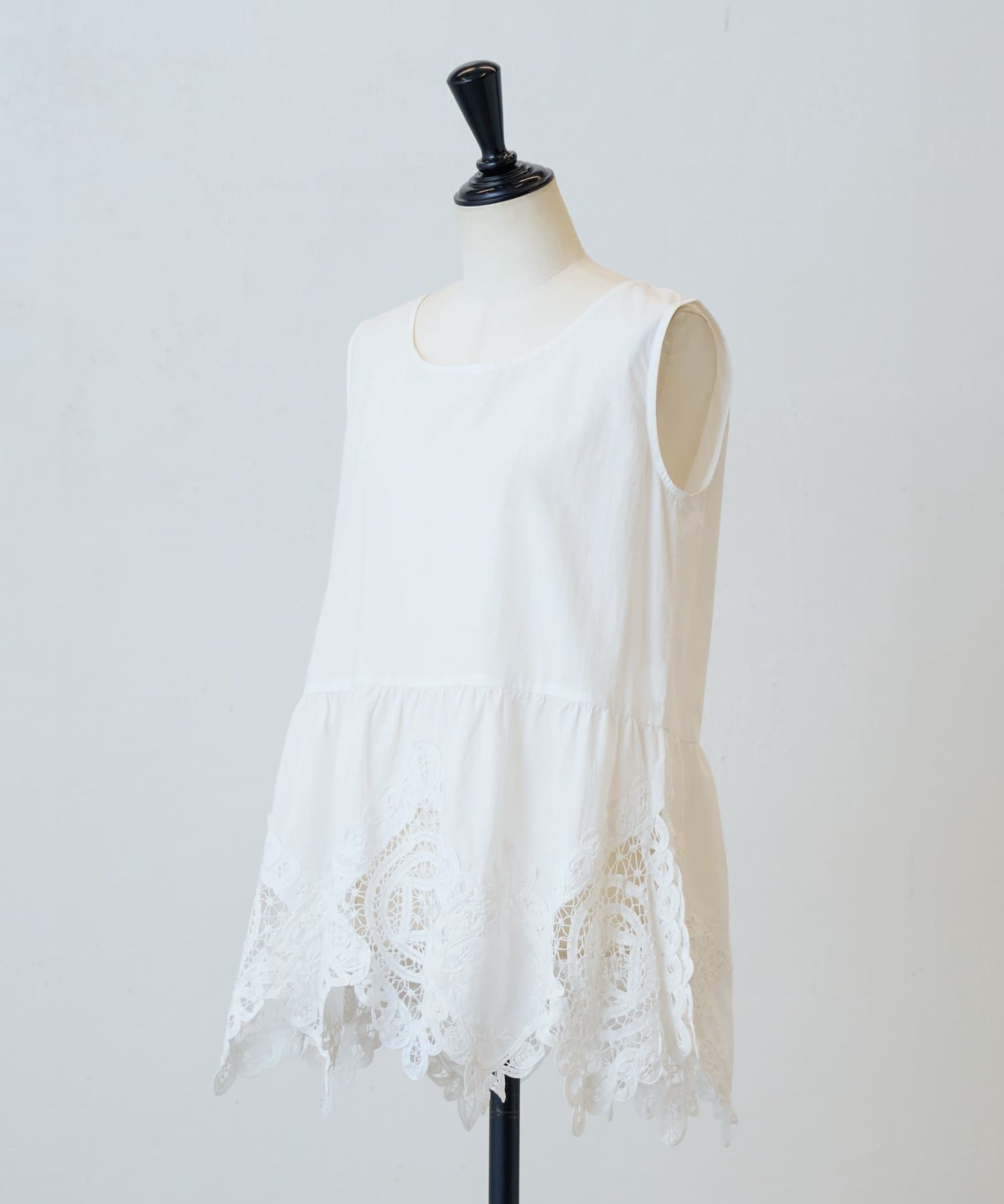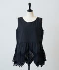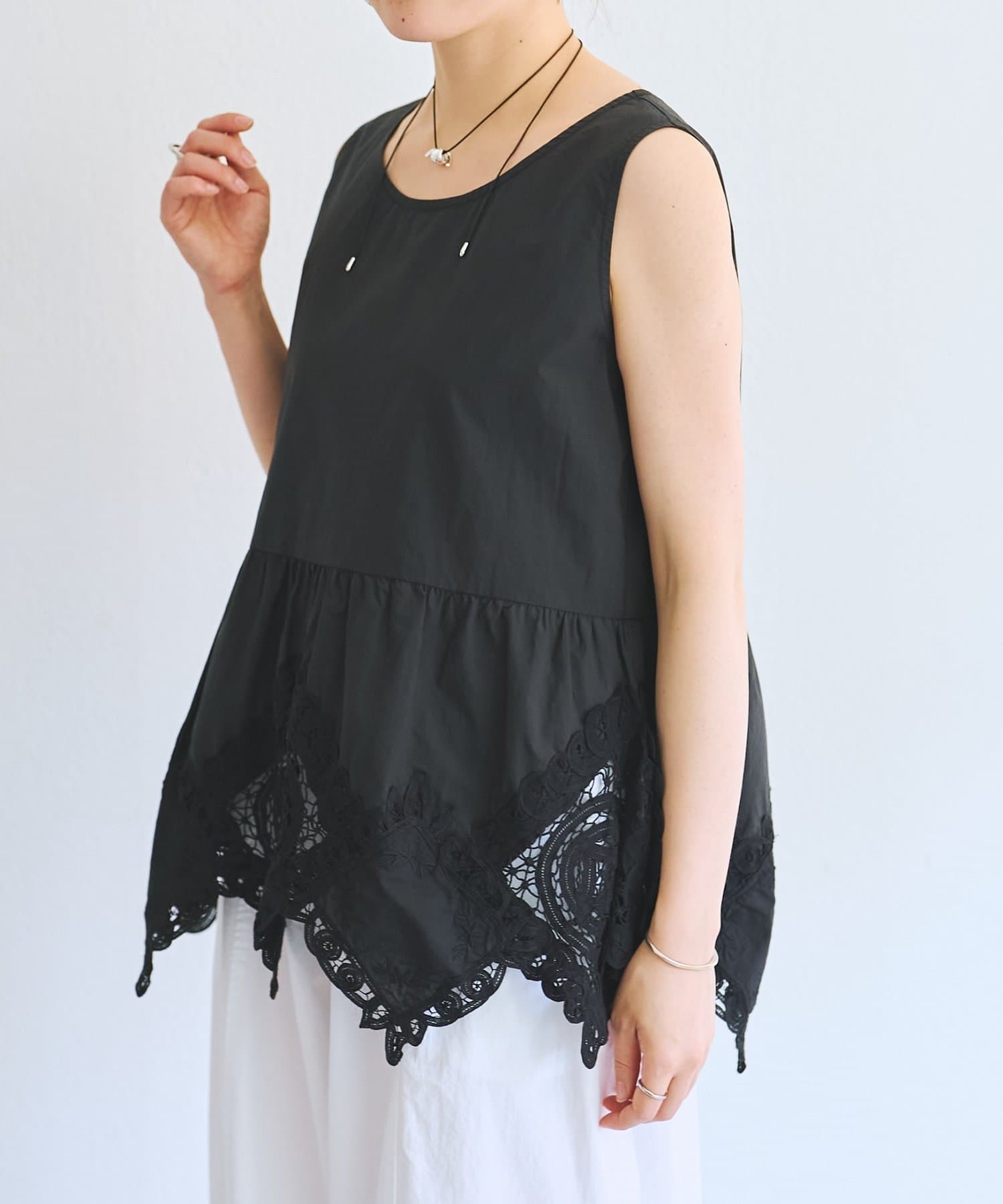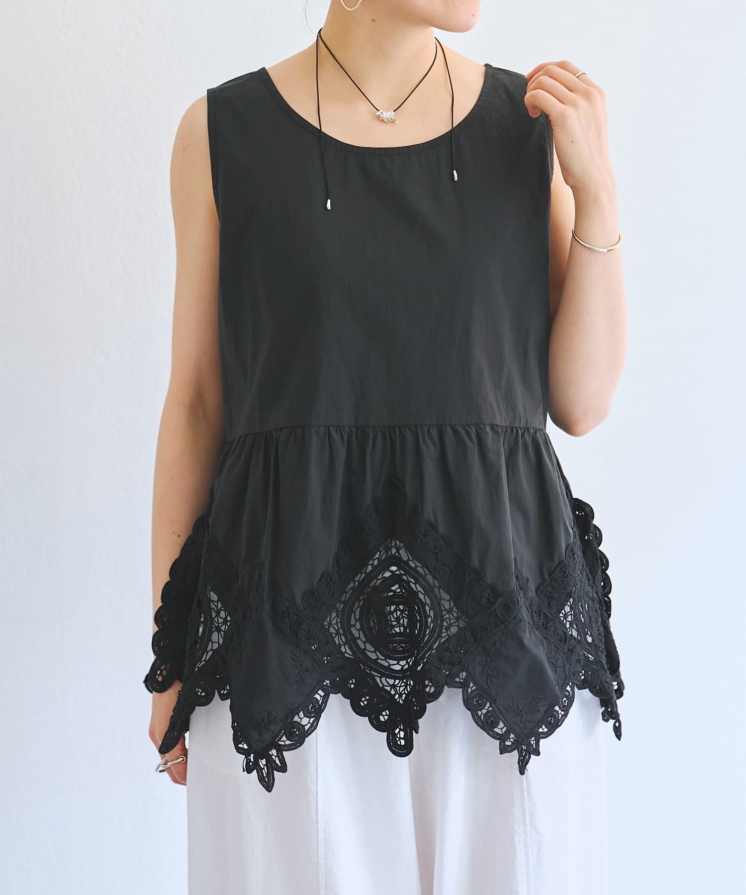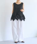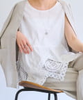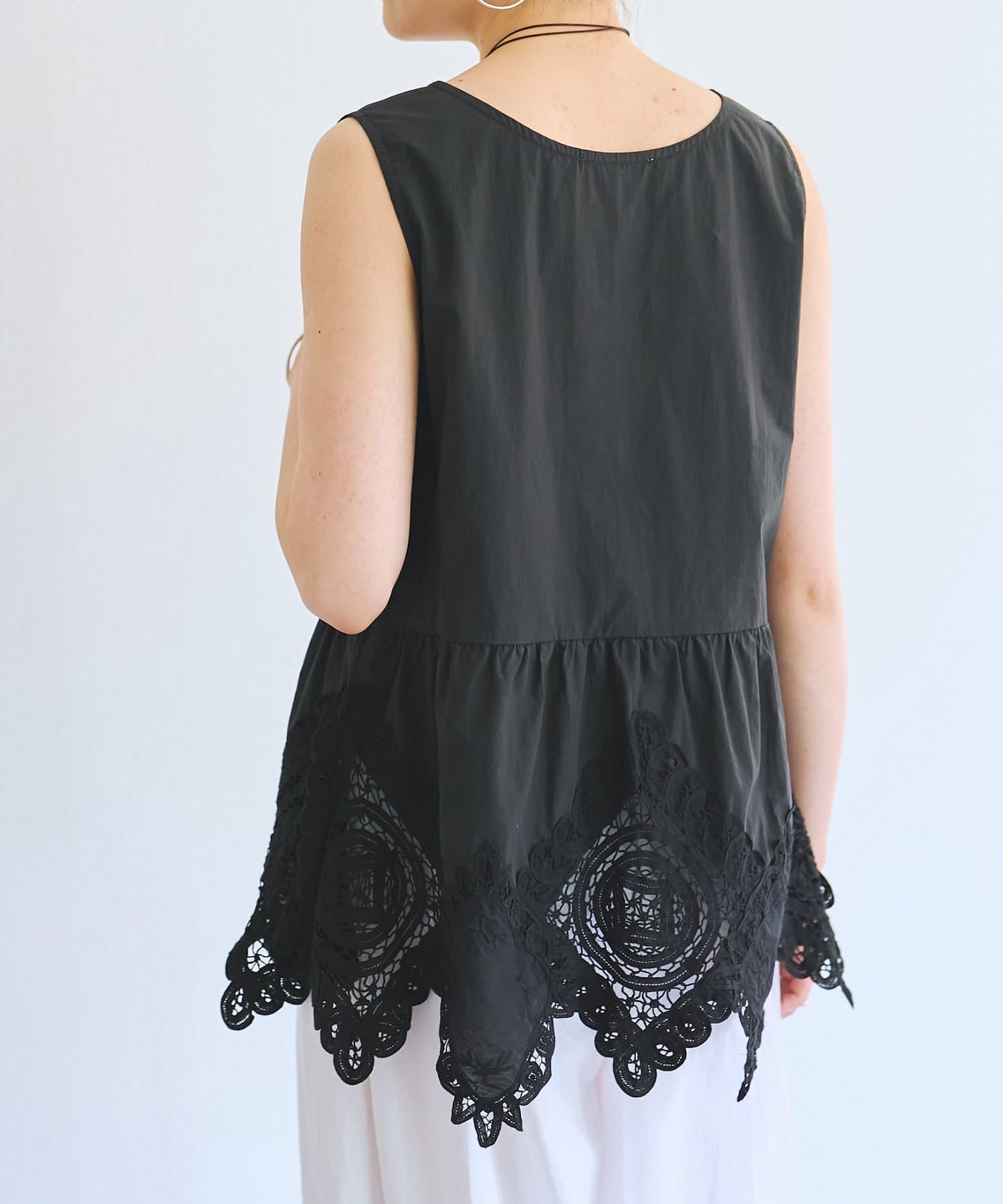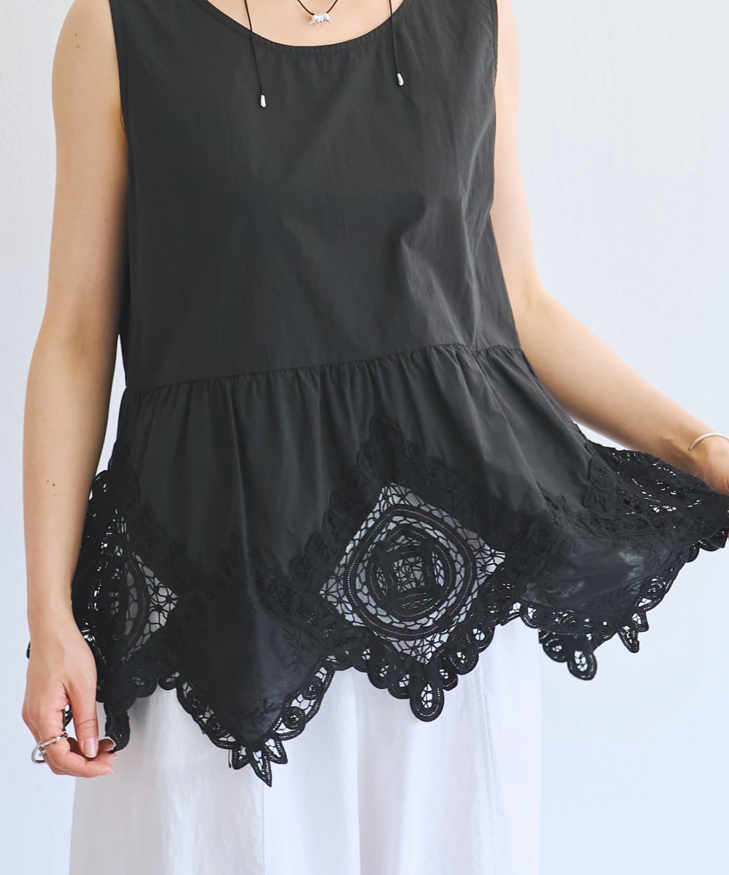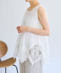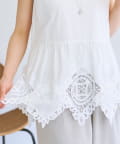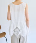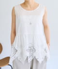 裾にあしらったバテンレースが華やかさを引き立てるノースリーブブラウス。
