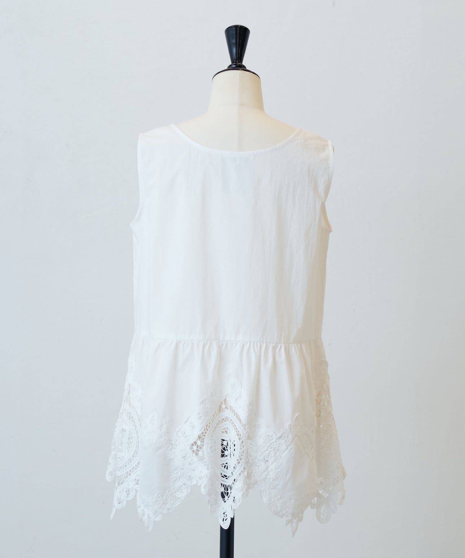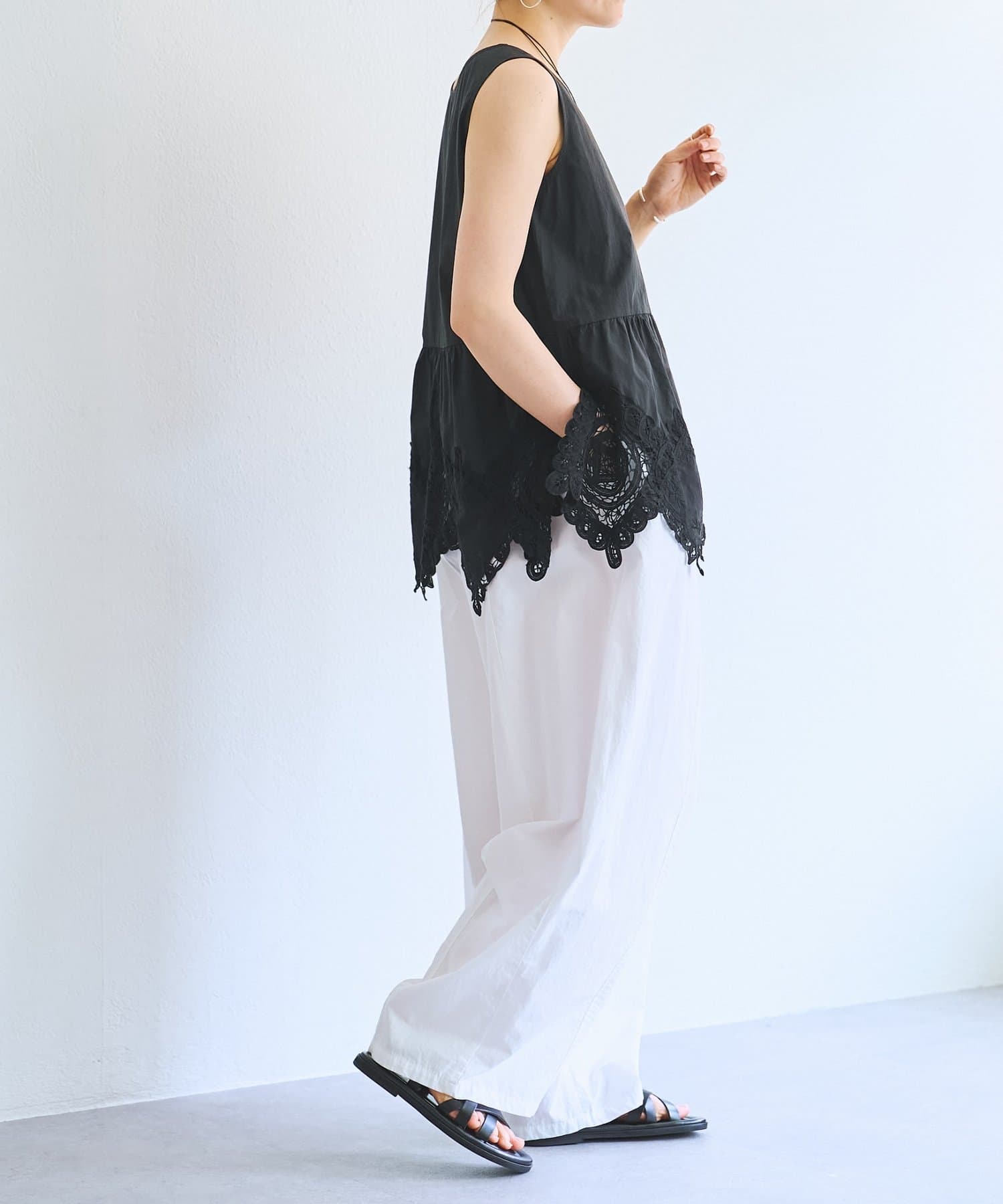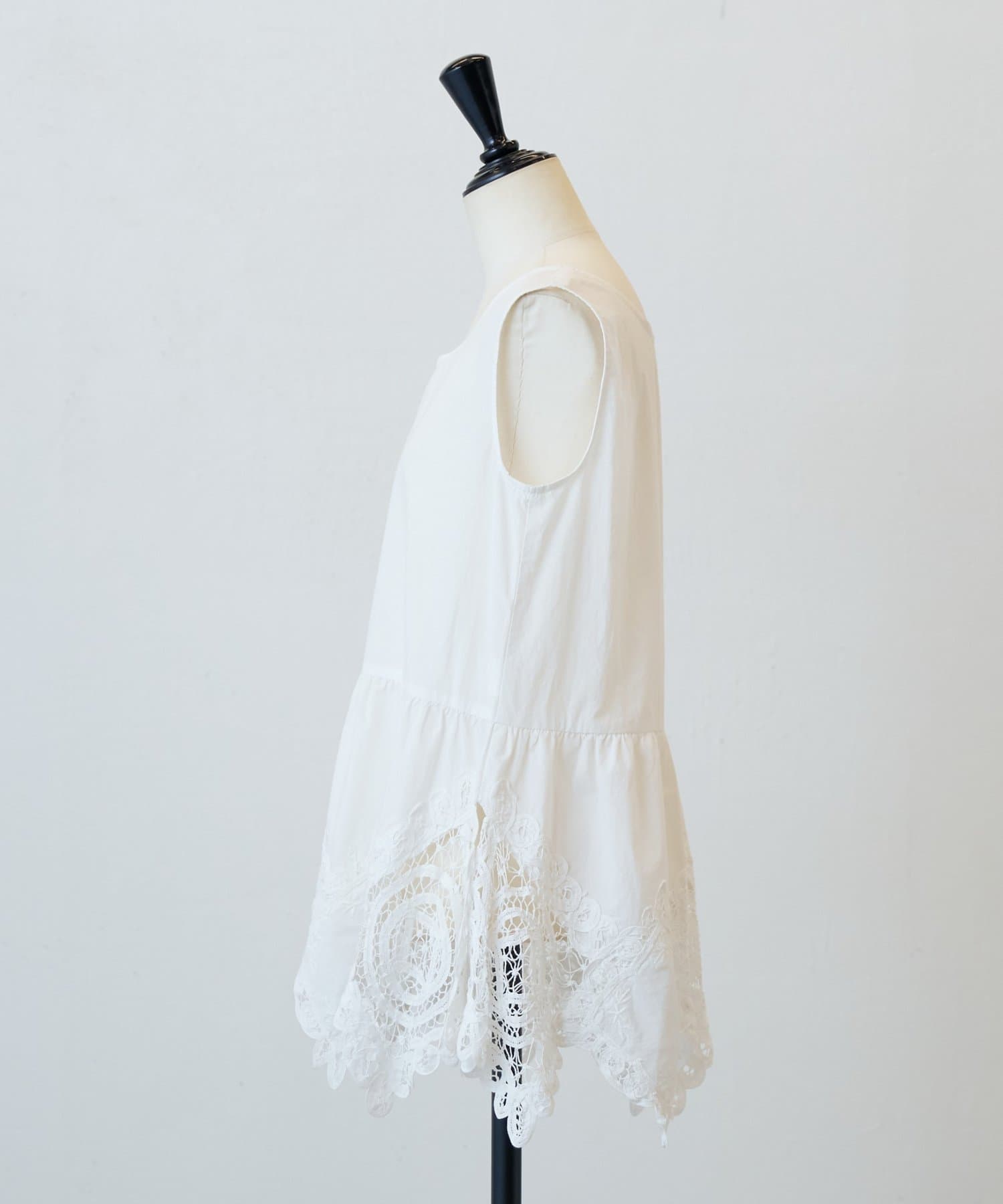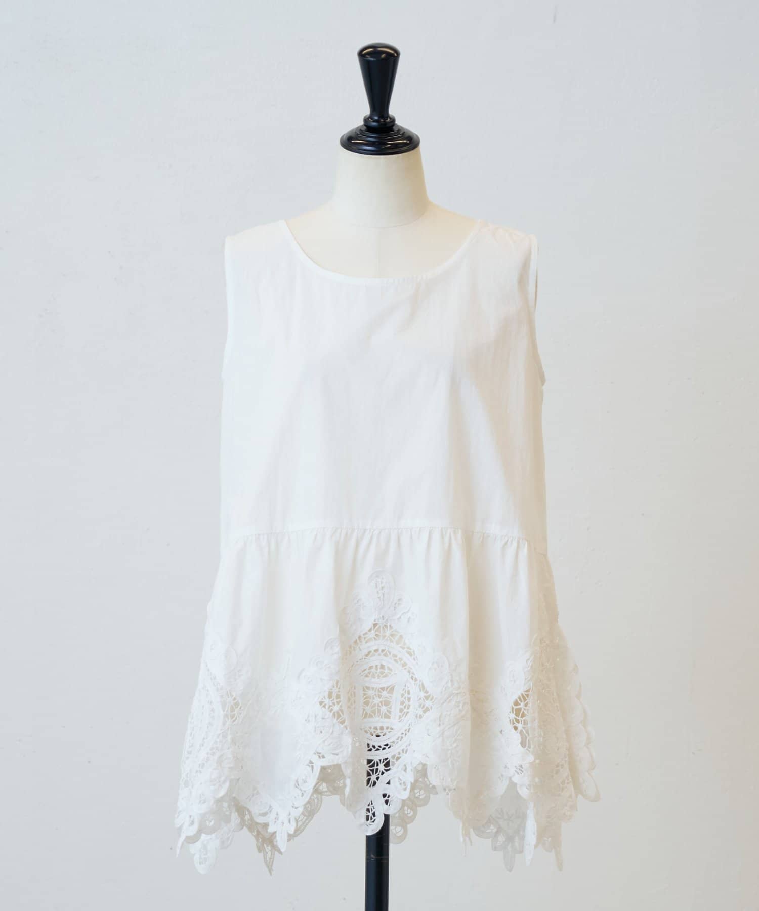 裾にあしらったバテンレースが華やかさを引き立てるノースリーブブラウス。