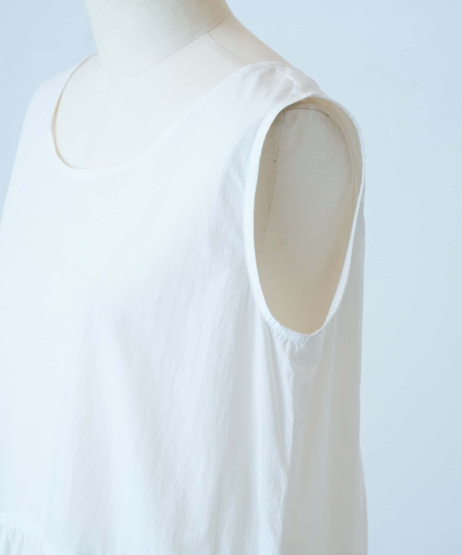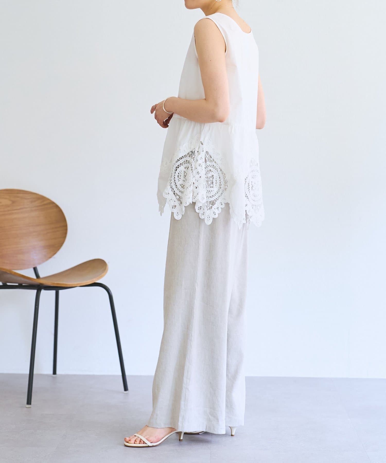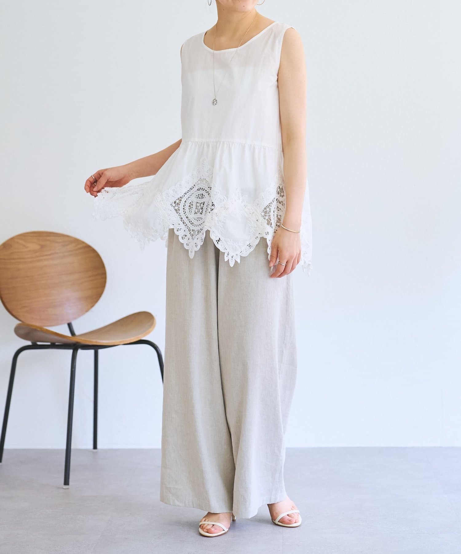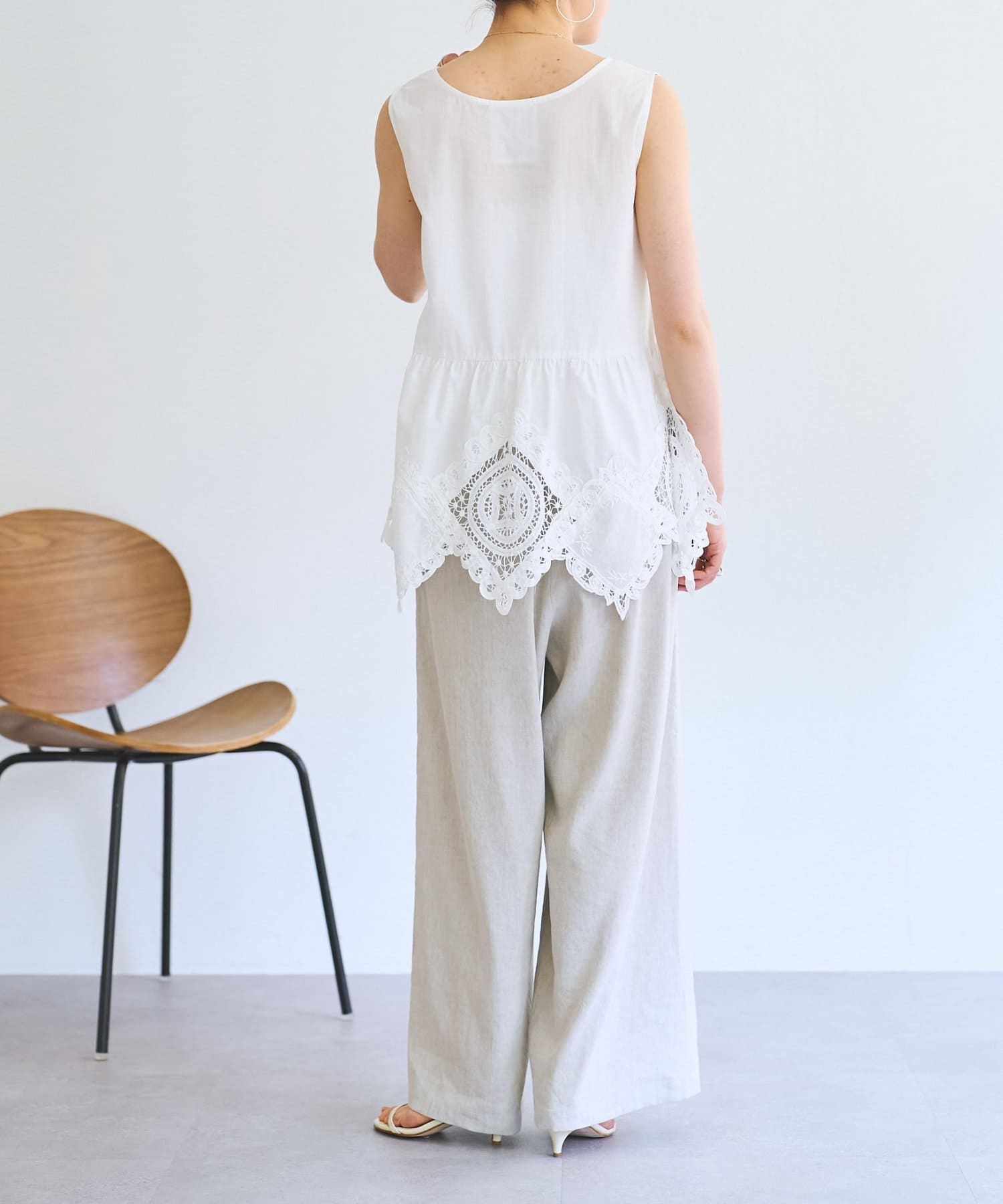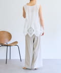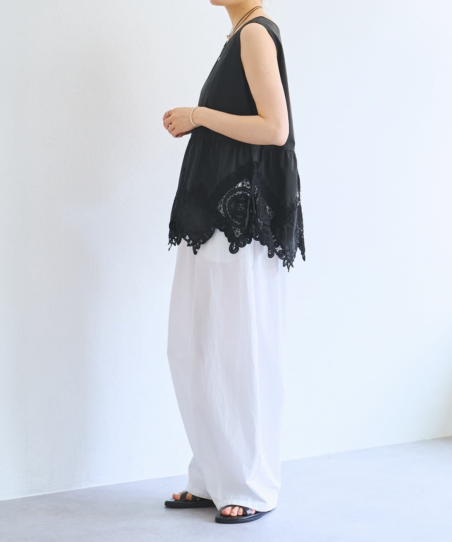 裾にあしらったバテンレースが華やかさを引き立てるノースリーブブラウス。