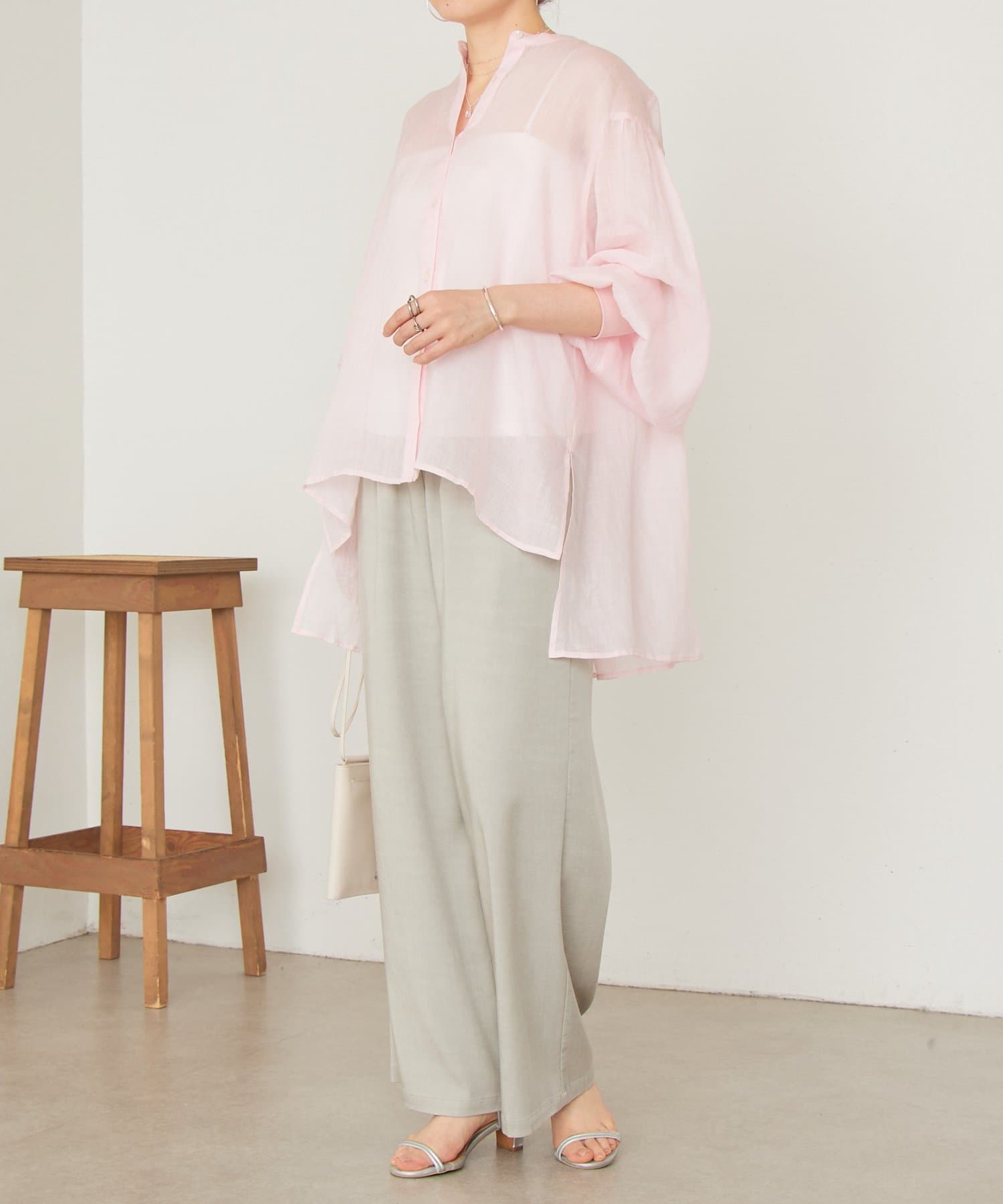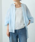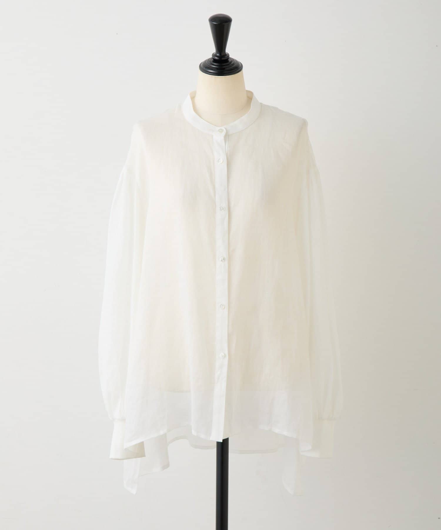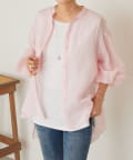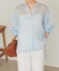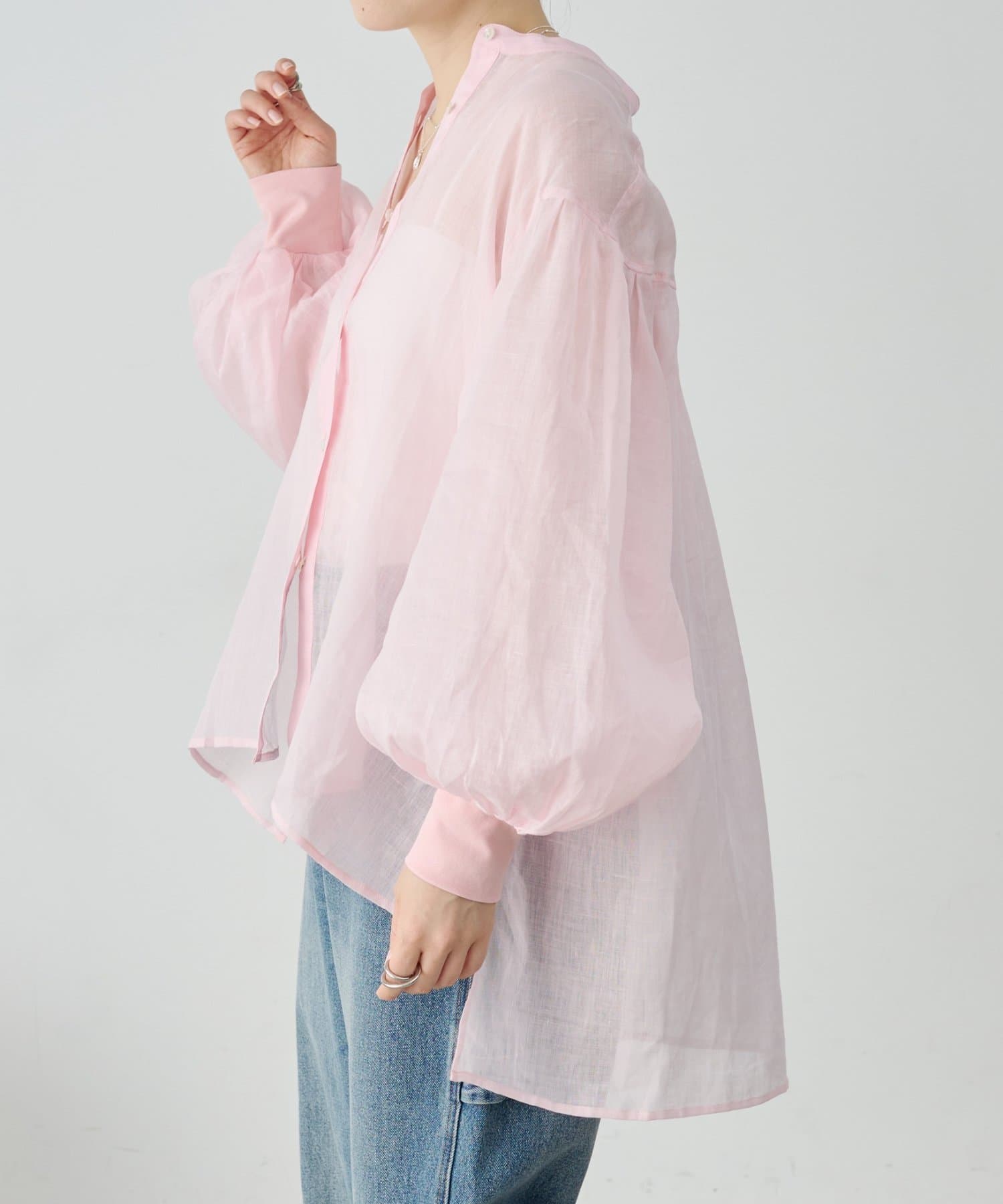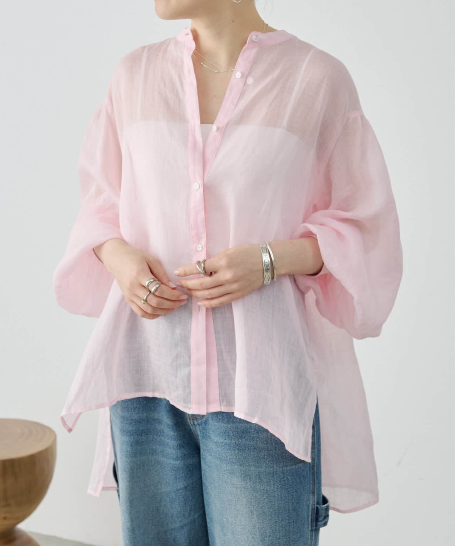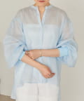 上品な光沢とシアー感のあるラミー素材を使用したノーカラーシャツ。