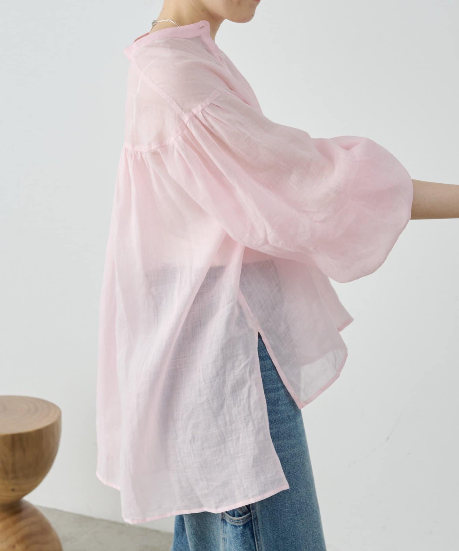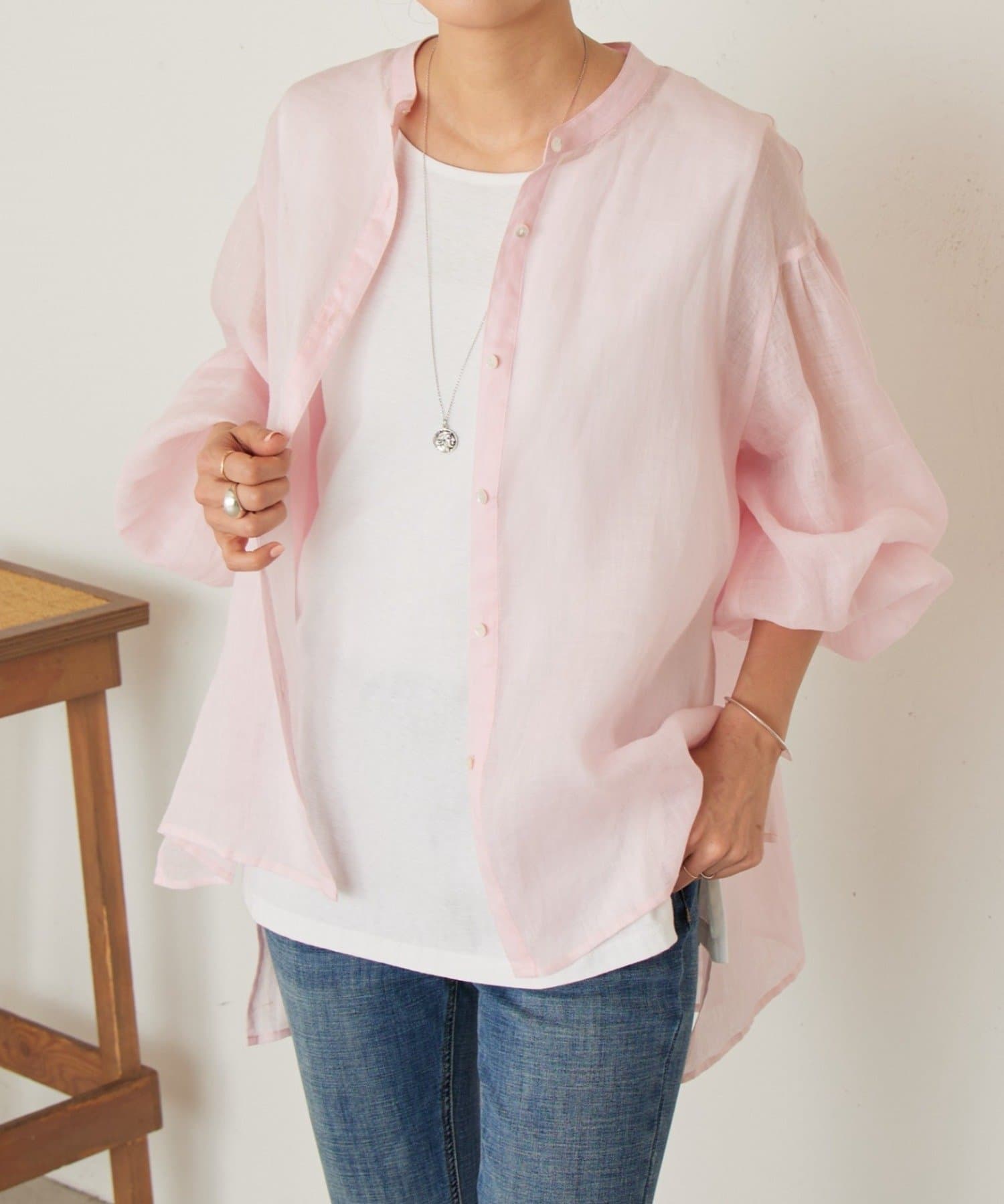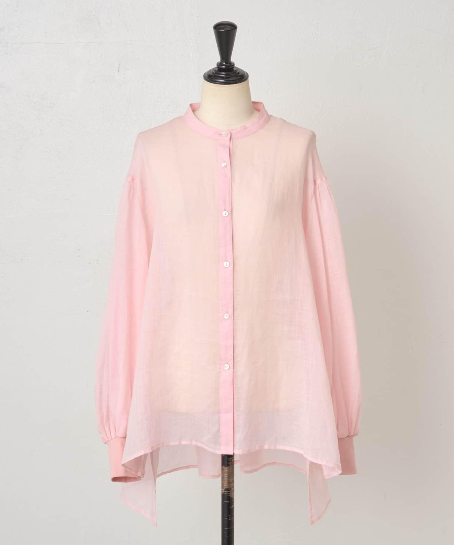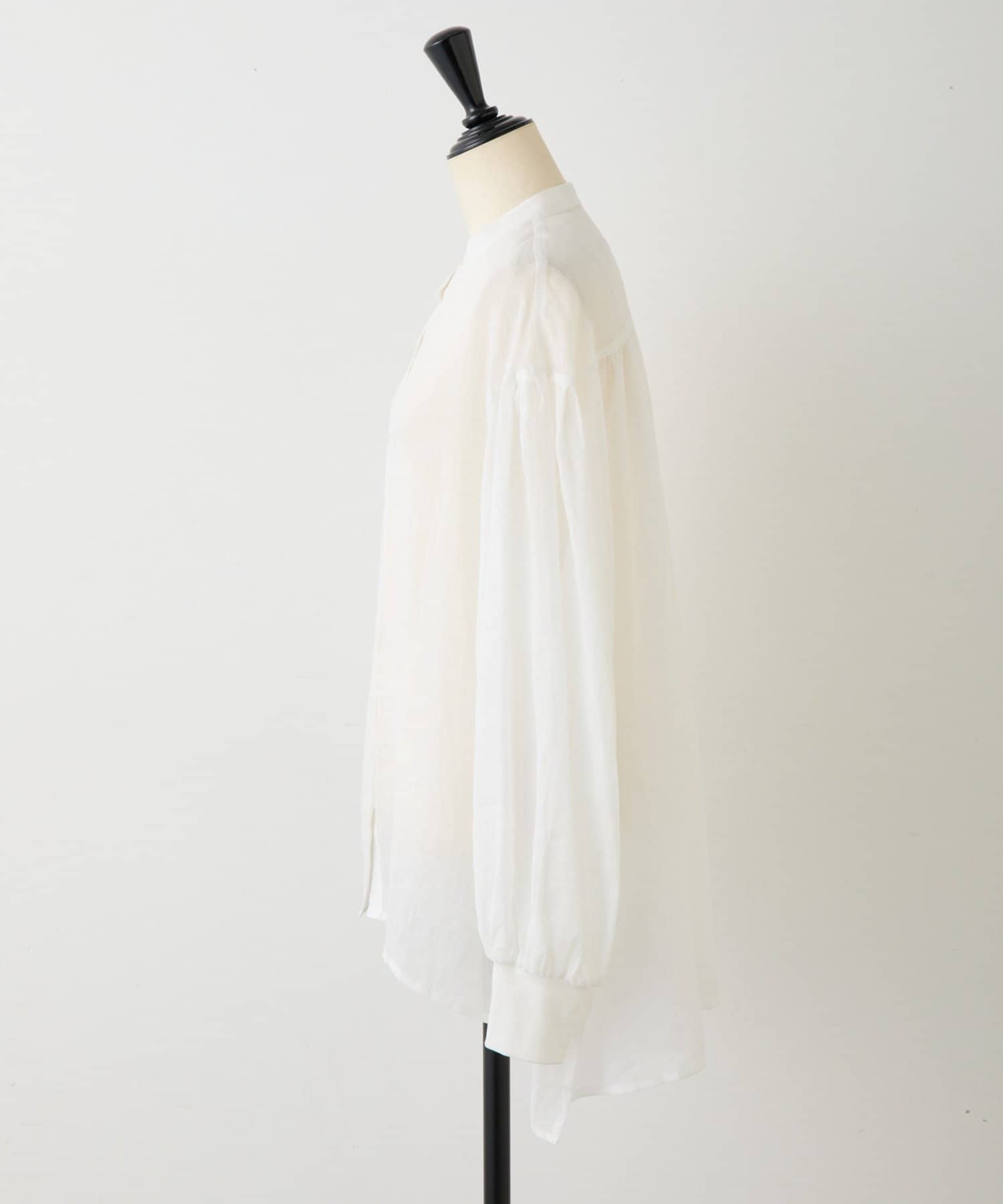 上品な光沢とシアー感のあるラミー素材を使用したノーカラーシャツ。