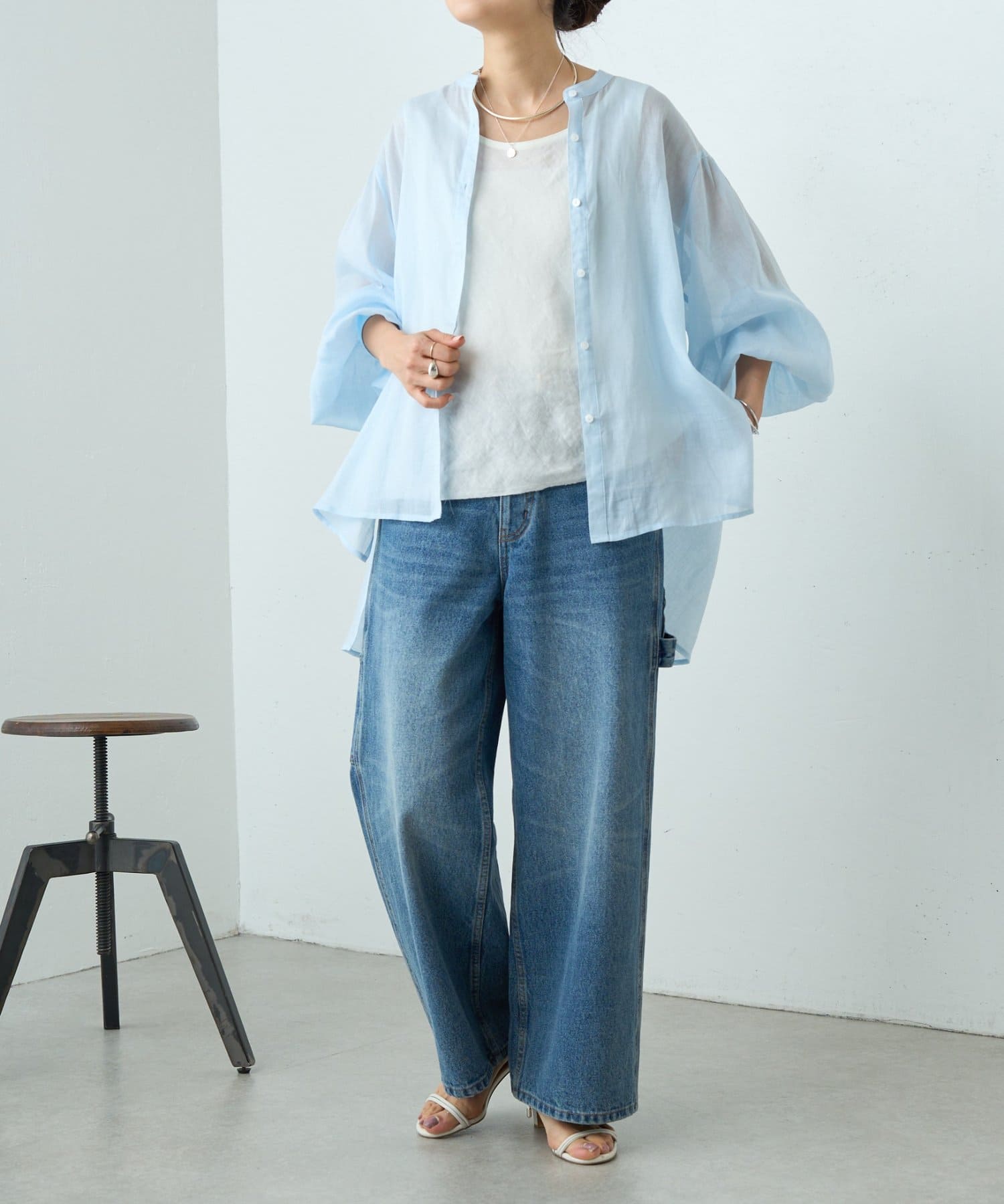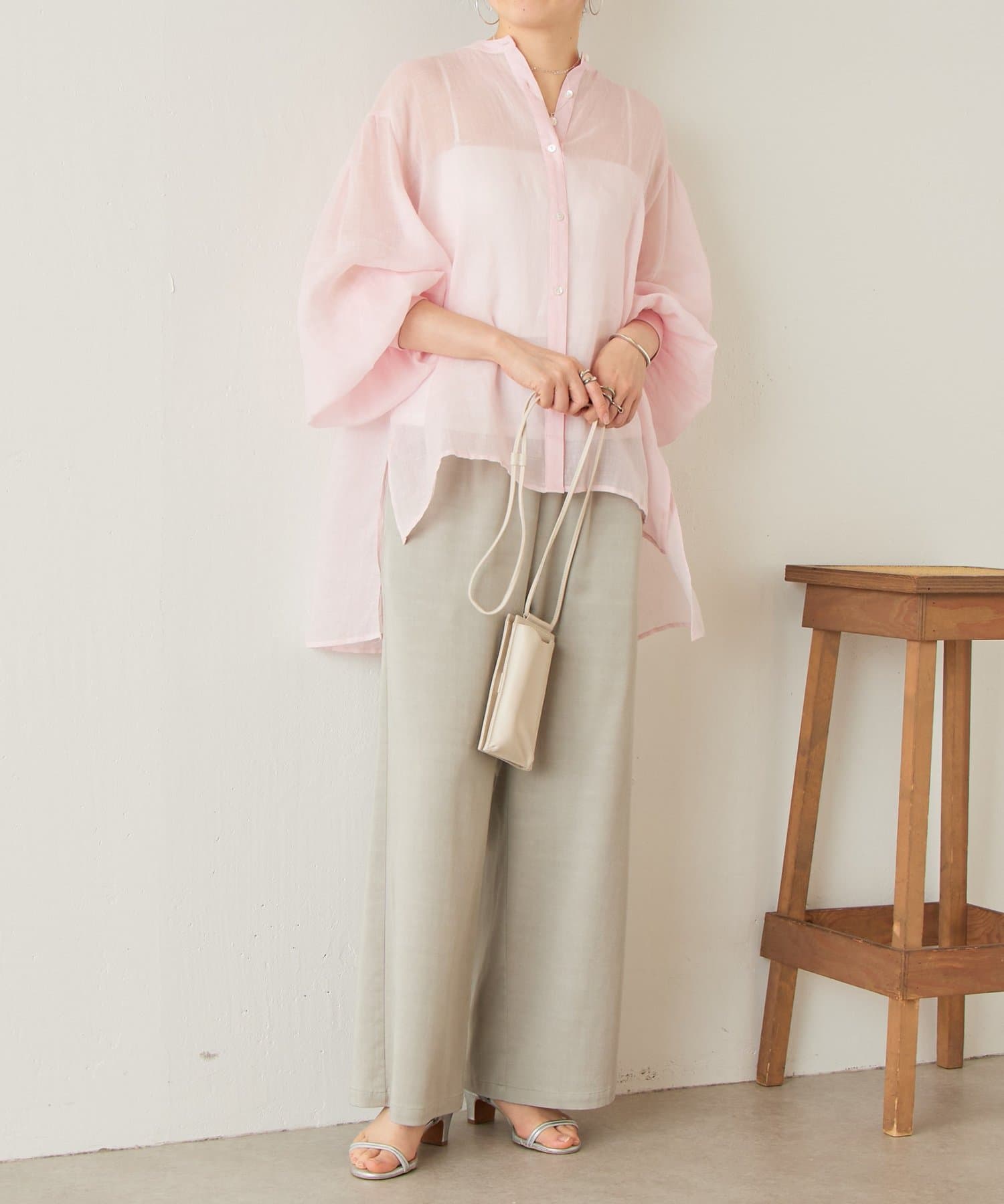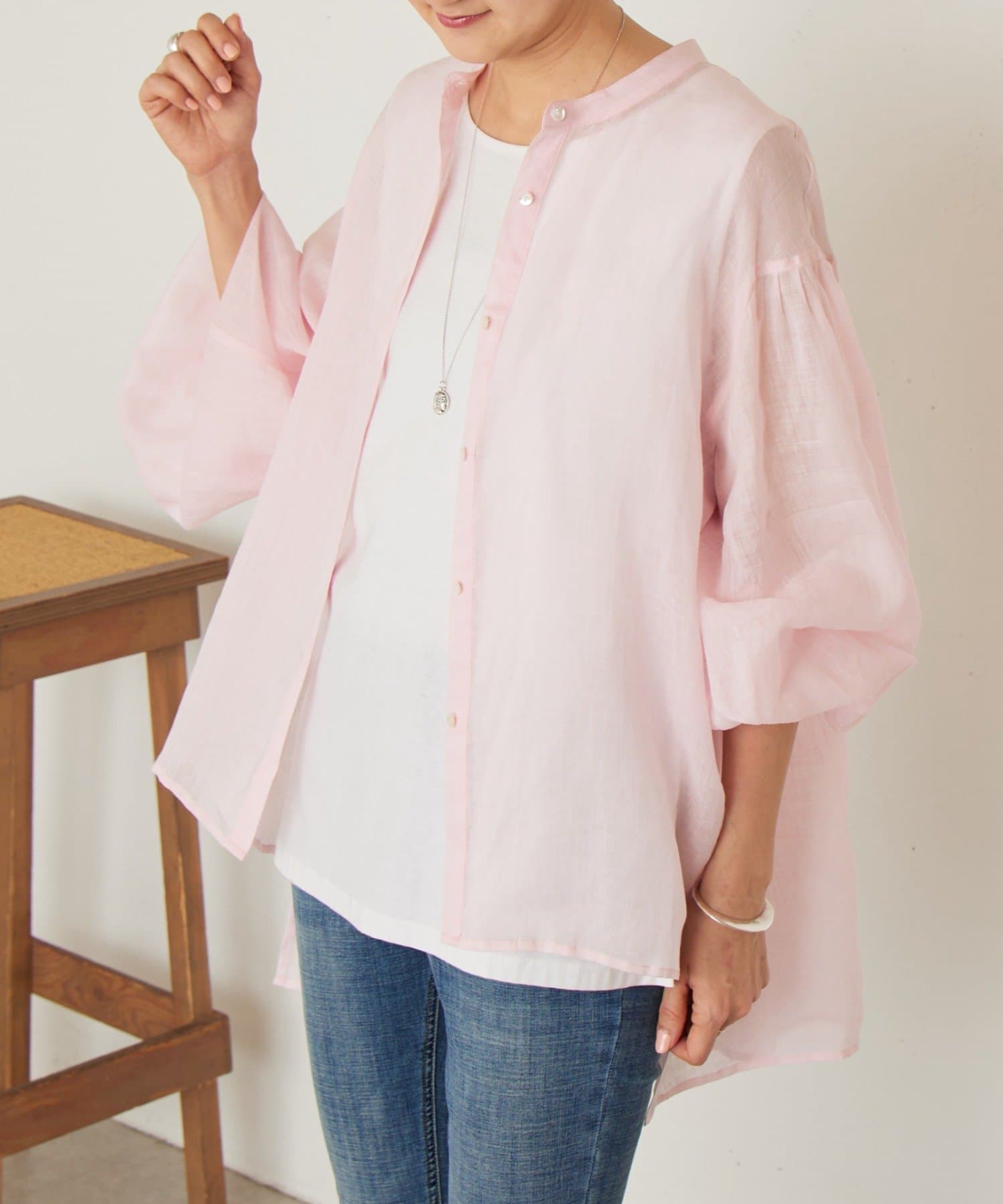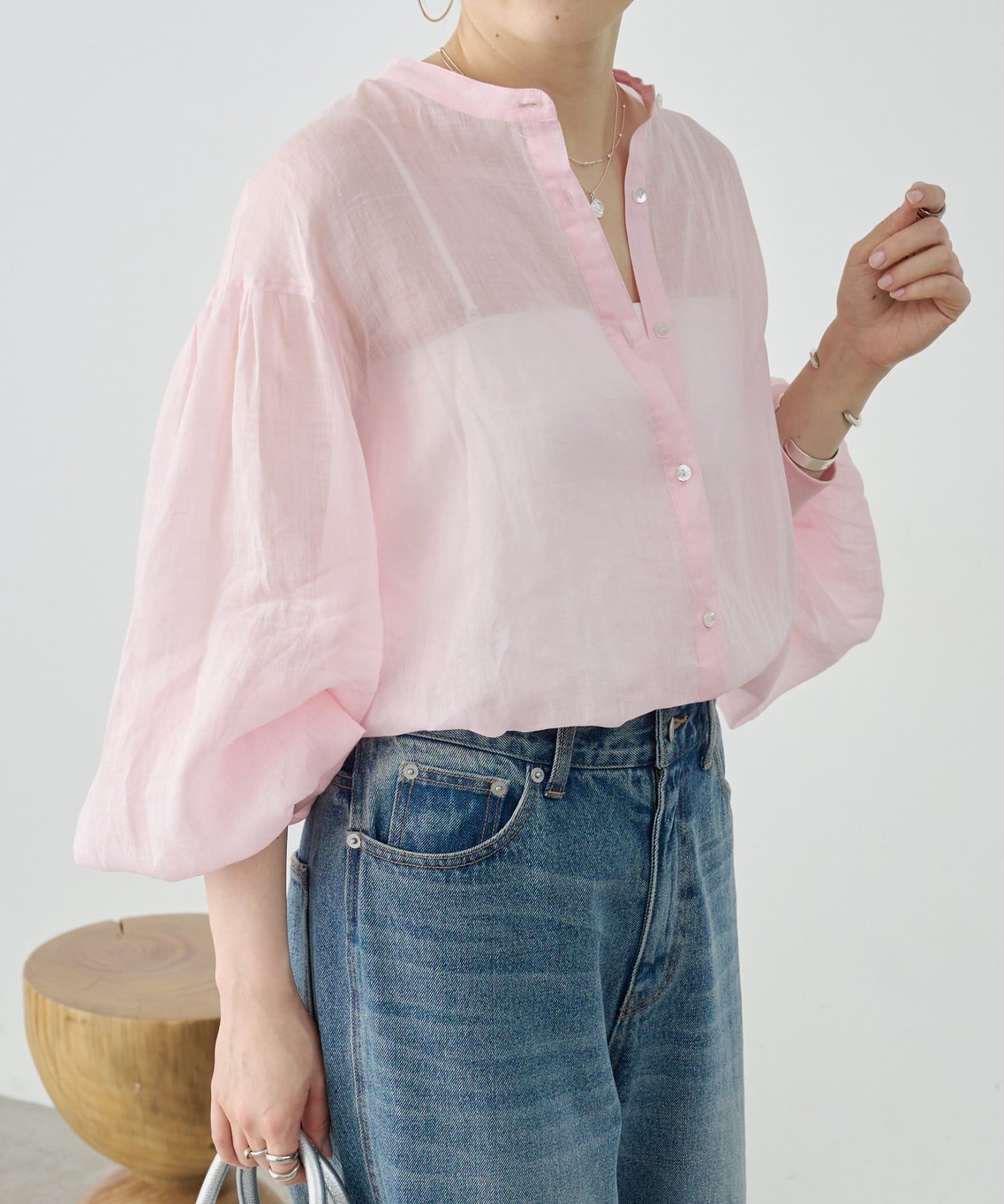 上品な光沢とシアー感のあるラミー素材を使用したノーカラーシャツ。