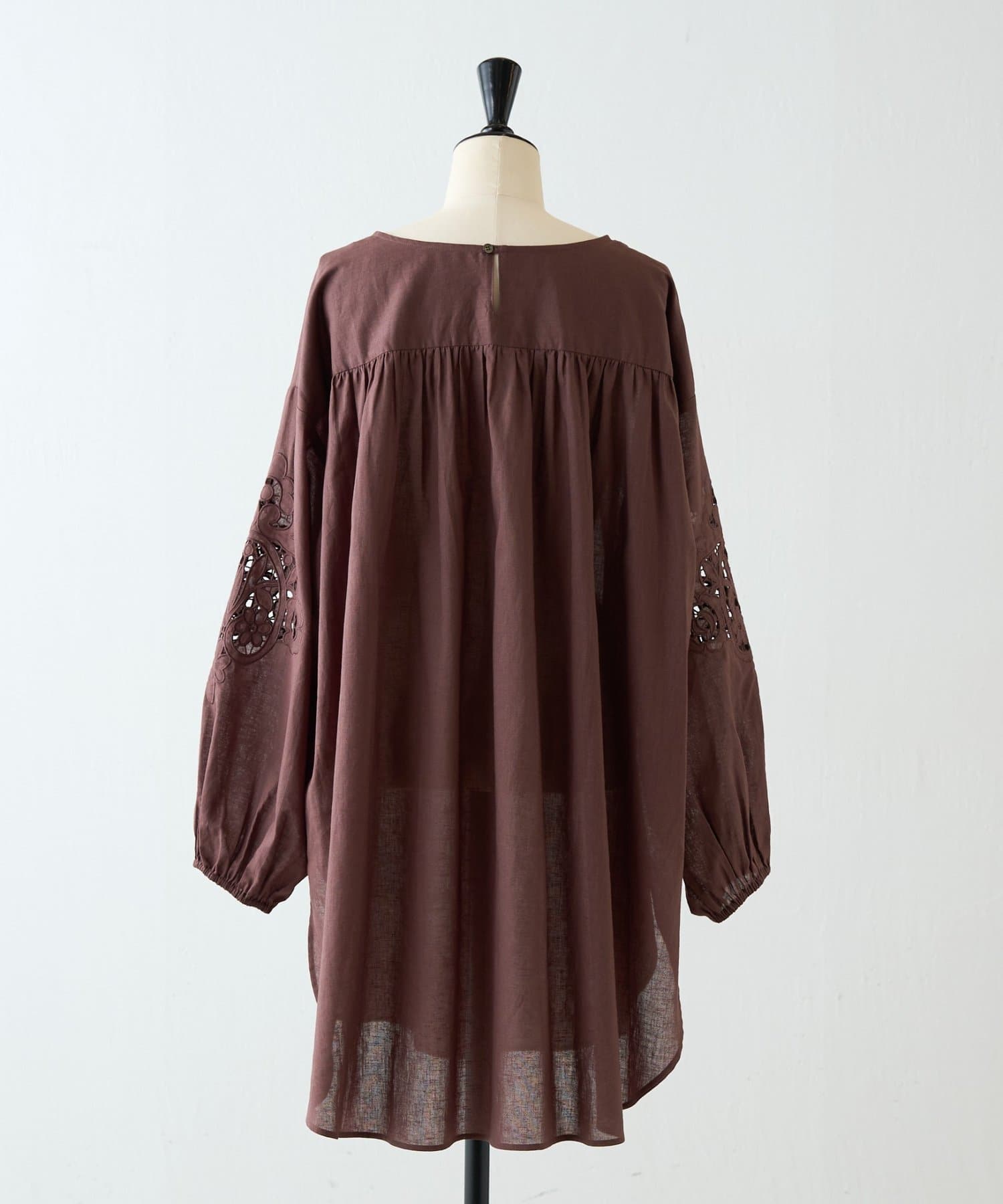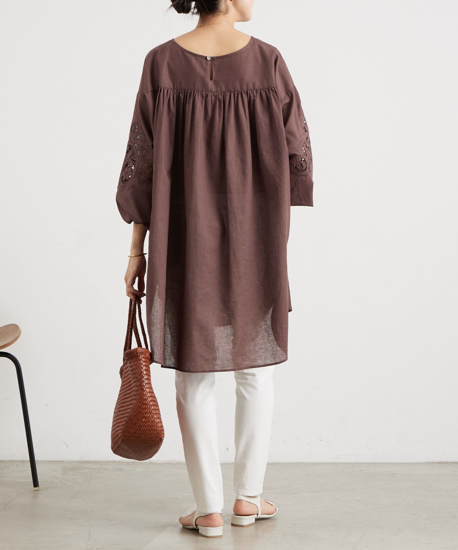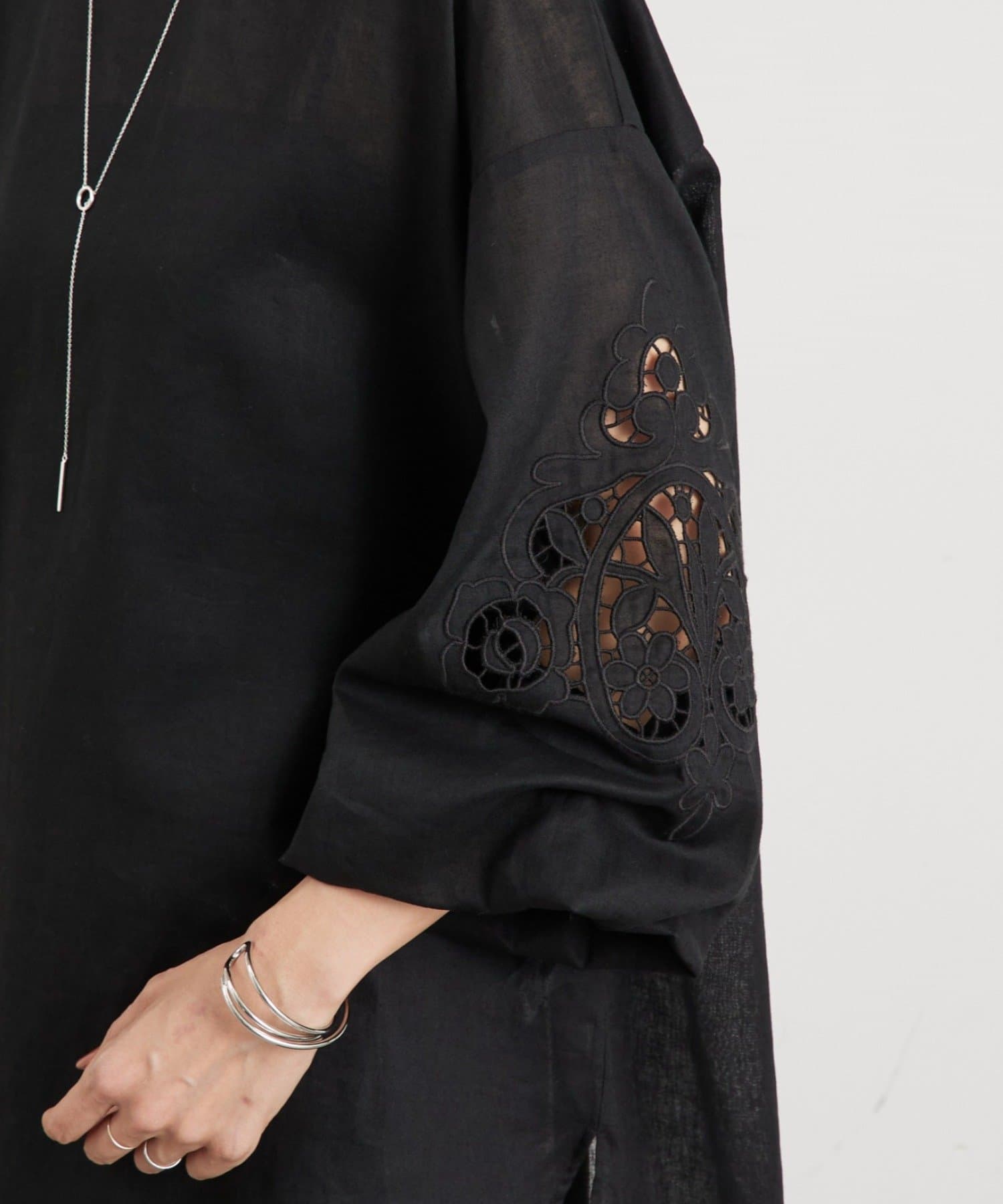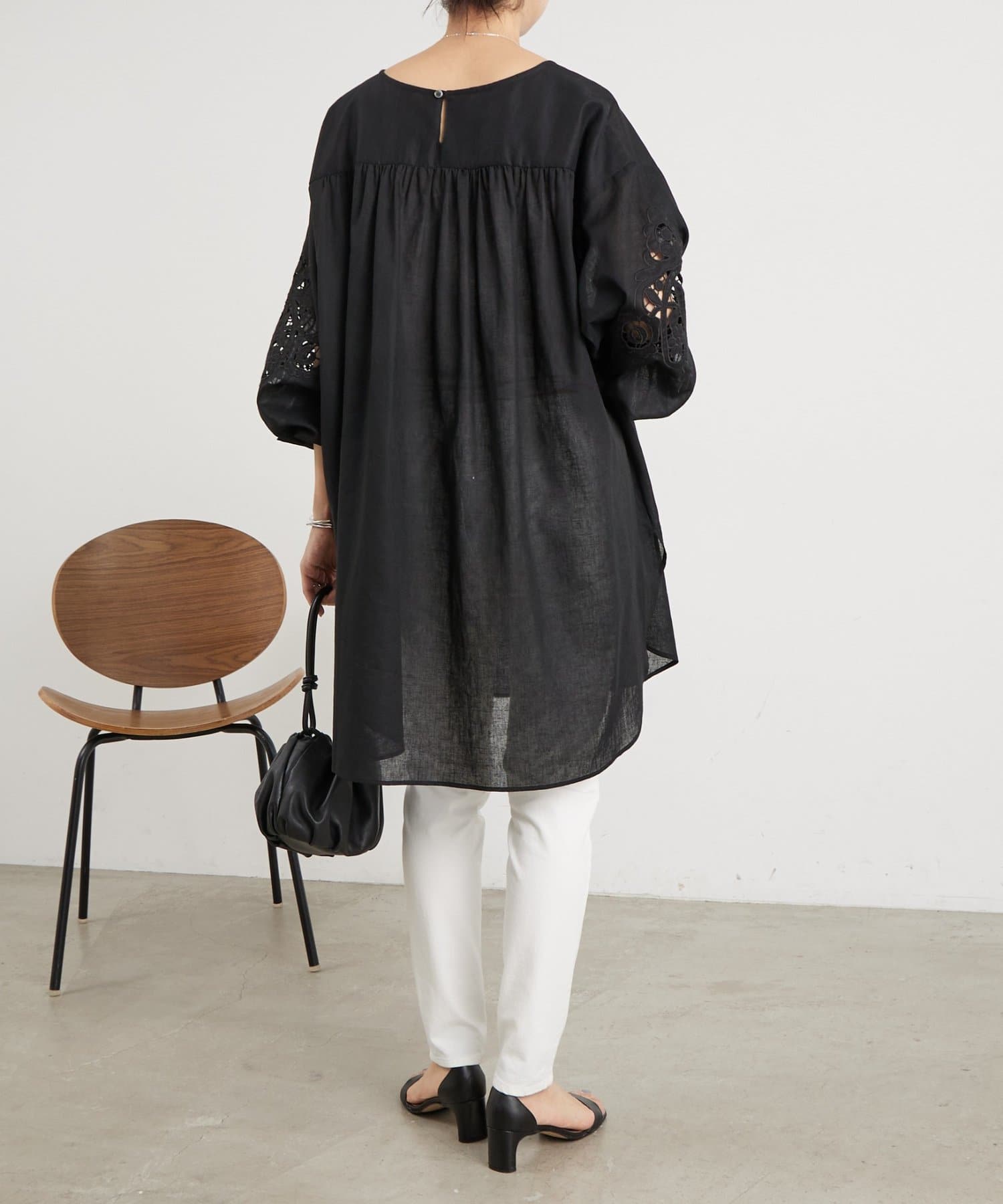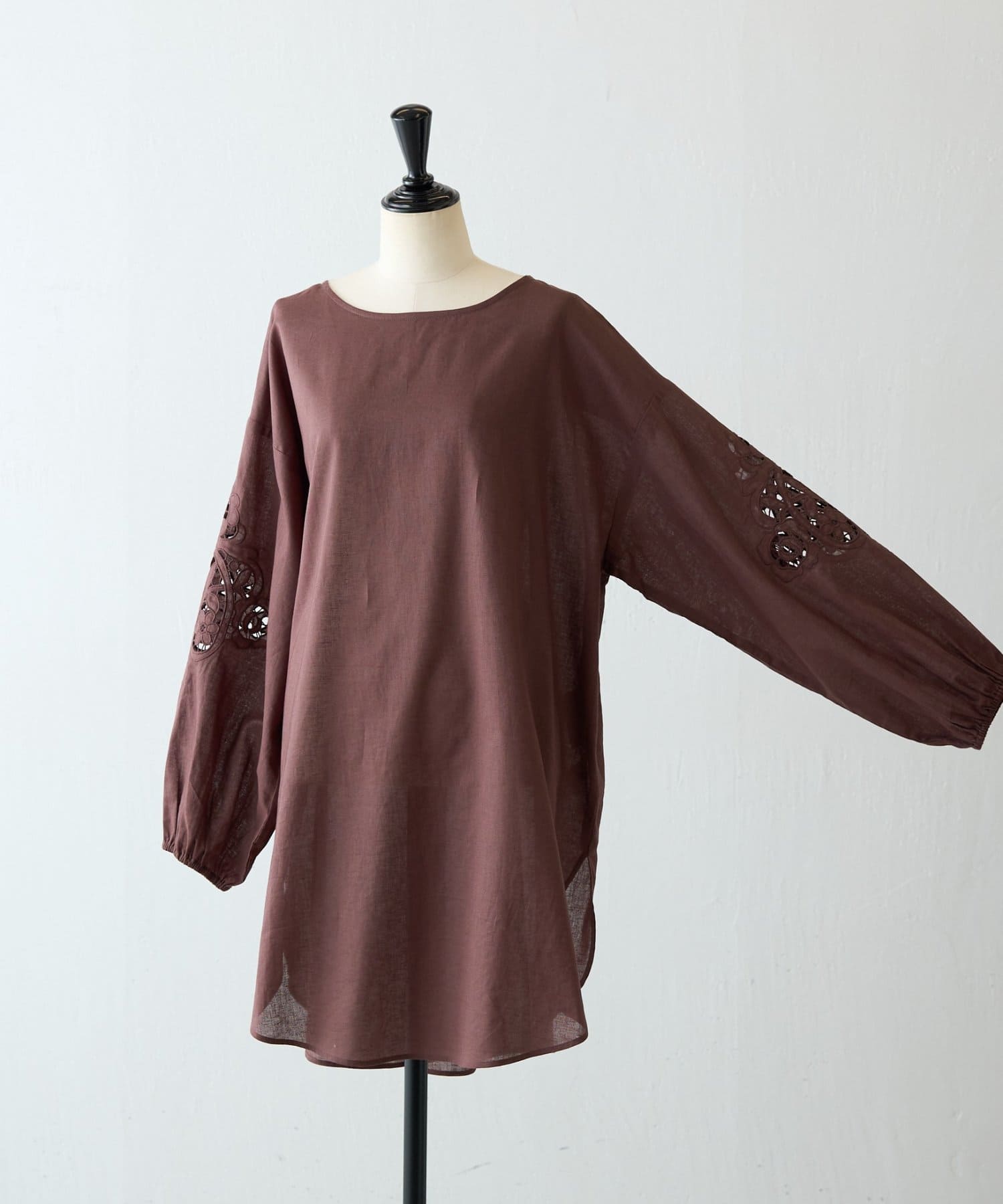 袖に施したカットワークデザインがアクセントになったシャツチュニック。