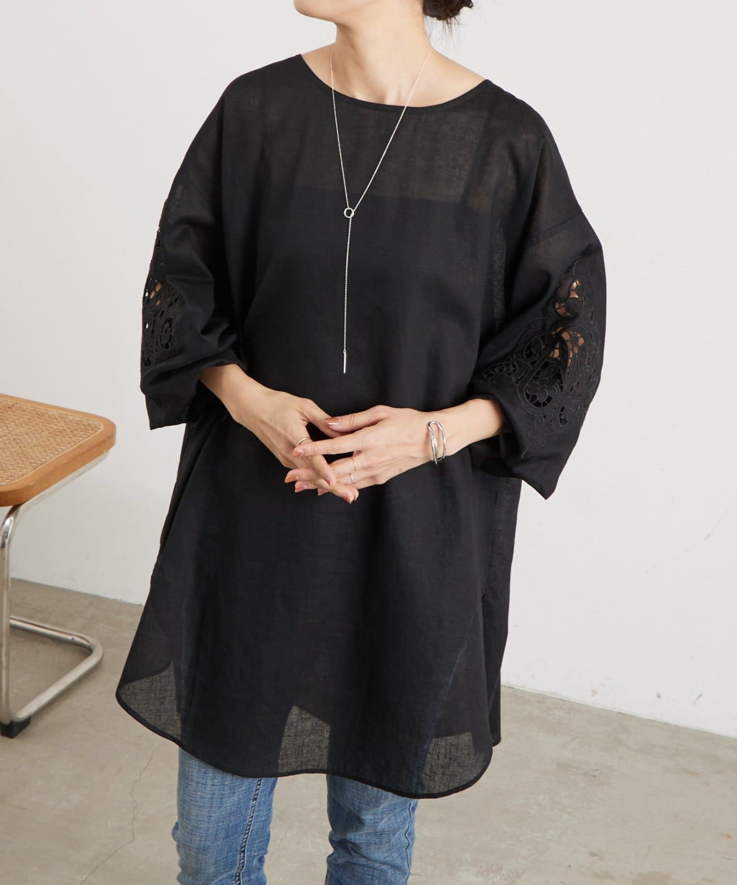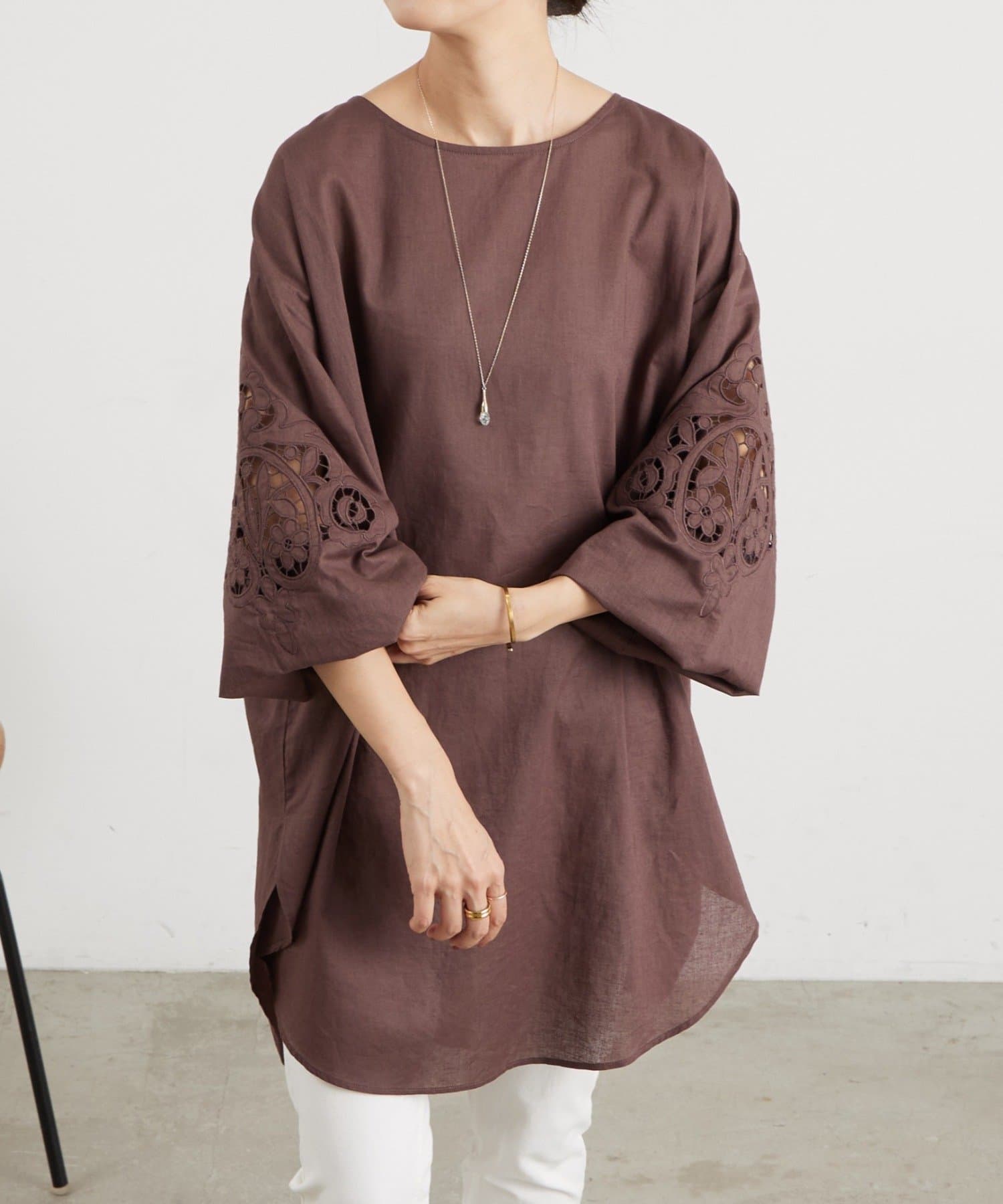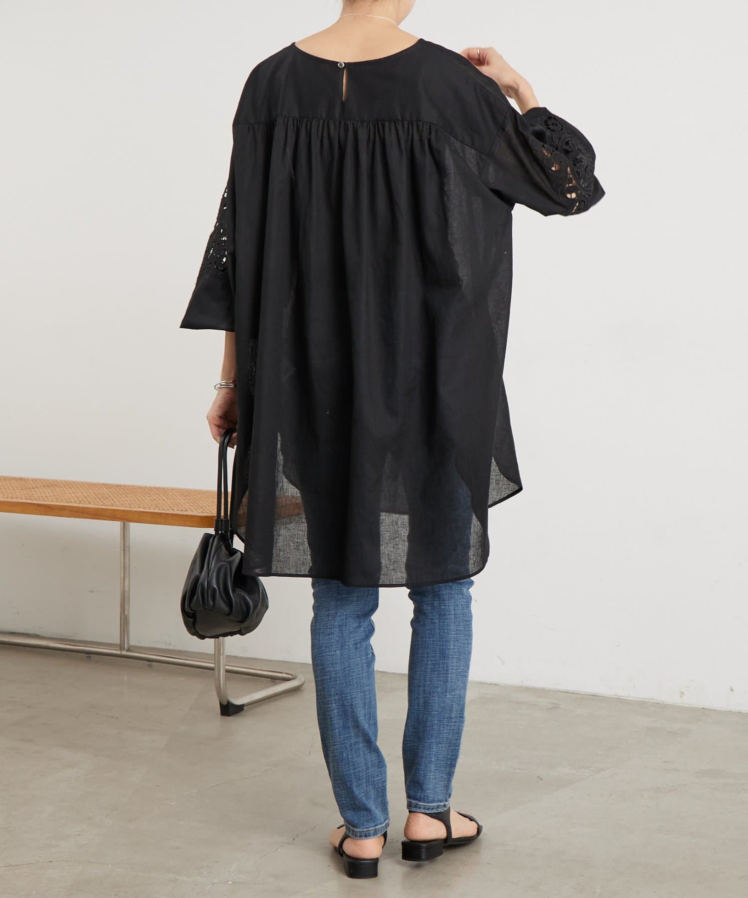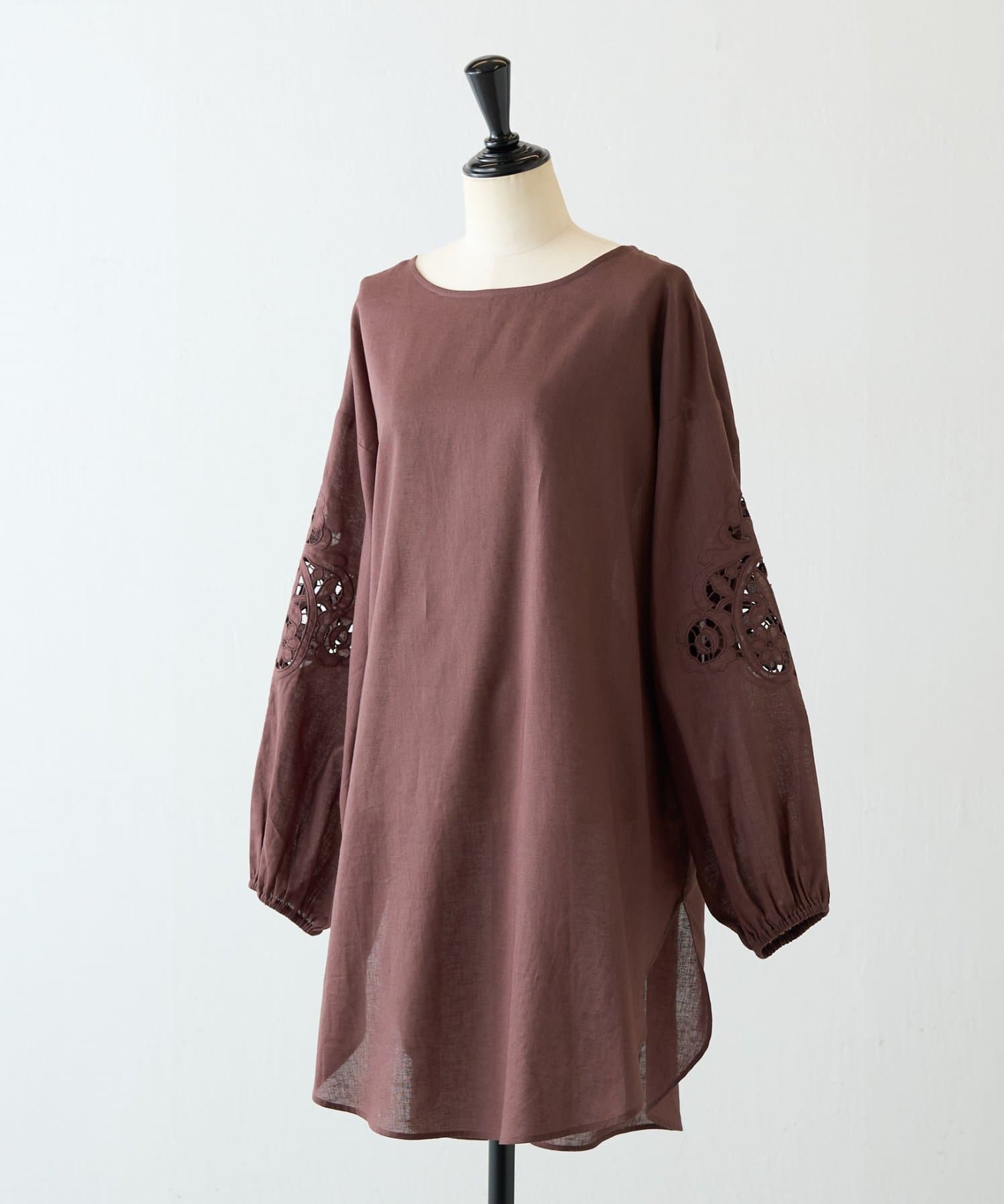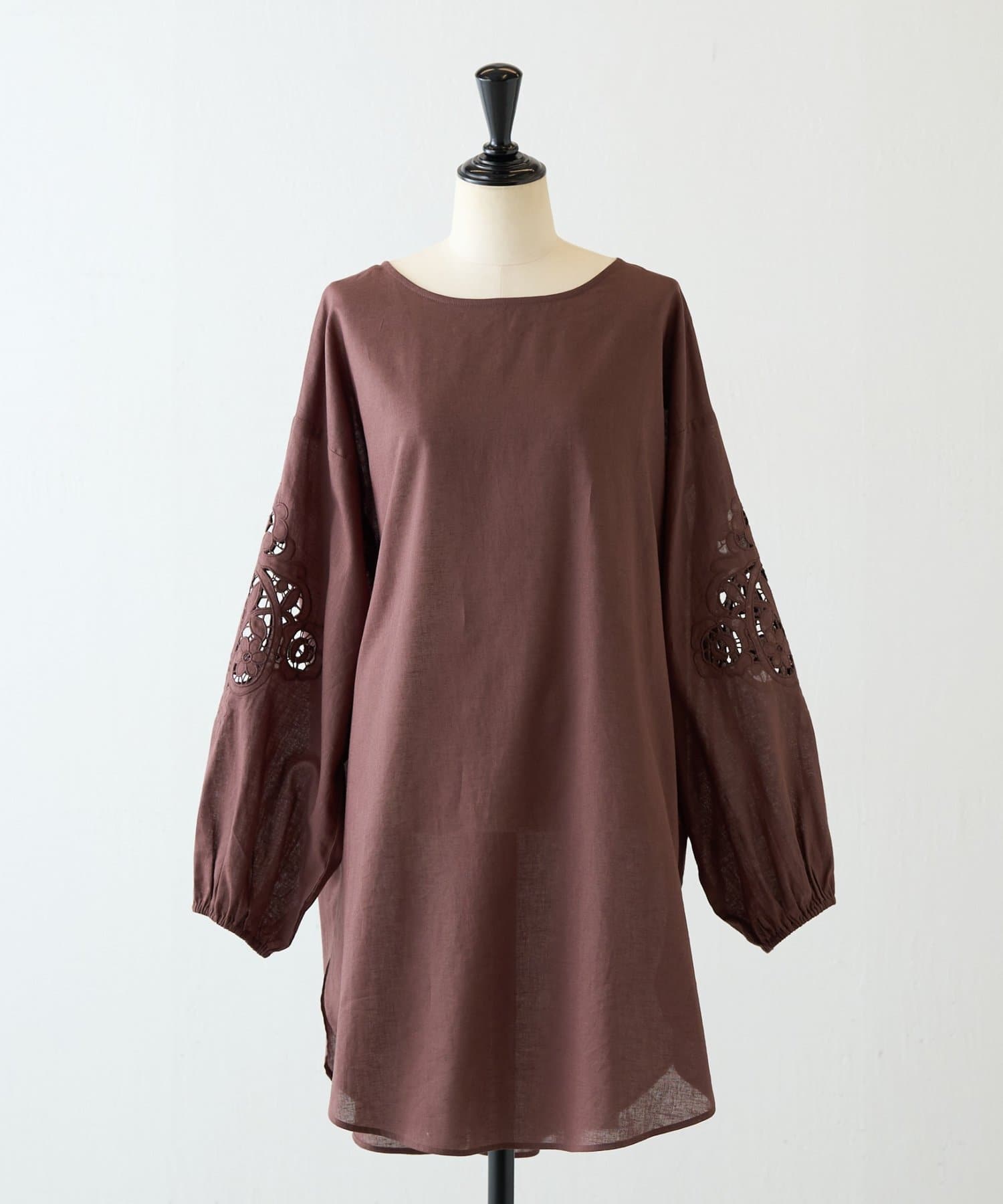袖に施したカットワークデザインがアクセントになったシャツチュニック。