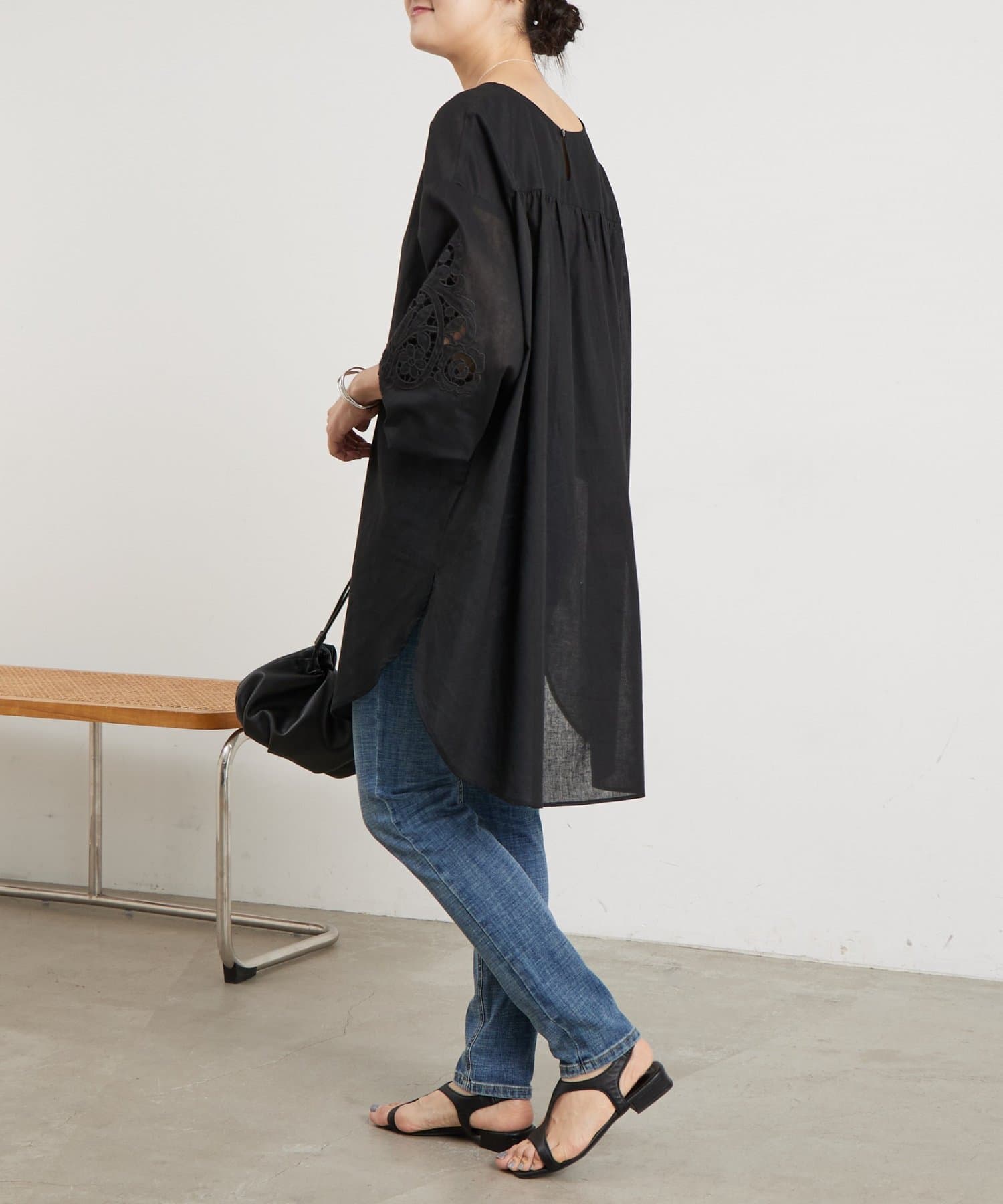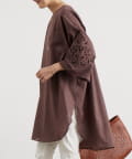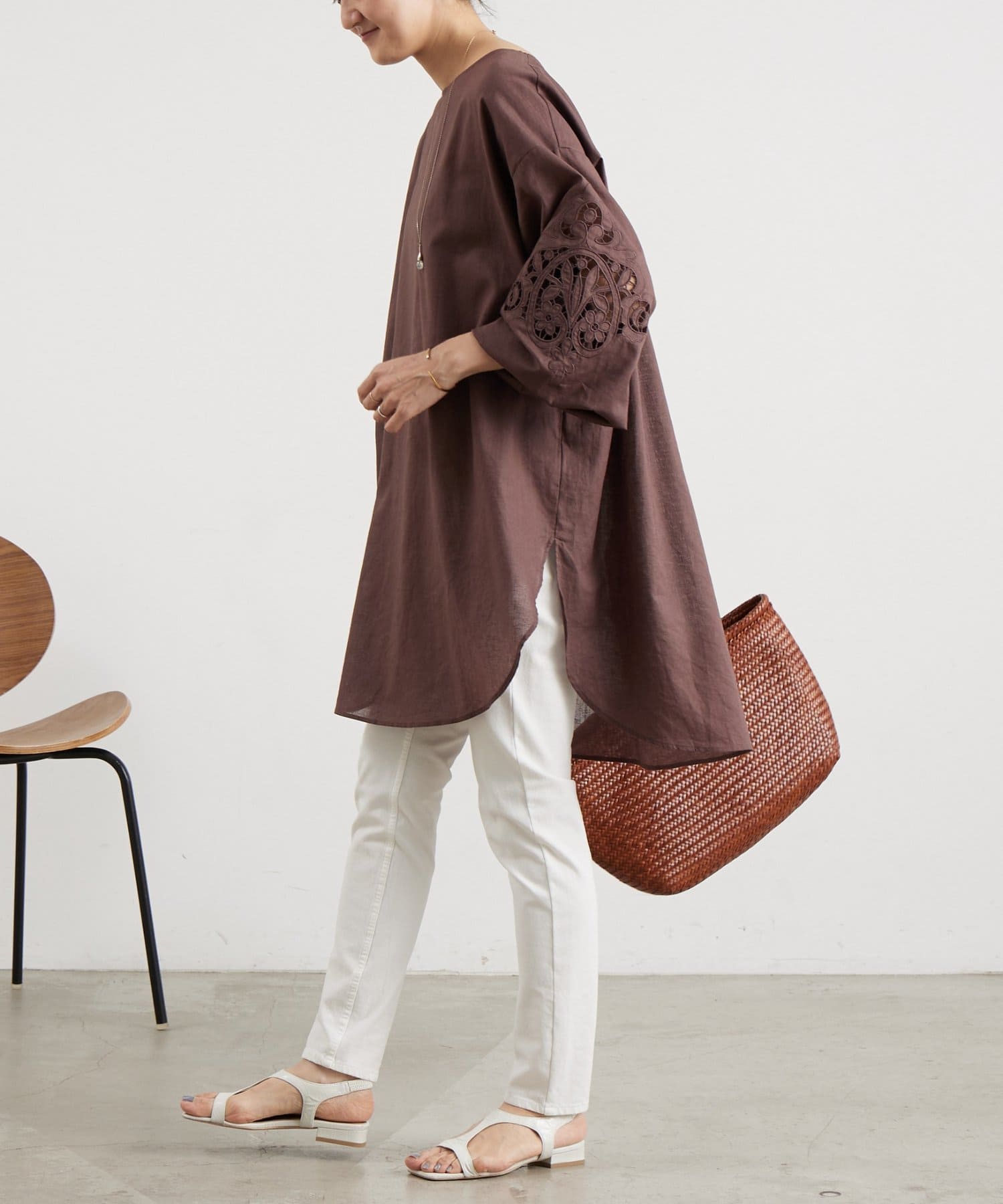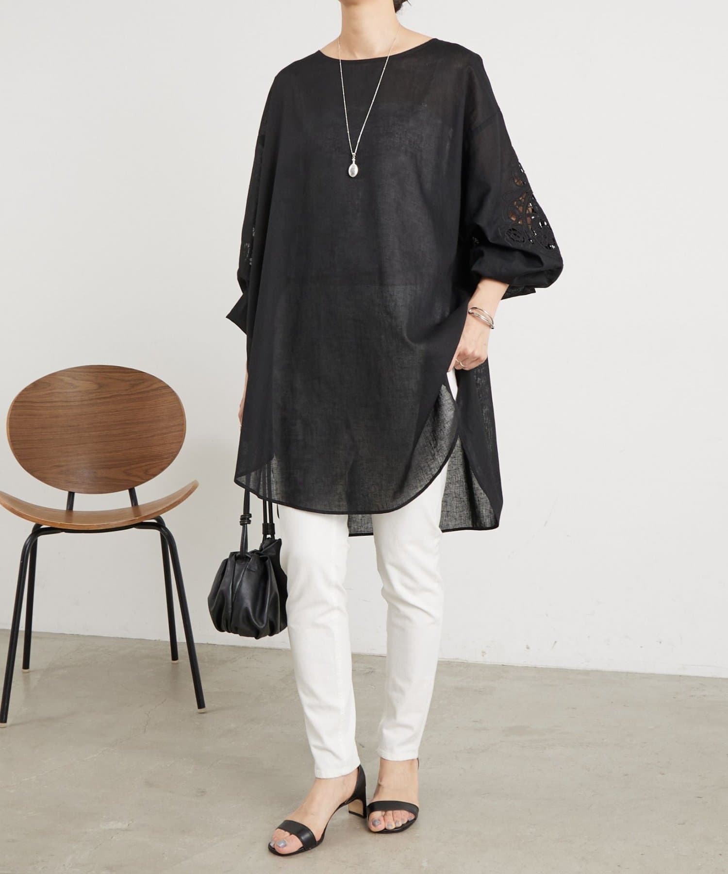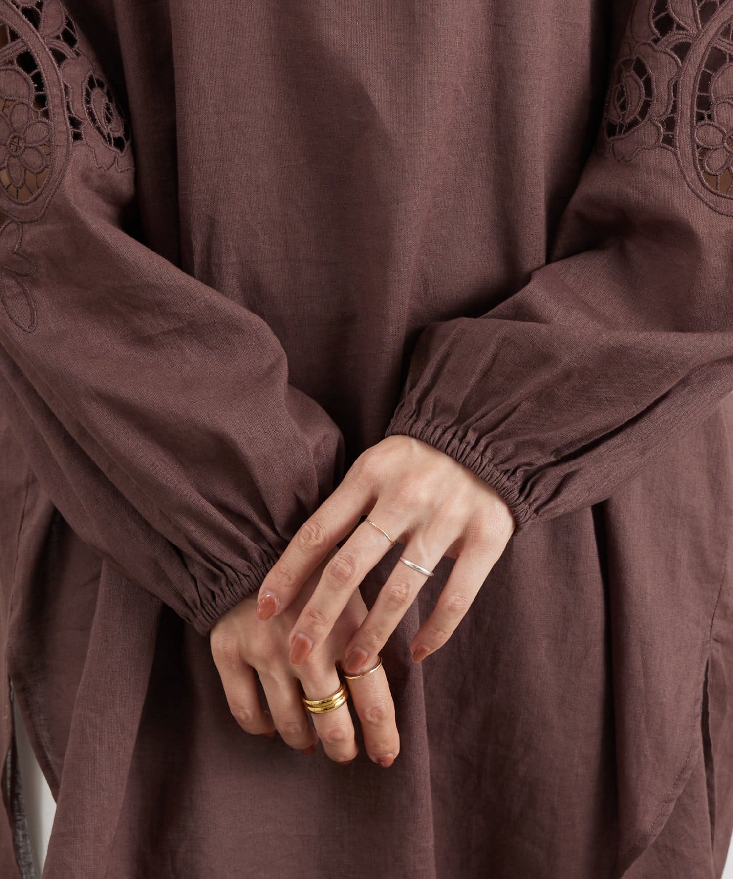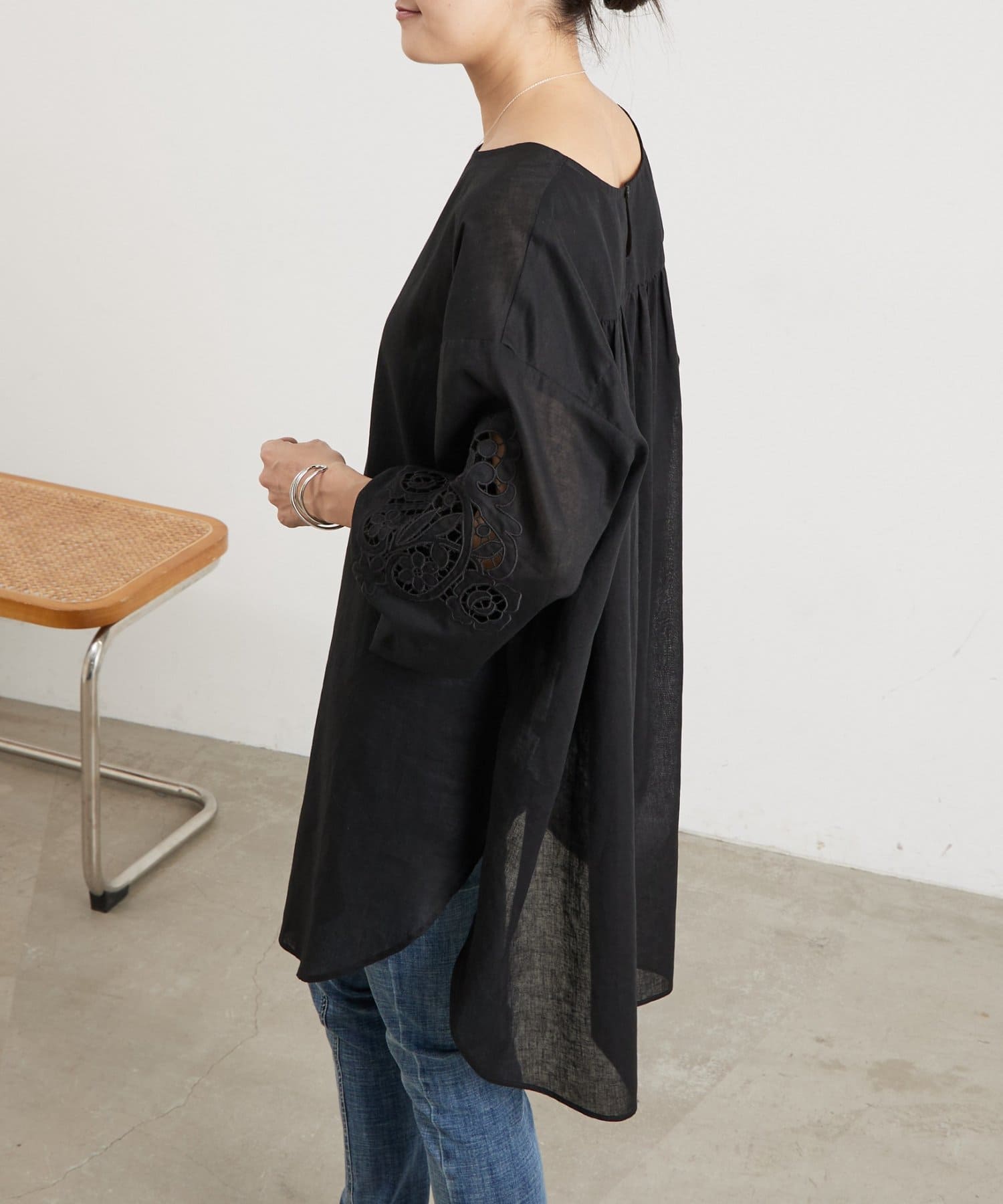 袖に施したカットワークデザインがアクセントになったシャツチュニック。