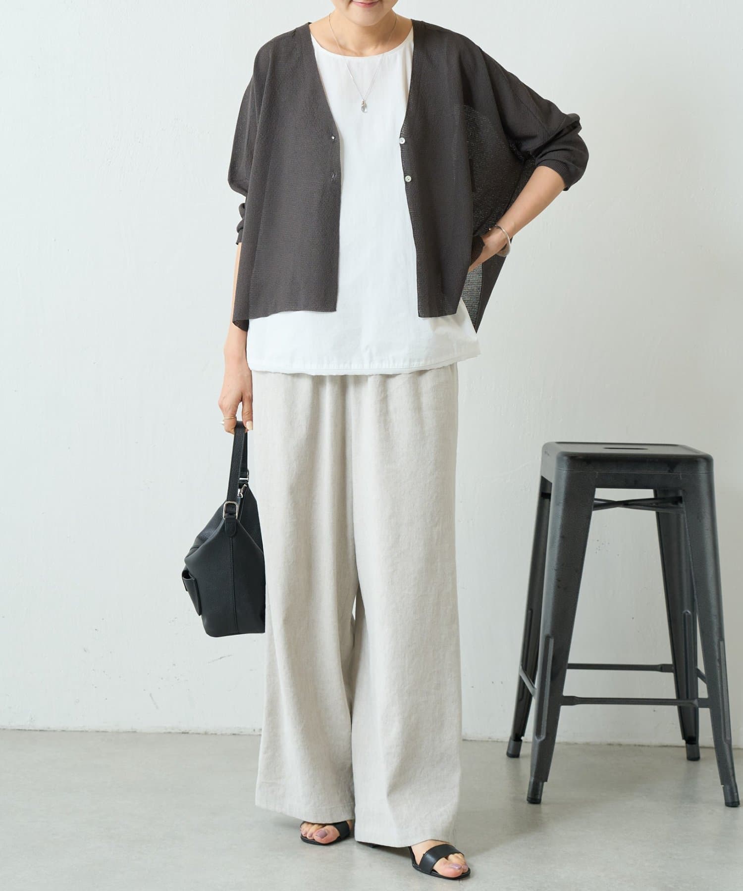 購入場所:パルクローゼットが、お袖のまくりやすさと七分くらいの袖がお気に入りです。パンツ・スカートどちらにも合わせやすい丈感で、今はノースリーブに羽織りとして活躍してくれています。さらっとしているのでシーズンレスで着れるかなと楽しみです。