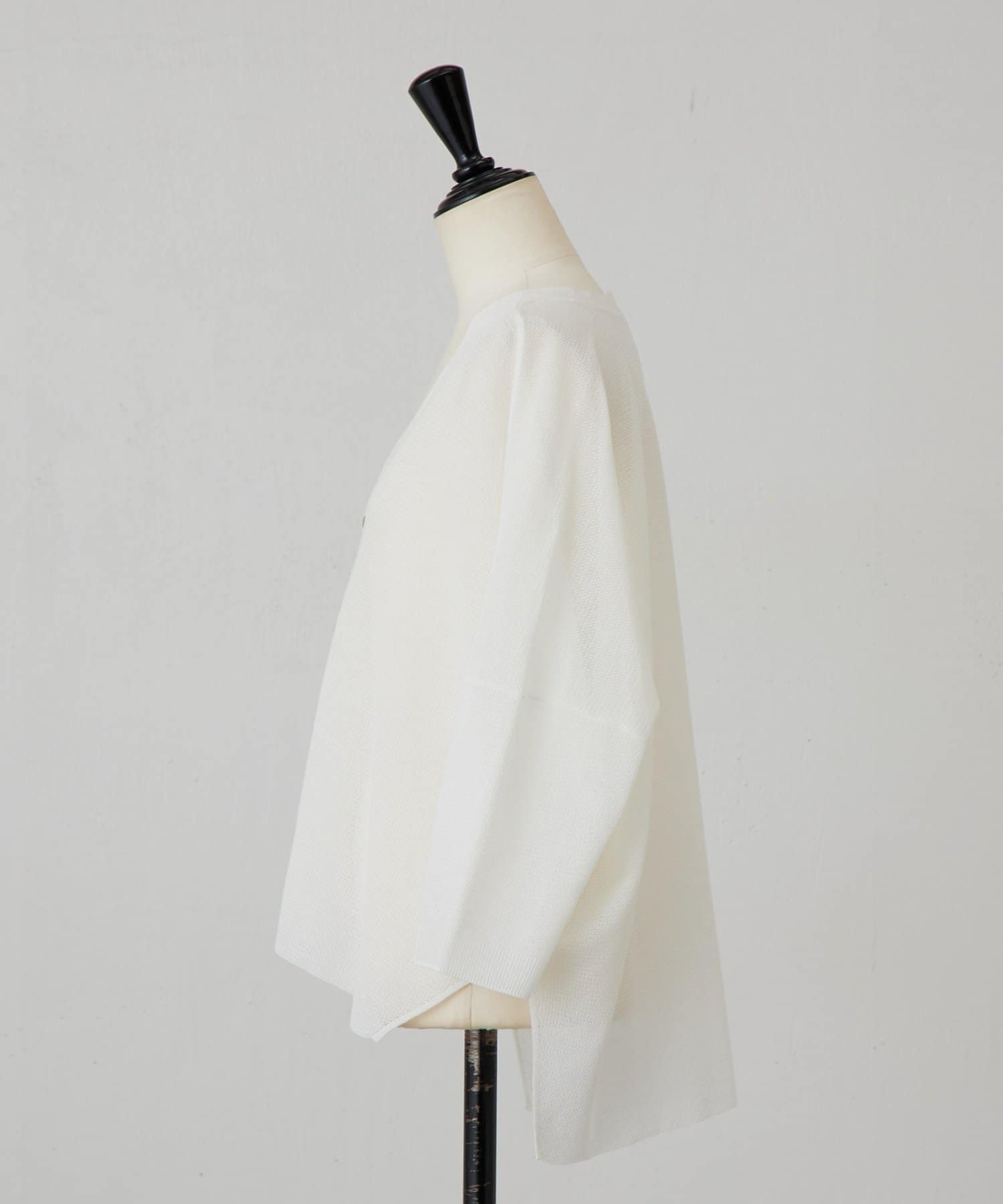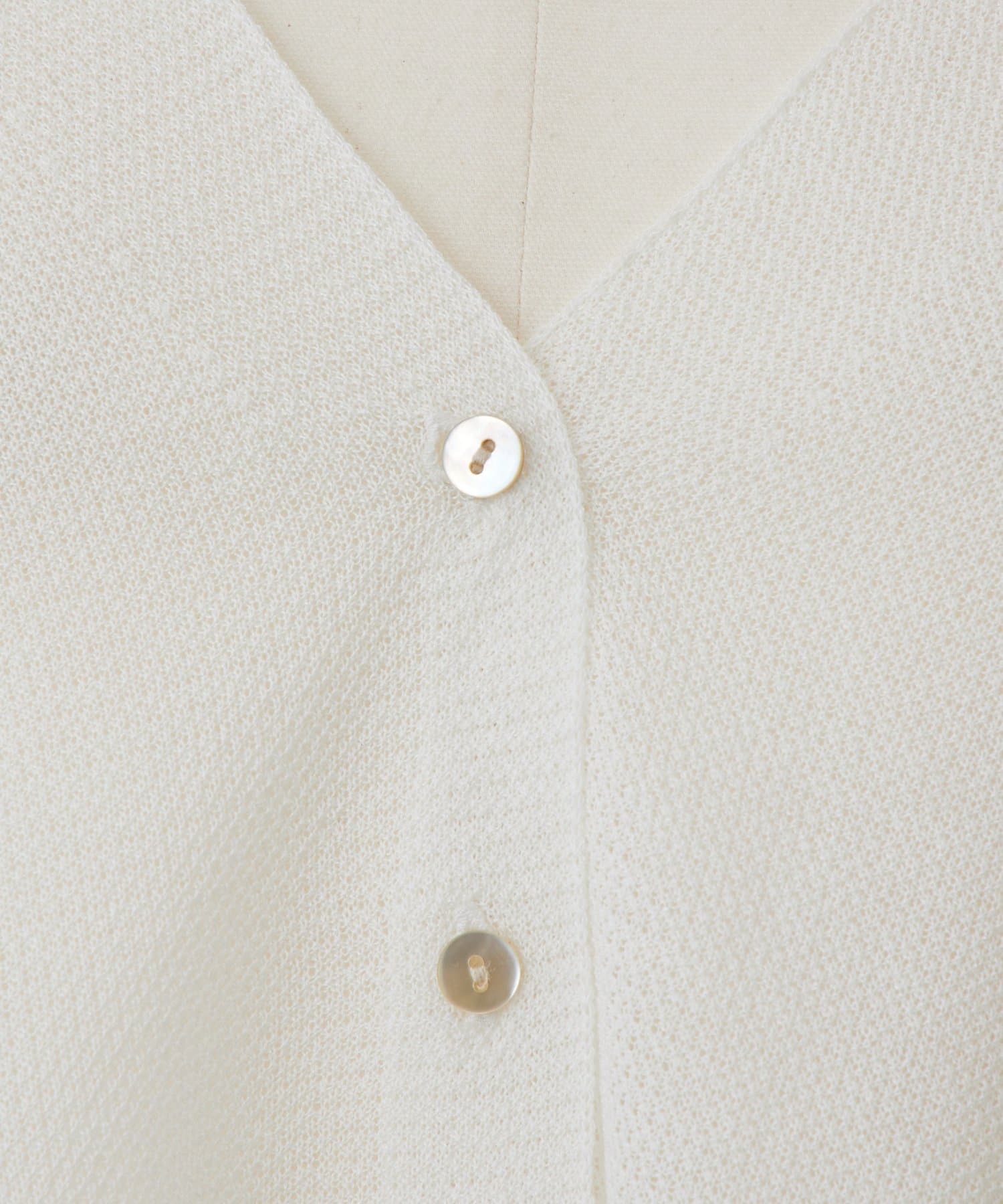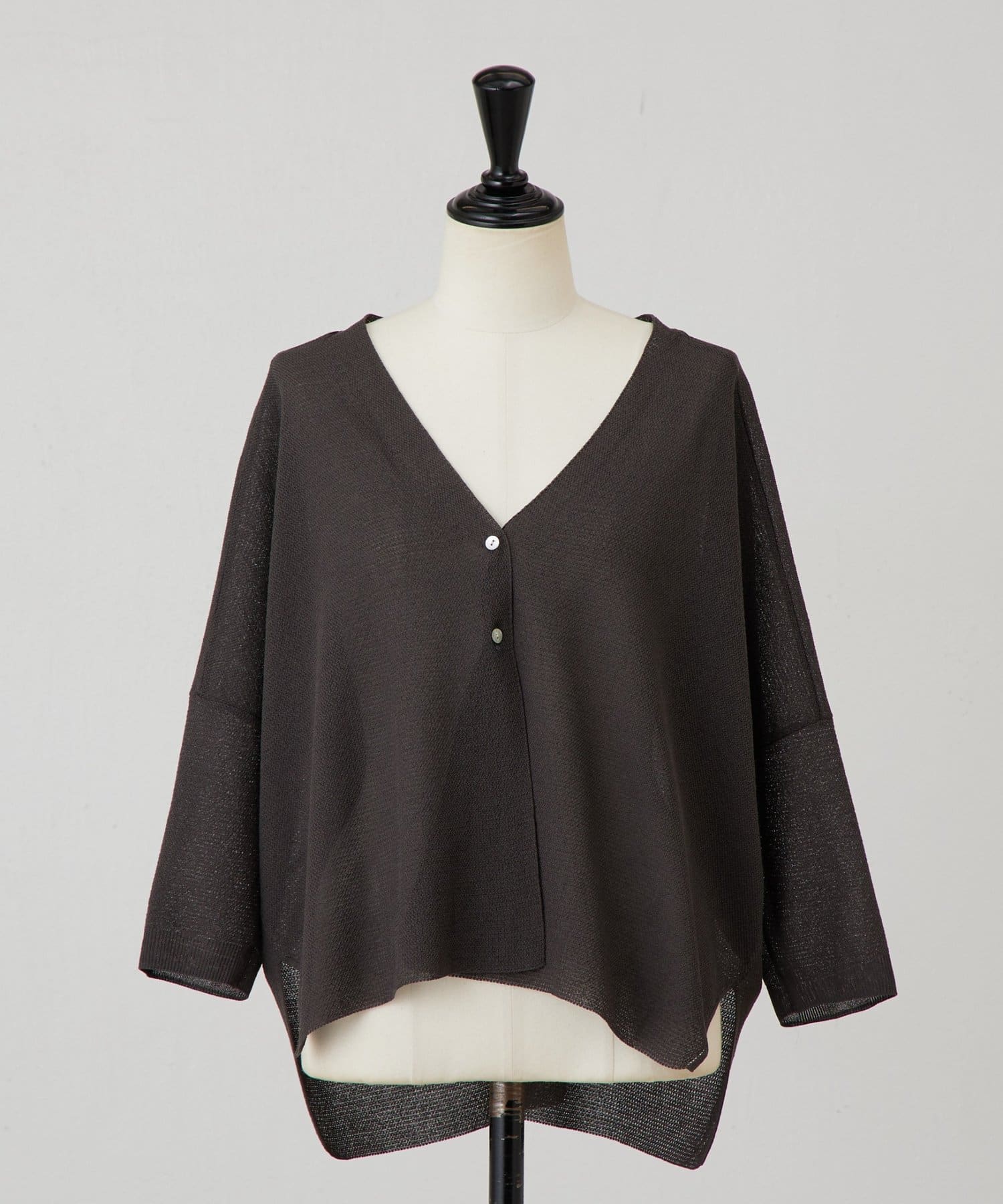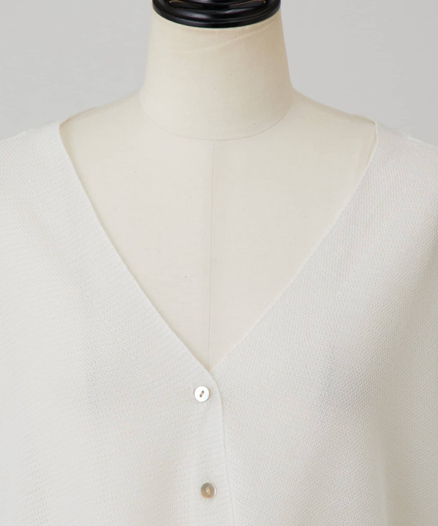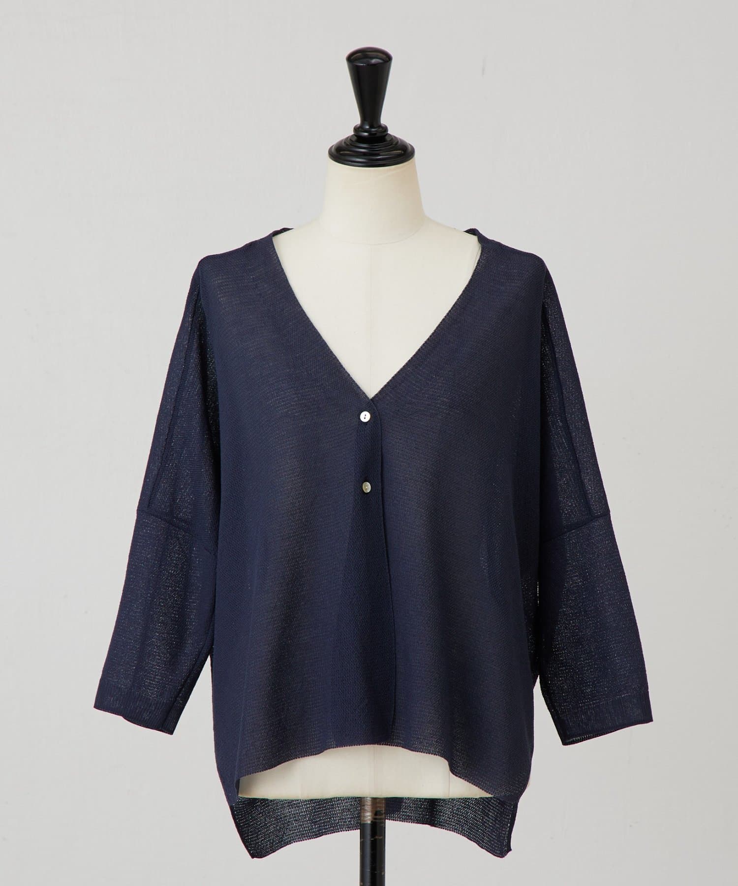 顔周りがすっきりと見えるVネックで、ボタンを閉めてプルオーバーとしても◎