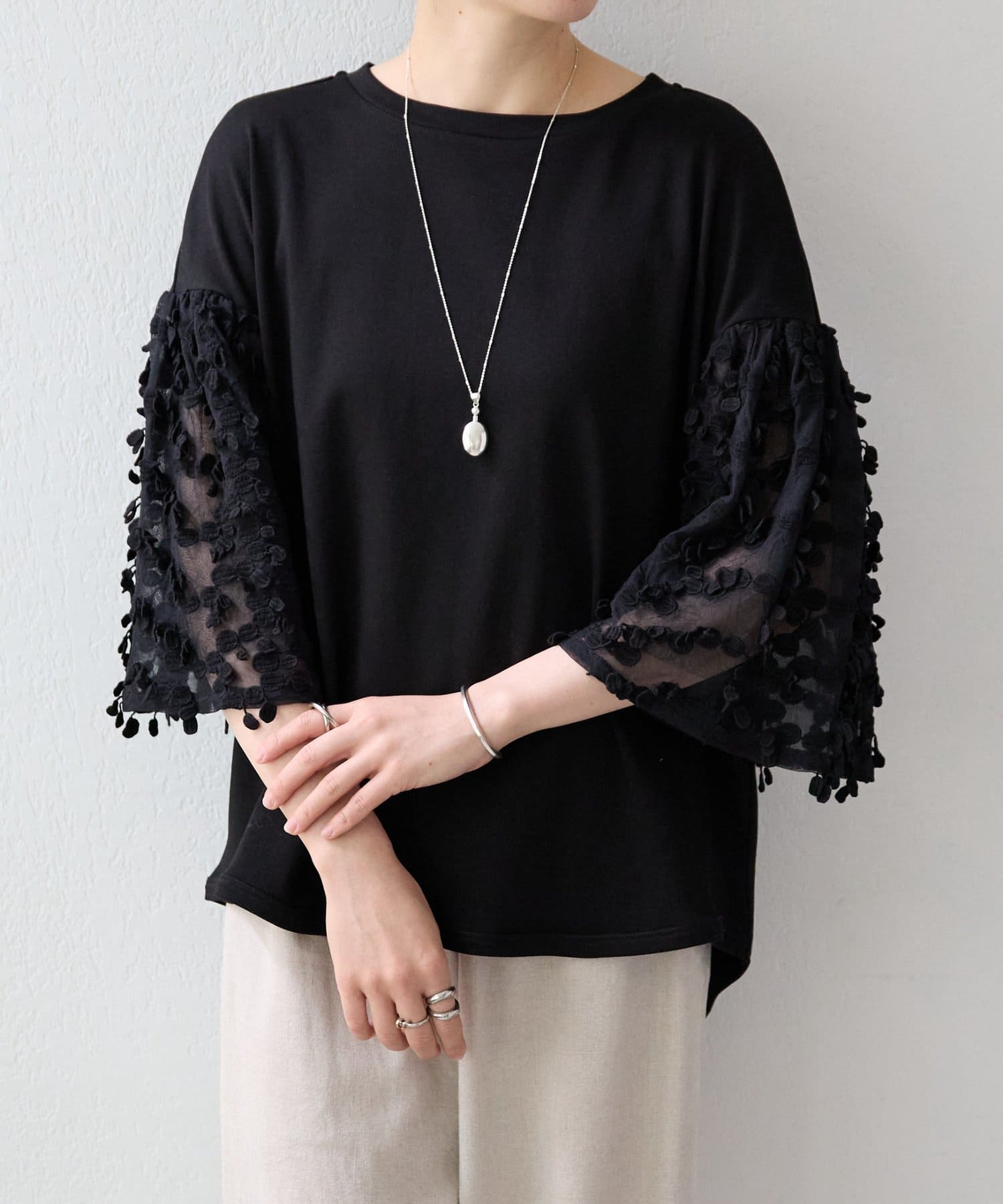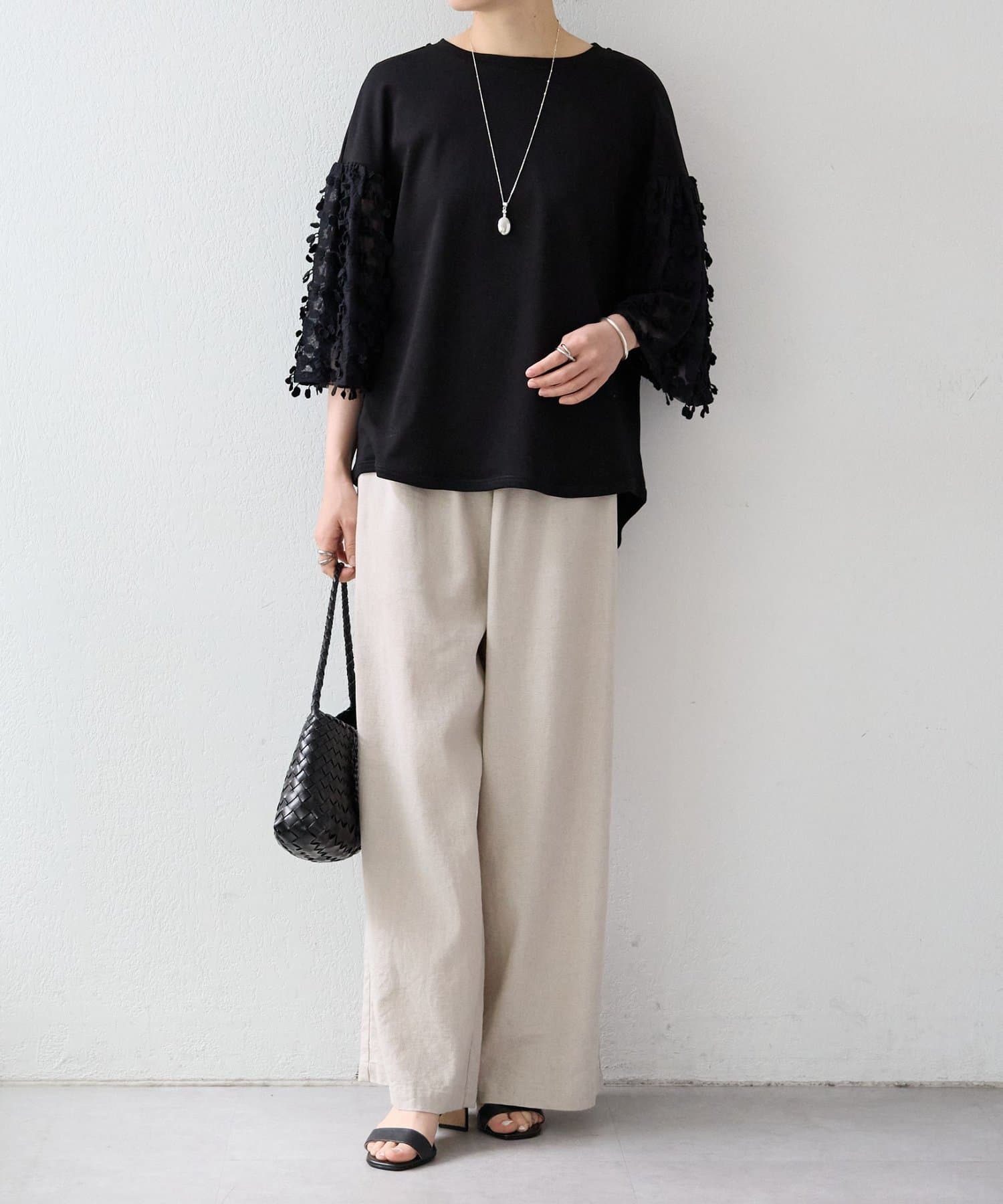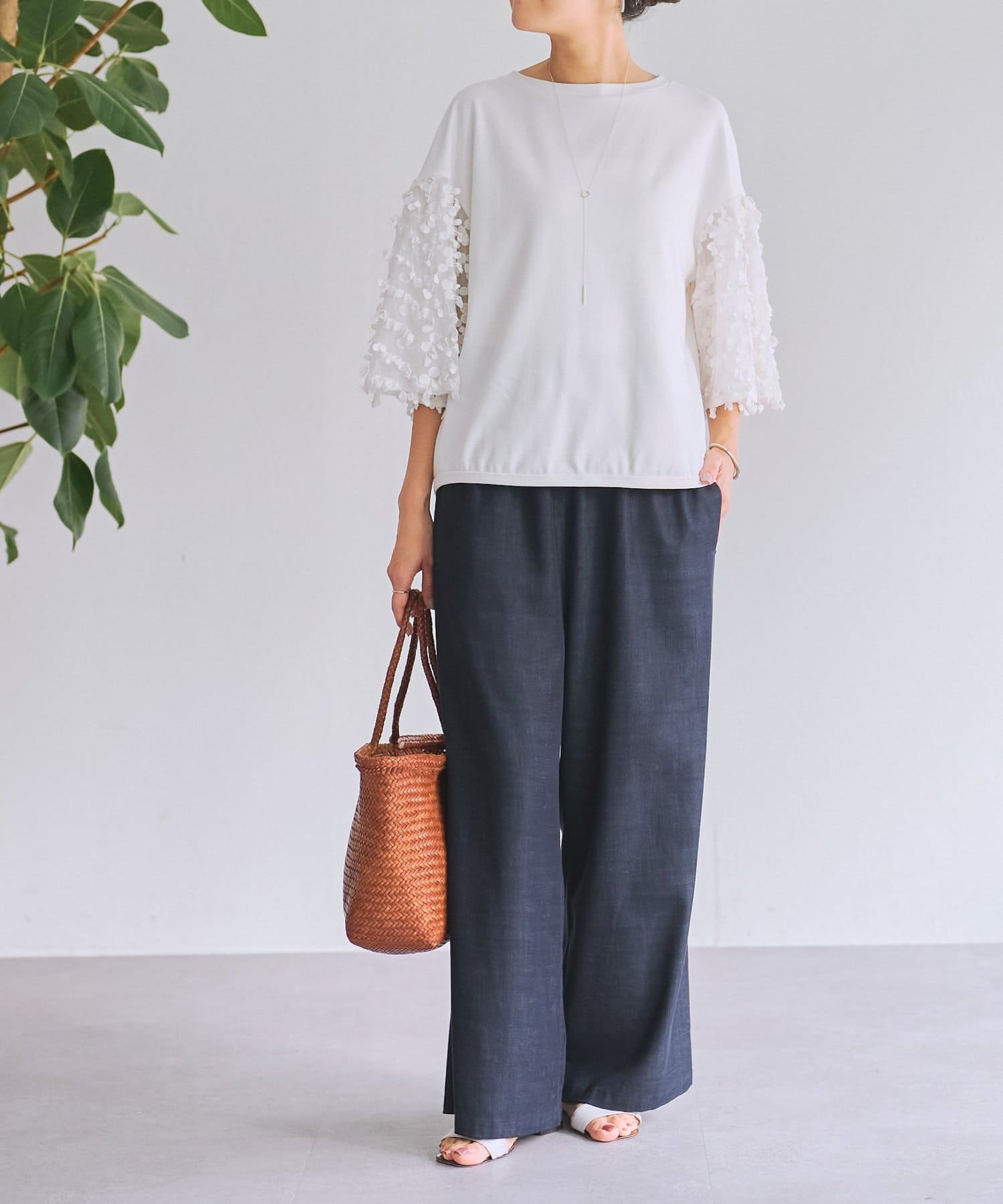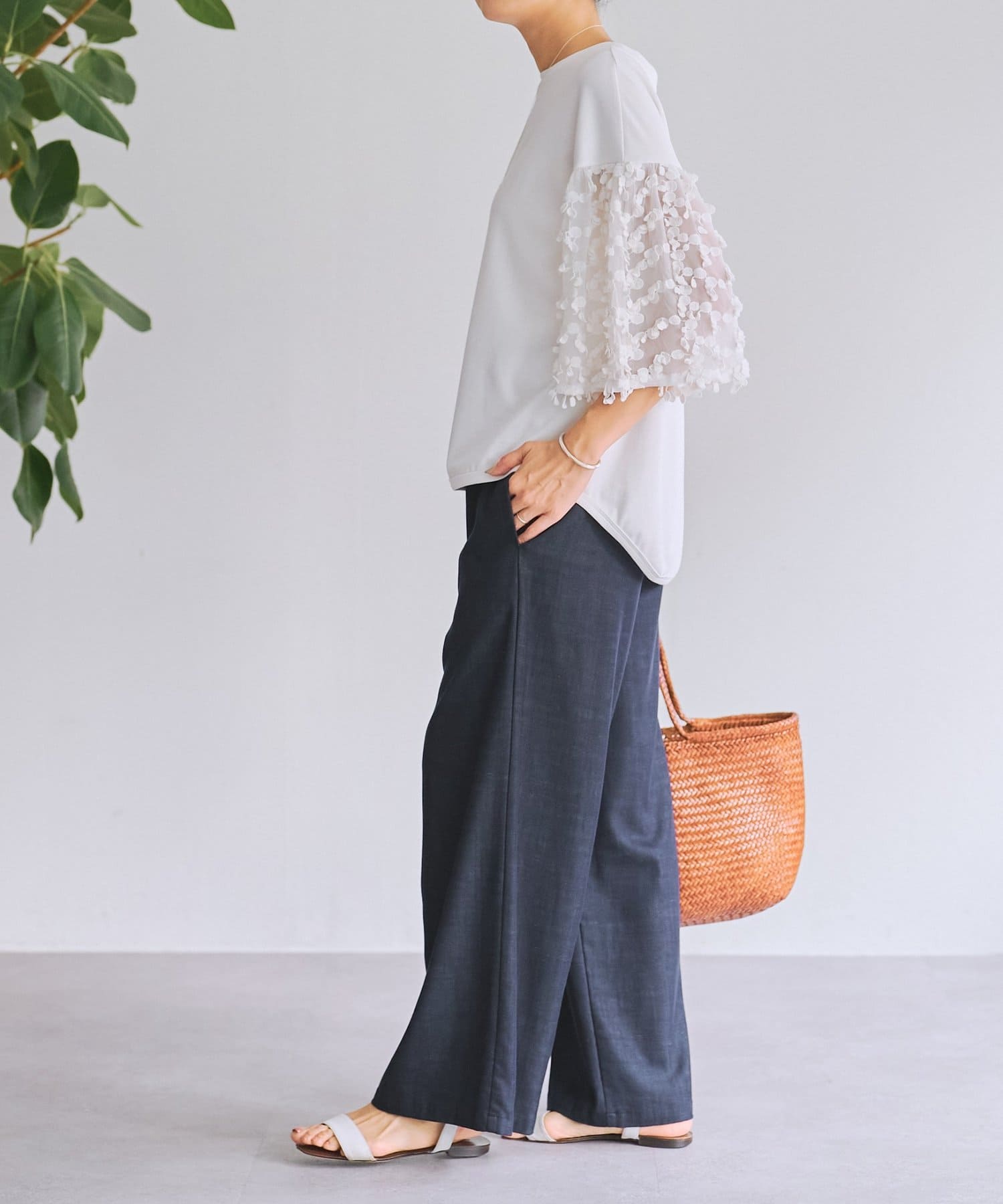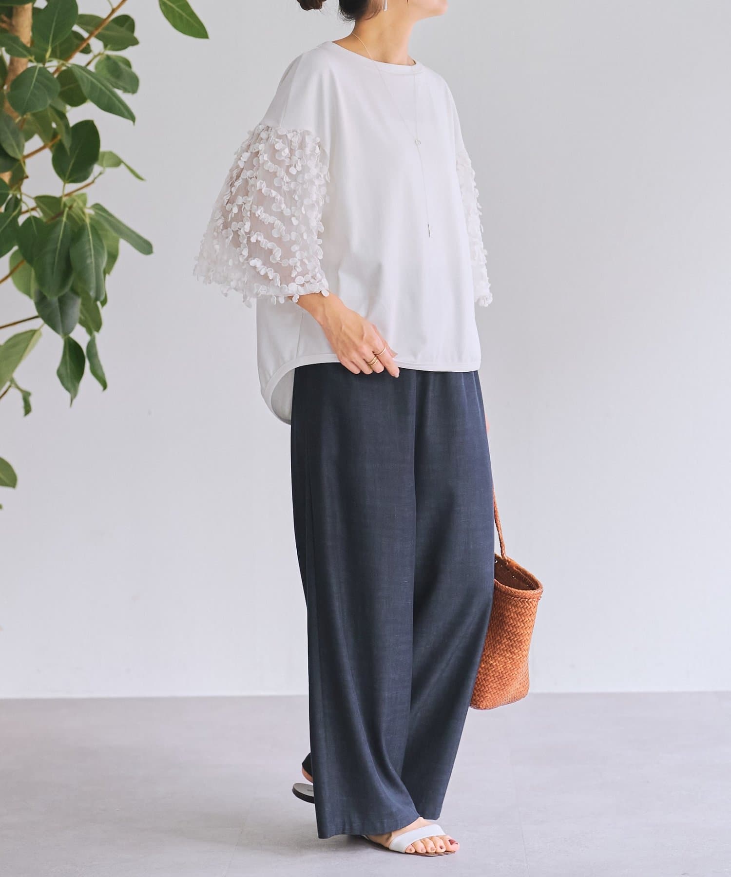 ベルスリーブのように広がる袖は、肘が隠れる安心感のある丈感で、さりげなく腕まわりをカバー。