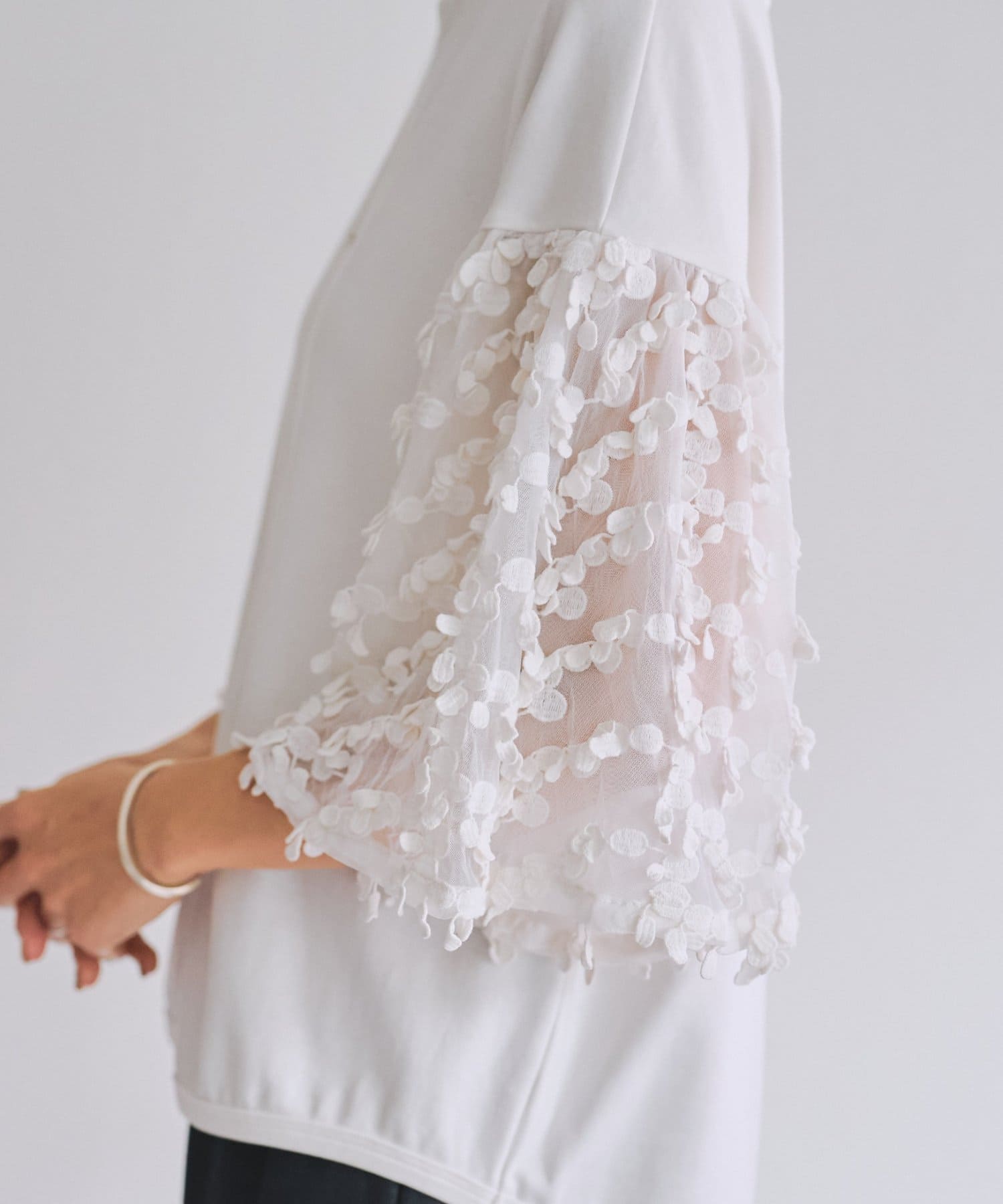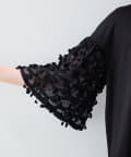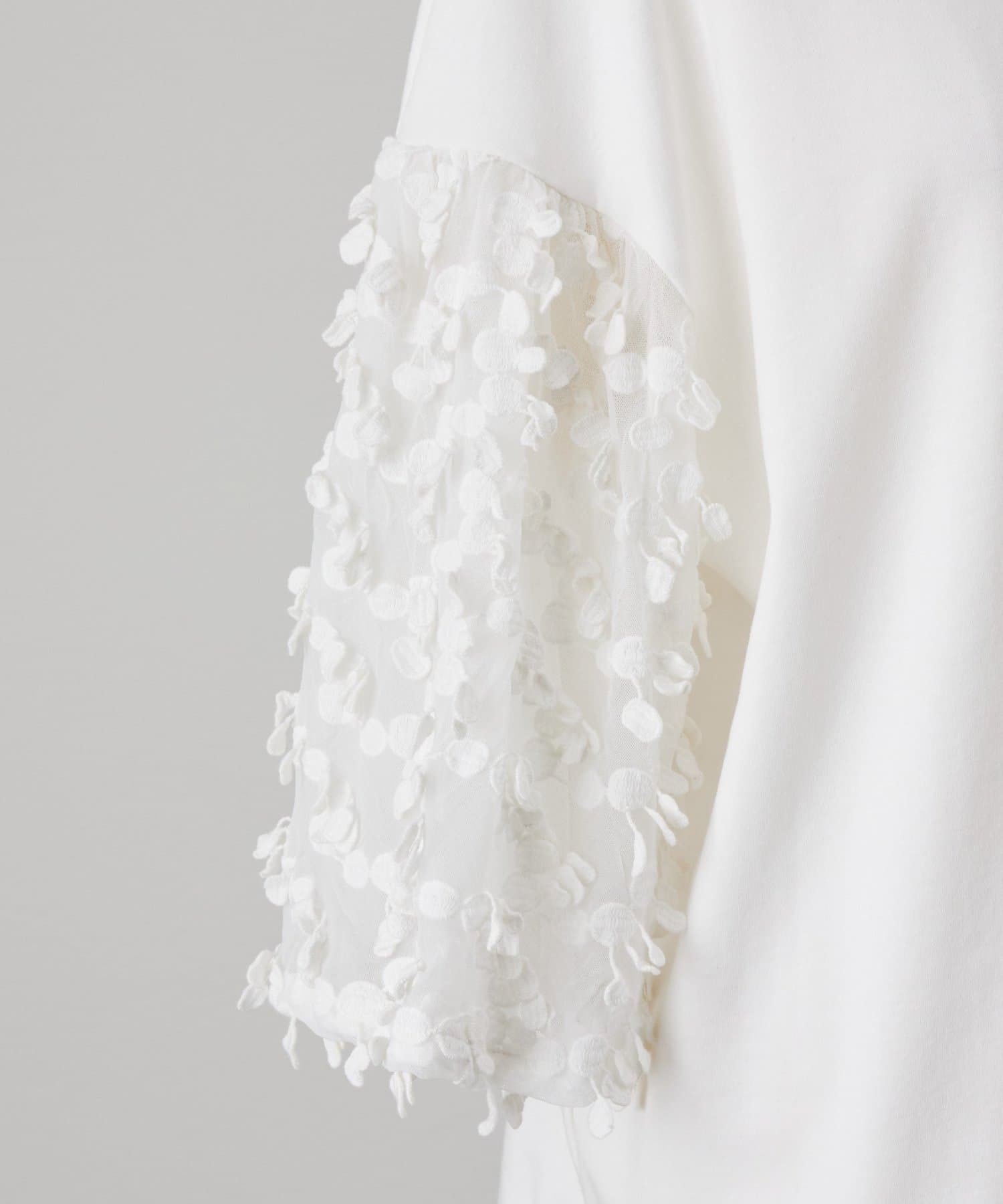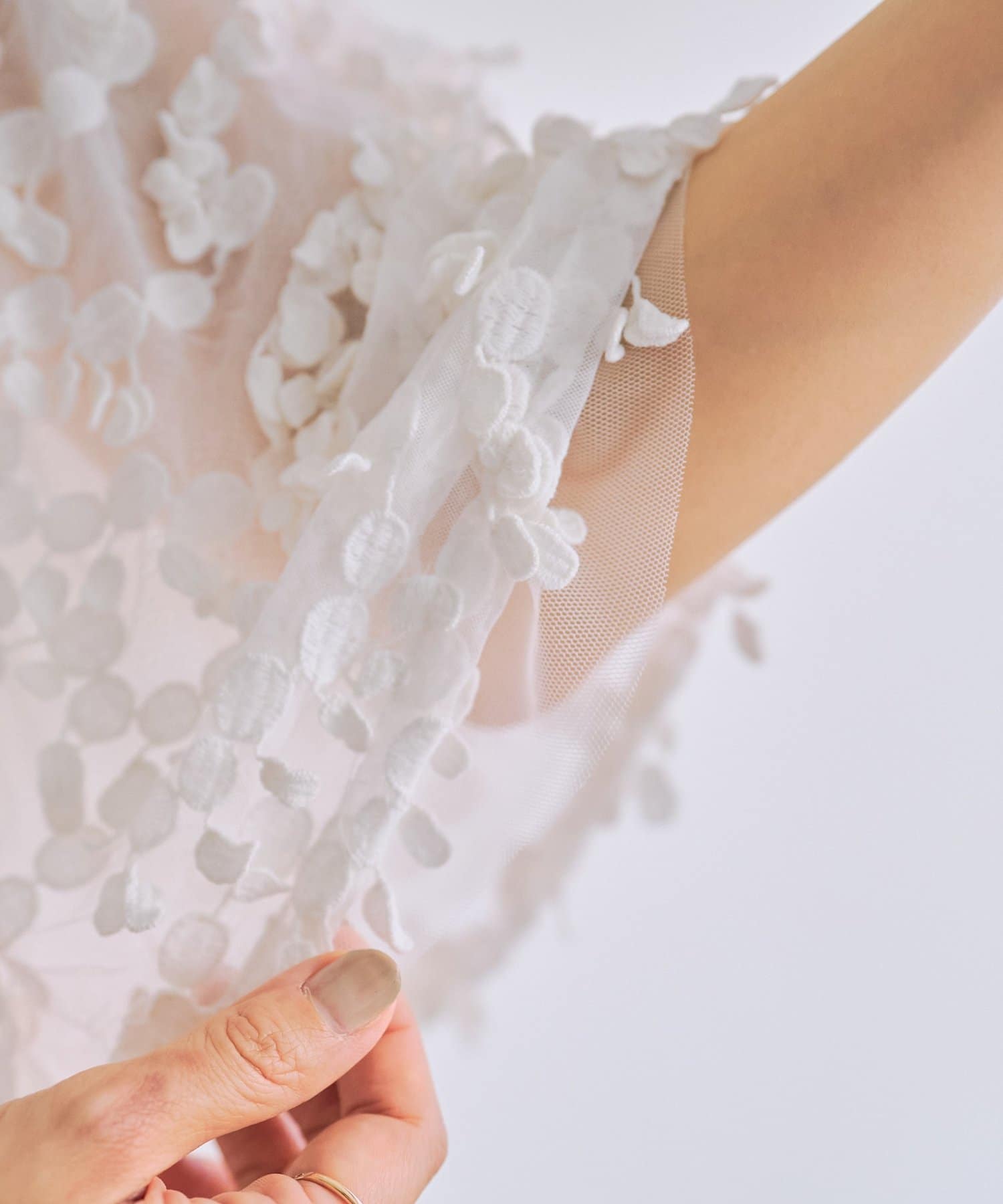 袖にはチュール素材と、チェリーモチーフが連なる繊細なレースをあしらい、動くたびに表情の出るデザインが魅力です。