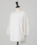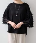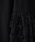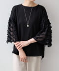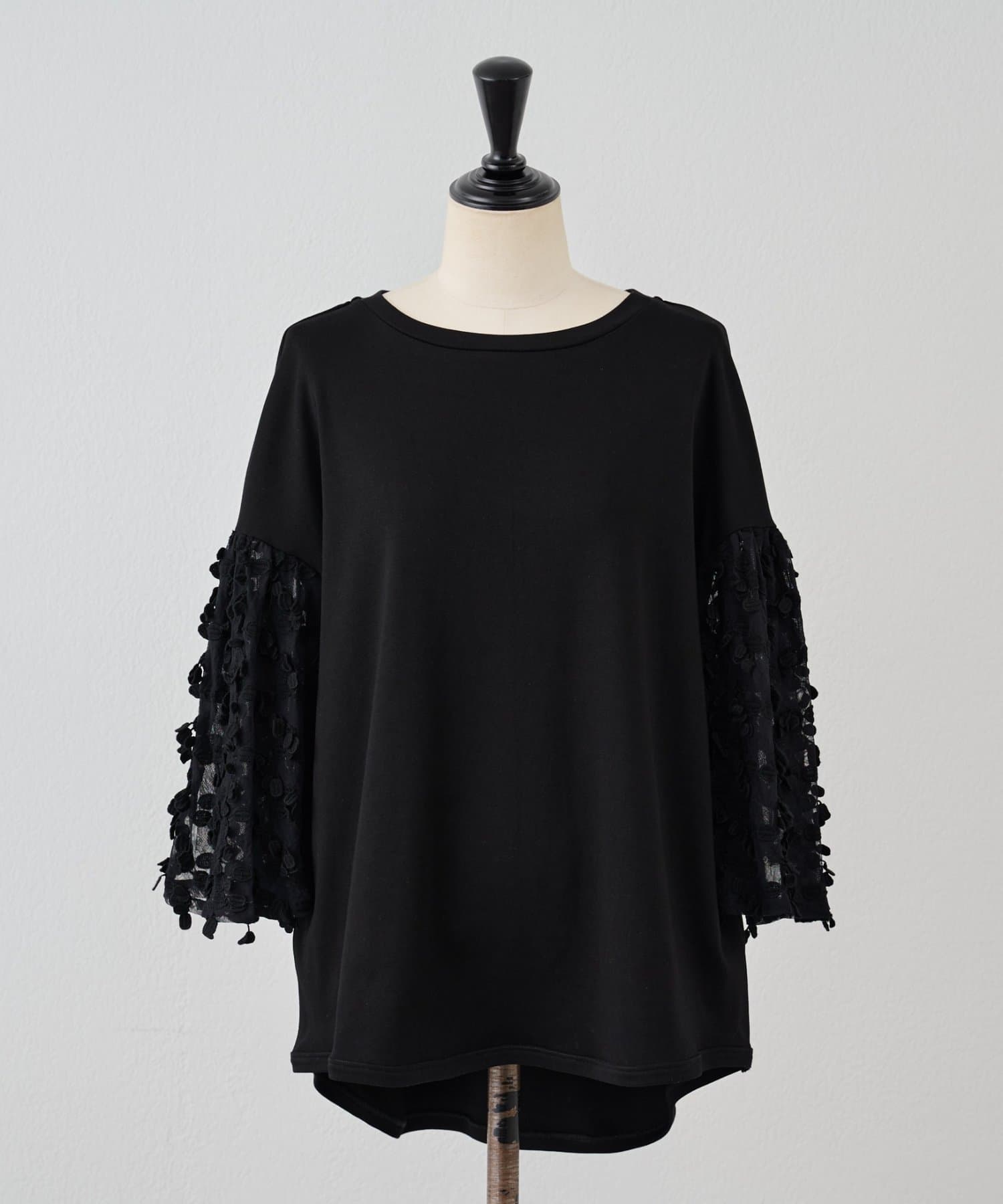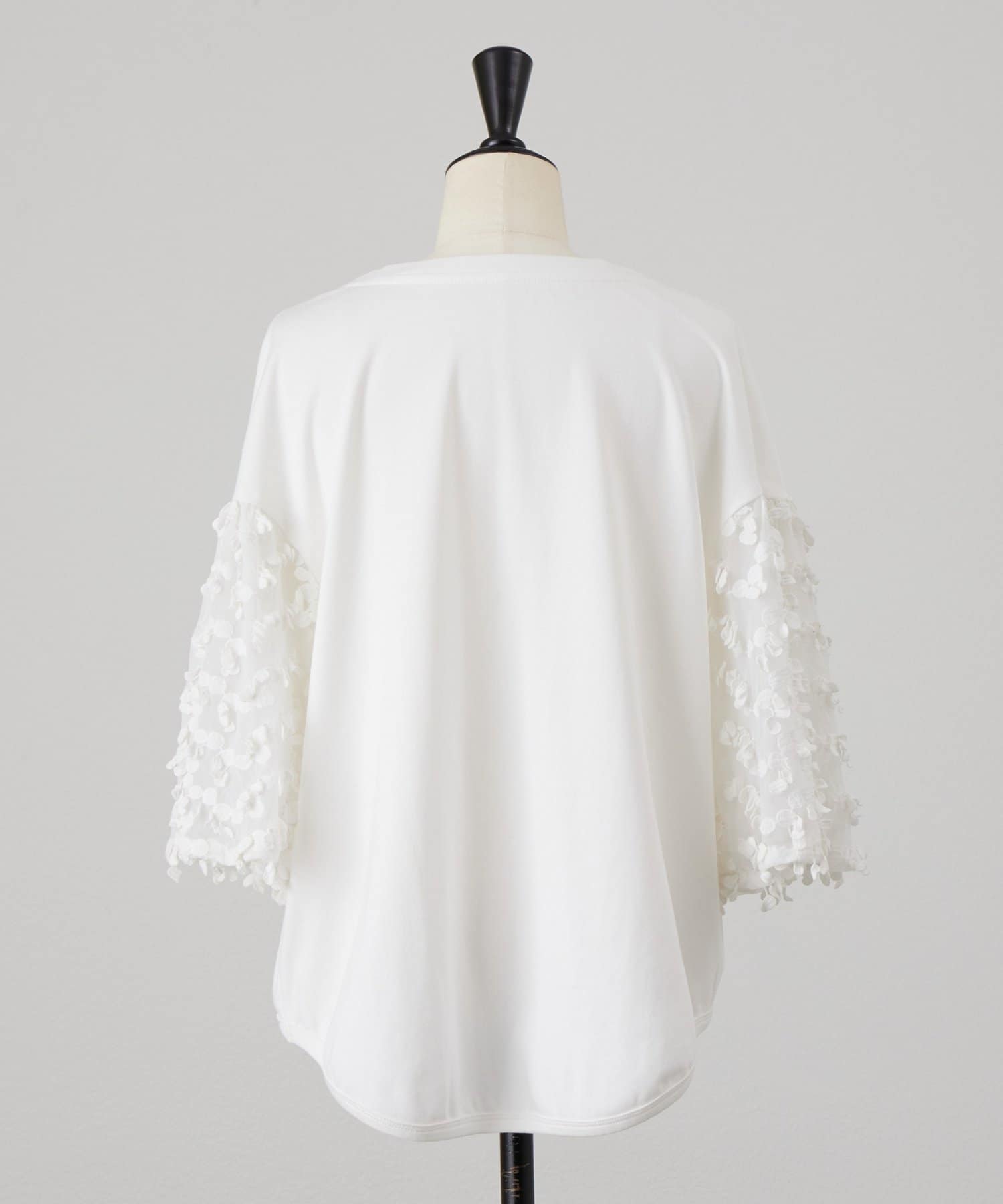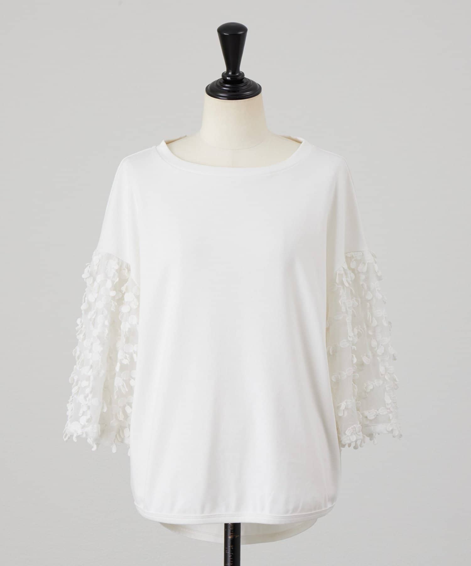 袖にはチュール素材と、チェリーモチーフが連なる繊細なレースをあしらい、動くたびに表情の出るデザインが魅力です。