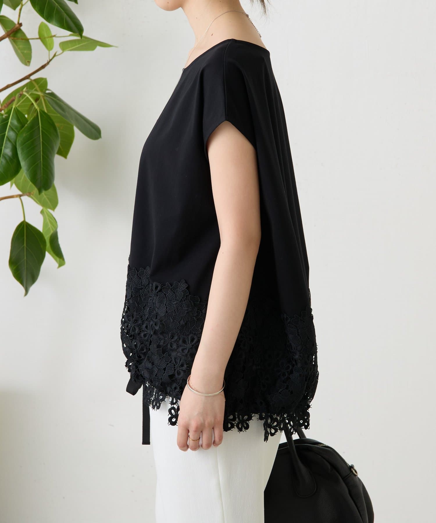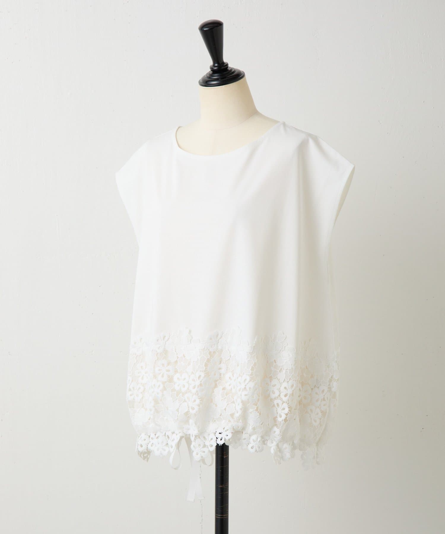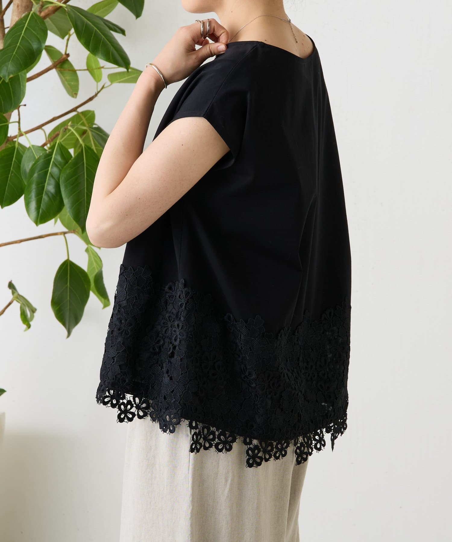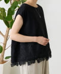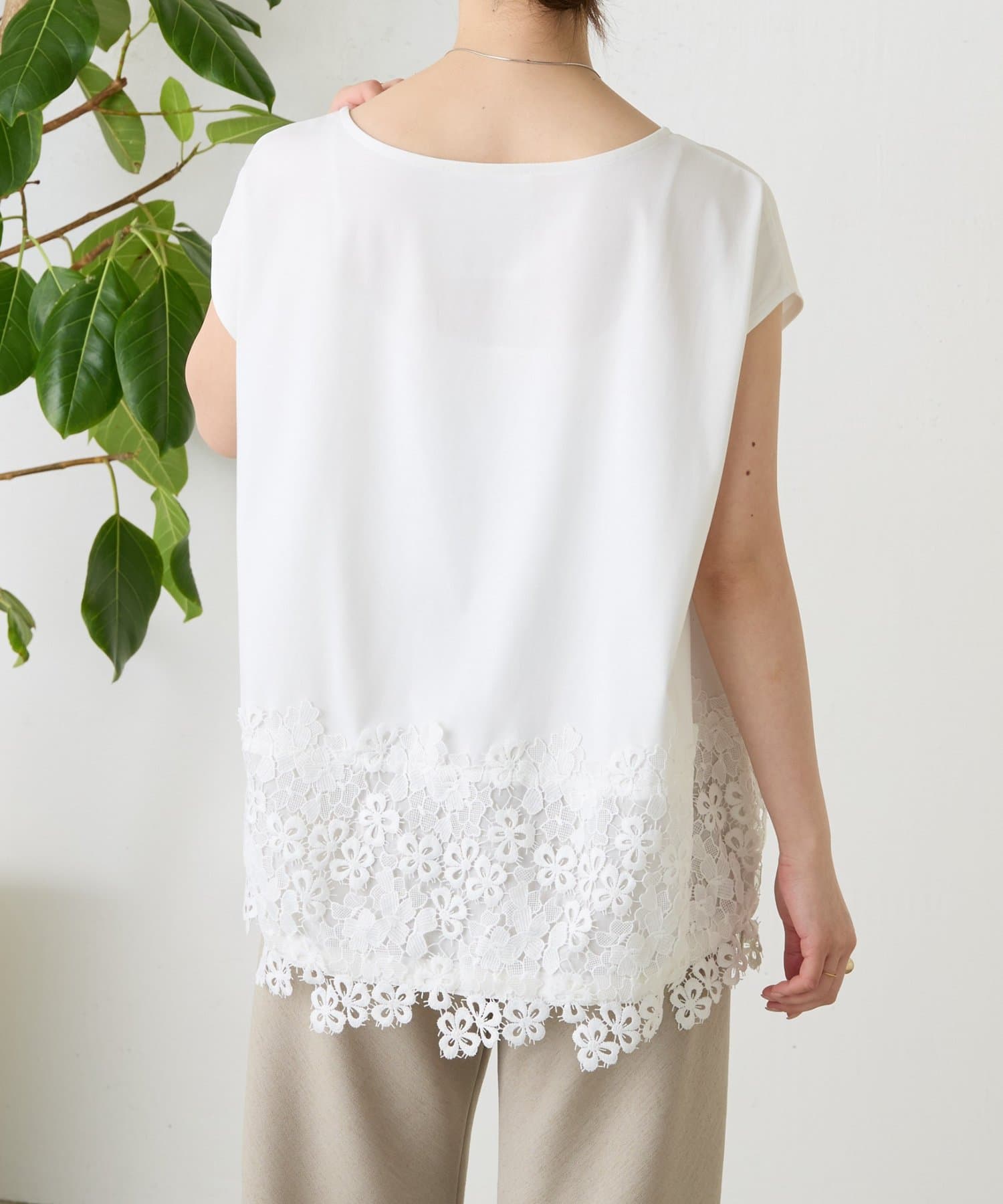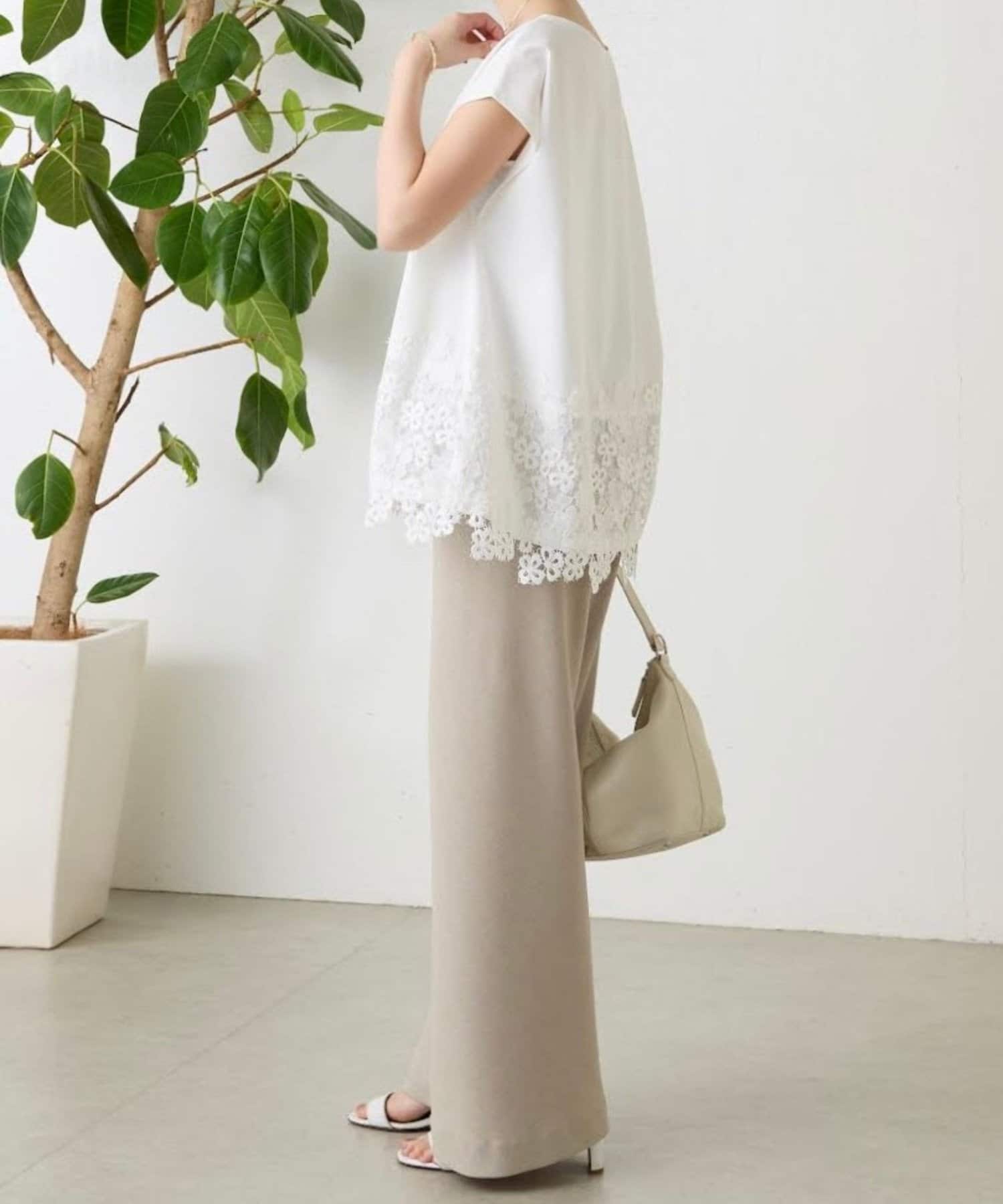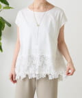 シンプルなトップスに、裾のレースがさりげなく映える一枚。