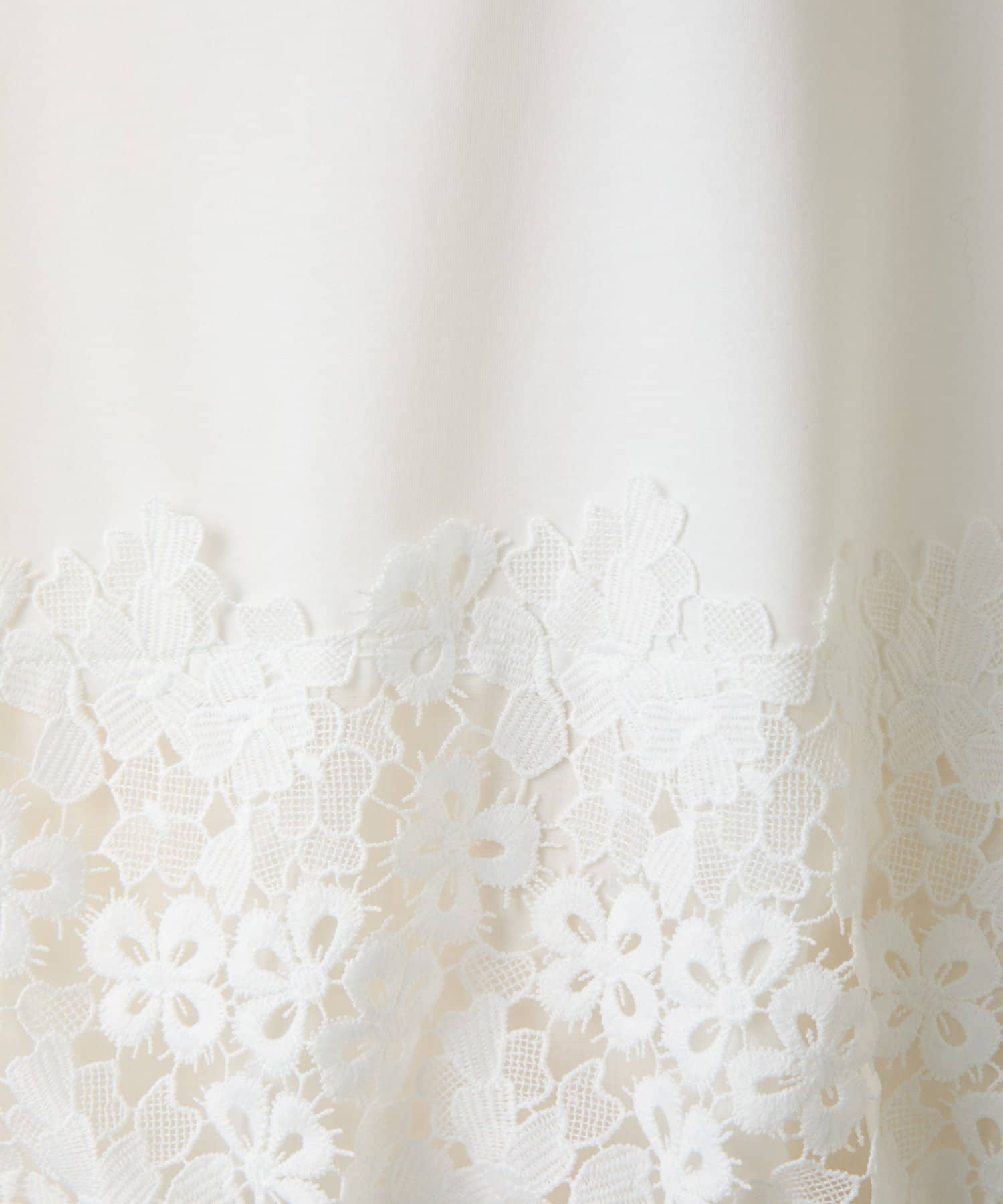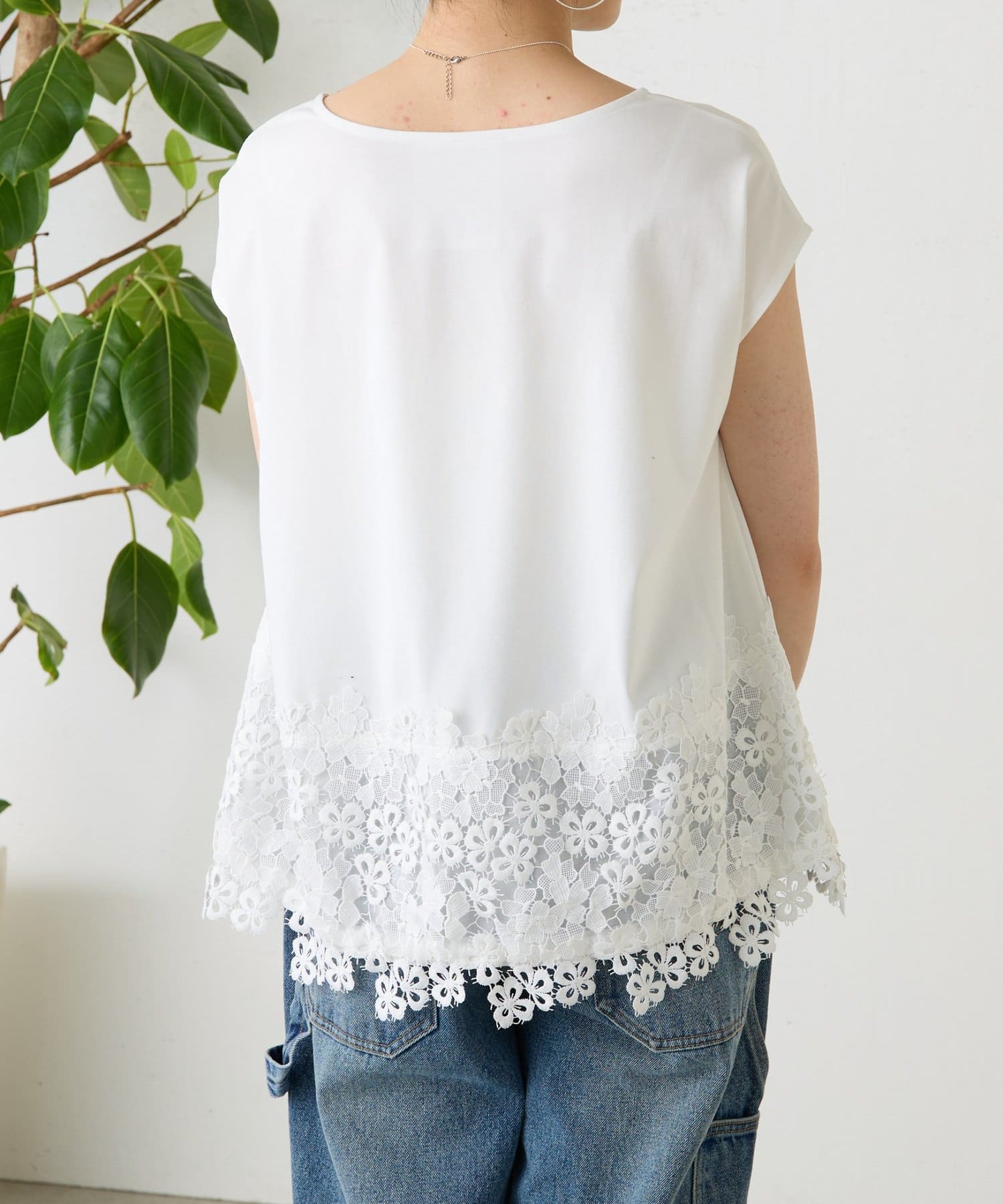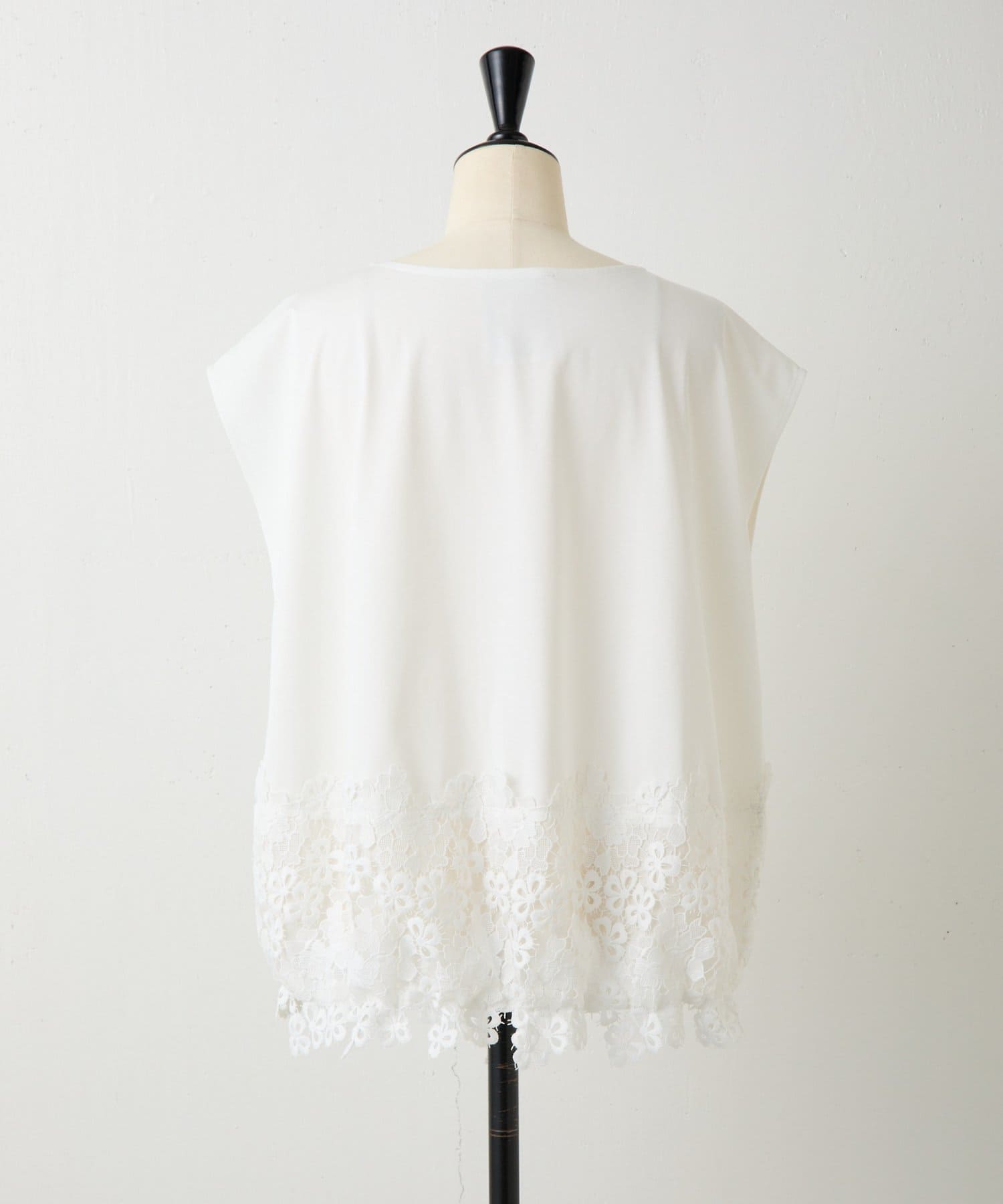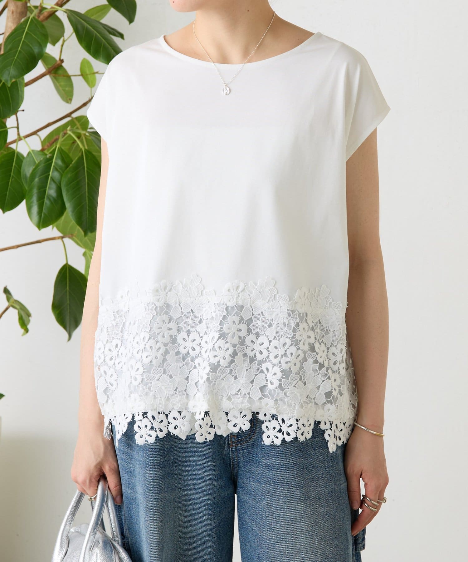 シンプルなトップスに、裾のレースがさりげなく映える一枚。