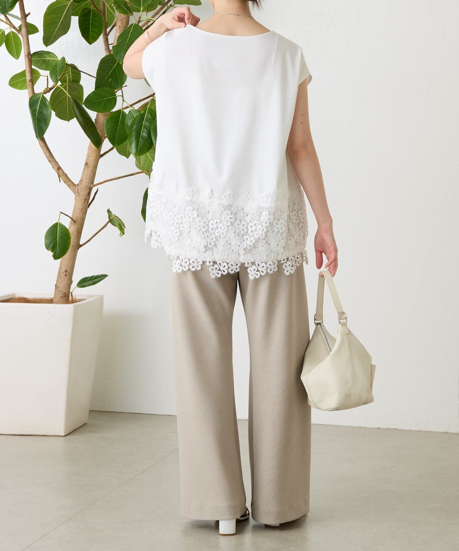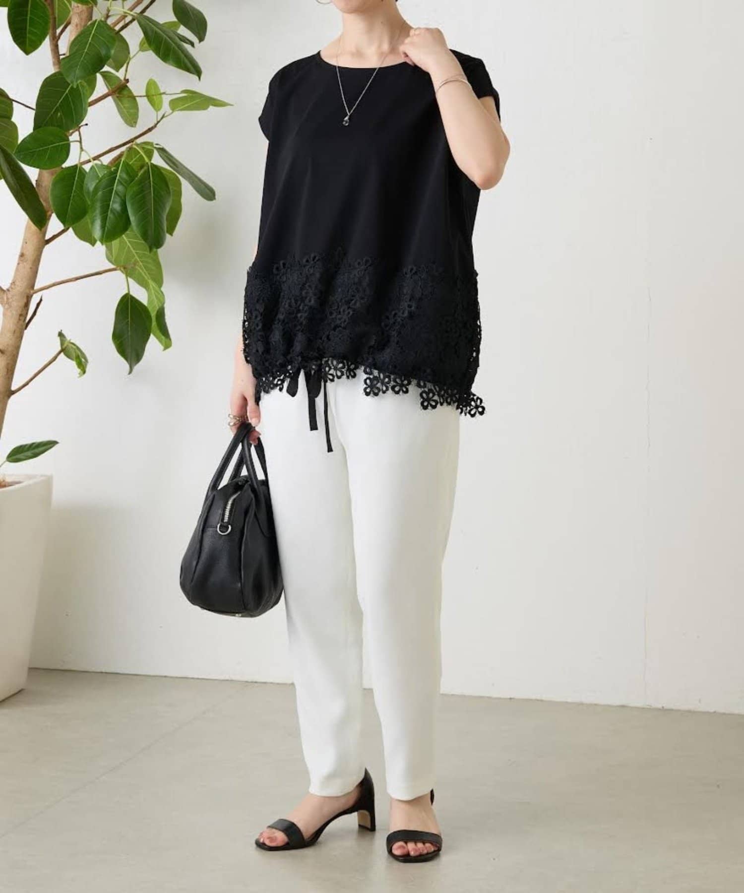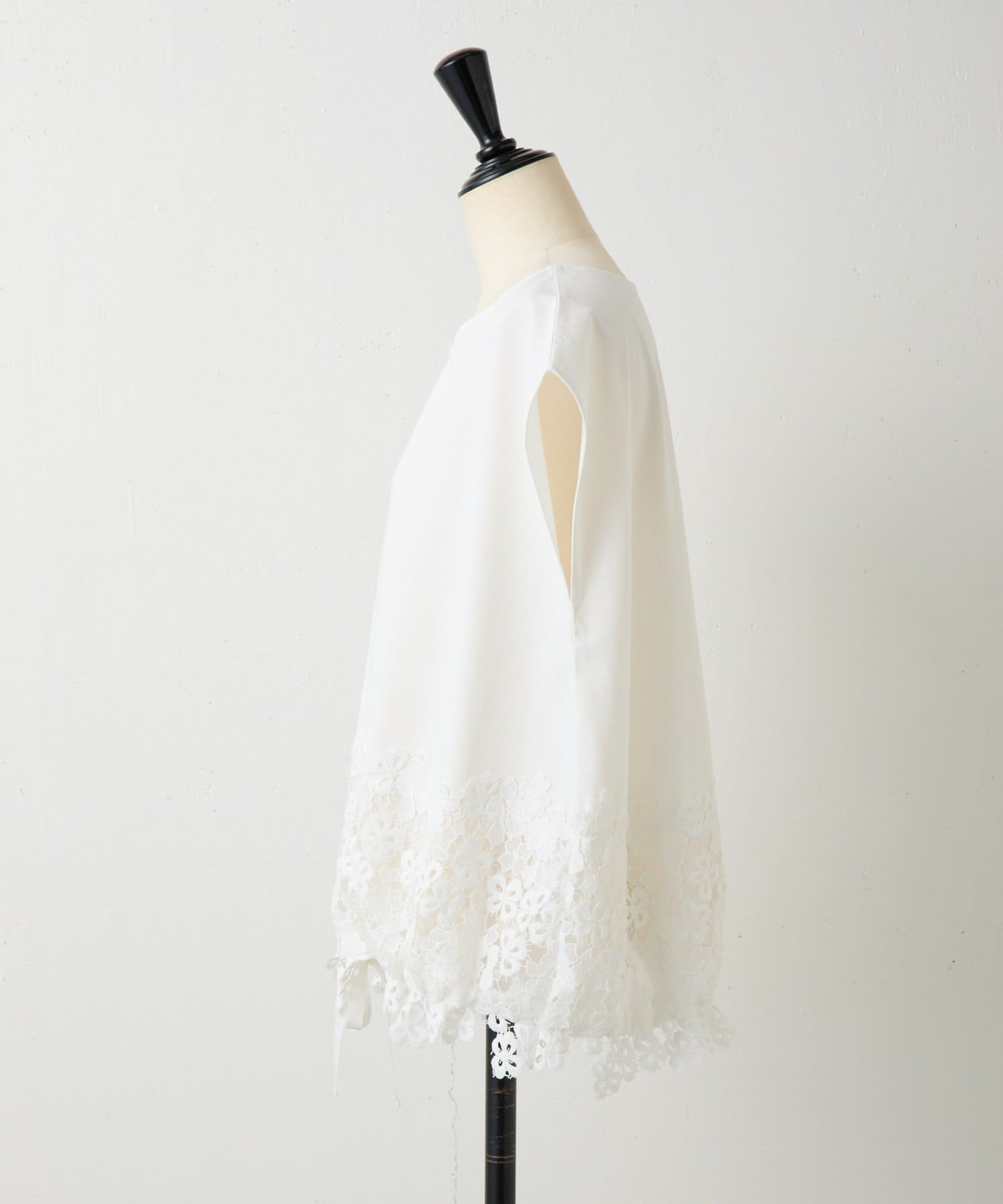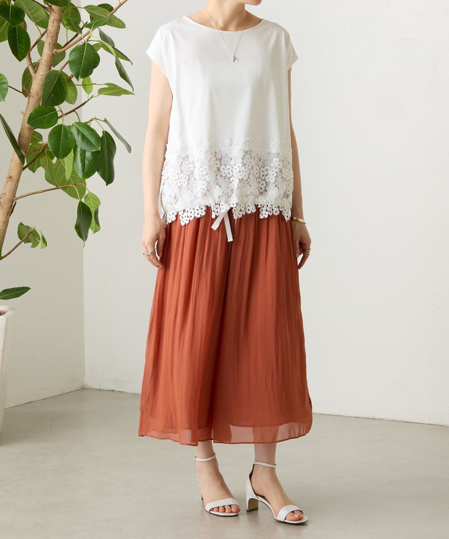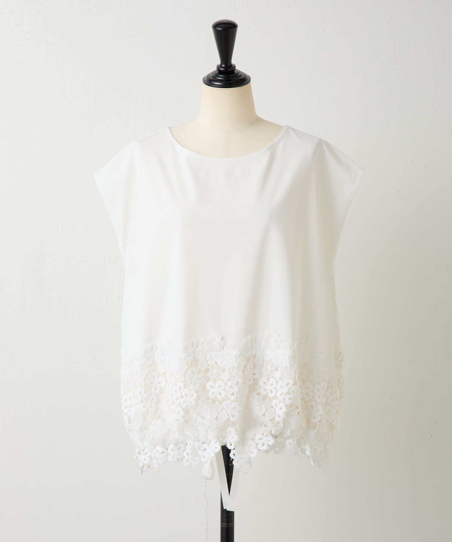 シンプルなトップスに、裾のレースがさりげなく映える一枚。