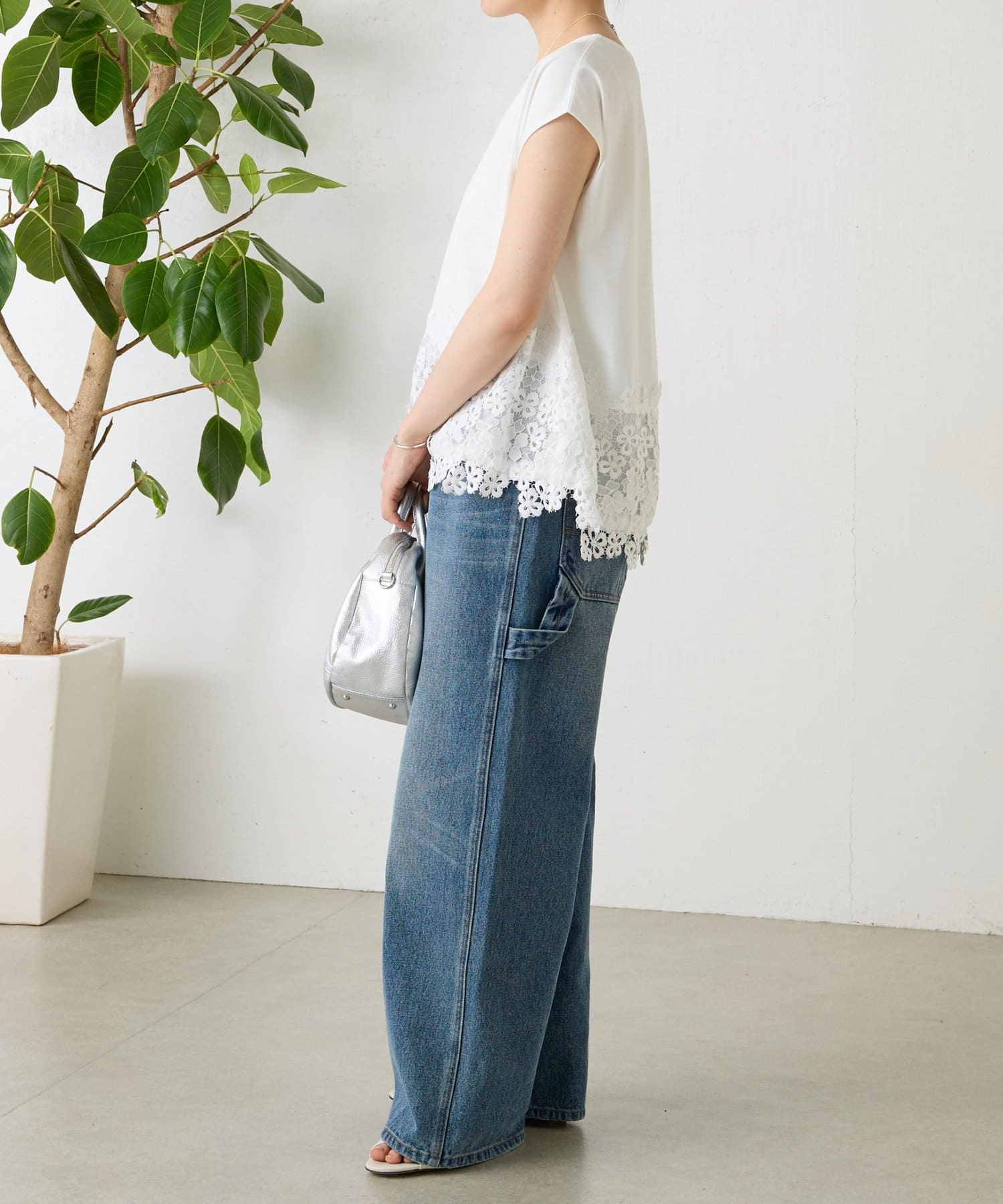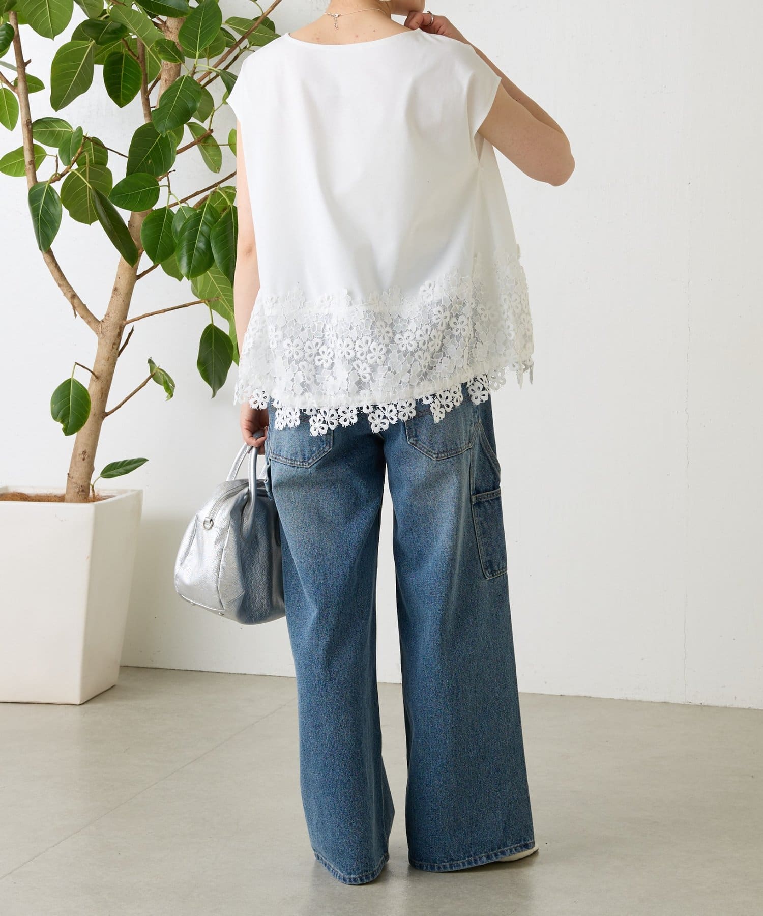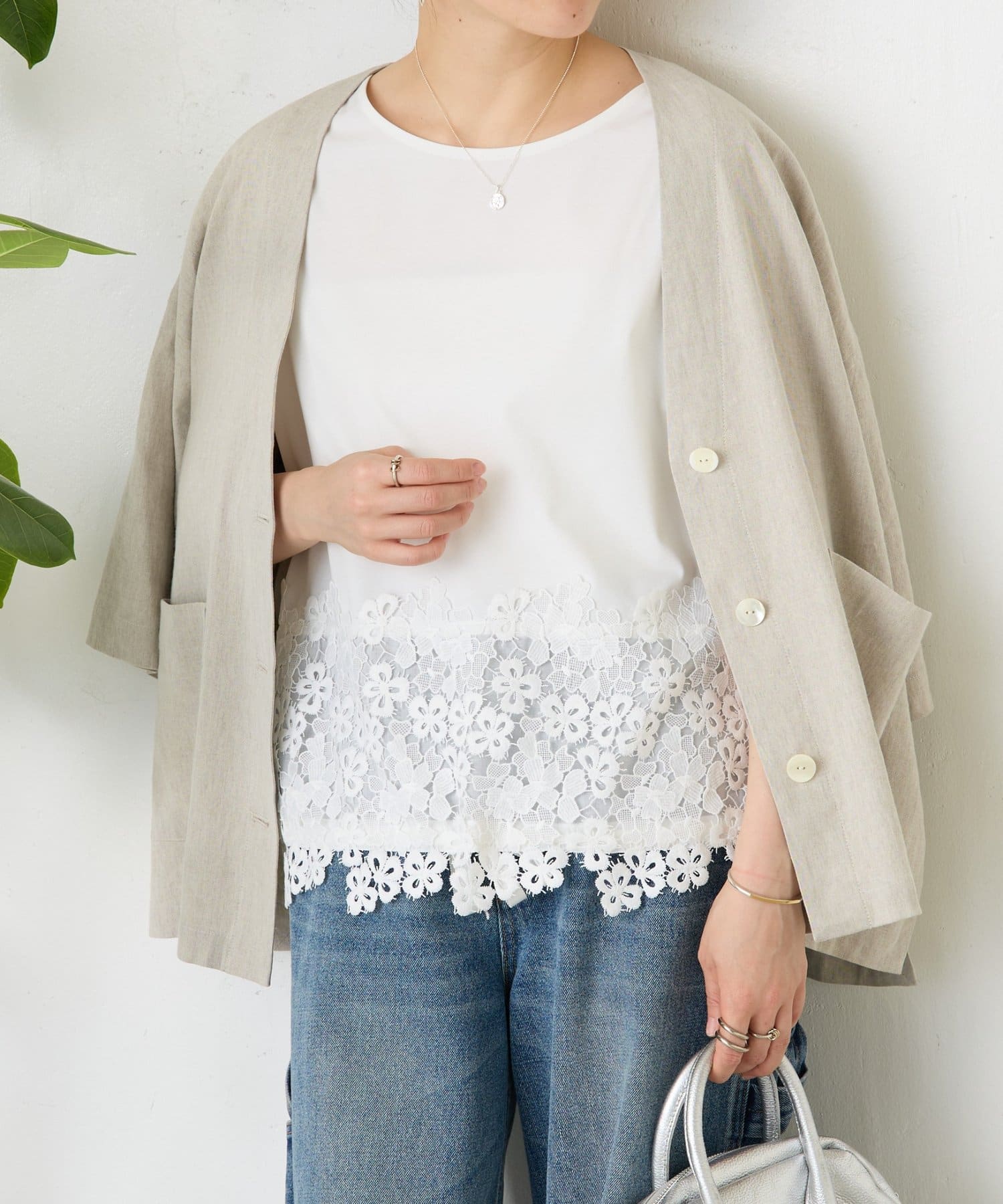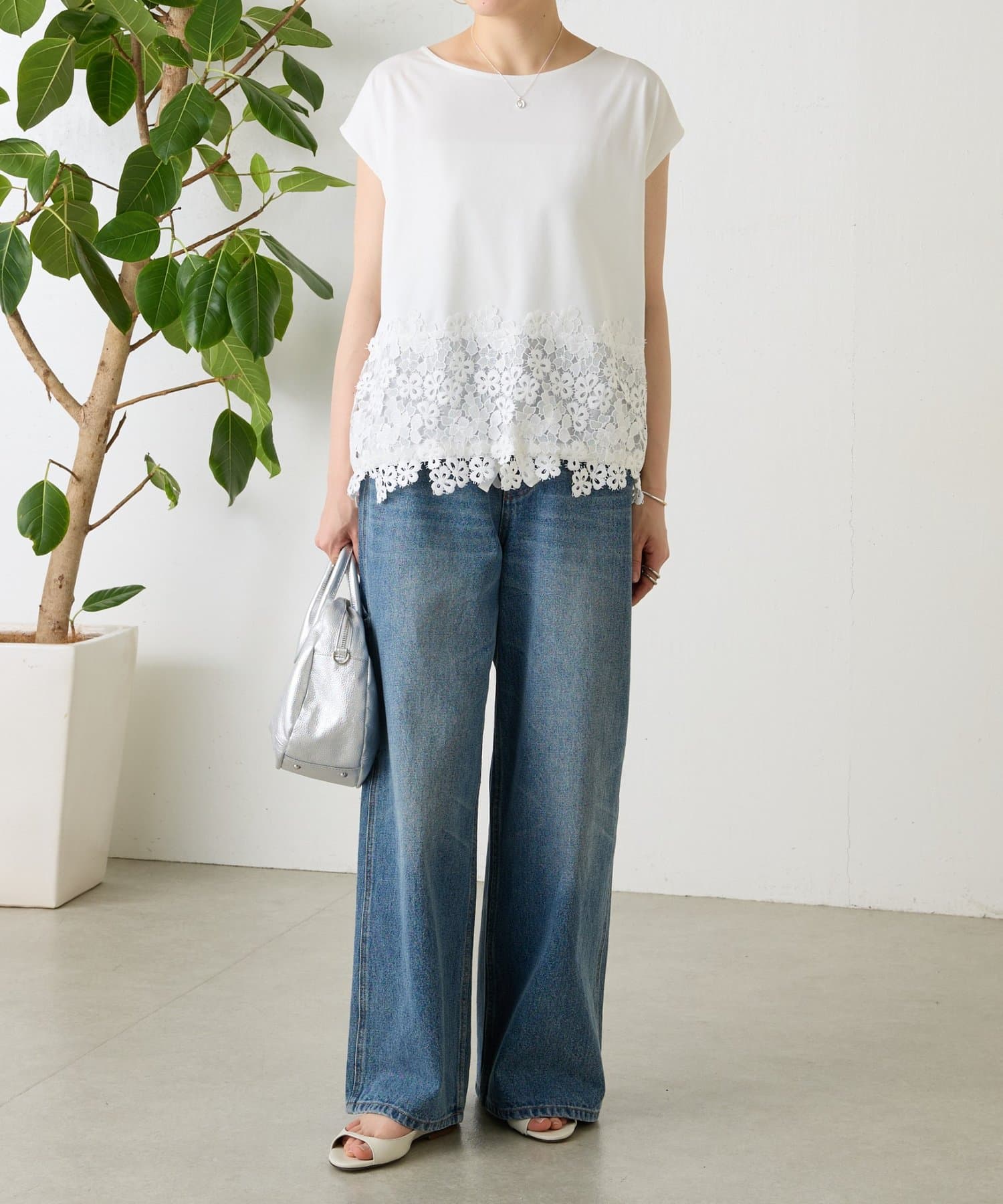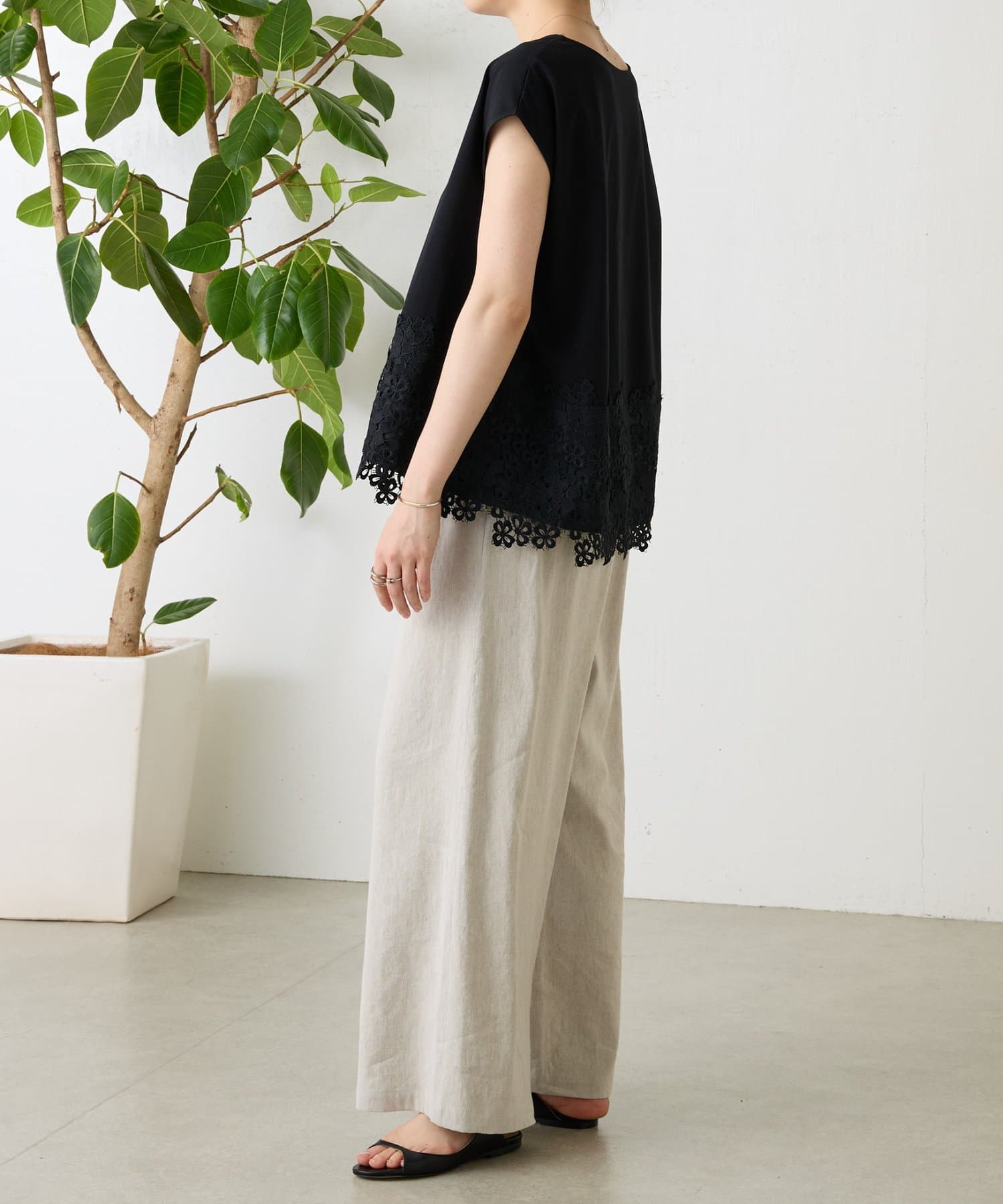 シンプルなトップスに、裾のレースがさりげなく映える一枚。