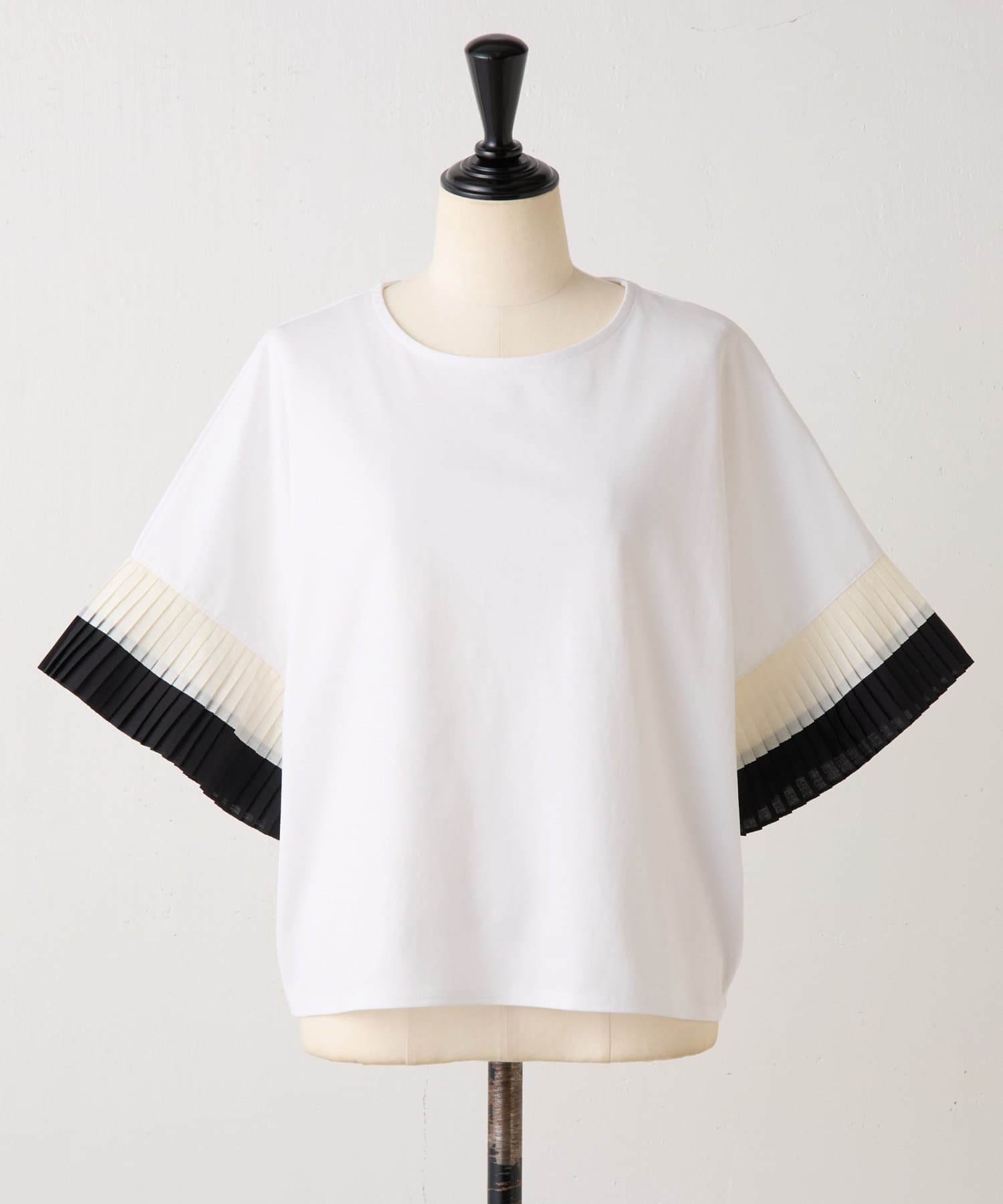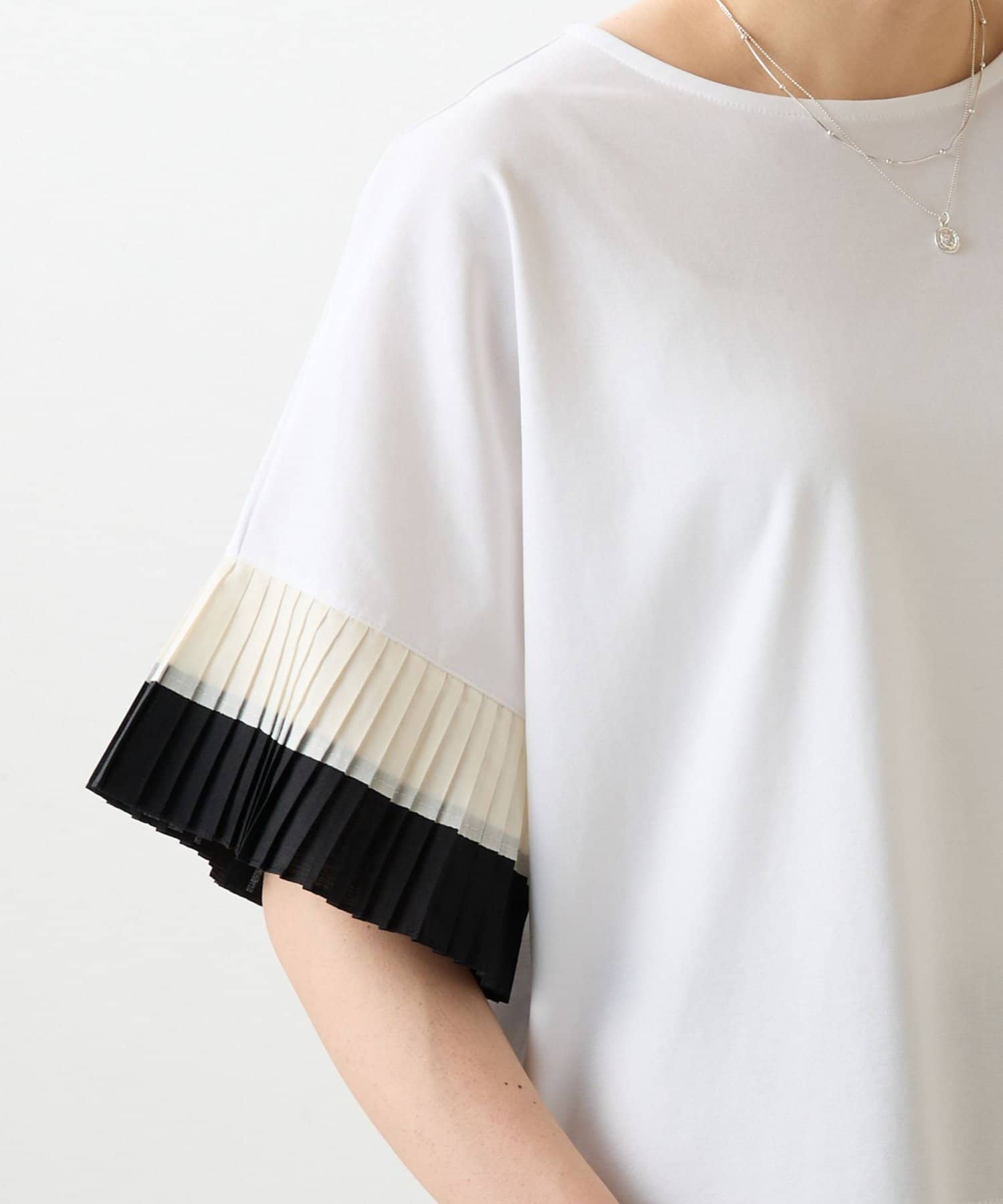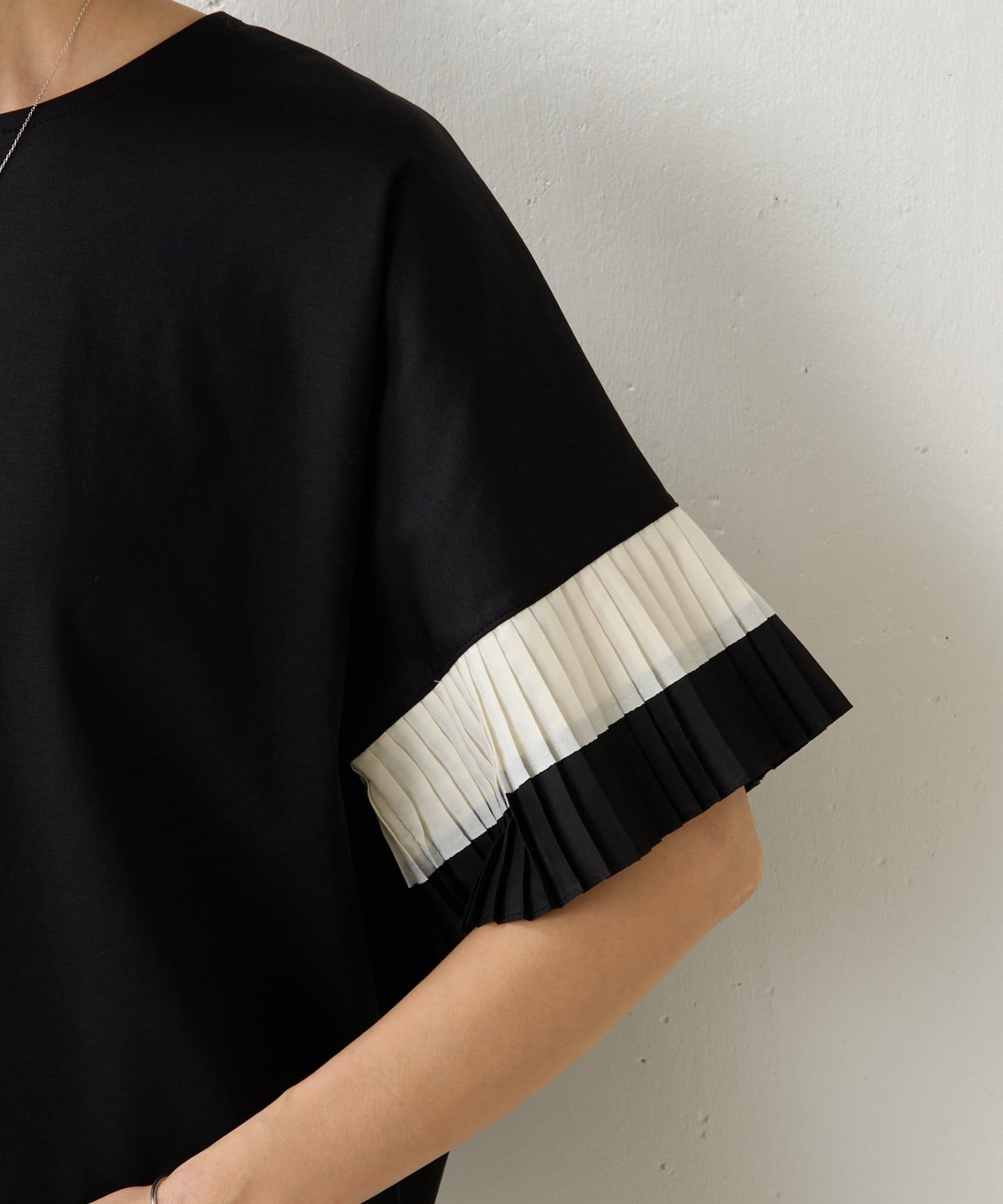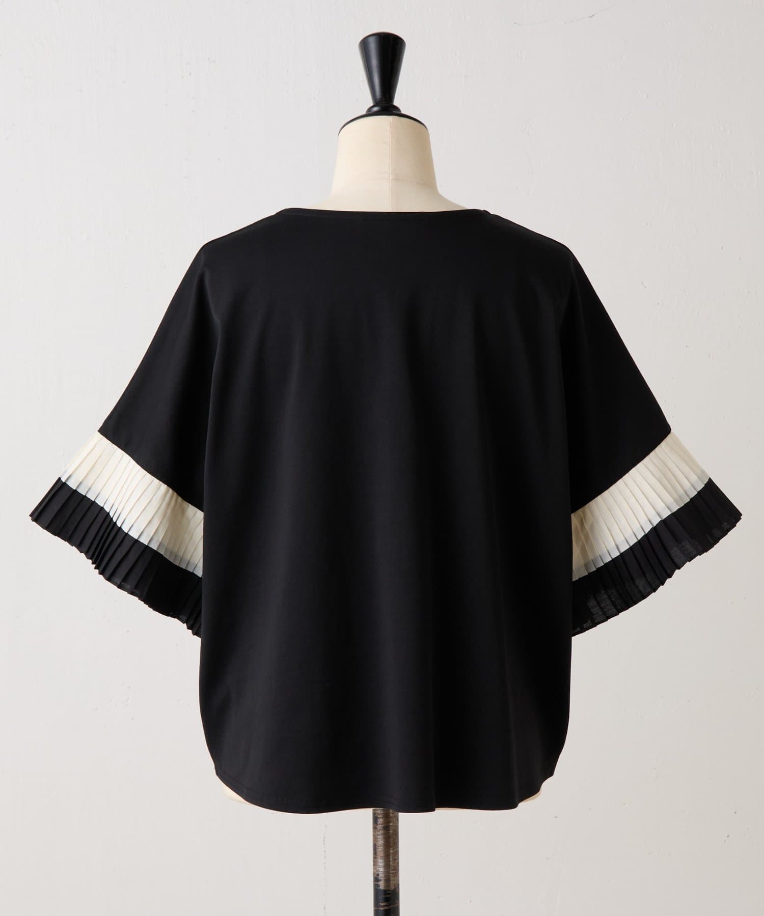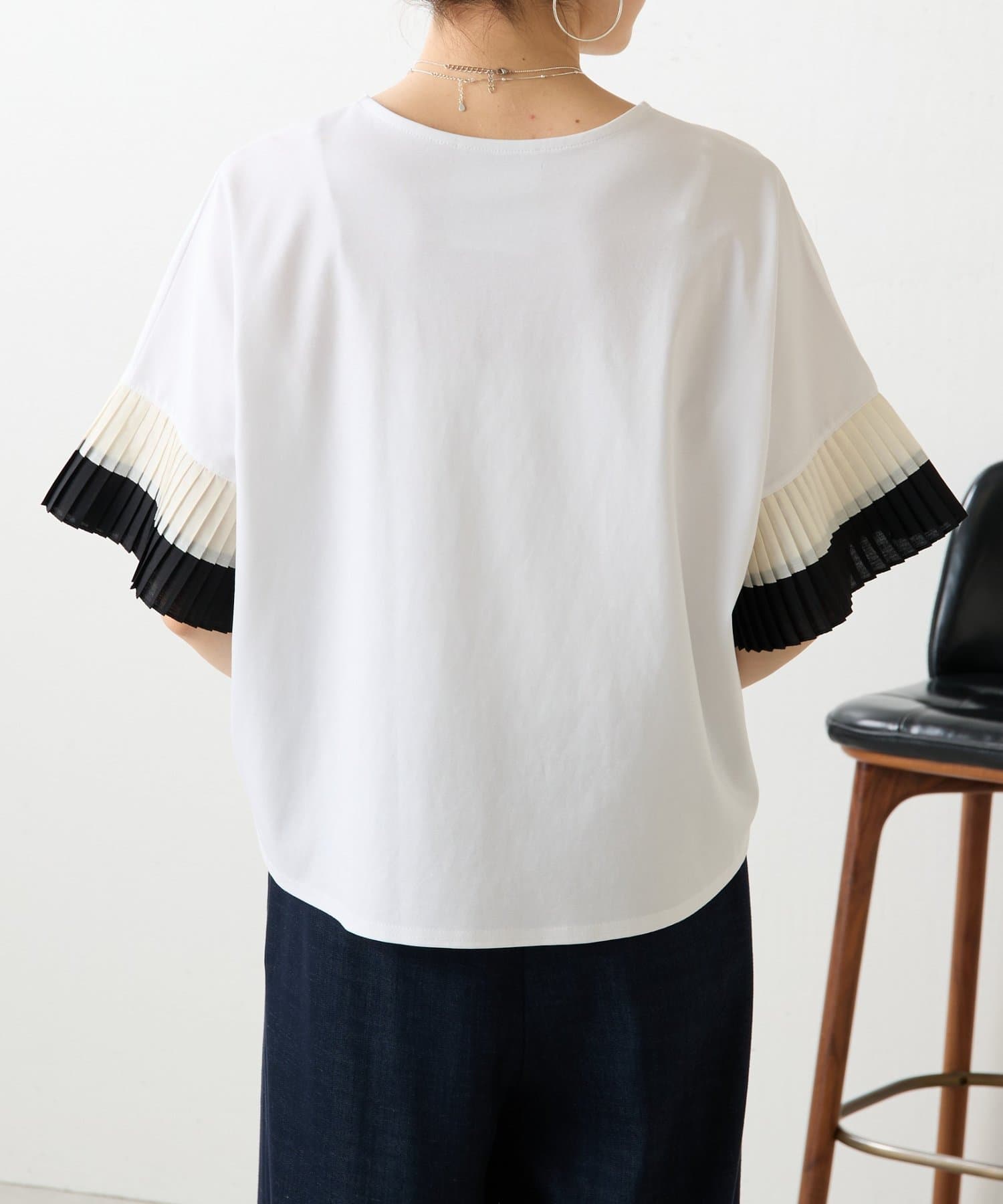 バイカラーのプリーツ生地を袖にあしらった、デザイン性のあるカットソー。