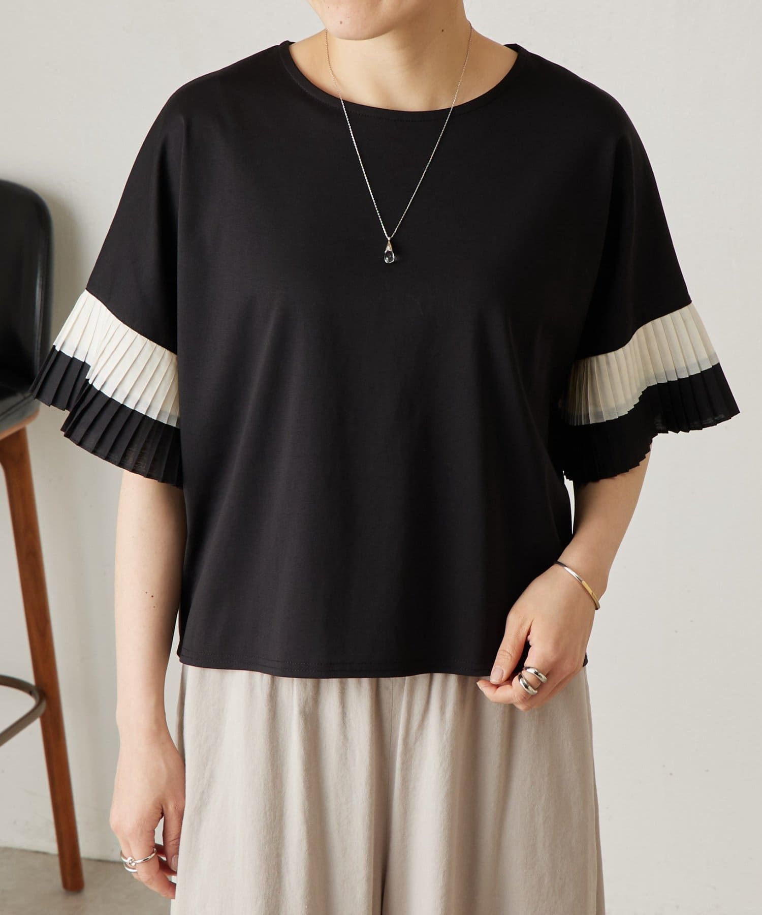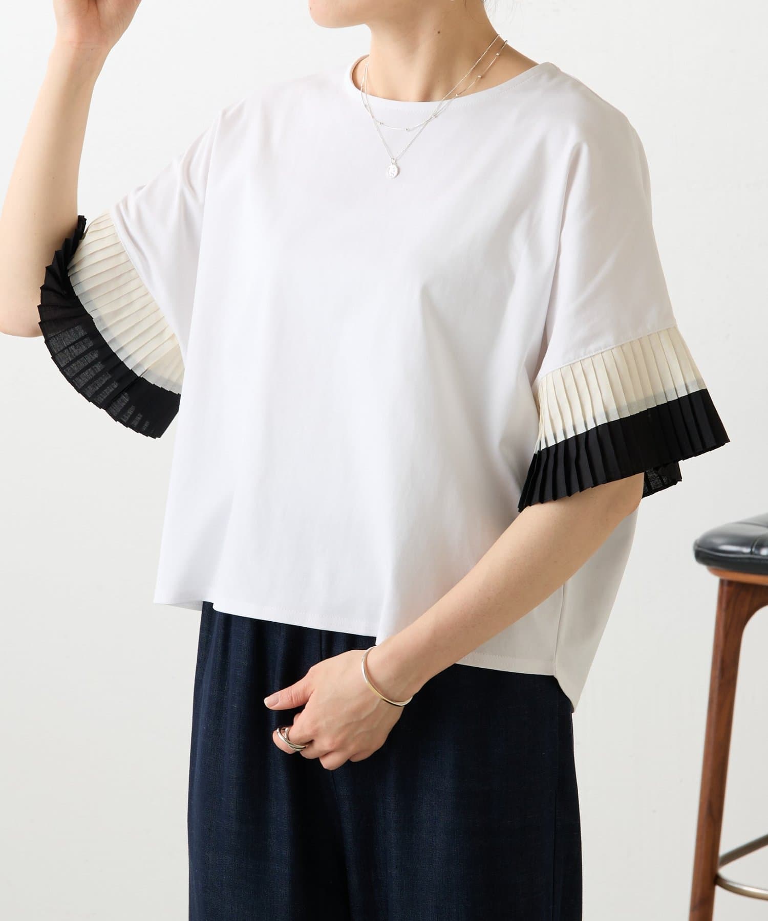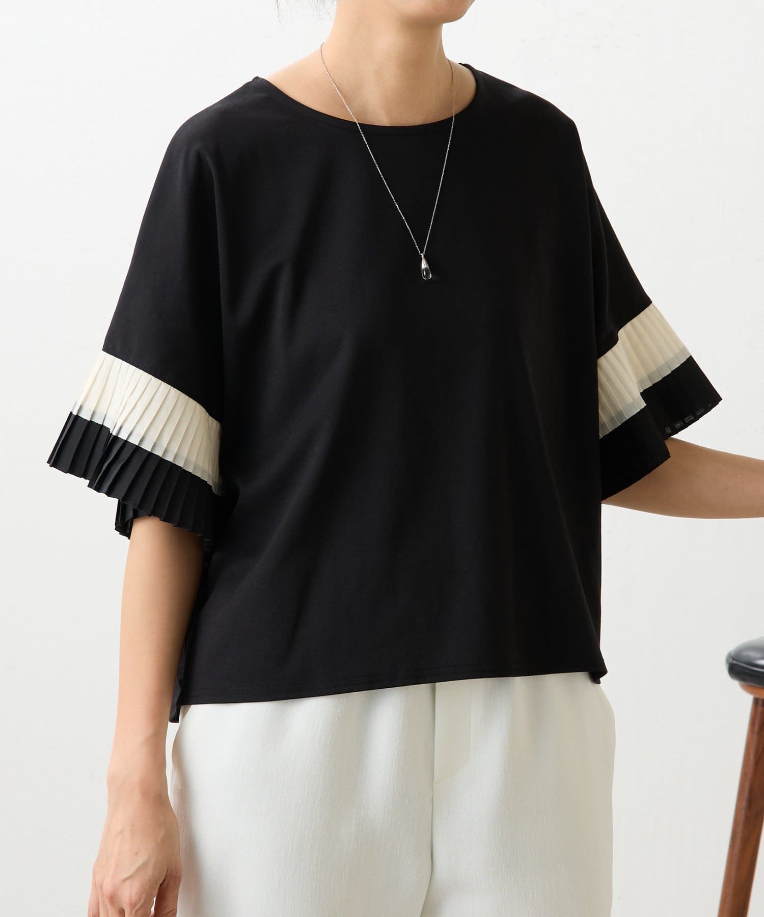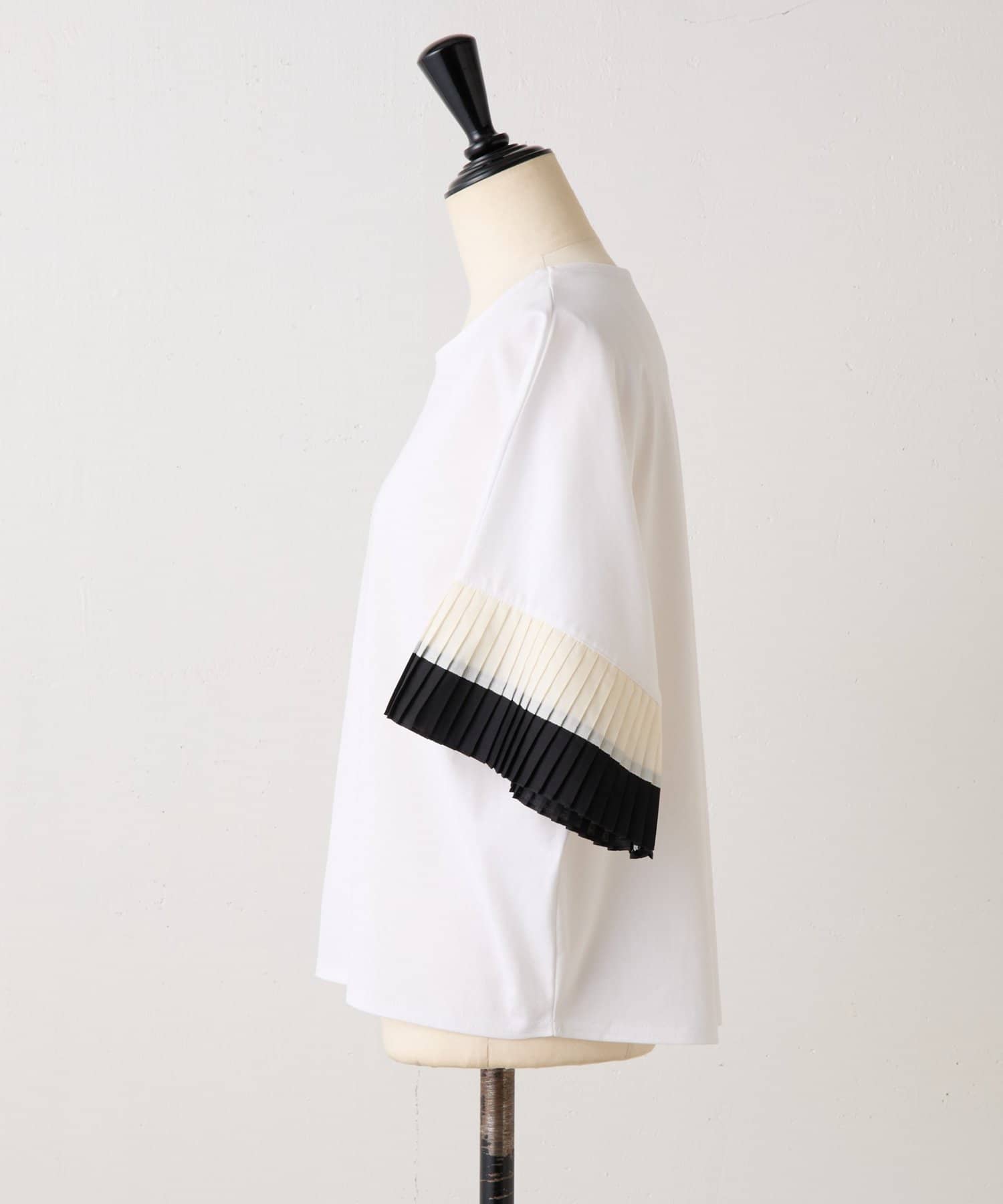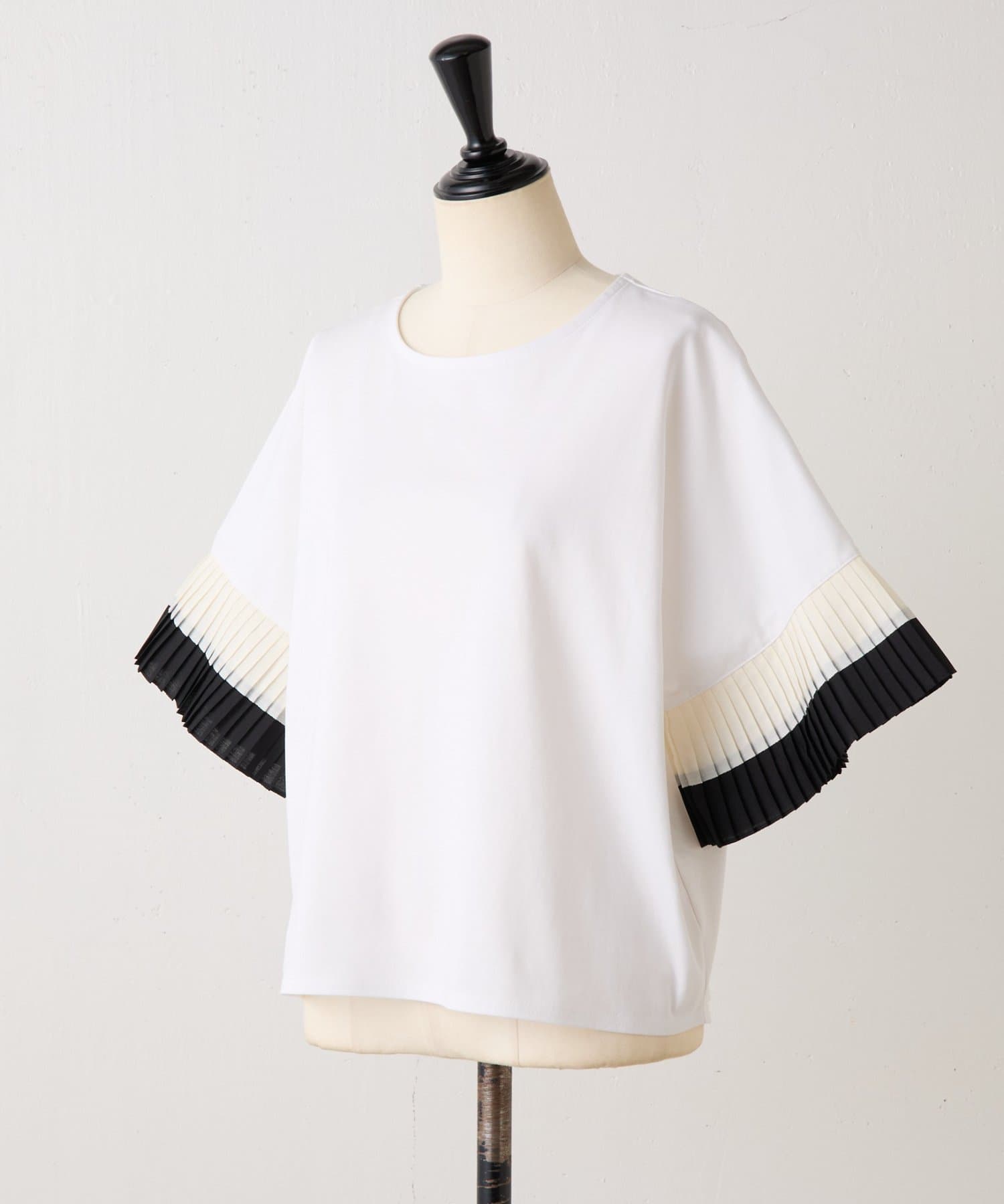 バイカラーのプリーツ生地を袖にあしらった、デザイン性のあるカットソー。