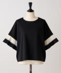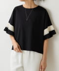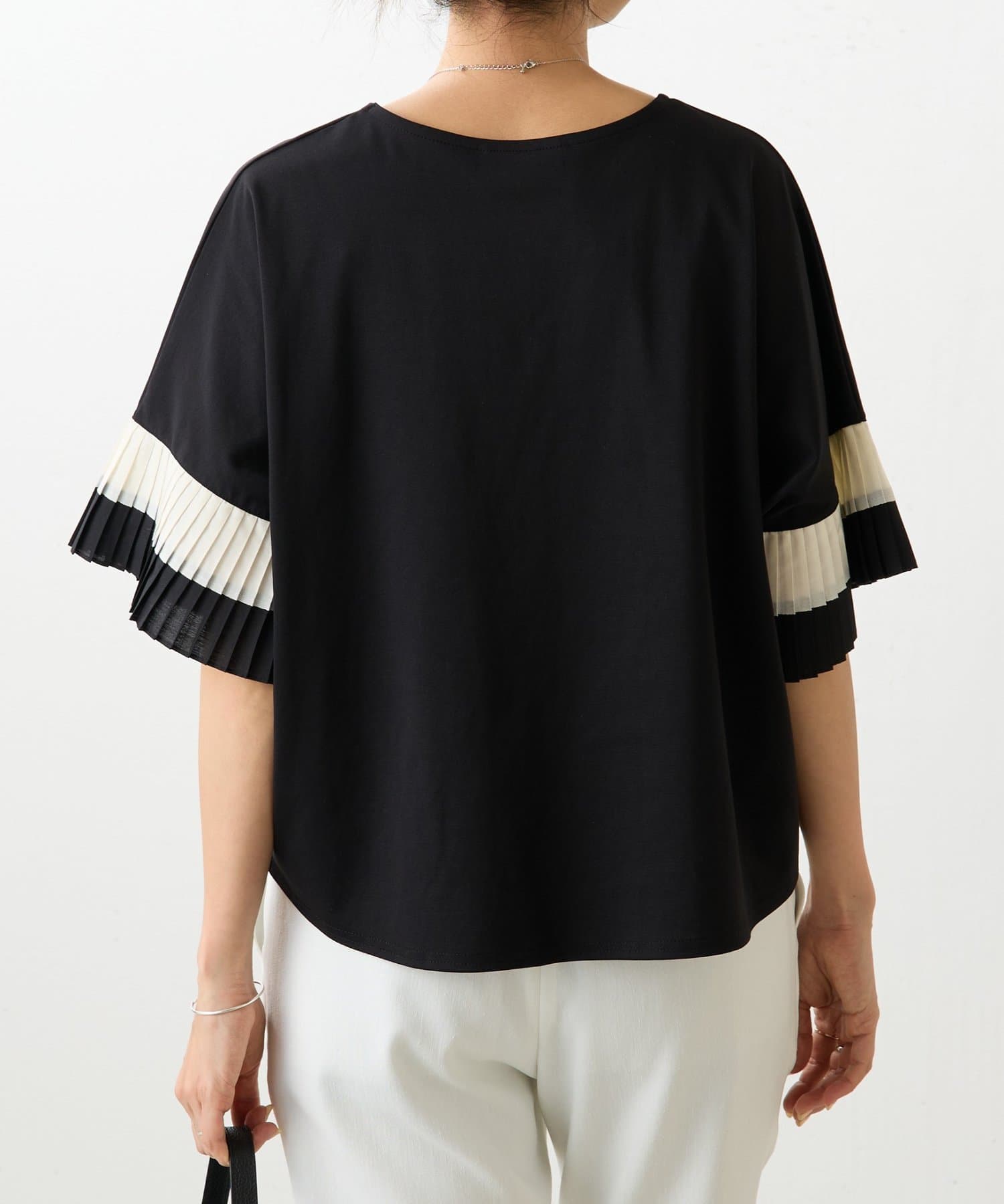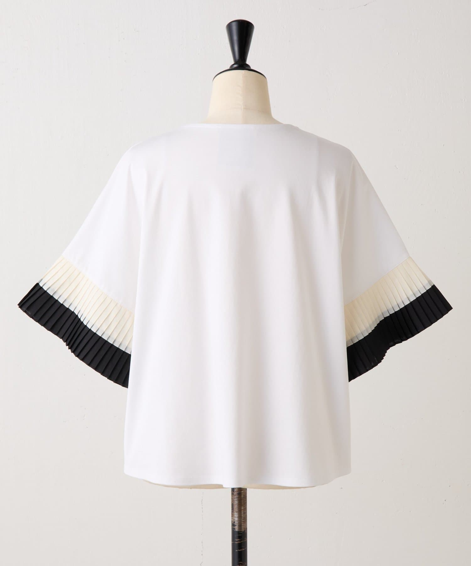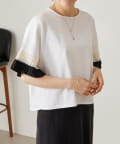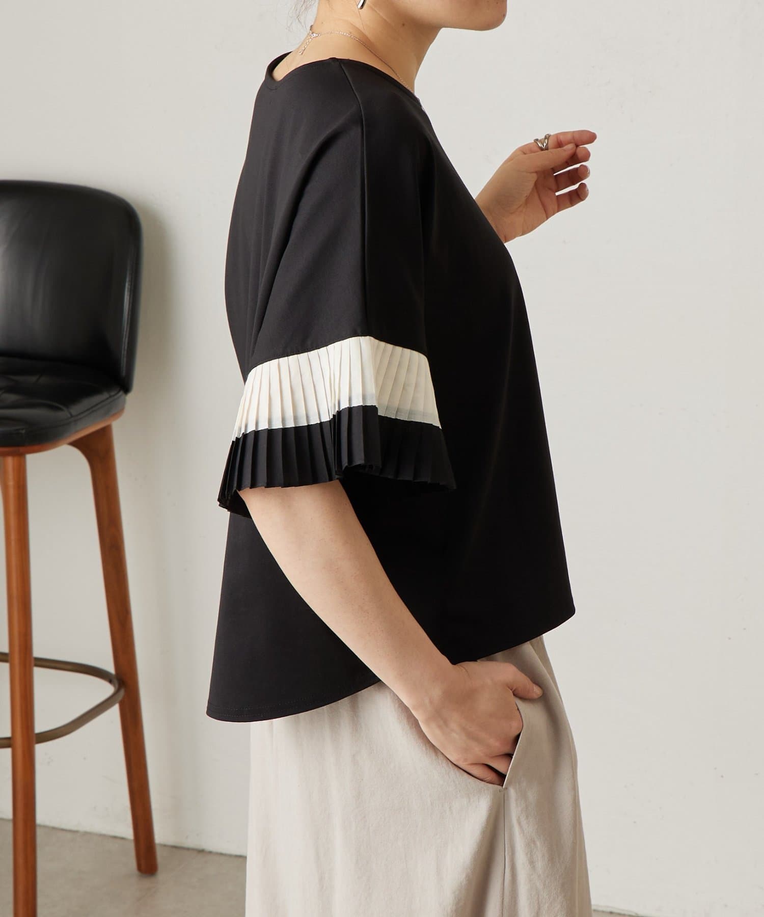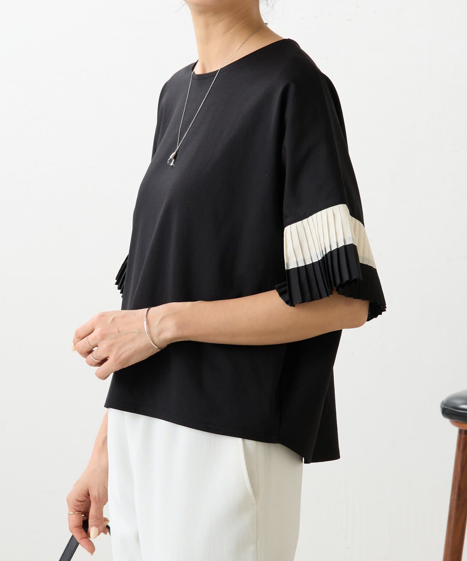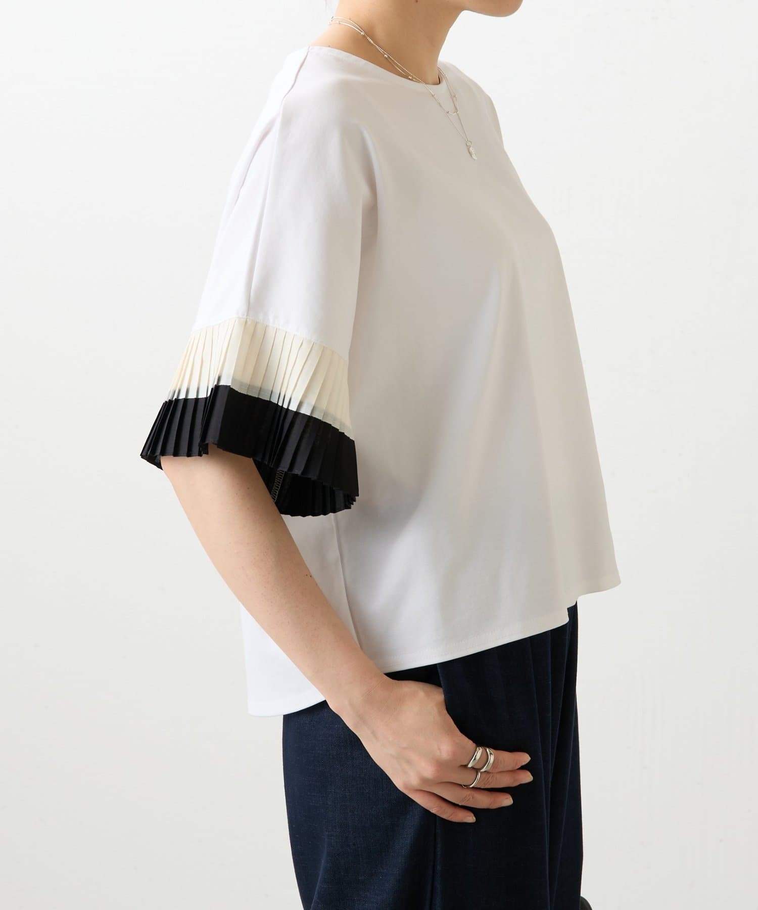 バイカラーのプリーツ生地を袖にあしらった、デザイン性のあるカットソー。